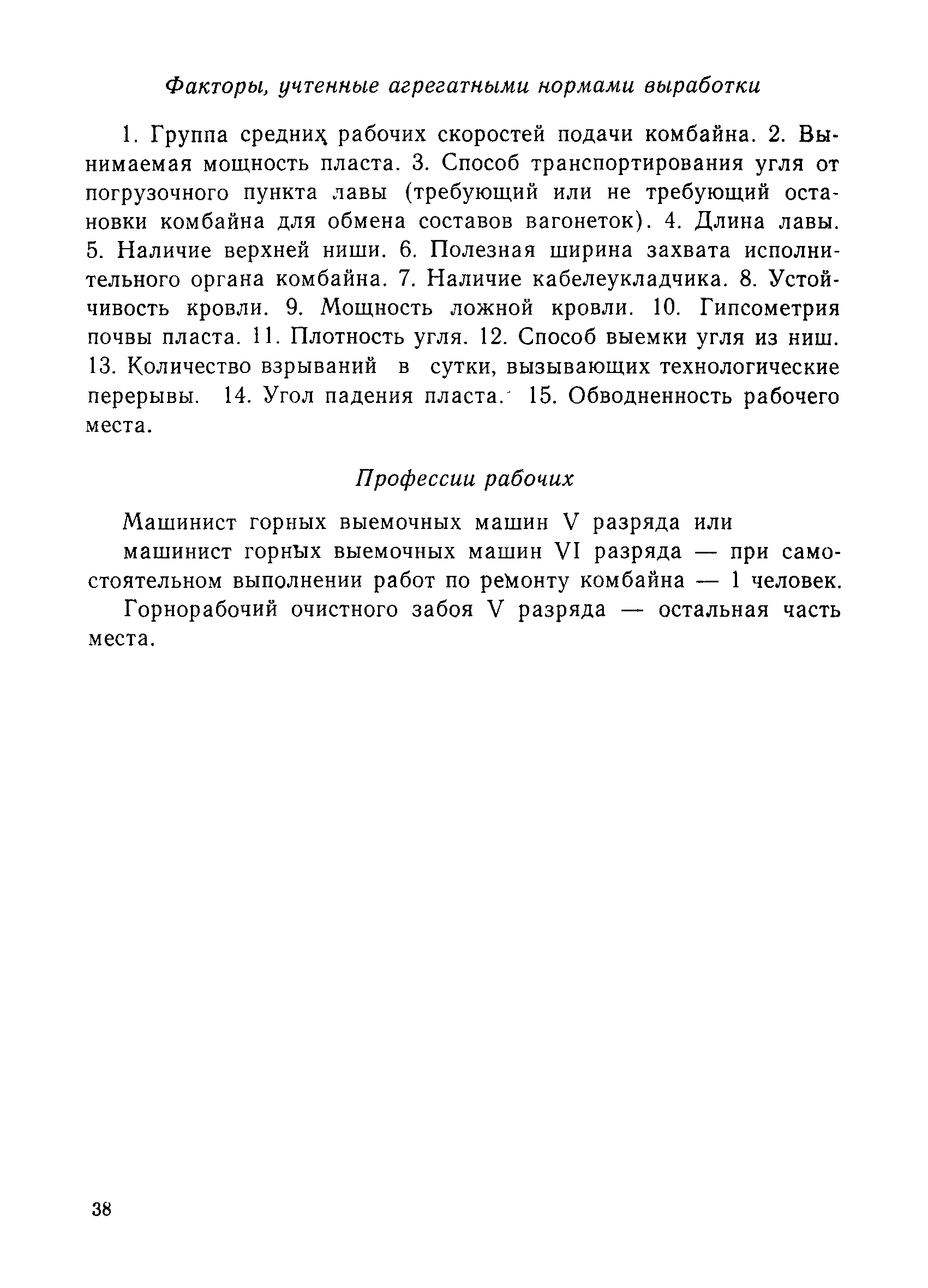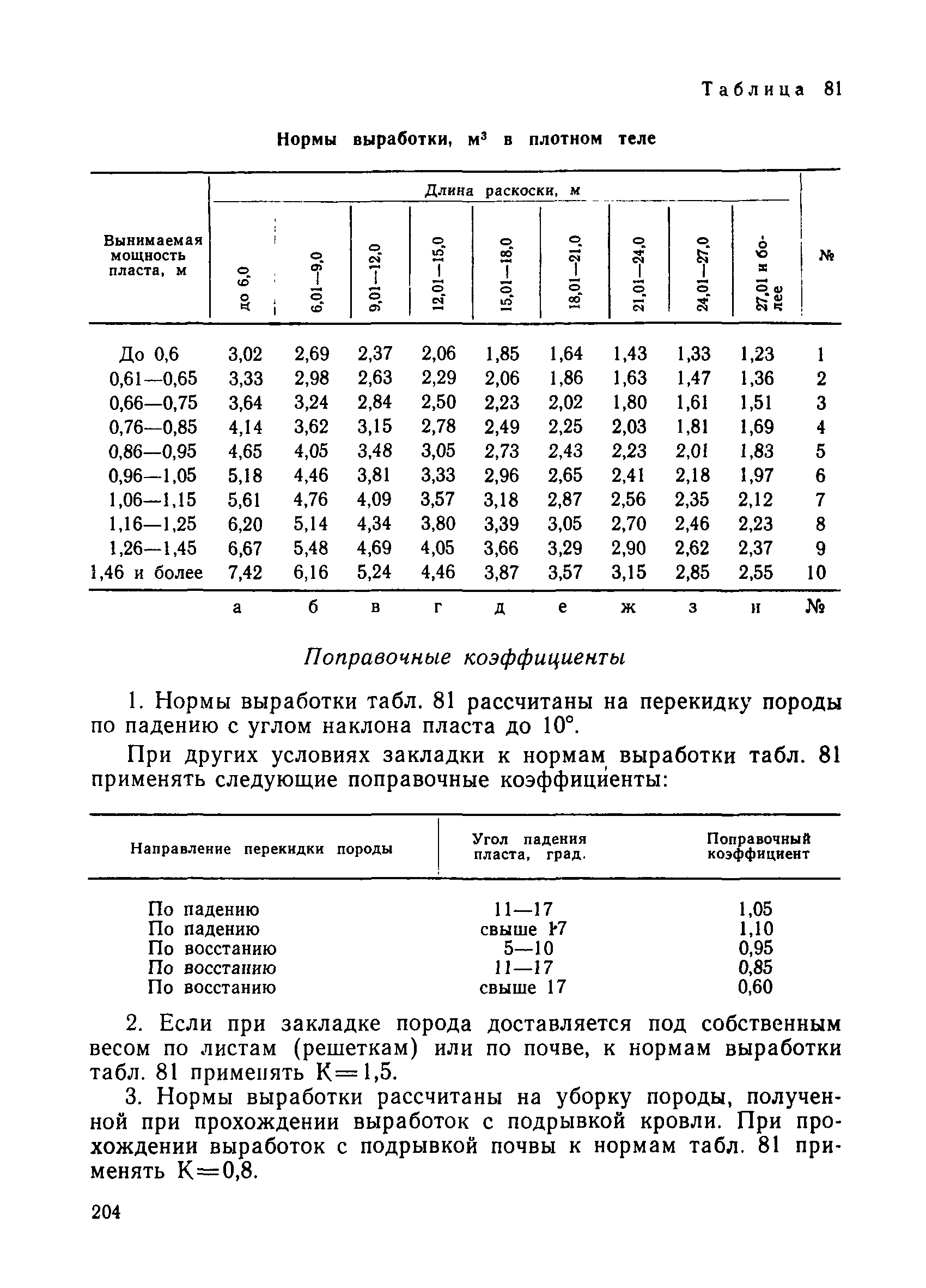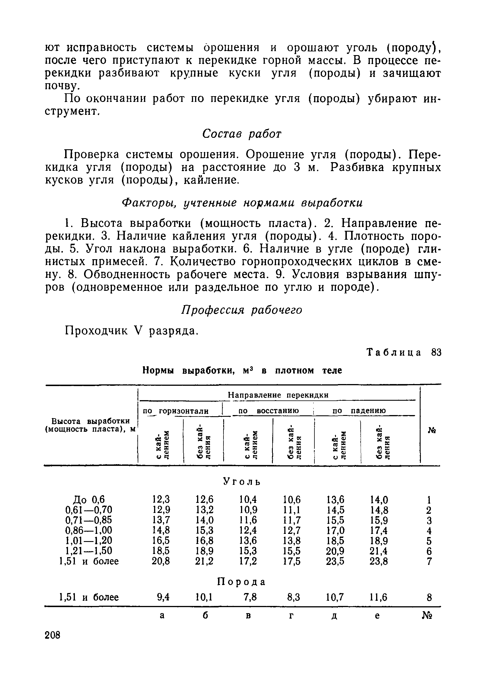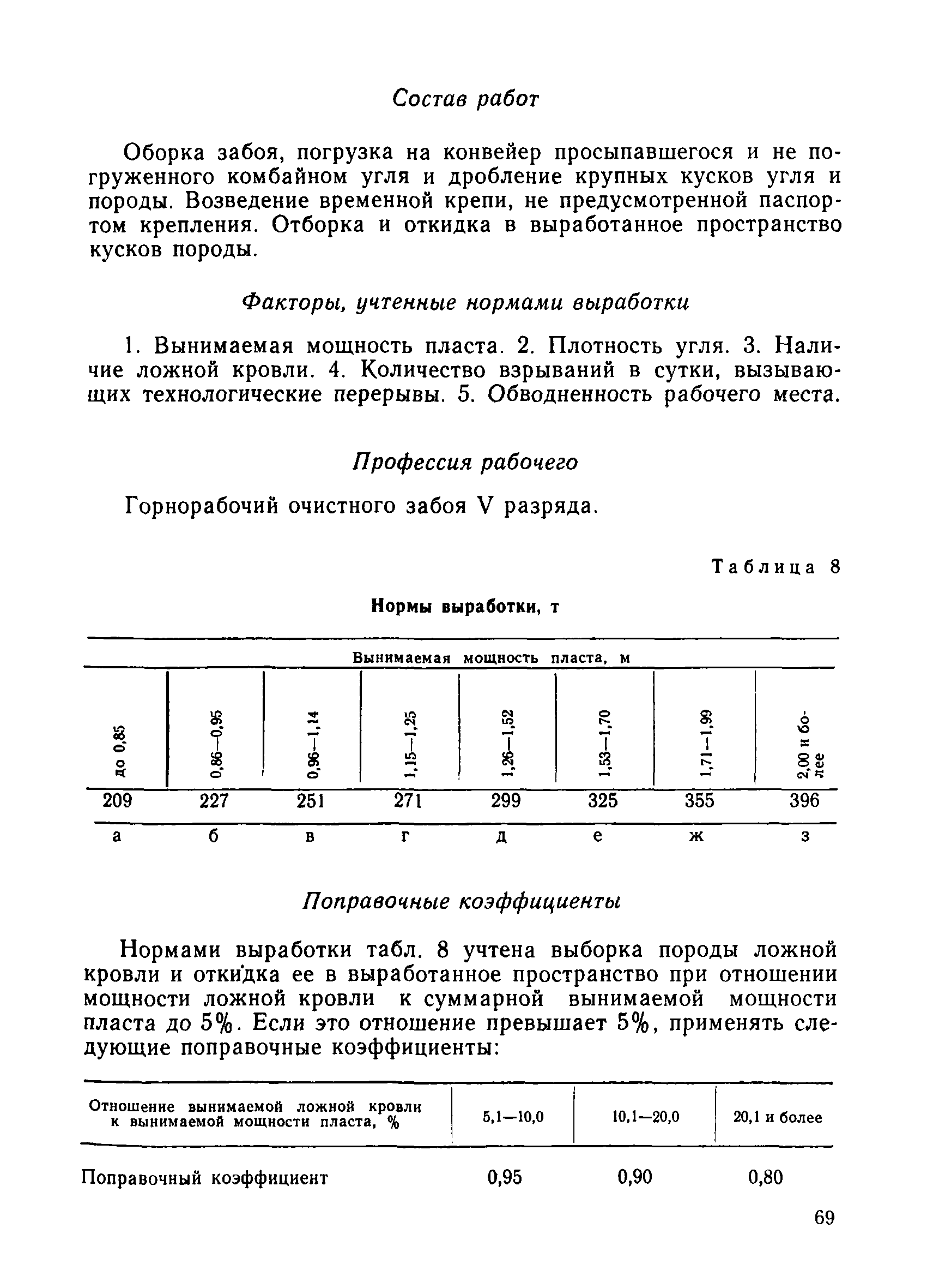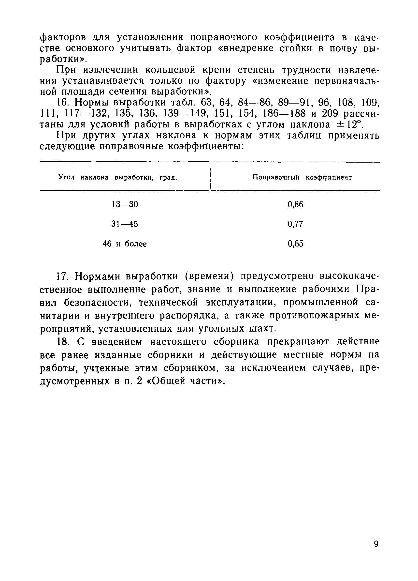 Единые нормы выработки (времени) для шахт производственного объединения "Приморскуголь"| Статус: | справочные материалы, мп, тпр | | Название рус.: | Единые нормы выработки (времени) для шахт производственного объединения "Приморскуголь" | | Дата добавления в базу: | 01.01.2018 | | Дата актуализации: | 01.01.2021 | | Область применения: | Единые нормы выработки (времени) обязательны для применения на всех действующих шахтах производственного объединения "Приморскуголь" | | Оглавление: | Общая часть Техническая часть Нормативная часть Раздел I. Очистные работы § 1. Выемка угля механизированными комплексами типа КМ-81 § 2. Выемка угля механизированными комплексами типов ОМКТ, ОКП, МК § 3. Выемка угля узкозахватными комбайнами типов КШ и ГШ-68 § 4. Оформление забоя после выемки угля узкозахватными комбайнами типов КШ и ГШ-68 § 5. Выемка угля узкозахватными комбайнами 1К-101, 2К-52, МК-67, БК-52 § 6. Оформление забоя после выемки угля узкозахватными комбайнами 1K-101, 2К-52, МК-67 и БК-52 § 7. Выемка угля комбайнами типов УКР, «Темп», КТ, А-70 в лавах на пластах наклонного и крутого падения § 8. Спуск (перегон) комбайнов типов УКР, «Темп», КТ, А-70 в лавах на пластах наклонного и крутого падения с передвижкой крана-балки § 9. Передвижка предохранительной лебедки 1ЛГКН § 10. Оформление забоя после выемки угля комбайнами типов УКР, «Темп», КТ, А-70 в лавах на пластах наклонного падения § 11. Выемка угля в лавах комбайном «Урал-2М» и подготовка его к выемке следующей полосы угля § 12. Оформление забоя после выемки угля комбайном «Урал-2М» § 13. Передвижка гидрофицированной посадочной крепи «Спутник» § 14. Выемка угля в лавах, оборудованных комбайнами К-56М A. Выемка угля Б. Разворот комбайна на пластах пологого падения B. Перегон комбайна § 15. Выемка угля проходческими комбайнами в очистных забоях на пластах пологого падения § 16. Навалоотбойка, навалка угля § 17. Бурение шпуров по углю ручными электросверлами (пневмосверлами) в лавах и камерах § 18. Уборка угля в очистных забоях с помощью скреперной установки § 19. Передвижка скреперной установки § 20. Выемка угля отбойными молотками § 21. Выемка угля с применением ВМ в очистных забоях на пластах крутого падения § 22. Крепление очистных забоев на пластах пологого и наклонного падения металлическими (клиновыми и гидравлическими) стойками § 23. Крепление очистных забоев деревянной крепью § 24. Возведение за комбайном временной деревянной крепи, предусмотренной паспортом крепления § 25. Навеска и снятие металлических шарнирных верхняков § 26. Затяжка кровли, почвы и забоя при креплении § 27. Передвижка специальной крепи типа ОКС на сопряжениях лав со штреками § 28. Установка рам на сопряжениях лав с прилегающими выработками § 29. Выбивка и извлечение металлических (клиновых и гидравлических) стоек в лавах на пластах пологого и наклонного падения при посадке кровли на металлическую органную крепь § 30. Возведение деревянной органной крепи § 31. Кладка и переноска деревянных костров § 32. Установка распорной крепи в очистных забоях § 33. Посадка кровли при помощи лебедки § 34. Бурение шпуров в стойках при посадке кровли с помощью малогабаритных патронов § 35. Передвижка перегружателей гидродомкратом при помощи упорной стойки § 36. Переноска рештаков (листов) в лавах на пластах пологого и наклонного падения § 37. Переноска деревянных рештаков (откосов) в лавах на пластах круто