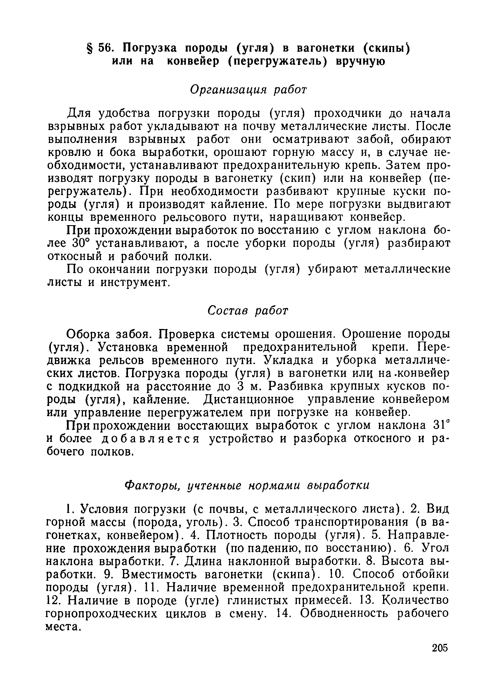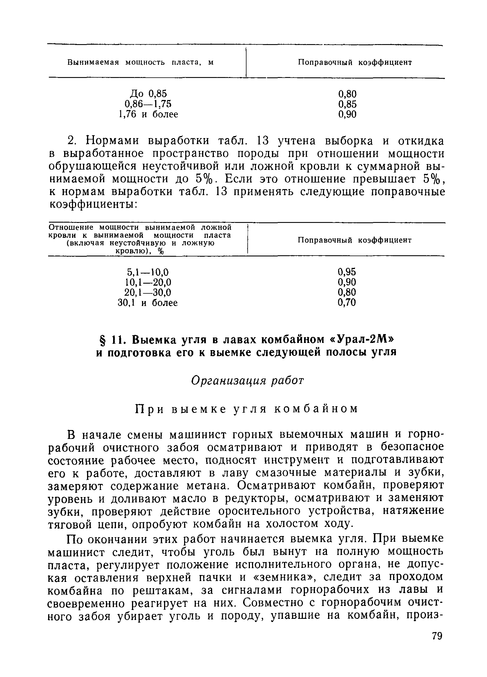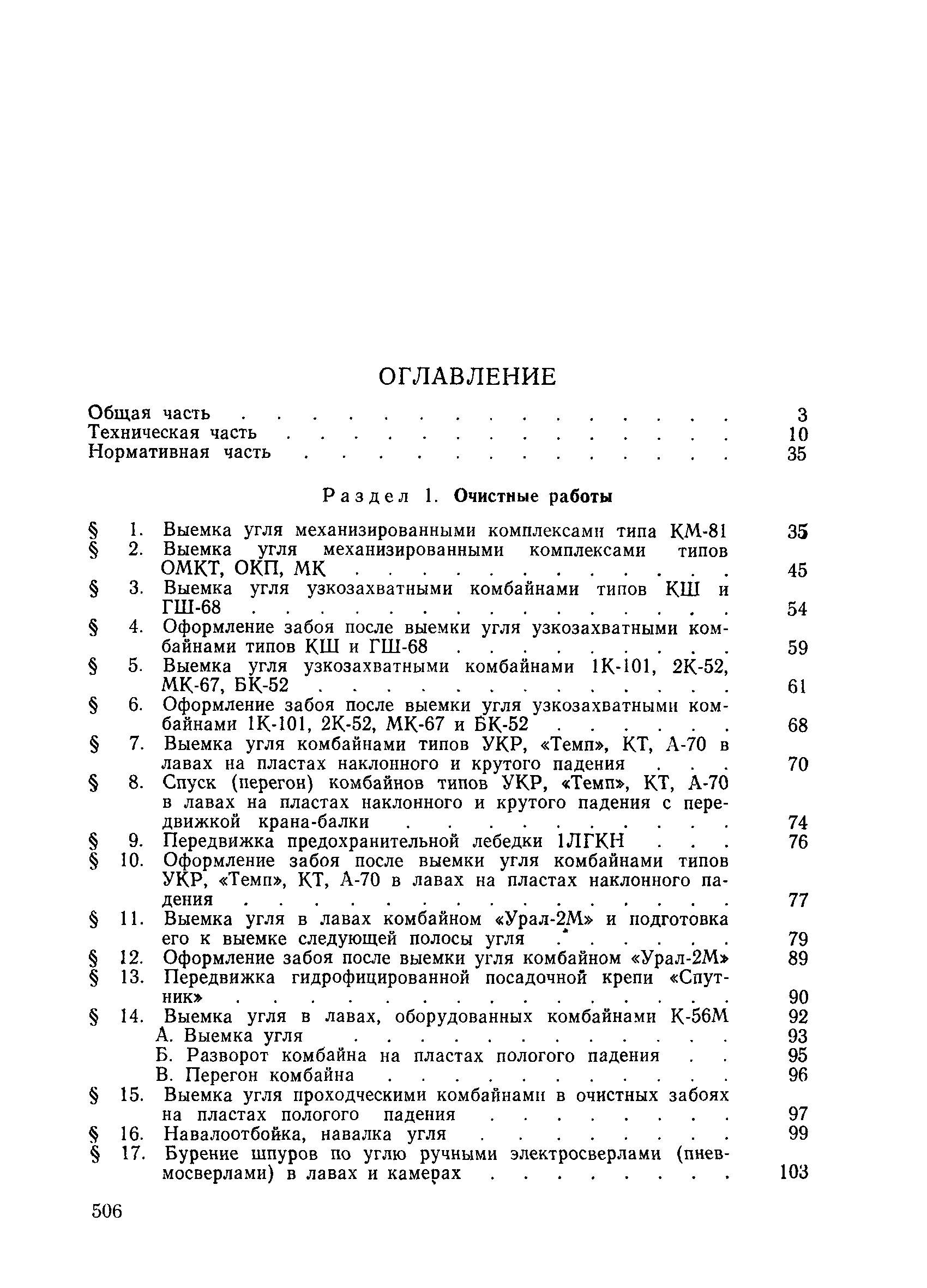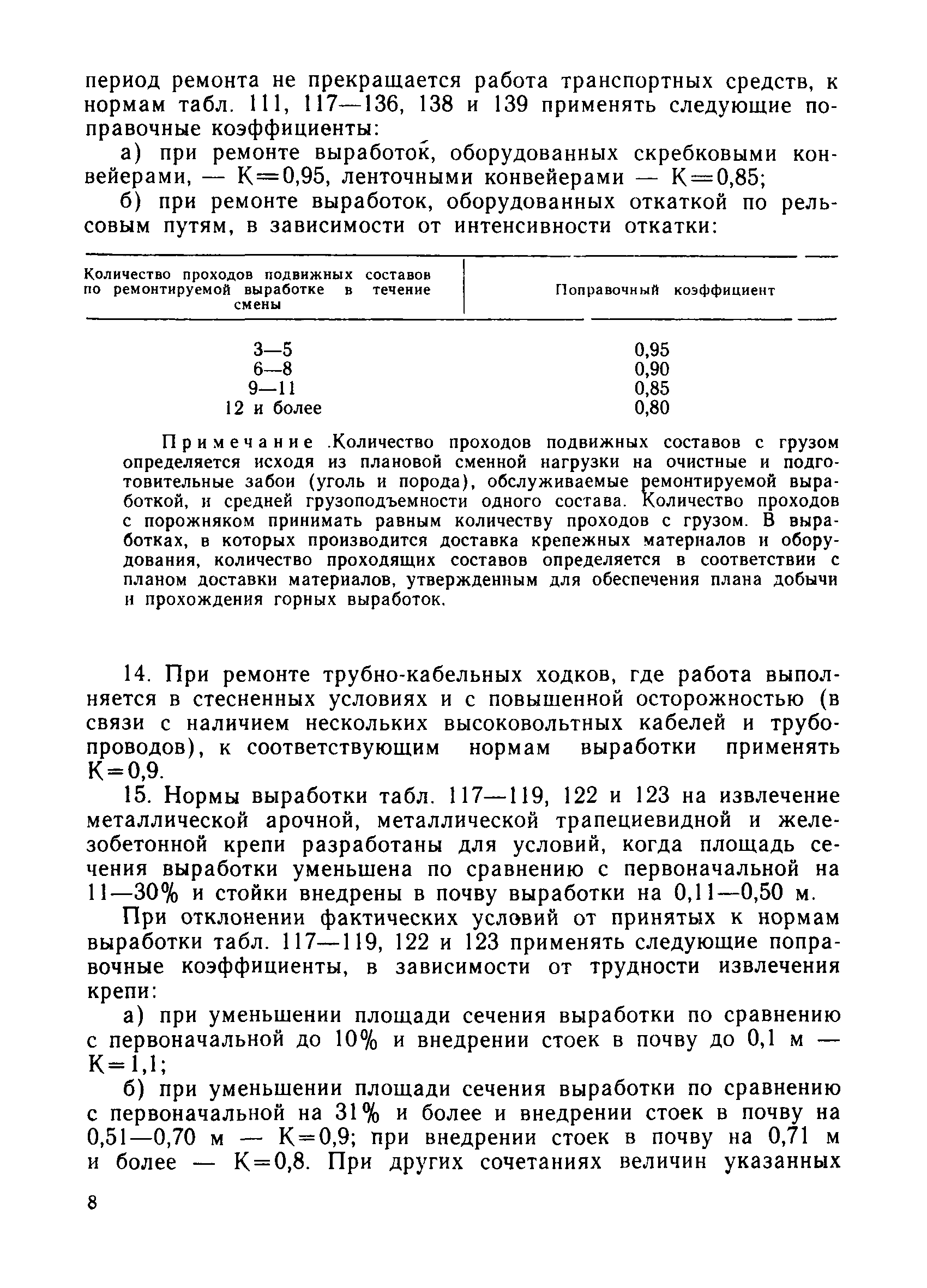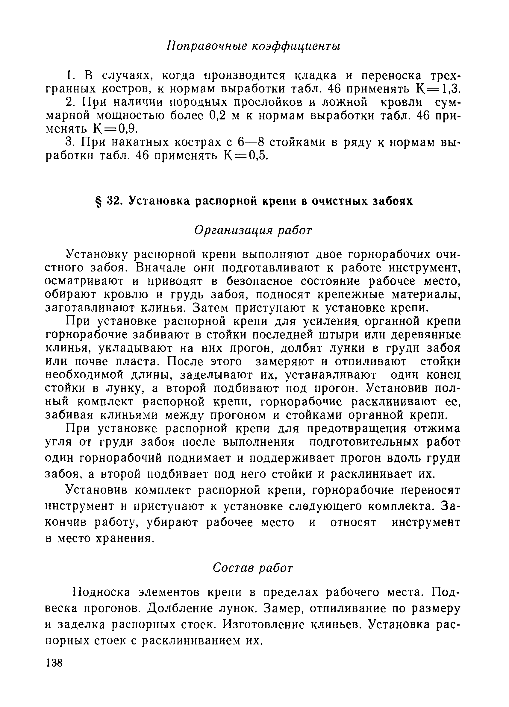 Единые нормы выработки (времени) для шахт производственного объединения "Приморскуголь"| Статус: | справочные материалы, мп, тпр | | Название рус.: | Единые нормы выработки (времени) для шахт производственного объединения "Приморскуголь" | | Дата добавления в базу: | 01.01.2018 | | Дата актуализации: | 01.01.2021 | | Область применения: | Единые нормы выработки (времени) обязательны для применения на всех действующих шахтах производственного объединения "Приморскуголь" | | Оглавление: | Общая часть Техническая часть Нормативная часть Раздел I. Очистные работы § 1. Выемка угля механизированными комплексами типа КМ-81 § 2. Выемка угля механизированными комплексами типов ОМКТ, ОКП, МК § 3. Выемка угля узкозахватными комбайнами типов КШ и ГШ-68 § 4. Оформление забоя после выемки угля узкозахватными комбайнами типов КШ и ГШ-68 § 5. Выемка угля узкозахватными комбайнами 1К-101, 2К-52, МК-67, БК-52 § 6. Оформление забоя после выемки угля узкозахватными комбайнами 1K-101, 2К-52, МК-67 и БК-52 § 7. Выемка угля комбайнами типов УКР, «Темп», КТ, А-70 в лавах на пластах наклонного и крутого падения § 8. Спуск (перегон) комбайнов типов УКР, «Темп», КТ, А-70 в лавах на пластах наклонного и крутого падения с передвижкой крана-балки § 9. Передвижка предохранительной лебедки 1ЛГКН § 10. Оформление забоя после выемки угля комбайнами типов УКР, «Темп», КТ, А-70 в лавах на пластах наклонного падения § 11. Выемка угля в лавах комбайном «Урал-2М» и подготовка его к выемке следующей полосы угля § 12. Оформление забоя после выемки угля комбайном «Урал-2М» § 13. Передвижка гидрофицированной посадочной крепи «Спутник» § 14. Выемка угля в лавах, оборудованных комбайнами К-56М A. Выемка угля Б. Разворот комбайна на пластах пологого падения B. Перегон комбайна § 15. Выемка угля проходческими комбайнами в очистных забоях на пластах пологого падения § 16. Навалоотбойка, навалка угля § 17. Бурение шпуров по углю ручными электросверлами (пневмосверлами) в лавах и камерах § 18. Уборка угля в очистных забоях с помощью скреперной установки § 19. Передвижка скреперной установки § 20. Выемка угля отбойными молотками § 21. Выемка угля с применением ВМ в очистных забоях на пластах крутого падения § 22. Крепление очистных забоев на пластах пологого и наклонного падения металлическими (клиновыми и гидравлическими) стойками § 23. Крепление очистных забоев деревянной крепью § 24. Возведение за комбайном временной деревянной крепи, предусмотренной паспортом крепления § 25. Навеска и снятие металлических шарнирных верхняков § 26. Затяжка кровли, почвы и забоя при креплении § 27. Передвижка специальной крепи типа ОКС на сопряжениях лав со штреками § 28. Установка рам на сопряжениях лав с прилегающими выработками § 29. Выбивка и извлечение металлических (клиновых и гидравлических) стоек в лавах на пластах пологого и наклонного падения при посадке кровли на металлическую органную крепь § 30. Возведение деревянной органной крепи § 31. Кладка и переноска деревянных костров § 32. Установка распорной крепи в очистных забоях § 33. Посадка кровли при помощи лебедки § 34. Бурение шпуров в стойках при посадке кровли с помощью малогабаритных патронов § 35. Передвижка перегружателей гидродомкратом при помощи упорной стойки § 36. Переноска рештаков (листов) в лавах на пластах пологого и наклонного падения § 37. Переноска деревянных рештаков (откосов) в лавах на пластах круто