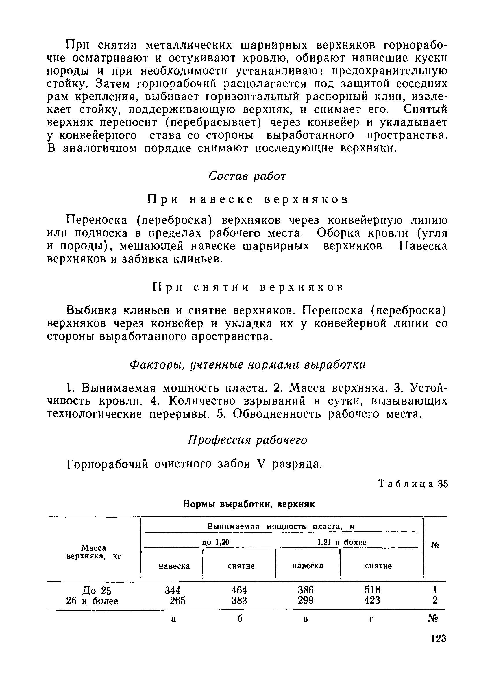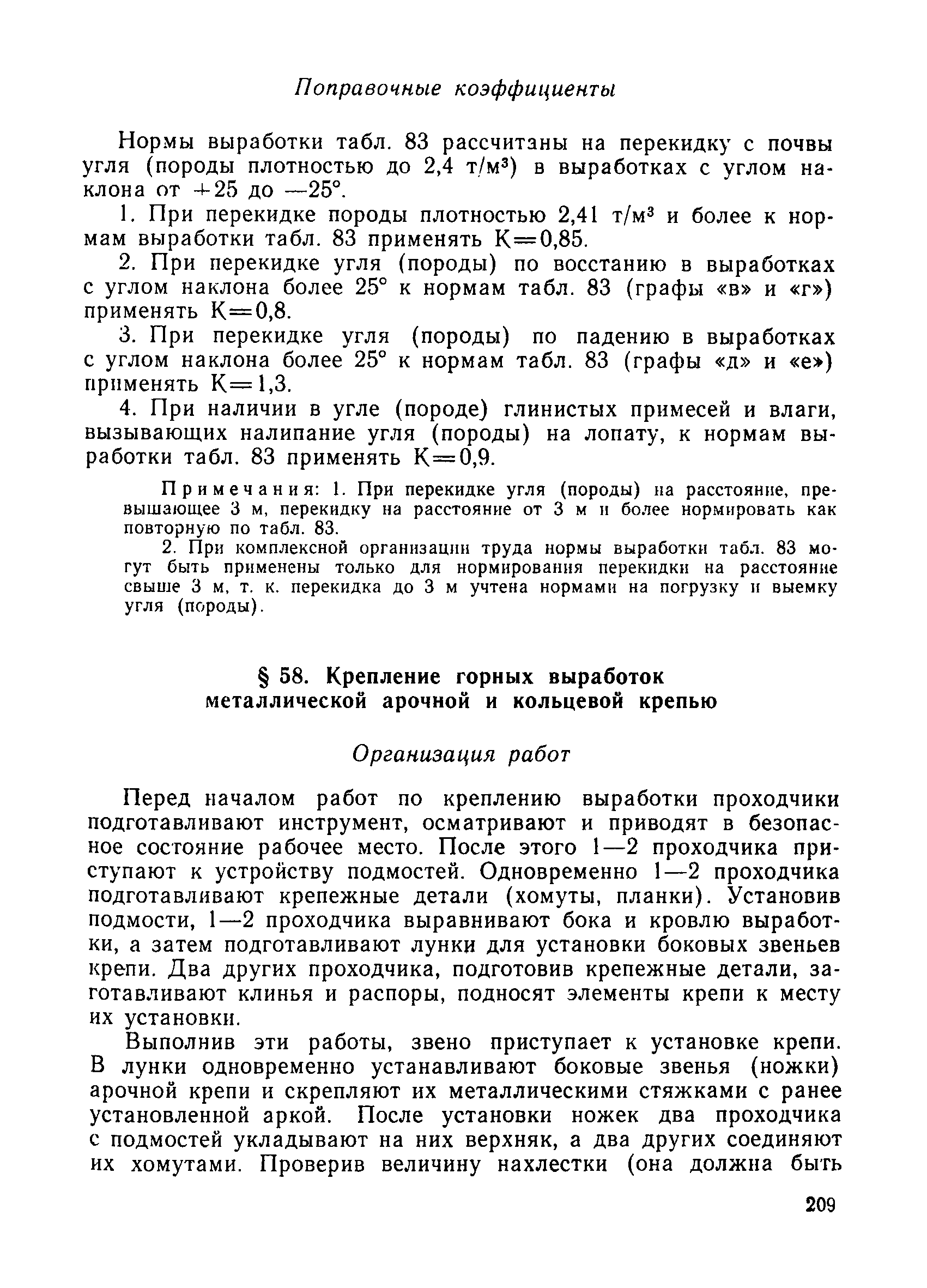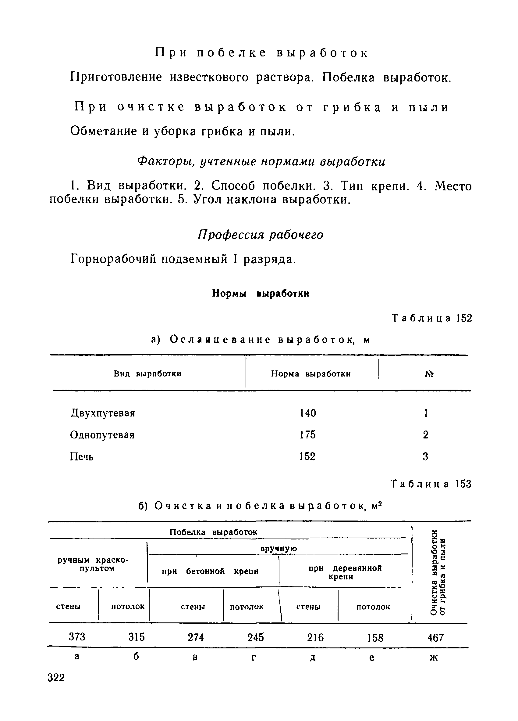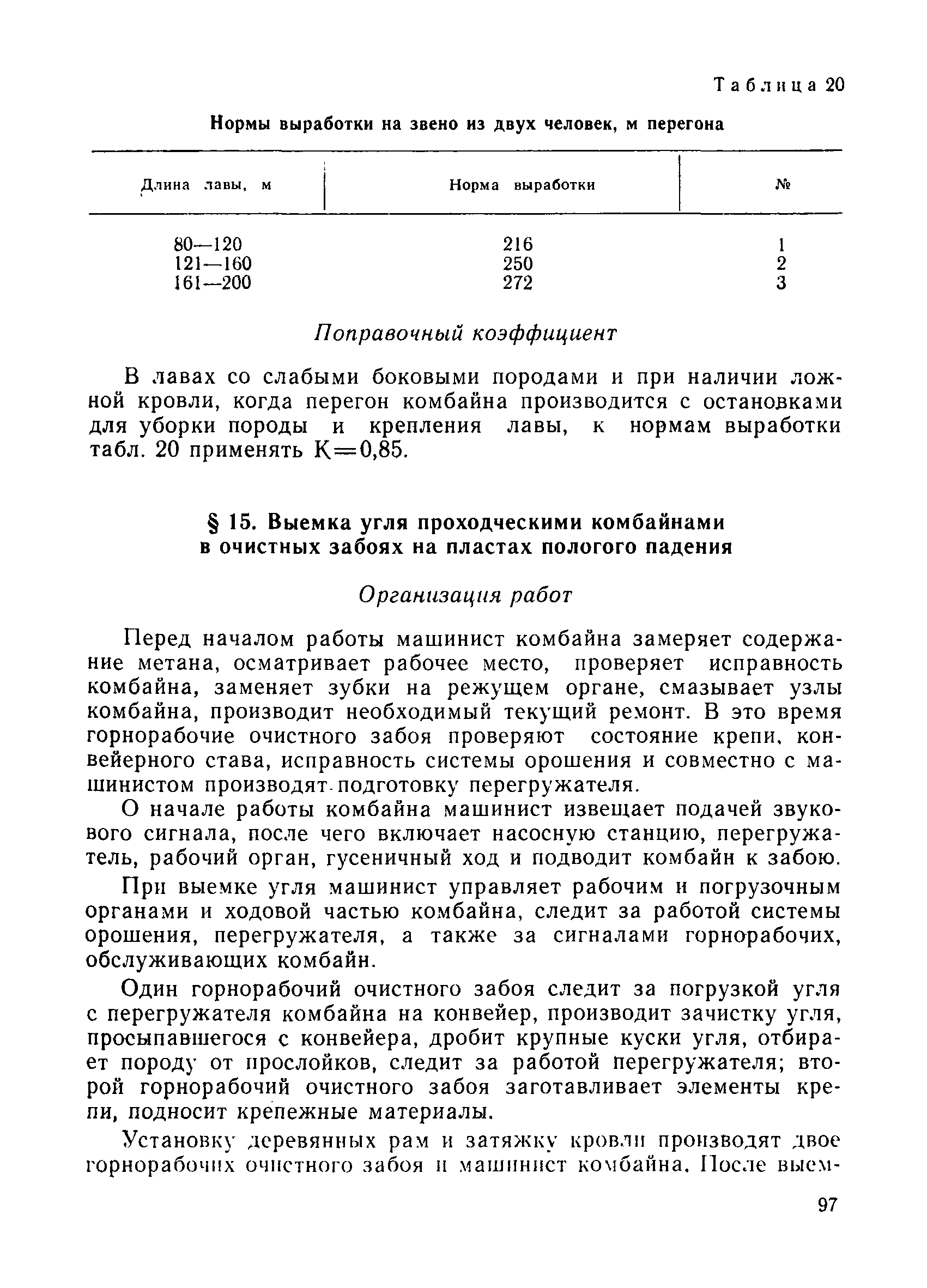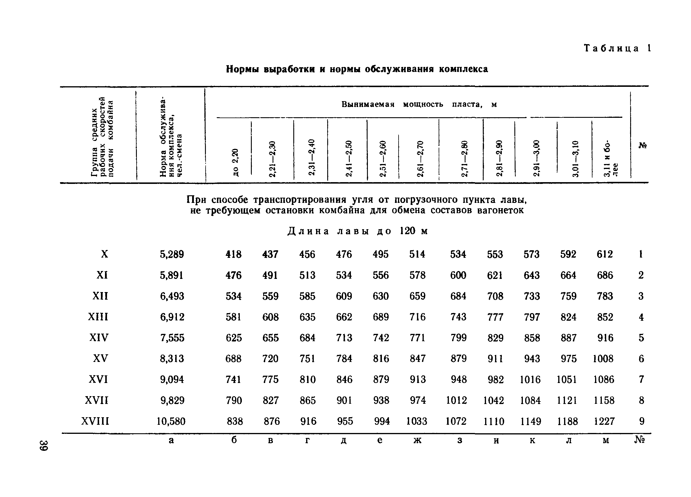 Единые нормы выработки (времени) для шахт производственного объединения "Приморскуголь"| Статус: | справочные материалы, мп, тпр | | Название рус.: | Единые нормы выработки (времени) для шахт производственного объединения "Приморскуголь" | | Дата добавления в базу: | 01.01.2018 | | Дата актуализации: | 01.01.2021 | | Область применения: | Единые нормы выработки (времени) обязательны для применения на всех действующих шахтах производственного объединения "Приморскуголь" | | Оглавление: | Общая часть Техническая часть Нормативная часть Раздел I. Очистные работы § 1. Выемка угля механизированными комплексами типа КМ-81 § 2. Выемка угля механизированными комплексами типов ОМКТ, ОКП, МК § 3. Выемка угля узкозахватными комбайнами типов КШ и ГШ-68 § 4. Оформление забоя после выемки угля узкозахватными комбайнами типов КШ и ГШ-68 § 5. Выемка угля узкозахватными комбайнами 1К-101, 2К-52, МК-67, БК-52 § 6. Оформление забоя после выемки угля узкозахватными комбайнами 1K-101, 2К-52, МК-67 и БК-52 § 7. Выемка угля комбайнами типов УКР, «Темп», КТ, А-70 в лавах на пластах наклонного и крутого падения § 8. Спуск (перегон) комбайнов типов УКР, «Темп», КТ, А-70 в лавах на пластах наклонного и крутого падения с передвижкой крана-балки § 9. Передвижка предохранительной лебедки 1ЛГКН § 10. Оформление забоя после выемки угля комбайнами типов УКР, «Темп», КТ, А-70 в лавах на пластах наклонного падения § 11. Выемка угля в лавах комбайном «Урал-2М» и подготовка его к выемке следующей полосы угля § 12. Оформление забоя после выемки угля комбайном «Урал-2М» § 13. Передвижка гидрофицированной посадочной крепи «Спутник» § 14. Выемка угля в лавах, оборудованных комбайнами К-56М A. Выемка угля Б. Разворот комбайна на пластах пологого падения B. Перегон комбайна § 15. Выемка угля проходческими комбайнами в очистных забоях на пластах пологого падения § 16. Навалоотбойка, навалка угля § 17. Бурение шпуров по углю ручными электросверлами (пневмосверлами) в лавах и камерах § 18. Уборка угля в очистных забоях с помощью скреперной установки § 19. Передвижка скреперной установки § 20. Выемка угля отбойными молотками § 21. Выемка угля с применением ВМ в очистных забоях на пластах крутого падения § 22. Крепление очистных забоев на пластах пологого и наклонного падения металлическими (клиновыми и гидравлическими) стойками § 23. Крепление очистных забоев деревянной крепью § 24. Возведение за комбайном временной деревянной крепи, предусмотренной паспортом крепления § 25. Навеска и снятие металлических шарнирных верхняков § 26. Затяжка кровли, почвы и забоя при креплении § 27. Передвижка специальной крепи типа ОКС на сопряжениях лав со штреками § 28. Установка рам на сопряжениях лав с прилегающими выработками § 29. Выбивка и извлечение металлических (клиновых и гидравлических) стоек в лавах на пластах пологого и наклонного падения при посадке кровли на металлическую органную крепь § 30. Возведение деревянной органной крепи § 31. Кладка и переноска деревянных костров § 32. Установка распорной крепи в очистных забоях § 33. Посадка кровли при помощи лебедки § 34. Бурение шпуров в стойках при посадке кровли с помощью малогабаритных патронов § 35. Передвижка перегружателей гидродомкратом при помощи упорной стойки § 36. Переноска рештаков (листов) в лавах на пластах пологого и наклонного падения § 37. Переноска деревянных рештаков (откосов) в лавах на пластах круто