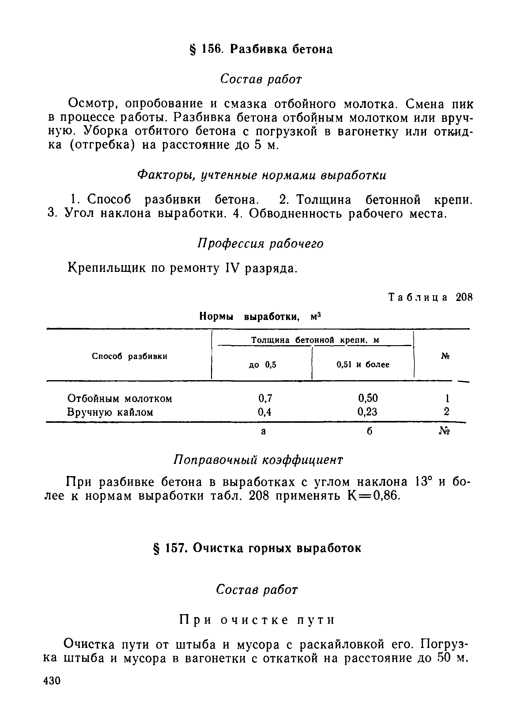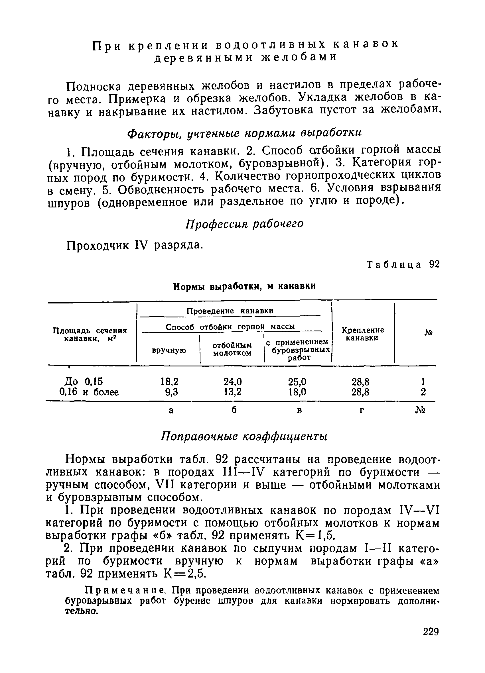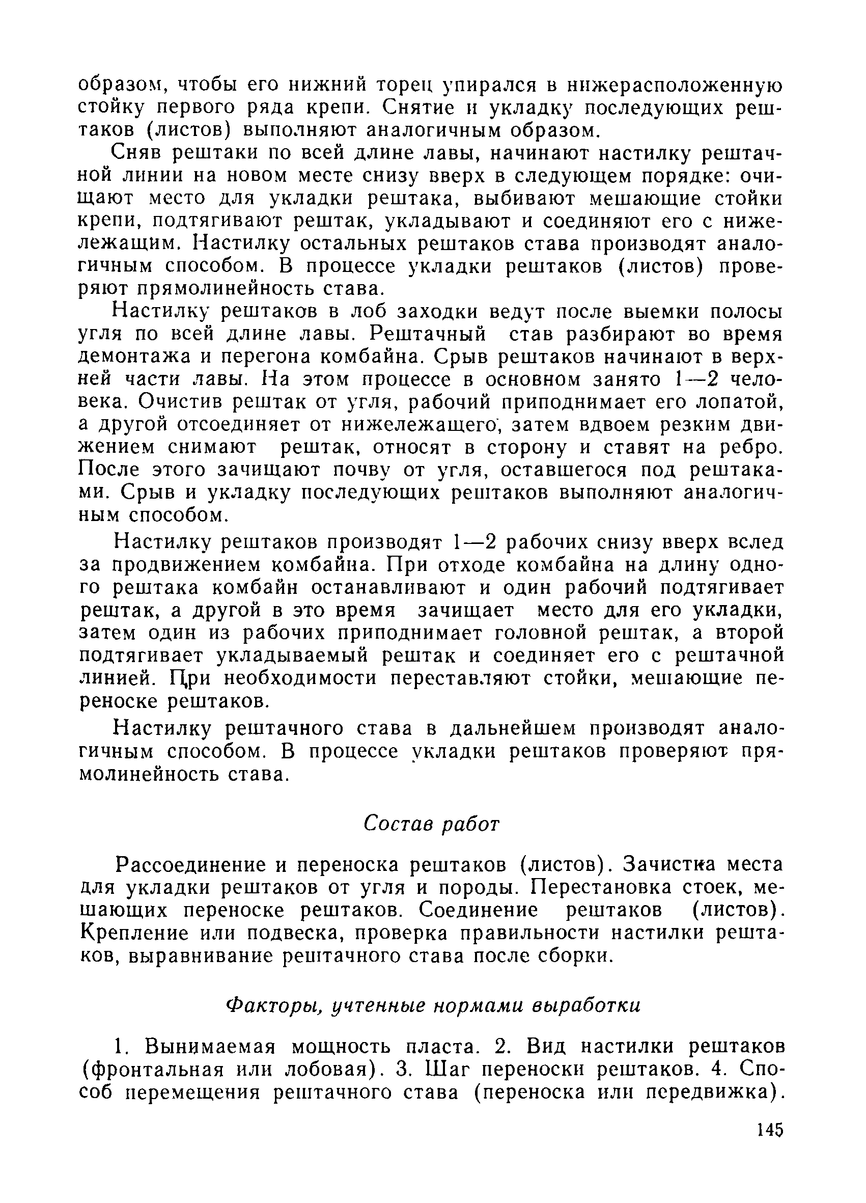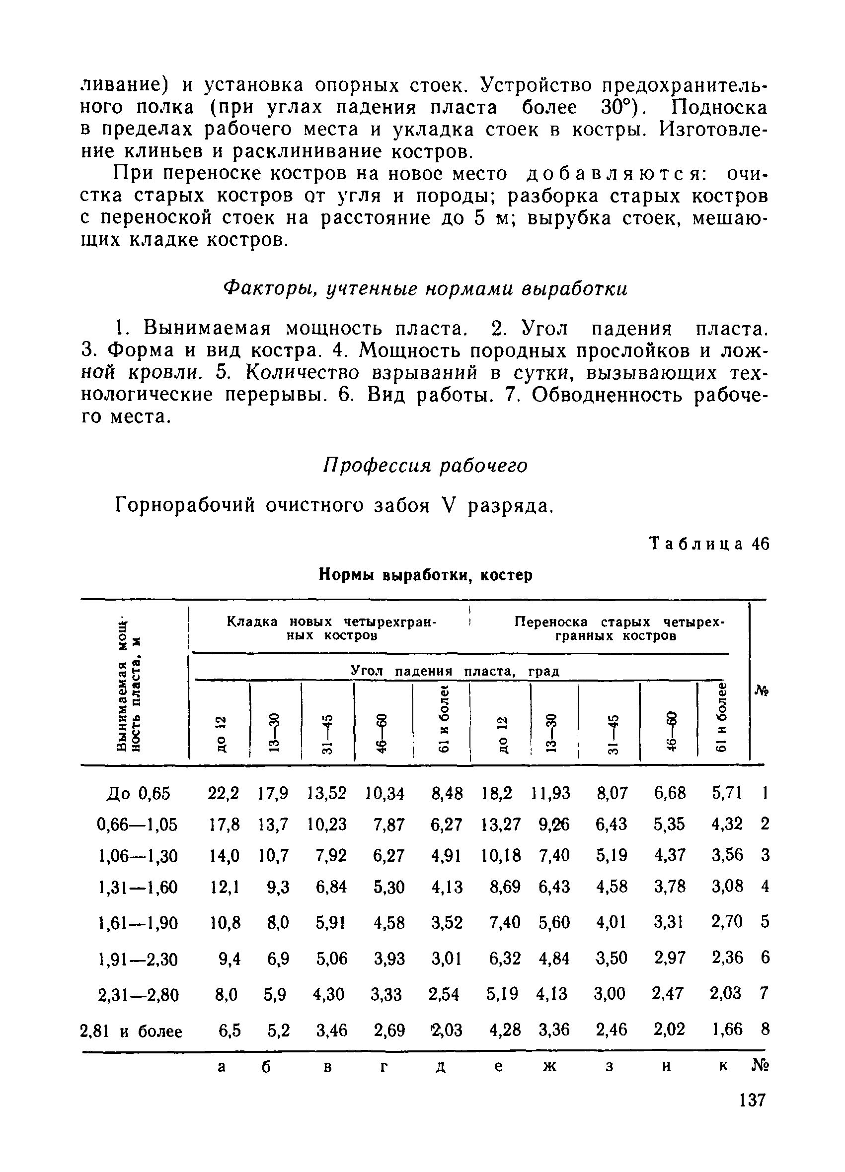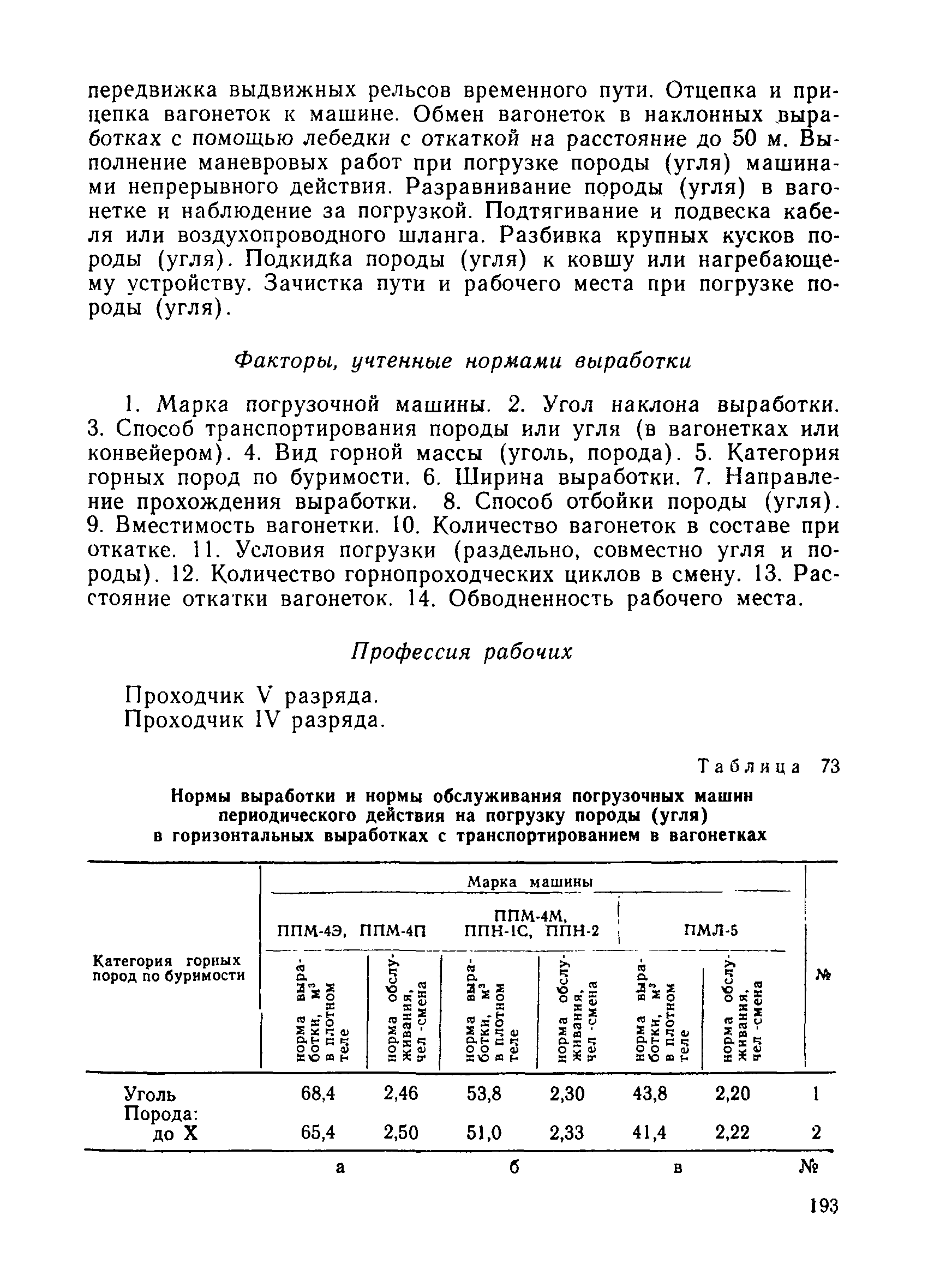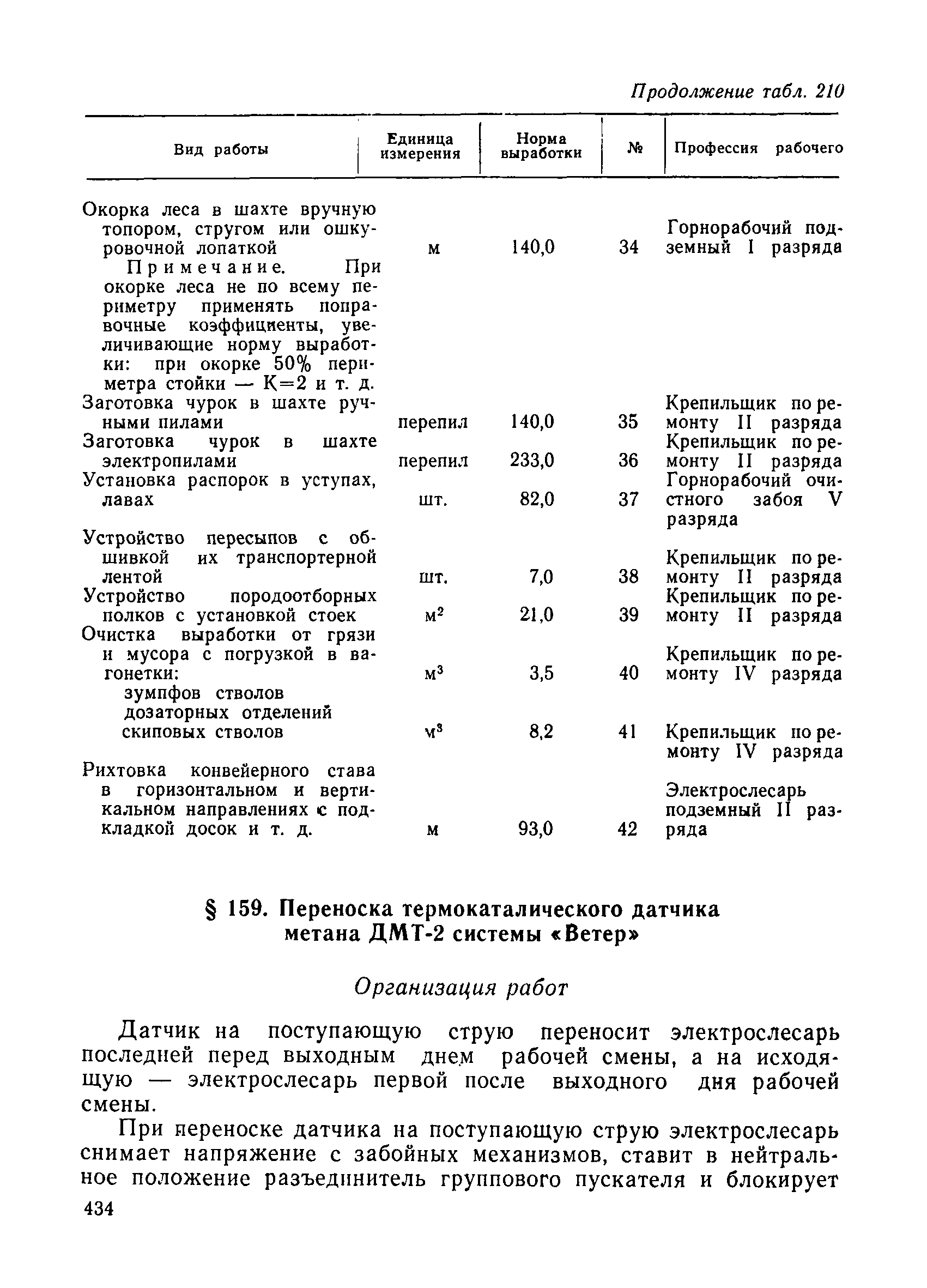 Единые нормы выработки (времени) для шахт производственного объединения "Приморскуголь"| Статус: | справочные материалы, мп, тпр | | Название рус.: | Единые нормы выработки (времени) для шахт производственного объединения "Приморскуголь" | | Дата добавления в базу: | 01.01.2018 | | Дата актуализации: | 01.01.2021 | | Область применения: | Единые нормы выработки (времени) обязательны для применения на всех действующих шахтах производственного объединения "Приморскуголь" | | Оглавление: | Общая часть Техническая часть Нормативная часть Раздел I. Очистные работы § 1. Выемка угля механизированными комплексами типа КМ-81 § 2. Выемка угля механизированными комплексами типов ОМКТ, ОКП, МК § 3. Выемка угля узкозахватными комбайнами типов КШ и ГШ-68 § 4. Оформление забоя после выемки угля узкозахватными комбайнами типов КШ и ГШ-68 § 5. Выемка угля узкозахватными комбайнами 1К-101, 2К-52, МК-67, БК-52 § 6. Оформление забоя после выемки угля узкозахватными комбайнами 1K-101, 2К-52, МК-67 и БК-52 § 7. Выемка угля комбайнами типов УКР, «Темп», КТ, А-70 в лавах на пластах наклонного и крутого падения § 8. Спуск (перегон) комбайнов типов УКР, «Темп», КТ, А-70 в лавах на пластах наклонного и крутого падения с передвижкой крана-балки § 9. Передвижка предохранительной лебедки 1ЛГКН § 10. Оформление забоя после выемки угля комбайнами типов УКР, «Темп», КТ, А-70 в лавах на пластах наклонного падения § 11. Выемка угля в лавах комбайном «Урал-2М» и подготовка его к выемке следующей полосы угля § 12. Оформление забоя после выемки угля комбайном «Урал-2М» § 13. Передвижка гидрофицированной посадочной крепи «Спутник» § 14. Выемка угля в лавах, оборудованных комбайнами К-56М A. Выемка угля Б. Разворот комбайна на пластах пологого падения B. Перегон комбайна § 15. Выемка угля проходческими комбайнами в очистных забоях на пластах пологого падения § 16. Навалоотбойка, навалка угля § 17. Бурение шпуров по углю ручными электросверлами (пневмосверлами) в лавах и камерах § 18. Уборка угля в очистных забоях с помощью скреперной установки § 19. Передвижка скреперной установки § 20. Выемка угля отбойными молотками § 21. Выемка угля с применением ВМ в очистных забоях на пластах крутого падения § 22. Крепление очистных забоев на пластах пологого и наклонного падения металлическими (клиновыми и гидравлическими) стойками § 23. Крепление очистных забоев деревянной крепью § 24. Возведение за комбайном временной деревянной крепи, предусмотренной паспортом крепления § 25. Навеска и снятие металлических шарнирных верхняков § 26. Затяжка кровли, почвы и забоя при креплении § 27. Передвижка специальной крепи типа ОКС на сопряжениях лав со штреками § 28. Установка рам на сопряжениях лав с прилегающими выработками § 29. Выбивка и извлечение металлических (клиновых и гидравлических) стоек в лавах на пластах пологого и наклонного падения при посадке кровли на металлическую органную крепь § 30. Возведение деревянной органной крепи § 31. Кладка и переноска деревянных костров § 32. Установка распорной крепи в очистных забоях § 33. Посадка кровли при помощи лебедки § 34. Бурение шпуров в стойках при посадке кровли с помощью малогабаритных патронов § 35. Передвижка перегружателей гидродомкратом при помощи упорной стойки § 36. Переноска рештаков (листов) в лавах на пластах пологого и наклонного падения § 37. Переноска деревянных рештаков (откосов) в лавах на пластах круто