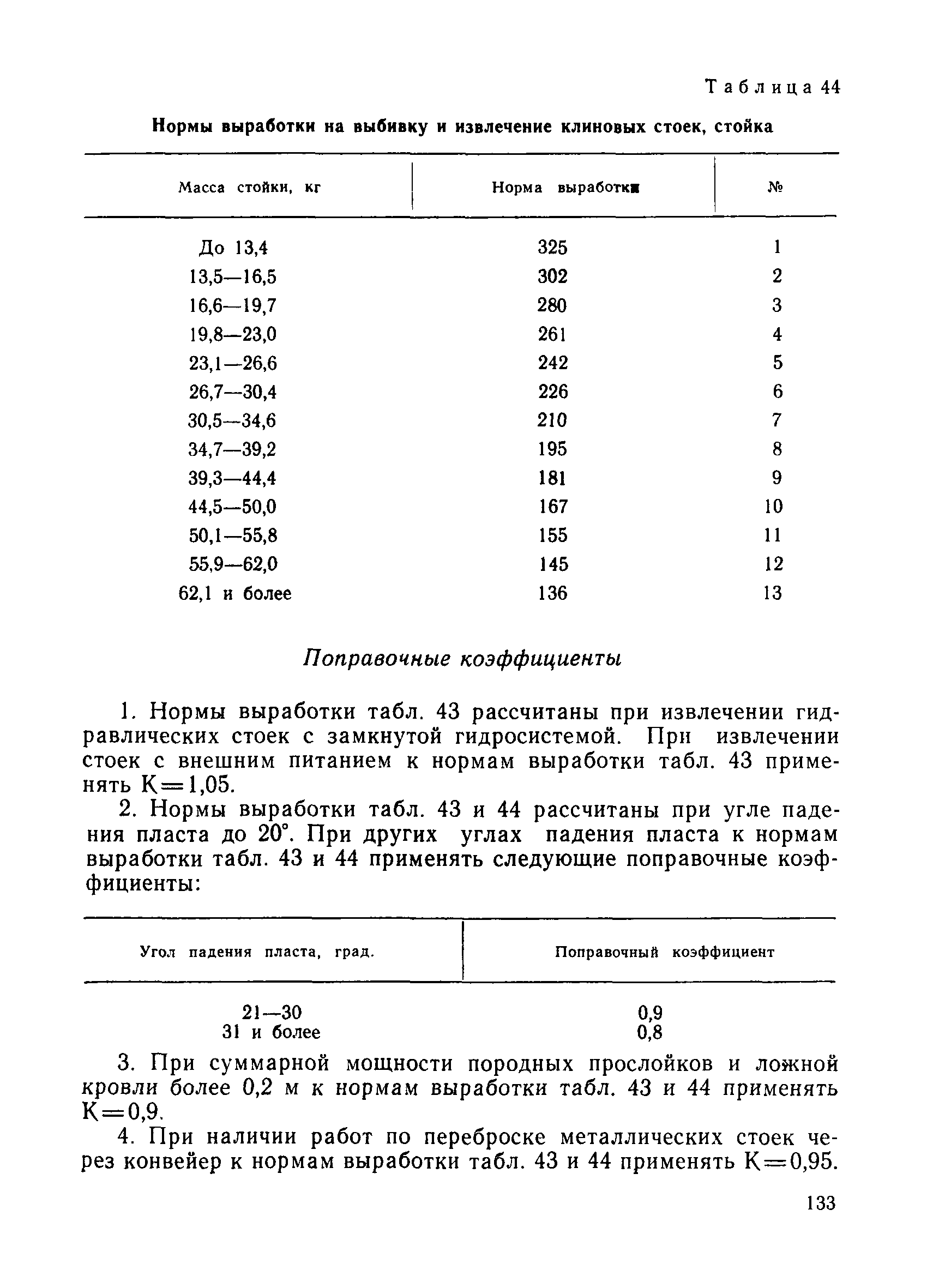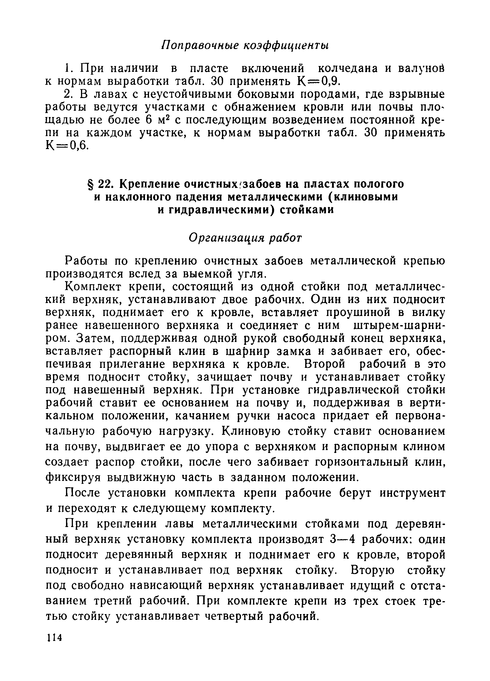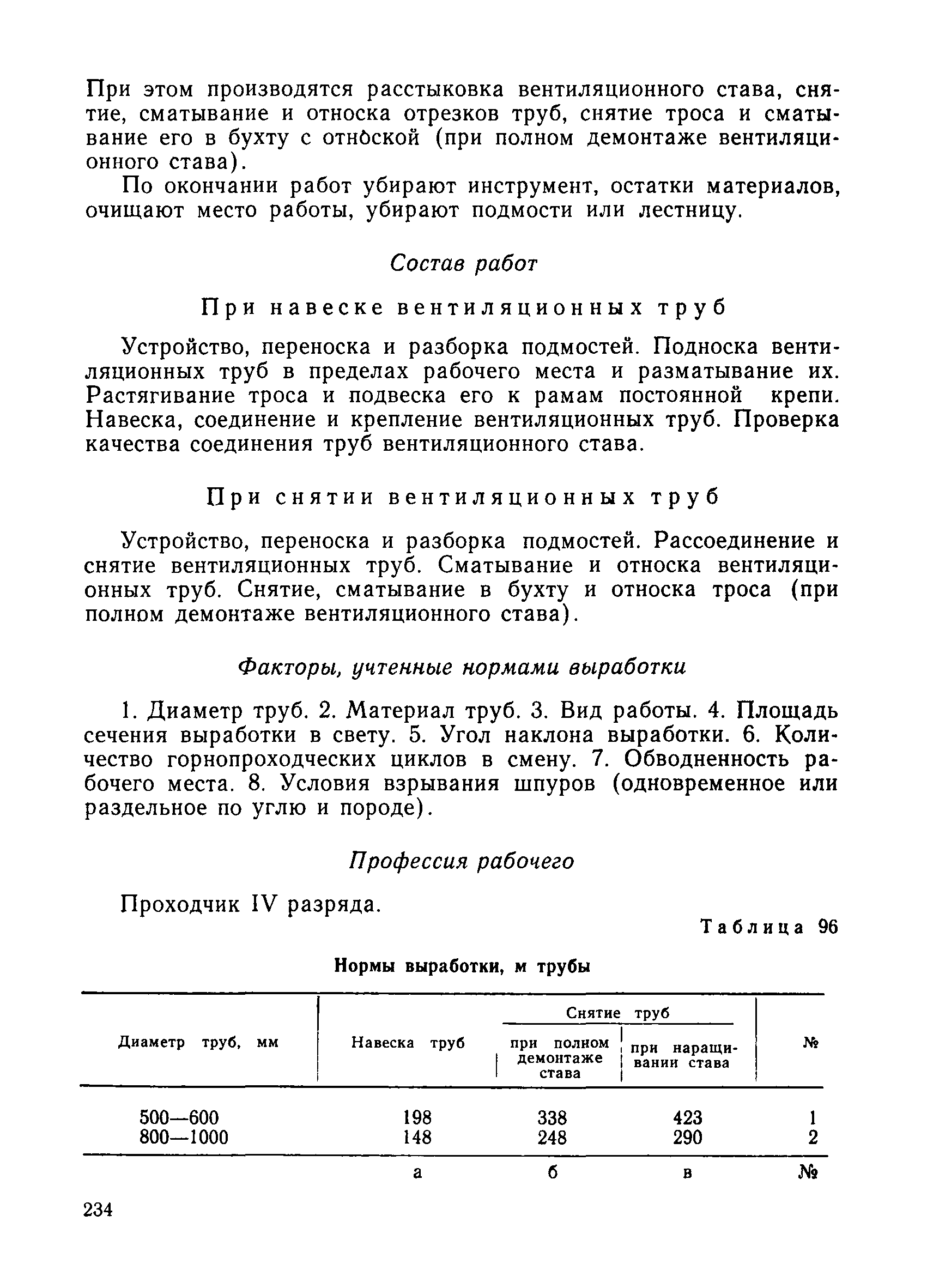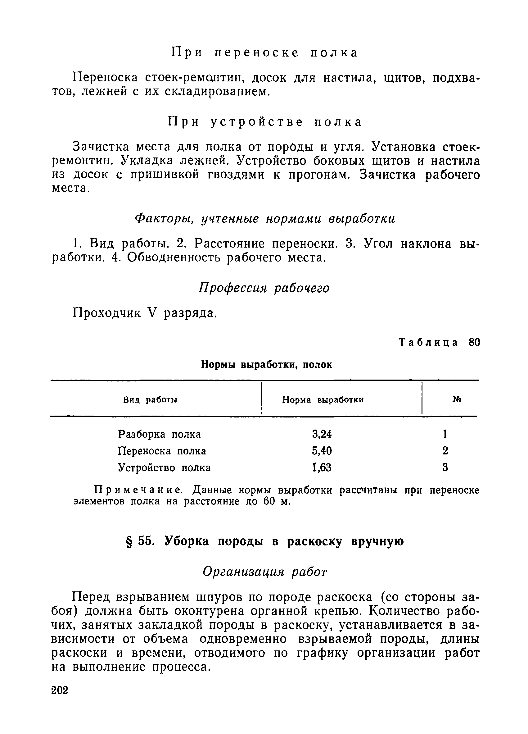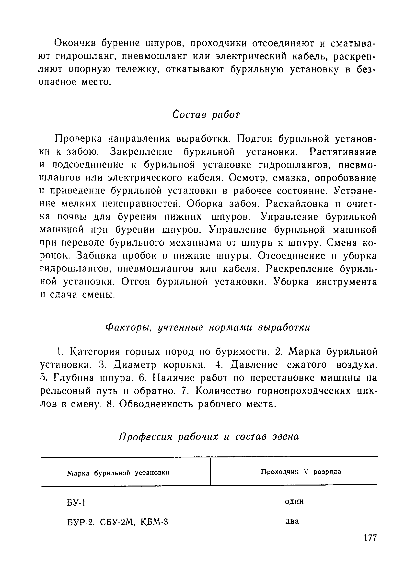 Единые нормы выработки (времени) для шахт производственного объединения "Приморскуголь"| Статус: | справочные материалы, мп, тпр | | Название рус.: | Единые нормы выработки (времени) для шахт производственного объединения "Приморскуголь" | | Дата добавления в базу: | 01.01.2018 | | Дата актуализации: | 01.01.2021 | | Область применения: | Единые нормы выработки (времени) обязательны для применения на всех действующих шахтах производственного объединения "Приморскуголь" | | Оглавление: | Общая часть Техническая часть Нормативная часть Раздел I. Очистные работы § 1. Выемка угля механизированными комплексами типа КМ-81 § 2. Выемка угля механизированными комплексами типов ОМКТ, ОКП, МК § 3. Выемка угля узкозахватными комбайнами типов КШ и ГШ-68 § 4. Оформление забоя после выемки угля узкозахватными комбайнами типов КШ и ГШ-68 § 5. Выемка угля узкозахватными комбайнами 1К-101, 2К-52, МК-67, БК-52 § 6. Оформление забоя после выемки угля узкозахватными комбайнами 1K-101, 2К-52, МК-67 и БК-52 § 7. Выемка угля комбайнами типов УКР, «Темп», КТ, А-70 в лавах на пластах наклонного и крутого падения § 8. Спуск (перегон) комбайнов типов УКР, «Темп», КТ, А-70 в лавах на пластах наклонного и крутого падения с передвижкой крана-балки § 9. Передвижка предохранительной лебедки 1ЛГКН § 10. Оформление забоя после выемки угля комбайнами типов УКР, «Темп», КТ, А-70 в лавах на пластах наклонного падения § 11. Выемка угля в лавах комбайном «Урал-2М» и подготовка его к выемке следующей полосы угля § 12. Оформление забоя после выемки угля комбайном «Урал-2М» § 13. Передвижка гидрофицированной посадочной крепи «Спутник» § 14. Выемка угля в лавах, оборудованных комбайнами К-56М A. Выемка угля Б. Разворот комбайна на пластах пологого падения B. Перегон комбайна § 15. Выемка угля проходческими комбайнами в очистных забоях на пластах пологого падения § 16. Навалоотбойка, навалка угля § 17. Бурение шпуров по углю ручными электросверлами (пневмосверлами) в лавах и камерах § 18. Уборка угля в очистных забоях с помощью скреперной установки § 19. Передвижка скреперной установки § 20. Выемка угля отбойными молотками § 21. Выемка угля с применением ВМ в очистных забоях на пластах крутого падения § 22. Крепление очистных забоев на пластах пологого и наклонного падения металлическими (клиновыми и гидравлическими) стойками § 23. Крепление очистных забоев деревянной крепью § 24. Возведение за комбайном временной деревянной крепи, предусмотренной паспортом крепления § 25. Навеска и снятие металлических шарнирных верхняков § 26. Затяжка кровли, почвы и забоя при креплении § 27. Передвижка специальной крепи типа ОКС на сопряжениях лав со штреками § 28. Установка рам на сопряжениях лав с прилегающими выработками § 29. Выбивка и извлечение металлических (клиновых и гидравлических) стоек в лавах на пластах пологого и наклонного падения при посадке кровли на металлическую органную крепь § 30. Возведение деревянной органной крепи § 31. Кладка и переноска деревянных костров § 32. Установка распорной крепи в очистных забоях § 33. Посадка кровли при помощи лебедки § 34. Бурение шпуров в стойках при посадке кровли с помощью малогабаритных патронов § 35. Передвижка перегружателей гидродомкратом при помощи упорной стойки § 36. Переноска рештаков (листов) в лавах на пластах пологого и наклонного падения § 37. Переноска деревянных рештаков (откосов) в лавах на пластах круто