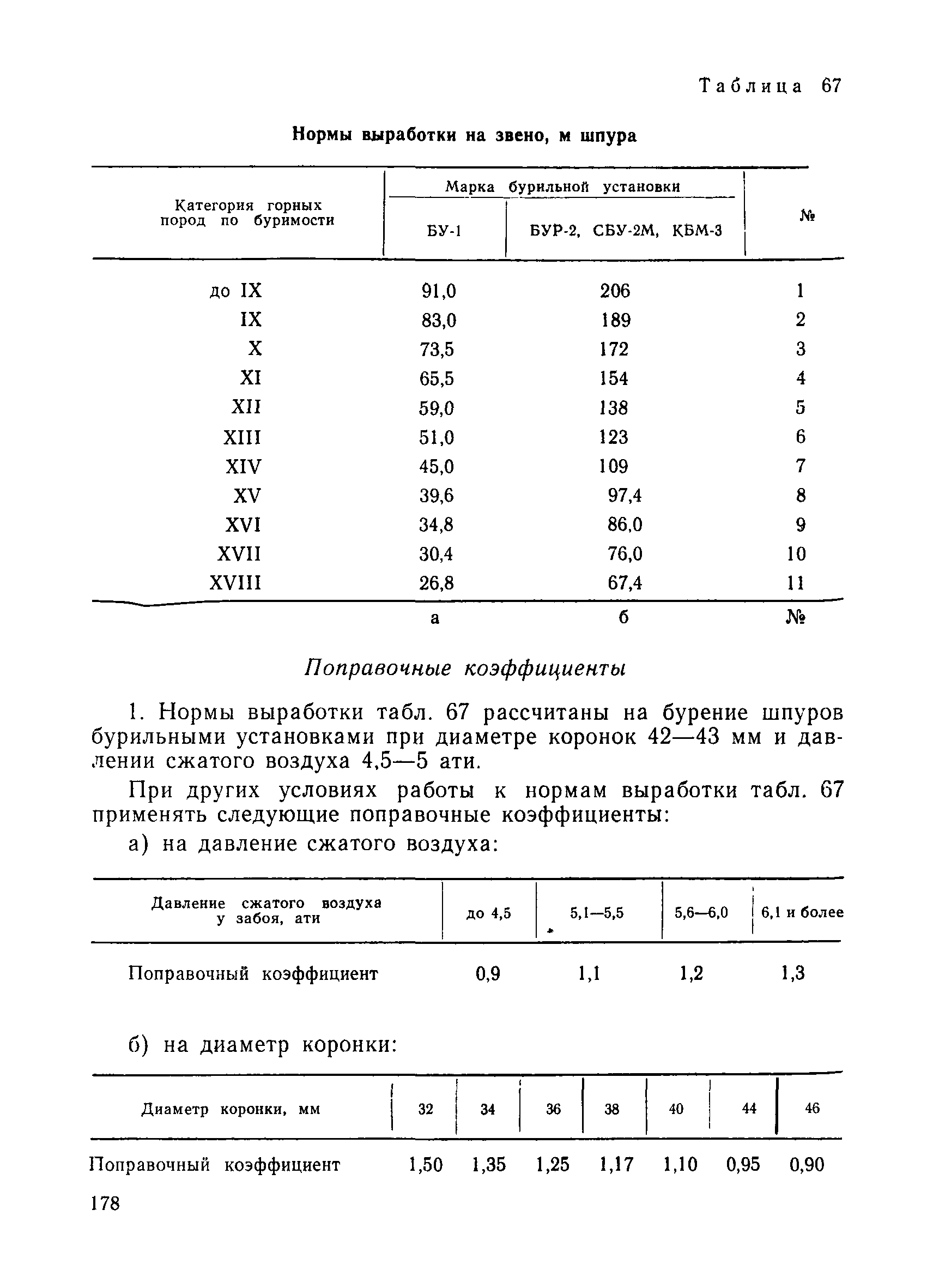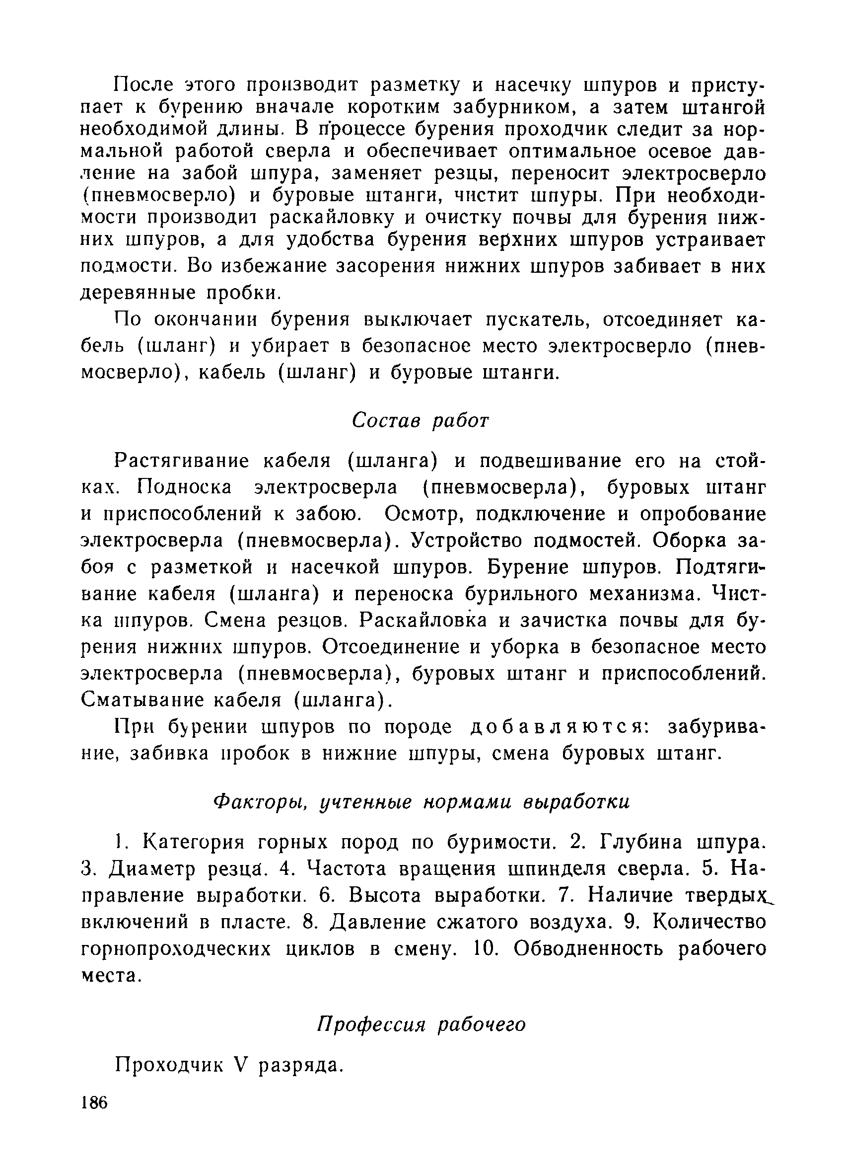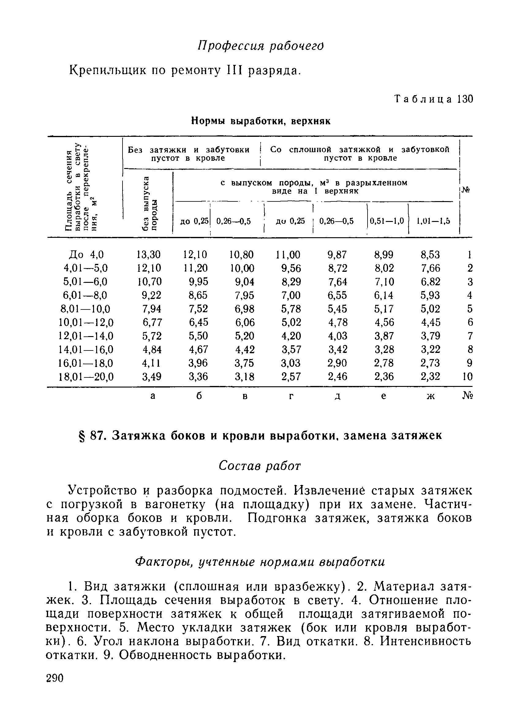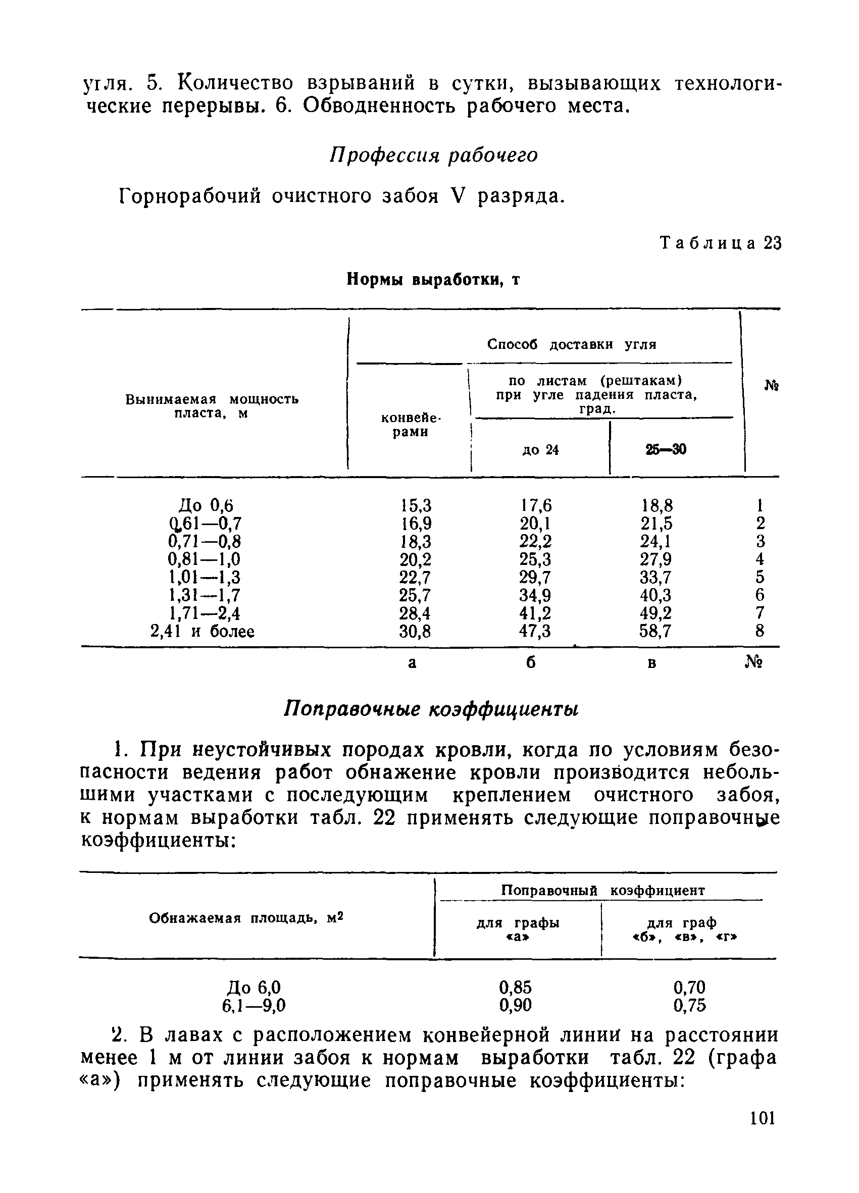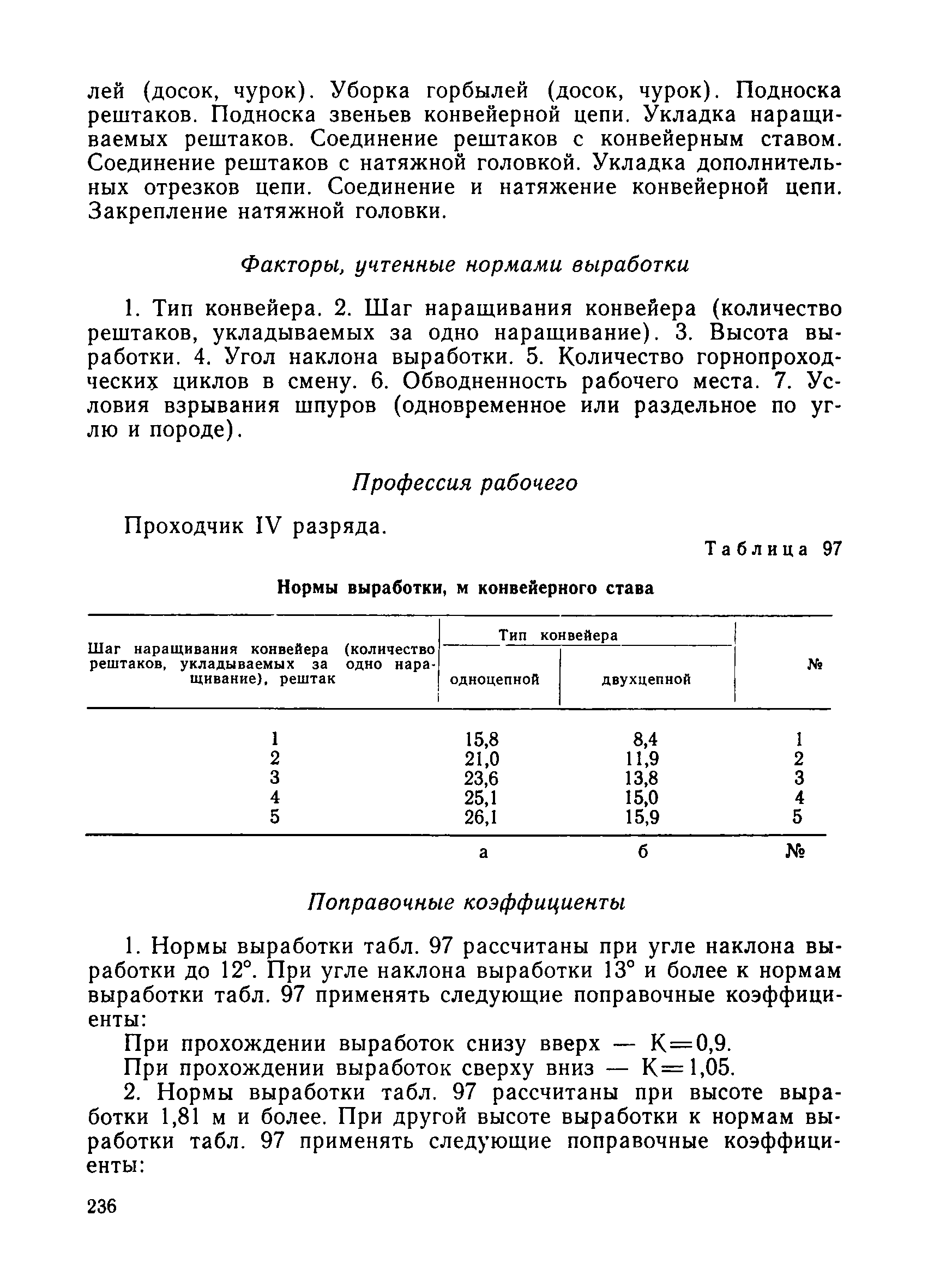 Единые нормы выработки (времени) для шахт производственного объединения "Приморскуголь"| Статус: | справочные материалы, мп, тпр | | Название рус.: | Единые нормы выработки (времени) для шахт производственного объединения "Приморскуголь" | | Дата добавления в базу: | 01.01.2018 | | Дата актуализации: | 01.01.2021 | | Область применения: | Единые нормы выработки (времени) обязательны для применения на всех действующих шахтах производственного объединения "Приморскуголь" | | Оглавление: | Общая часть Техническая часть Нормативная часть Раздел I. Очистные работы § 1. Выемка угля механизированными комплексами типа КМ-81 § 2. Выемка угля механизированными комплексами типов ОМКТ, ОКП, МК § 3. Выемка угля узкозахватными комбайнами типов КШ и ГШ-68 § 4. Оформление забоя после выемки угля узкозахватными комбайнами типов КШ и ГШ-68 § 5. Выемка угля узкозахватными комбайнами 1К-101, 2К-52, МК-67, БК-52 § 6. Оформление забоя после выемки угля узкозахватными комбайнами 1K-101, 2К-52, МК-67 и БК-52 § 7. Выемка угля комбайнами типов УКР, «Темп», КТ, А-70 в лавах на пластах наклонного и крутого падения § 8. Спуск (перегон) комбайнов типов УКР, «Темп», КТ, А-70 в лавах на пластах наклонного и крутого падения с передвижкой крана-балки § 9. Передвижка предохранительной лебедки 1ЛГКН § 10. Оформление забоя после выемки угля комбайнами типов УКР, «Темп», КТ, А-70 в лавах на пластах наклонного падения § 11. Выемка угля в лавах комбайном «Урал-2М» и подготовка его к выемке следующей полосы угля § 12. Оформление забоя после выемки угля комбайном «Урал-2М» § 13. Передвижка гидрофицированной посадочной крепи «Спутник» § 14. Выемка угля в лавах, оборудованных комбайнами К-56М A. Выемка угля Б. Разворот комбайна на пластах пологого падения B. Перегон комбайна § 15. Выемка угля проходческими комбайнами в очистных забоях на пластах пологого падения § 16. Навалоотбойка, навалка угля § 17. Бурение шпуров по углю ручными электросверлами (пневмосверлами) в лавах и камерах § 18. Уборка угля в очистных забоях с помощью скреперной установки § 19. Передвижка скреперной установки § 20. Выемка угля отбойными молотками § 21. Выемка угля с применением ВМ в очистных забоях на пластах крутого падения § 22. Крепление очистных забоев на пластах пологого и наклонного падения металлическими (клиновыми и гидравлическими) стойками § 23. Крепление очистных забоев деревянной крепью § 24. Возведение за комбайном временной деревянной крепи, предусмотренной паспортом крепления § 25. Навеска и снятие металлических шарнирных верхняков § 26. Затяжка кровли, почвы и забоя при креплении § 27. Передвижка специальной крепи типа ОКС на сопряжениях лав со штреками § 28. Установка рам на сопряжениях лав с прилегающими выработками § 29. Выбивка и извлечение металлических (клиновых и гидравлических) стоек в лавах на пластах пологого и наклонного падения при посадке кровли на металлическую органную крепь § 30. Возведение деревянной органной крепи § 31. Кладка и переноска деревянных костров § 32. Установка распорной крепи в очистных забоях § 33. Посадка кровли при помощи лебедки § 34. Бурение шпуров в стойках при посадке кровли с помощью малогабаритных патронов § 35. Передвижка перегружателей гидродомкратом при помощи упорной стойки § 36. Переноска рештаков (листов) в лавах на пластах пологого и наклонного падения § 37. Переноска деревянных рештаков (откосов) в лавах на пластах круто