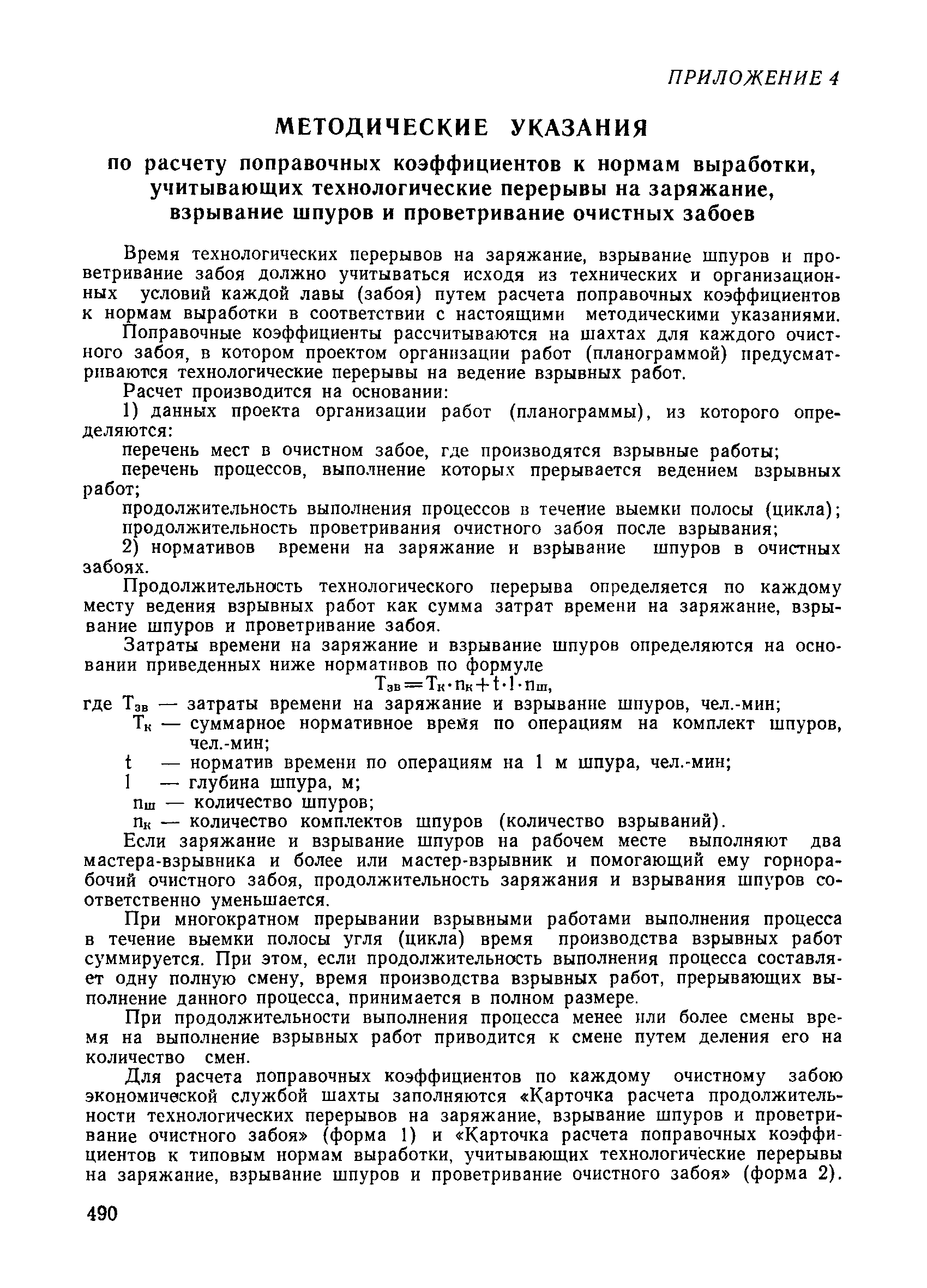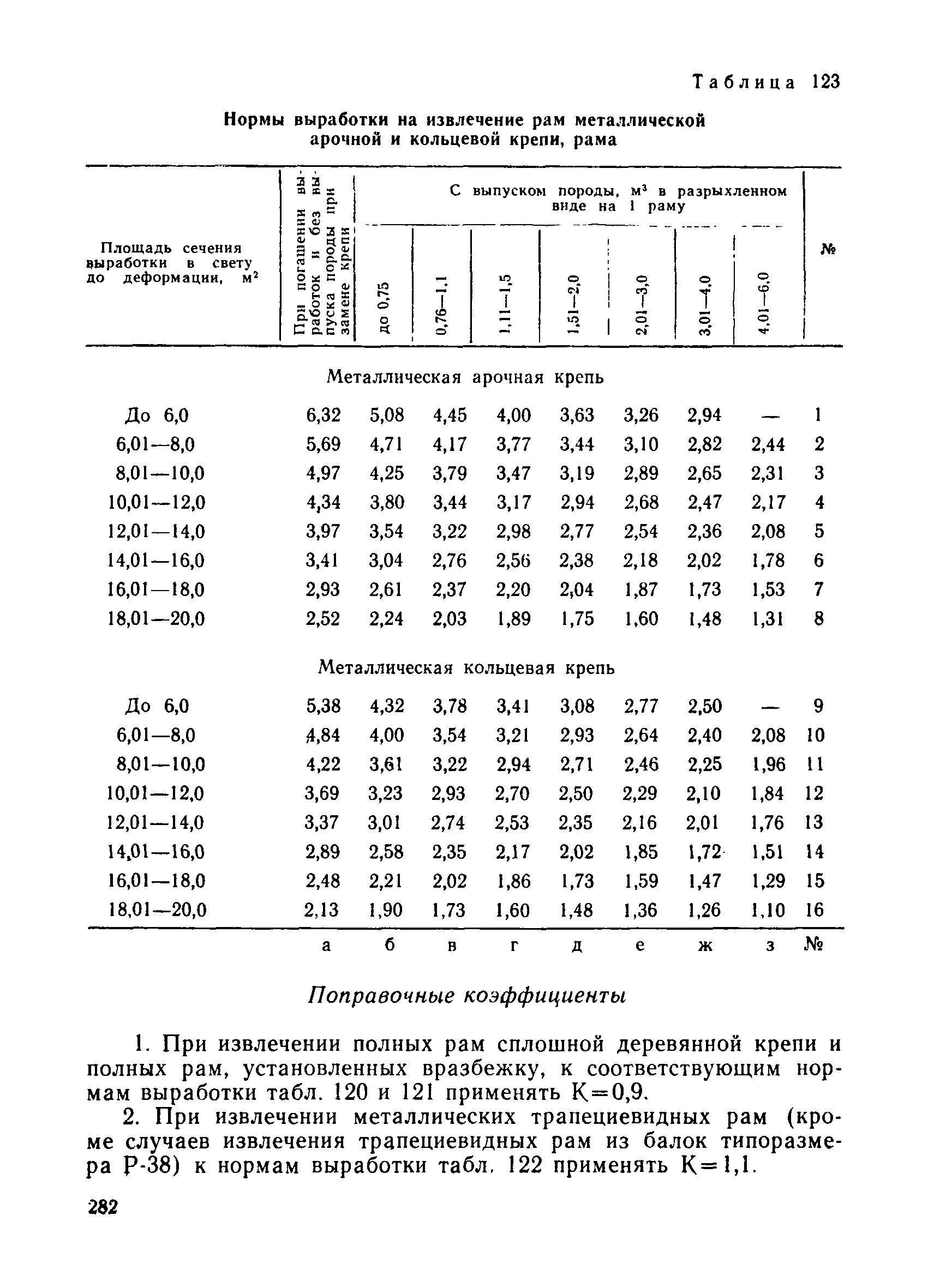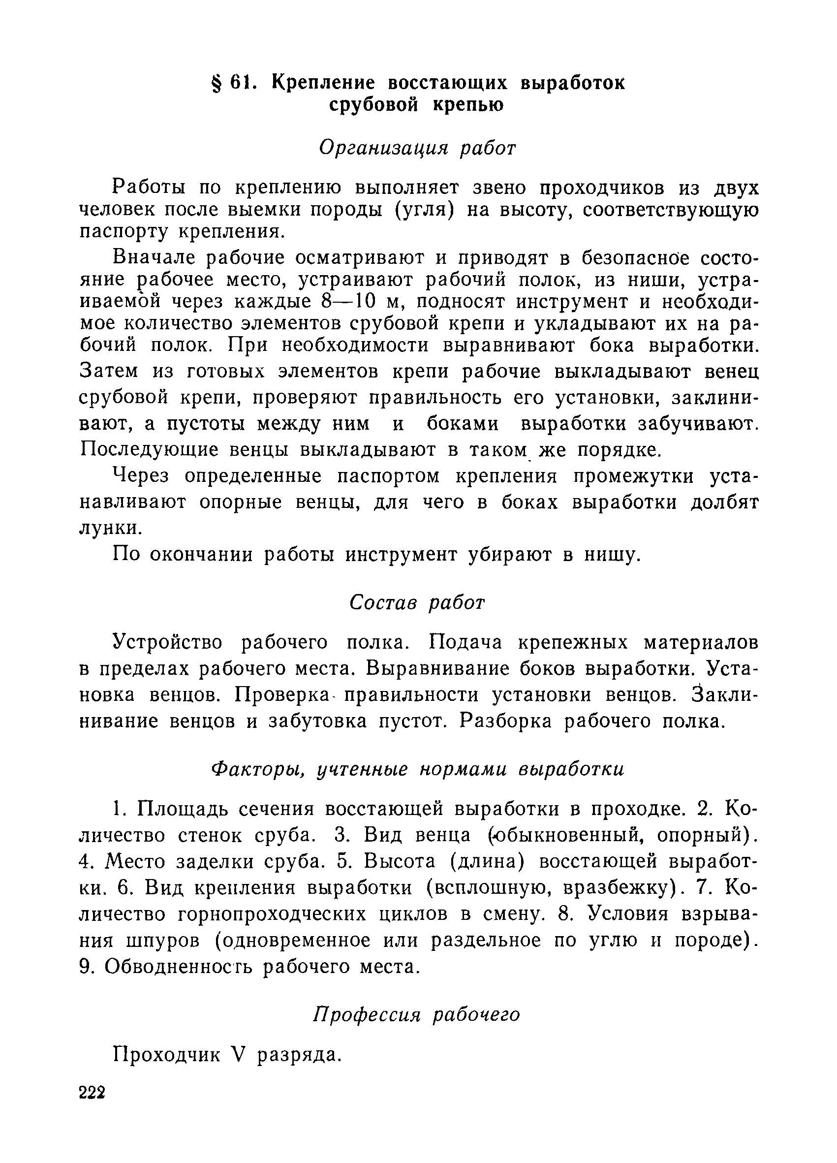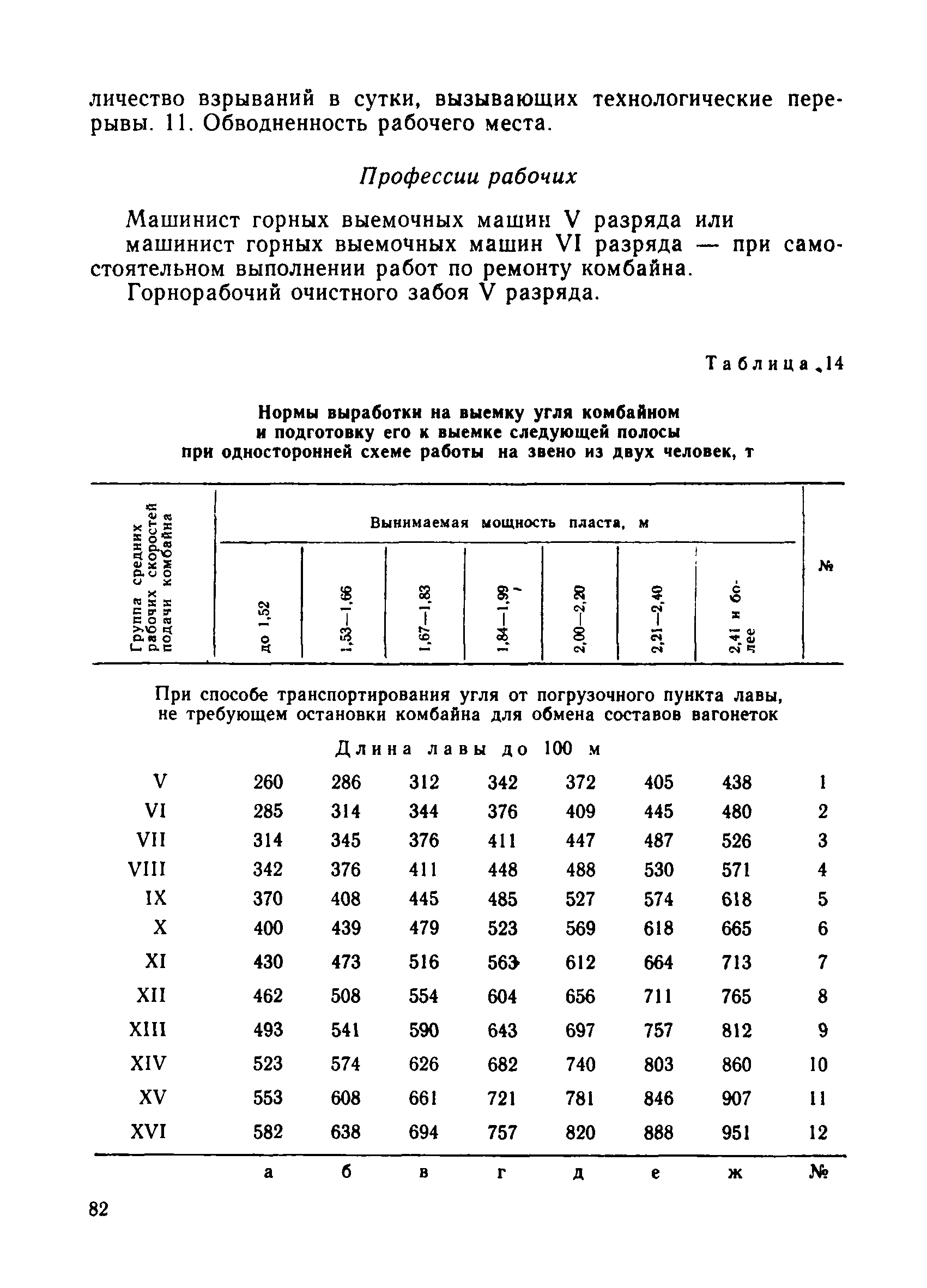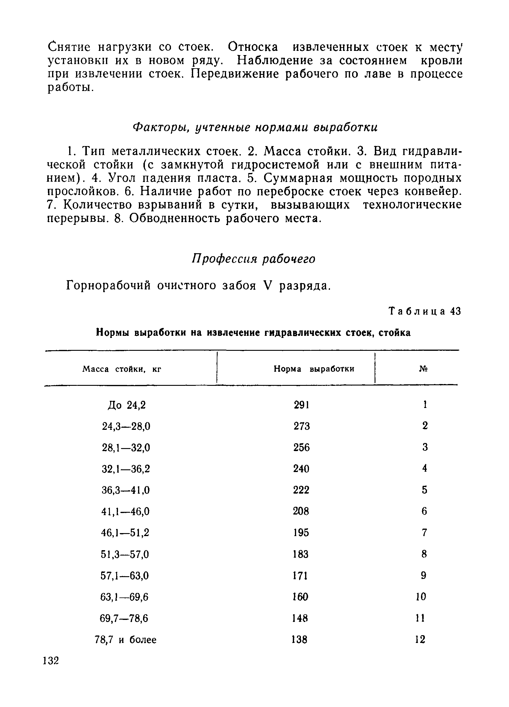 Единые нормы выработки (времени) для шахт производственного объединения "Приморскуголь"| Статус: | справочные материалы, мп, тпр | | Название рус.: | Единые нормы выработки (времени) для шахт производственного объединения "Приморскуголь" | | Дата добавления в базу: | 01.01.2018 | | Дата актуализации: | 01.01.2021 | | Область применения: | Единые нормы выработки (времени) обязательны для применения на всех действующих шахтах производственного объединения "Приморскуголь" | | Оглавление: | Общая часть Техническая часть Нормативная часть Раздел I. Очистные работы § 1. Выемка угля механизированными комплексами типа КМ-81 § 2. Выемка угля механизированными комплексами типов ОМКТ, ОКП, МК § 3. Выемка угля узкозахватными комбайнами типов КШ и ГШ-68 § 4. Оформление забоя после выемки угля узкозахватными комбайнами типов КШ и ГШ-68 § 5. Выемка угля узкозахватными комбайнами 1К-101, 2К-52, МК-67, БК-52 § 6. Оформление забоя после выемки угля узкозахватными комбайнами 1K-101, 2К-52, МК-67 и БК-52 § 7. Выемка угля комбайнами типов УКР, «Темп», КТ, А-70 в лавах на пластах наклонного и крутого падения § 8. Спуск (перегон) комбайнов типов УКР, «Темп», КТ, А-70 в лавах на пластах наклонного и крутого падения с передвижкой крана-балки § 9. Передвижка предохранительной лебедки 1ЛГКН § 10. Оформление забоя после выемки угля комбайнами типов УКР, «Темп», КТ, А-70 в лавах на пластах наклонного падения § 11. Выемка угля в лавах комбайном «Урал-2М» и подготовка его к выемке следующей полосы угля § 12. Оформление забоя после выемки угля комбайном «Урал-2М» § 13. Передвижка гидрофицированной посадочной крепи «Спутник» § 14. Выемка угля в лавах, оборудованных комбайнами К-56М A. Выемка угля Б. Разворот комбайна на пластах пологого падения B. Перегон комбайна § 15. Выемка угля проходческими комбайнами в очистных забоях на пластах пологого падения § 16. Навалоотбойка, навалка угля § 17. Бурение шпуров по углю ручными электросверлами (пневмосверлами) в лавах и камерах § 18. Уборка угля в очистных забоях с помощью скреперной установки § 19. Передвижка скреперной установки § 20. Выемка угля отбойными молотками § 21. Выемка угля с применением ВМ в очистных забоях на пластах крутого падения § 22. Крепление очистных забоев на пластах пологого и наклонного падения металлическими (клиновыми и гидравлическими) стойками § 23. Крепление очистных забоев деревянной крепью § 24. Возведение за комбайном временной деревянной крепи, предусмотренной паспортом крепления § 25. Навеска и снятие металлических шарнирных верхняков § 26. Затяжка кровли, почвы и забоя при креплении § 27. Передвижка специальной крепи типа ОКС на сопряжениях лав со штреками § 28. Установка рам на сопряжениях лав с прилегающими выработками § 29. Выбивка и извлечение металлических (клиновых и гидравлических) стоек в лавах на пластах пологого и наклонного падения при посадке кровли на металлическую органную крепь § 30. Возведение деревянной органной крепи § 31. Кладка и переноска деревянных костров § 32. Установка распорной крепи в очистных забоях § 33. Посадка кровли при помощи лебедки § 34. Бурение шпуров в стойках при посадке кровли с помощью малогабаритных патронов § 35. Передвижка перегружателей гидродомкратом при помощи упорной стойки § 36. Переноска рештаков (листов) в лавах на пластах пологого и наклонного падения § 37. Переноска деревянных рештаков (откосов) в лавах на пластах круто