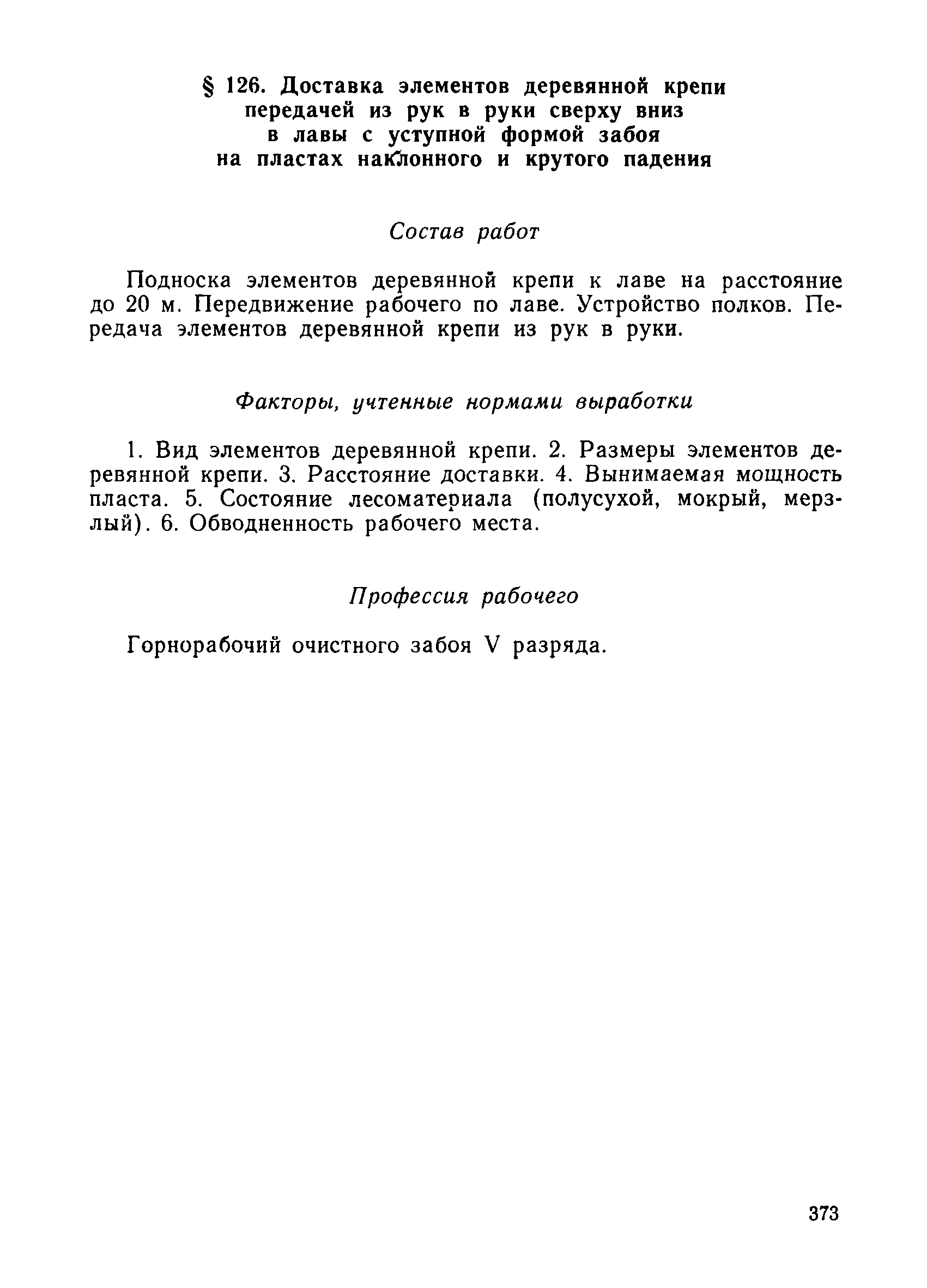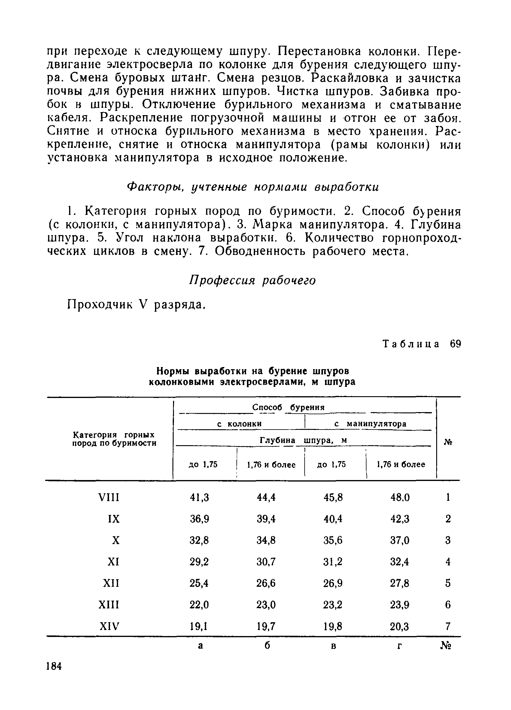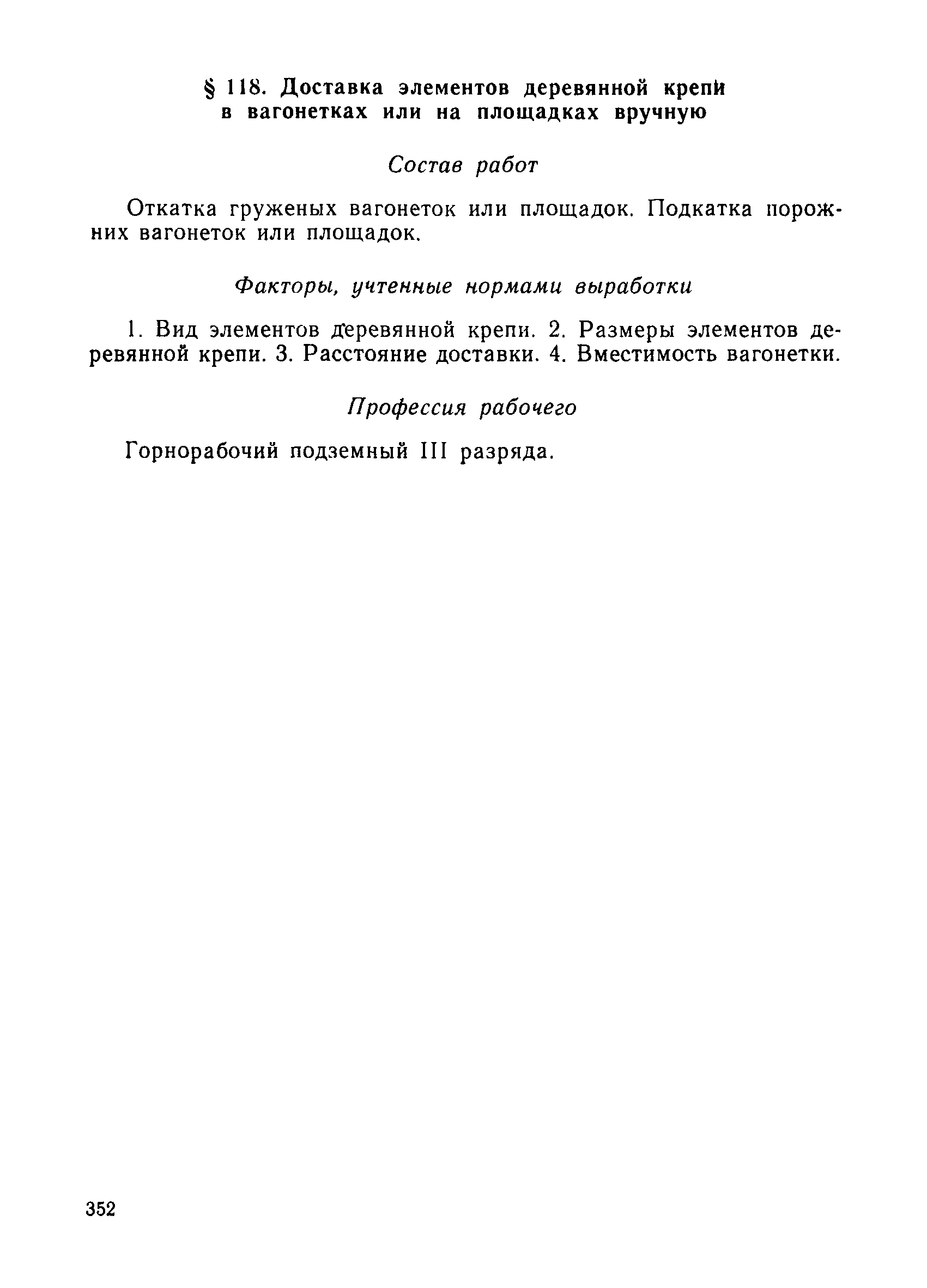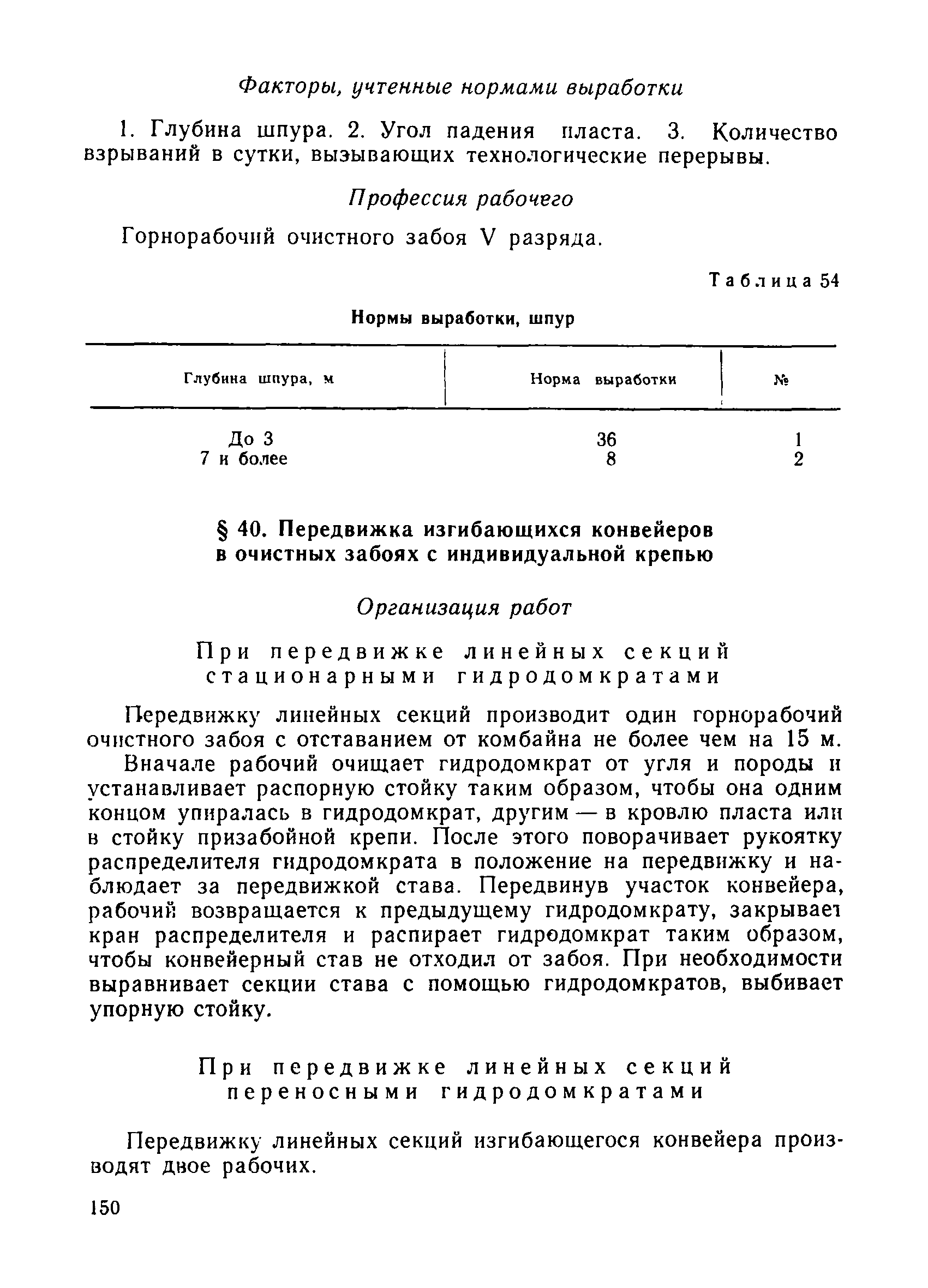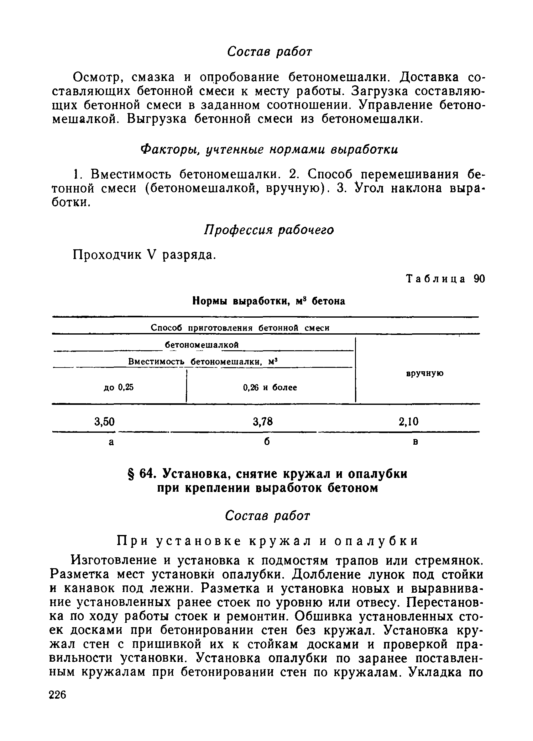 Единые нормы выработки (времени) для шахт производственного объединения "Приморскуголь"| Статус: | справочные материалы, мп, тпр | | Название рус.: | Единые нормы выработки (времени) для шахт производственного объединения "Приморскуголь" | | Дата добавления в базу: | 01.01.2018 | | Дата актуализации: | 01.01.2021 | | Область применения: | Единые нормы выработки (времени) обязательны для применения на всех действующих шахтах производственного объединения "Приморскуголь" | | Оглавление: | Общая часть Техническая часть Нормативная часть Раздел I. Очистные работы § 1. Выемка угля механизированными комплексами типа КМ-81 § 2. Выемка угля механизированными комплексами типов ОМКТ, ОКП, МК § 3. Выемка угля узкозахватными комбайнами типов КШ и ГШ-68 § 4. Оформление забоя после выемки угля узкозахватными комбайнами типов КШ и ГШ-68 § 5. Выемка угля узкозахватными комбайнами 1К-101, 2К-52, МК-67, БК-52 § 6. Оформление забоя после выемки угля узкозахватными комбайнами 1K-101, 2К-52, МК-67 и БК-52 § 7. Выемка угля комбайнами типов УКР, «Темп», КТ, А-70 в лавах на пластах наклонного и крутого падения § 8. Спуск (перегон) комбайнов типов УКР, «Темп», КТ, А-70 в лавах на пластах наклонного и крутого падения с передвижкой крана-балки § 9. Передвижка предохранительной лебедки 1ЛГКН § 10. Оформление забоя после выемки угля комбайнами типов УКР, «Темп», КТ, А-70 в лавах на пластах наклонного падения § 11. Выемка угля в лавах комбайном «Урал-2М» и подготовка его к выемке следующей полосы угля § 12. Оформление забоя после выемки угля комбайном «Урал-2М» § 13. Передвижка гидрофицированной посадочной крепи «Спутник» § 14. Выемка угля в лавах, оборудованных комбайнами К-56М A. Выемка угля Б. Разворот комбайна на пластах пологого падения B. Перегон комбайна § 15. Выемка угля проходческими комбайнами в очистных забоях на пластах пологого падения § 16. Навалоотбойка, навалка угля § 17. Бурение шпуров по углю ручными электросверлами (пневмосверлами) в лавах и камерах § 18. Уборка угля в очистных забоях с помощью скреперной установки § 19. Передвижка скреперной установки § 20. Выемка угля отбойными молотками § 21. Выемка угля с применением ВМ в очистных забоях на пластах крутого падения § 22. Крепление очистных забоев на пластах пологого и наклонного падения металлическими (клиновыми и гидравлическими) стойками § 23. Крепление очистных забоев деревянной крепью § 24. Возведение за комбайном временной деревянной крепи, предусмотренной паспортом крепления § 25. Навеска и снятие металлических шарнирных верхняков § 26. Затяжка кровли, почвы и забоя при креплении § 27. Передвижка специальной крепи типа ОКС на сопряжениях лав со штреками § 28. Установка рам на сопряжениях лав с прилегающими выработками § 29. Выбивка и извлечение металлических (клиновых и гидравлических) стоек в лавах на пластах пологого и наклонного падения при посадке кровли на металлическую органную крепь § 30. Возведение деревянной органной крепи § 31. Кладка и переноска деревянных костров § 32. Установка распорной крепи в очистных забоях § 33. Посадка кровли при помощи лебедки § 34. Бурение шпуров в стойках при посадке кровли с помощью малогабаритных патронов § 35. Передвижка перегружателей гидродомкратом при помощи упорной стойки § 36. Переноска рештаков (листов) в лавах на пластах пологого и наклонного падения § 37. Переноска деревянных рештаков (откосов) в лавах на пластах круто