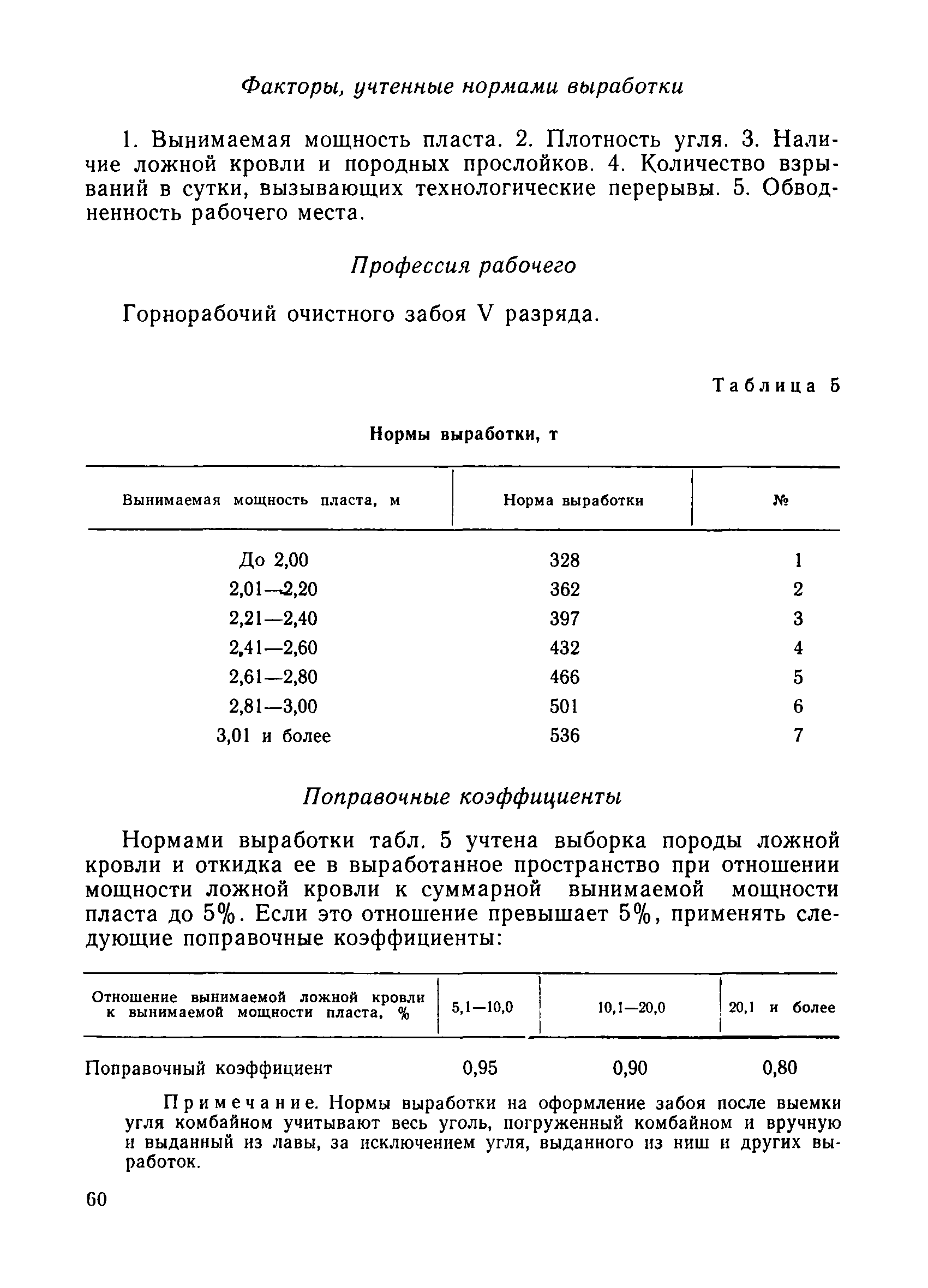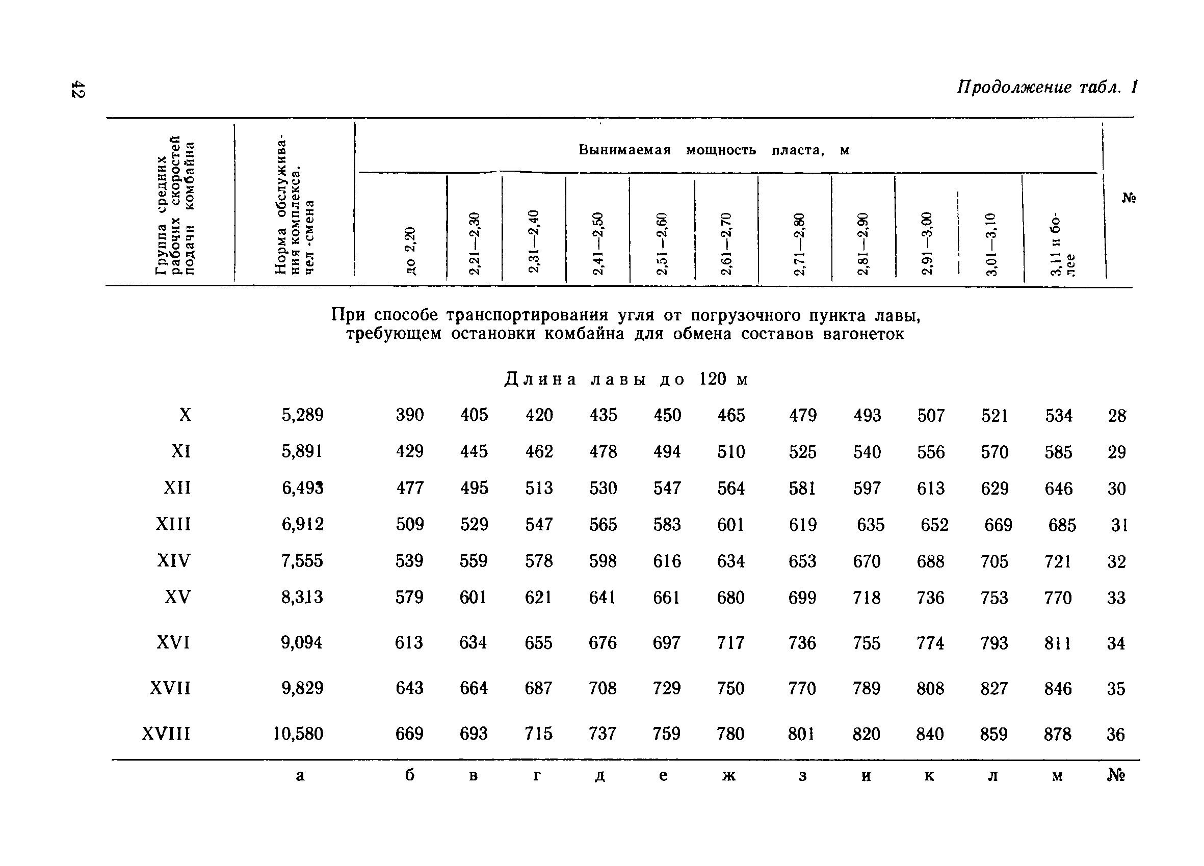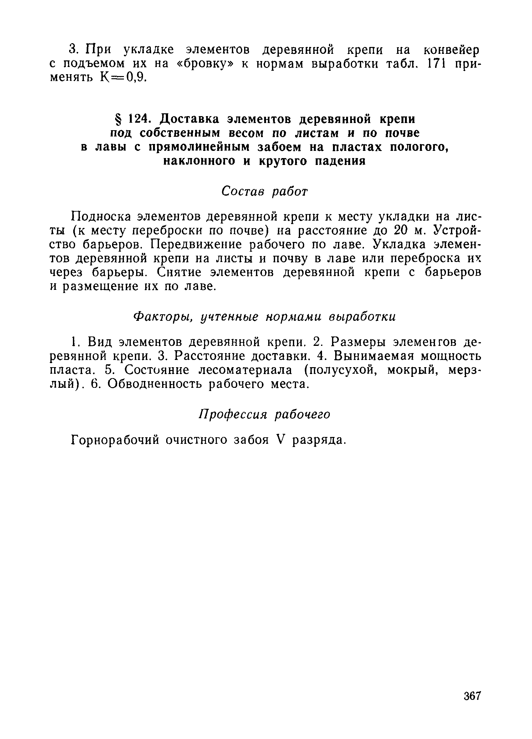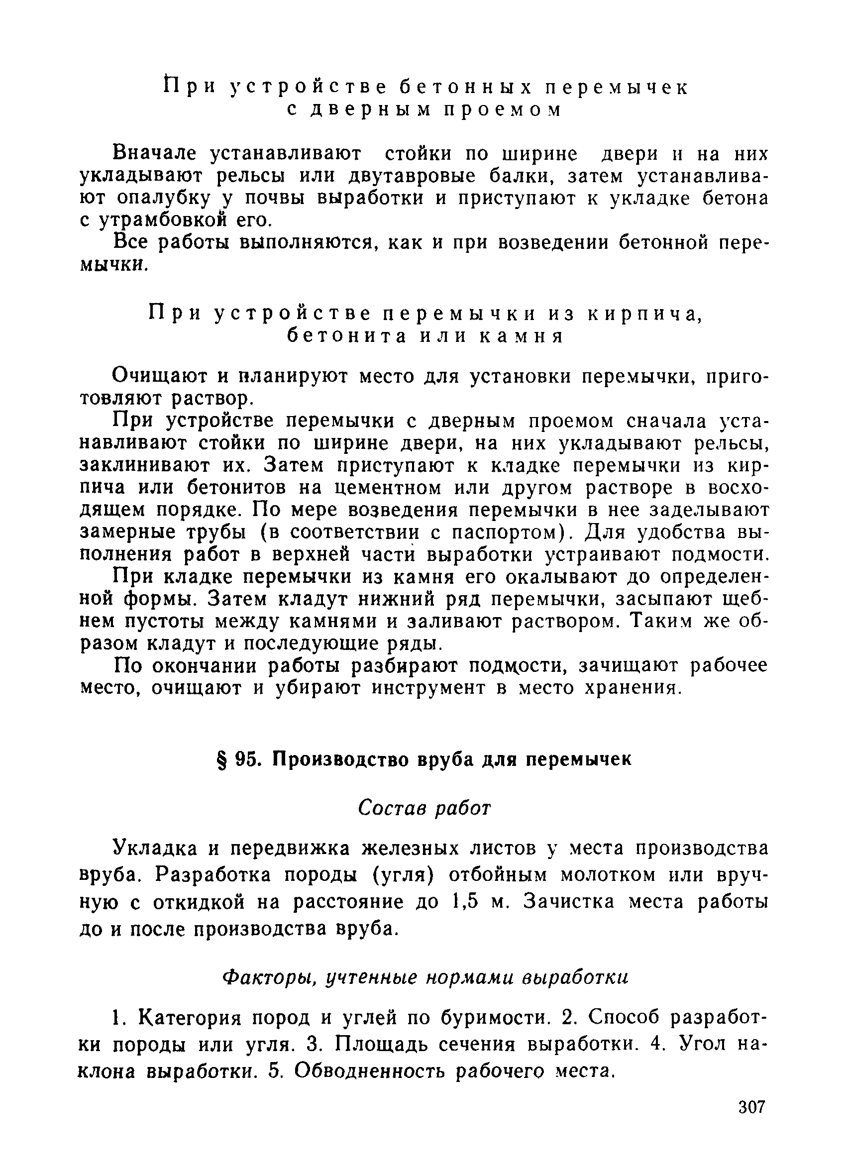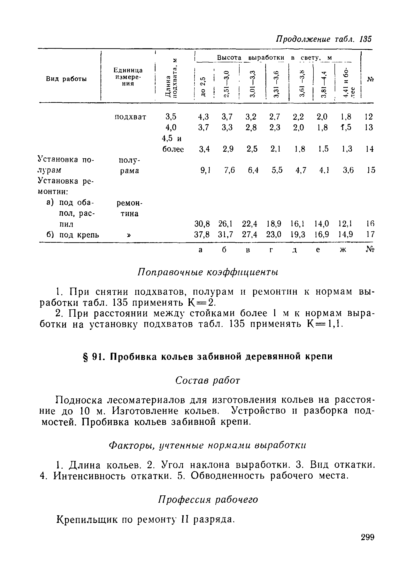 Единые нормы выработки (времени) для шахт производственного объединения "Приморскуголь"| Статус: | справочные материалы, мп, тпр | | Название рус.: | Единые нормы выработки (времени) для шахт производственного объединения "Приморскуголь" | | Дата добавления в базу: | 01.01.2018 | | Дата актуализации: | 01.01.2021 | | Область применения: | Единые нормы выработки (времени) обязательны для применения на всех действующих шахтах производственного объединения "Приморскуголь" | | Оглавление: | Общая часть Техническая часть Нормативная часть Раздел I. Очистные работы § 1. Выемка угля механизированными комплексами типа КМ-81 § 2. Выемка угля механизированными комплексами типов ОМКТ, ОКП, МК § 3. Выемка угля узкозахватными комбайнами типов КШ и ГШ-68 § 4. Оформление забоя после выемки угля узкозахватными комбайнами типов КШ и ГШ-68 § 5. Выемка угля узкозахватными комбайнами 1К-101, 2К-52, МК-67, БК-52 § 6. Оформление забоя после выемки угля узкозахватными комбайнами 1K-101, 2К-52, МК-67 и БК-52 § 7. Выемка угля комбайнами типов УКР, «Темп», КТ, А-70 в лавах на пластах наклонного и крутого падения § 8. Спуск (перегон) комбайнов типов УКР, «Темп», КТ, А-70 в лавах на пластах наклонного и крутого падения с передвижкой крана-балки § 9. Передвижка предохранительной лебедки 1ЛГКН § 10. Оформление забоя после выемки угля комбайнами типов УКР, «Темп», КТ, А-70 в лавах на пластах наклонного падения § 11. Выемка угля в лавах комбайном «Урал-2М» и подготовка его к выемке следующей полосы угля § 12. Оформление забоя после выемки угля комбайном «Урал-2М» § 13. Передвижка гидрофицированной посадочной крепи «Спутник» § 14. Выемка угля в лавах, оборудованных комбайнами К-56М A. Выемка угля Б. Разворот комбайна на пластах пологого падения B. Перегон комбайна § 15. Выемка угля проходческими комбайнами в очистных забоях на пластах пологого падения § 16. Навалоотбойка, навалка угля § 17. Бурение шпуров по углю ручными электросверлами (пневмосверлами) в лавах и камерах § 18. Уборка угля в очистных забоях с помощью скреперной установки § 19. Передвижка скреперной установки § 20. Выемка угля отбойными молотками § 21. Выемка угля с применением ВМ в очистных забоях на пластах крутого падения § 22. Крепление очистных забоев на пластах пологого и наклонного падения металлическими (клиновыми и гидравлическими) стойками § 23. Крепление очистных забоев деревянной крепью § 24. Возведение за комбайном временной деревянной крепи, предусмотренной паспортом крепления § 25. Навеска и снятие металлических шарнирных верхняков § 26. Затяжка кровли, почвы и забоя при креплении § 27. Передвижка специальной крепи типа ОКС на сопряжениях лав со штреками § 28. Установка рам на сопряжениях лав с прилегающими выработками § 29. Выбивка и извлечение металлических (клиновых и гидравлических) стоек в лавах на пластах пологого и наклонного падения при посадке кровли на металлическую органную крепь § 30. Возведение деревянной органной крепи § 31. Кладка и переноска деревянных костров § 32. Установка распорной крепи в очистных забоях § 33. Посадка кровли при помощи лебедки § 34. Бурение шпуров в стойках при посадке кровли с помощью малогабаритных патронов § 35. Передвижка перегружателей гидродомкратом при помощи упорной стойки § 36. Переноска рештаков (листов) в лавах на пластах пологого и наклонного падения § 37. Переноска деревянных рештаков (откосов) в лавах на пластах круто