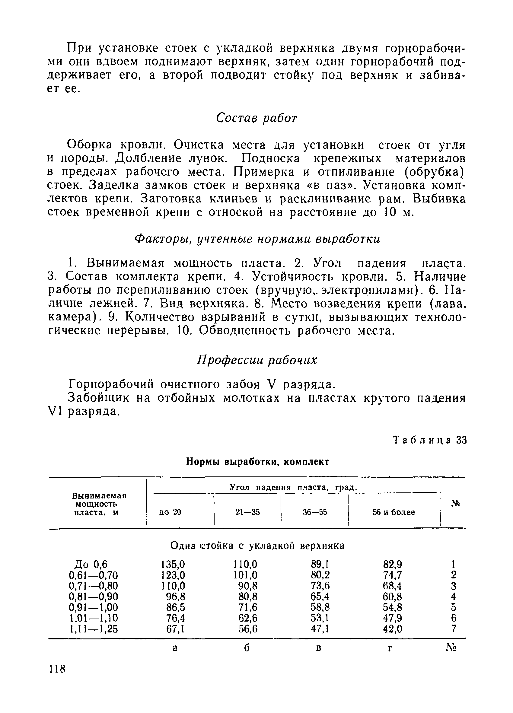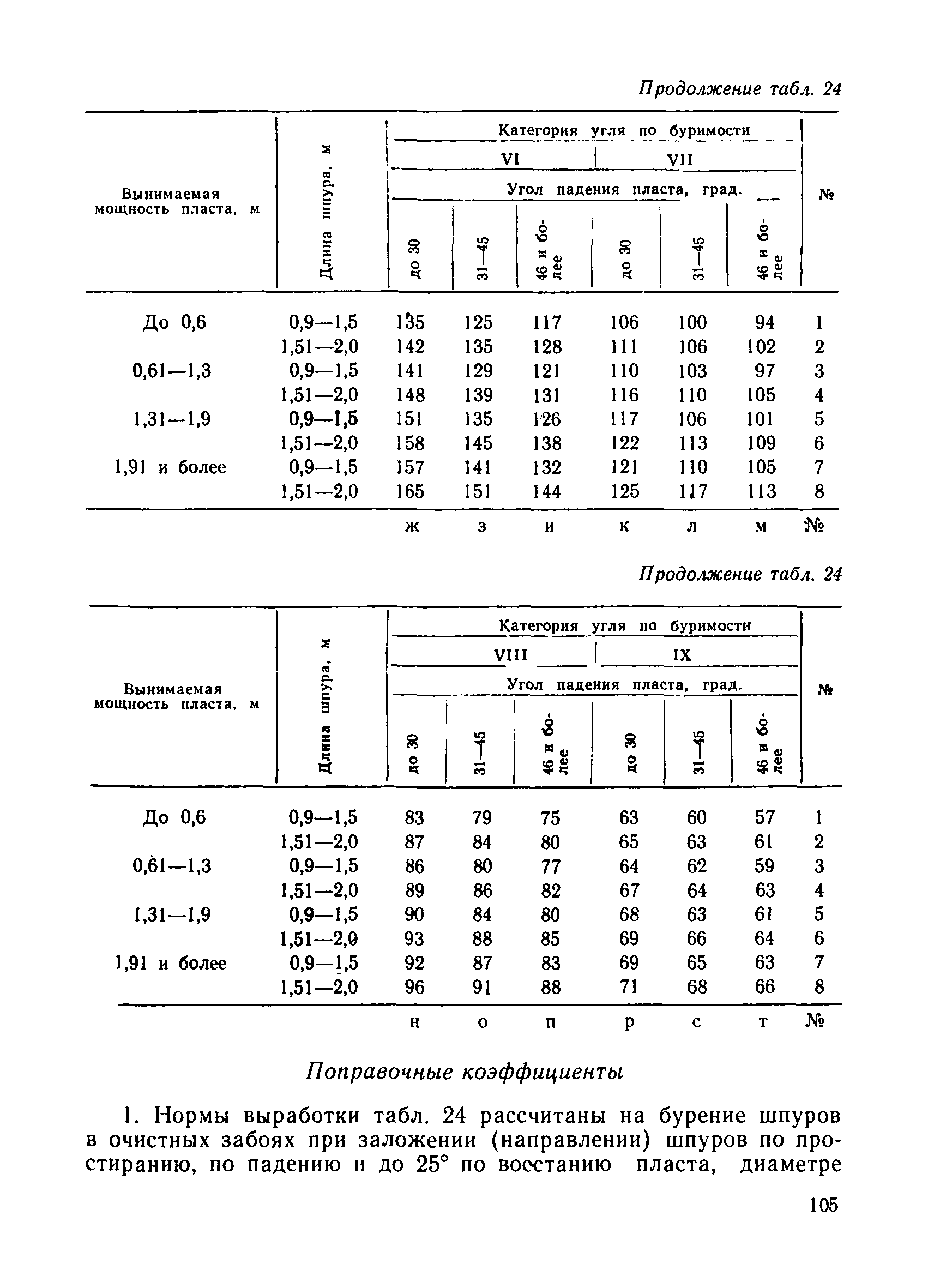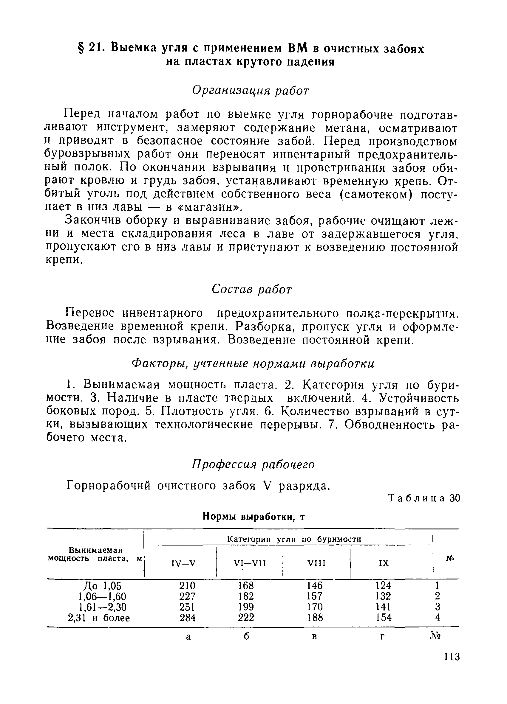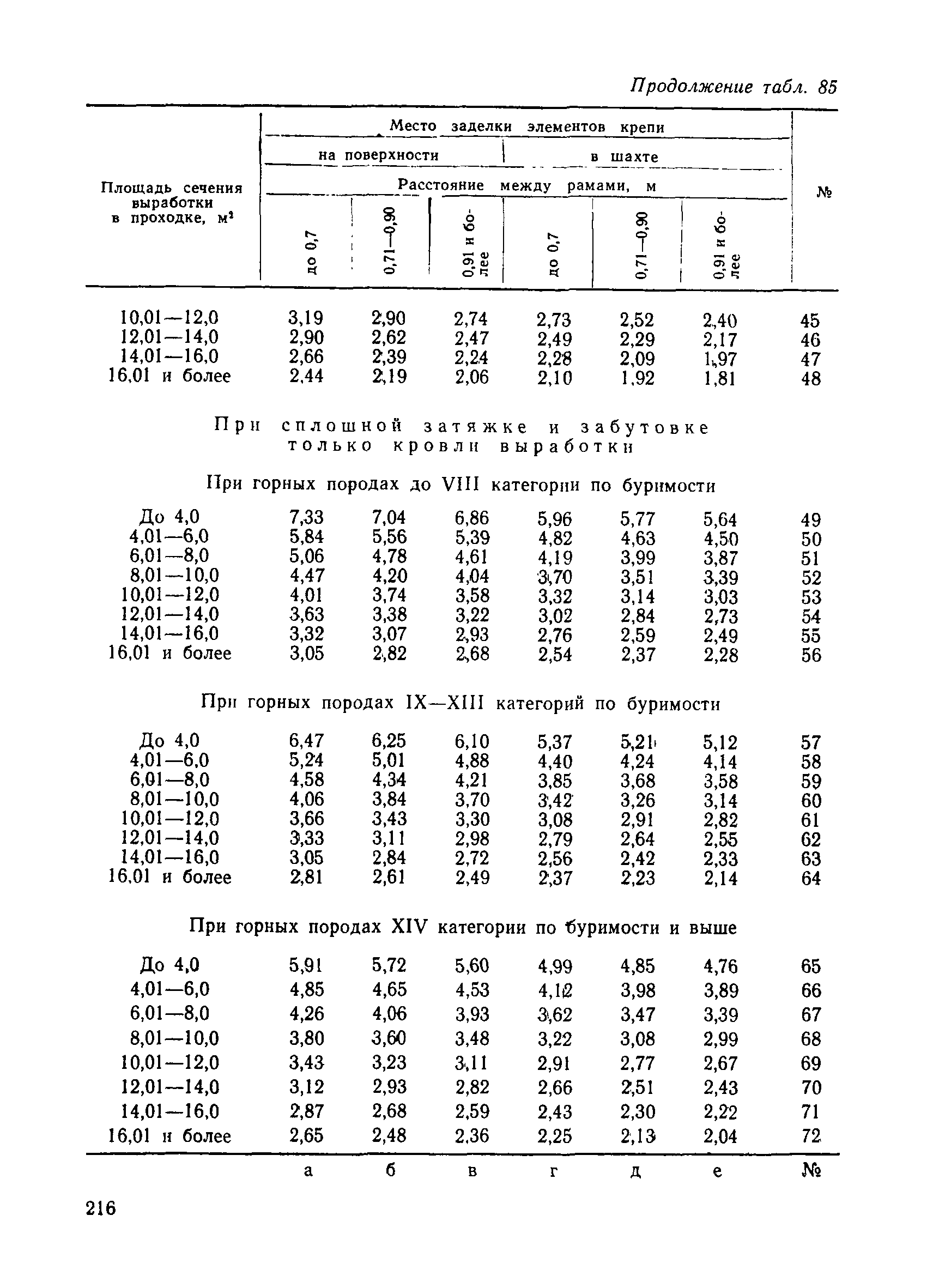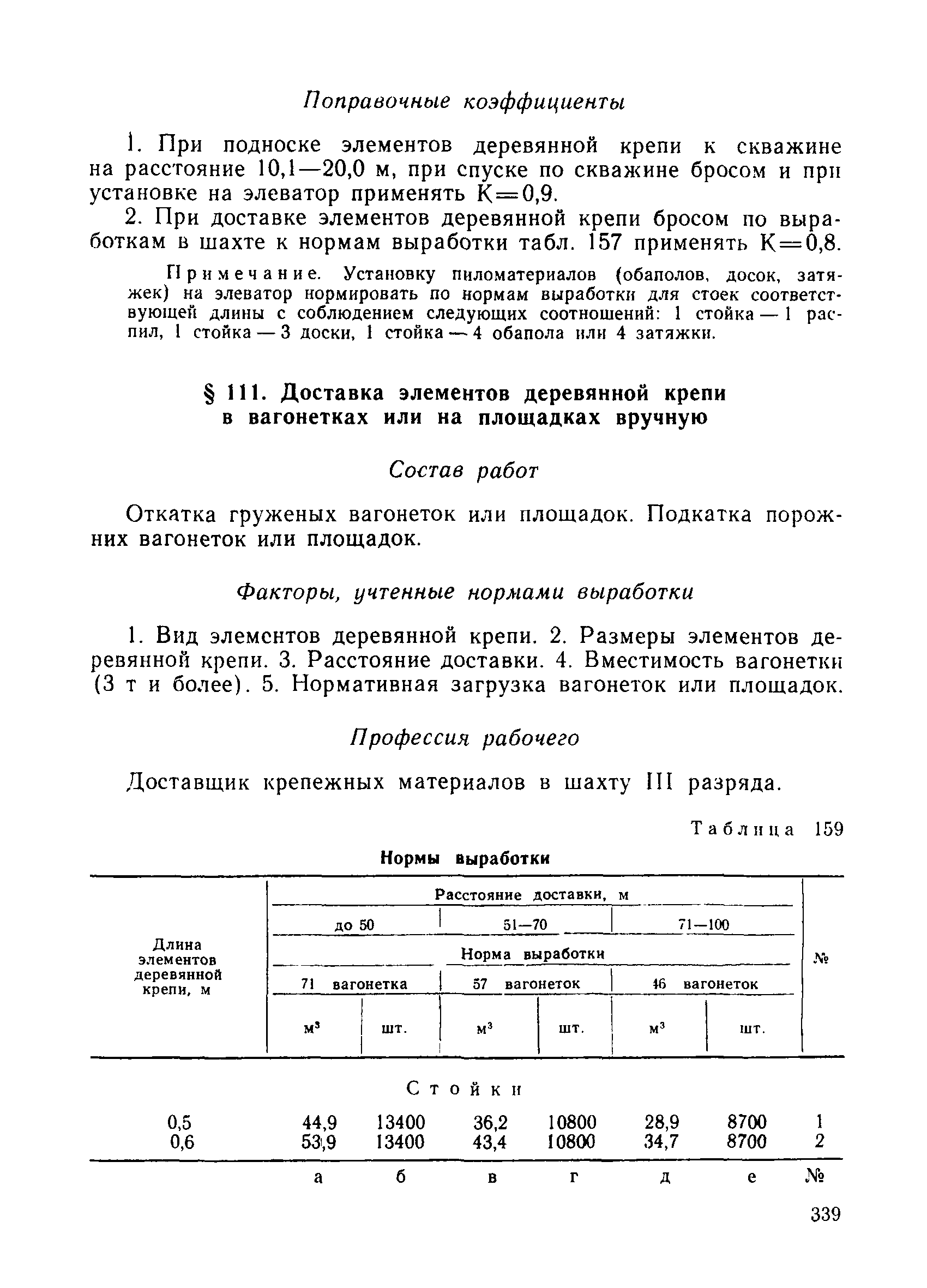 Единые нормы выработки (времени) для шахт производственного объединения "Приморскуголь"| Статус: | справочные материалы, мп, тпр | | Название рус.: | Единые нормы выработки (времени) для шахт производственного объединения "Приморскуголь" | | Дата добавления в базу: | 01.01.2018 | | Дата актуализации: | 01.01.2021 | | Область применения: | Единые нормы выработки (времени) обязательны для применения на всех действующих шахтах производственного объединения "Приморскуголь" | | Оглавление: | Общая часть Техническая часть Нормативная часть Раздел I. Очистные работы § 1. Выемка угля механизированными комплексами типа КМ-81 § 2. Выемка угля механизированными комплексами типов ОМКТ, ОКП, МК § 3. Выемка угля узкозахватными комбайнами типов КШ и ГШ-68 § 4. Оформление забоя после выемки угля узкозахватными комбайнами типов КШ и ГШ-68 § 5. Выемка угля узкозахватными комбайнами 1К-101, 2К-52, МК-67, БК-52 § 6. Оформление забоя после выемки угля узкозахватными комбайнами 1K-101, 2К-52, МК-67 и БК-52 § 7. Выемка угля комбайнами типов УКР, «Темп», КТ, А-70 в лавах на пластах наклонного и крутого падения § 8. Спуск (перегон) комбайнов типов УКР, «Темп», КТ, А-70 в лавах на пластах наклонного и крутого падения с передвижкой крана-балки § 9. Передвижка предохранительной лебедки 1ЛГКН § 10. Оформление забоя после выемки угля комбайнами типов УКР, «Темп», КТ, А-70 в лавах на пластах наклонного падения § 11. Выемка угля в лавах комбайном «Урал-2М» и подготовка его к выемке следующей полосы угля § 12. Оформление забоя после выемки угля комбайном «Урал-2М» § 13. Передвижка гидрофицированной посадочной крепи «Спутник» § 14. Выемка угля в лавах, оборудованных комбайнами К-56М A. Выемка угля Б. Разворот комбайна на пластах пологого падения B. Перегон комбайна § 15. Выемка угля проходческими комбайнами в очистных забоях на пластах пологого падения § 16. Навалоотбойка, навалка угля § 17. Бурение шпуров по углю ручными электросверлами (пневмосверлами) в лавах и камерах § 18. Уборка угля в очистных забоях с помощью скреперной установки § 19. Передвижка скреперной установки § 20. Выемка угля отбойными молотками § 21. Выемка угля с применением ВМ в очистных забоях на пластах крутого падения § 22. Крепление очистных забоев на пластах пологого и наклонного падения металлическими (клиновыми и гидравлическими) стойками § 23. Крепление очистных забоев деревянной крепью § 24. Возведение за комбайном временной деревянной крепи, предусмотренной паспортом крепления § 25. Навеска и снятие металлических шарнирных верхняков § 26. Затяжка кровли, почвы и забоя при креплении § 27. Передвижка специальной крепи типа ОКС на сопряжениях лав со штреками § 28. Установка рам на сопряжениях лав с прилегающими выработками § 29. Выбивка и извлечение металлических (клиновых и гидравлических) стоек в лавах на пластах пологого и наклонного падения при посадке кровли на металлическую органную крепь § 30. Возведение деревянной органной крепи § 31. Кладка и переноска деревянных костров § 32. Установка распорной крепи в очистных забоях § 33. Посадка кровли при помощи лебедки § 34. Бурение шпуров в стойках при посадке кровли с помощью малогабаритных патронов § 35. Передвижка перегружателей гидродомкратом при помощи упорной стойки § 36. Переноска рештаков (листов) в лавах на пластах пологого и наклонного падения § 37. Переноска деревянных рештаков (откосов) в лавах на пластах круто