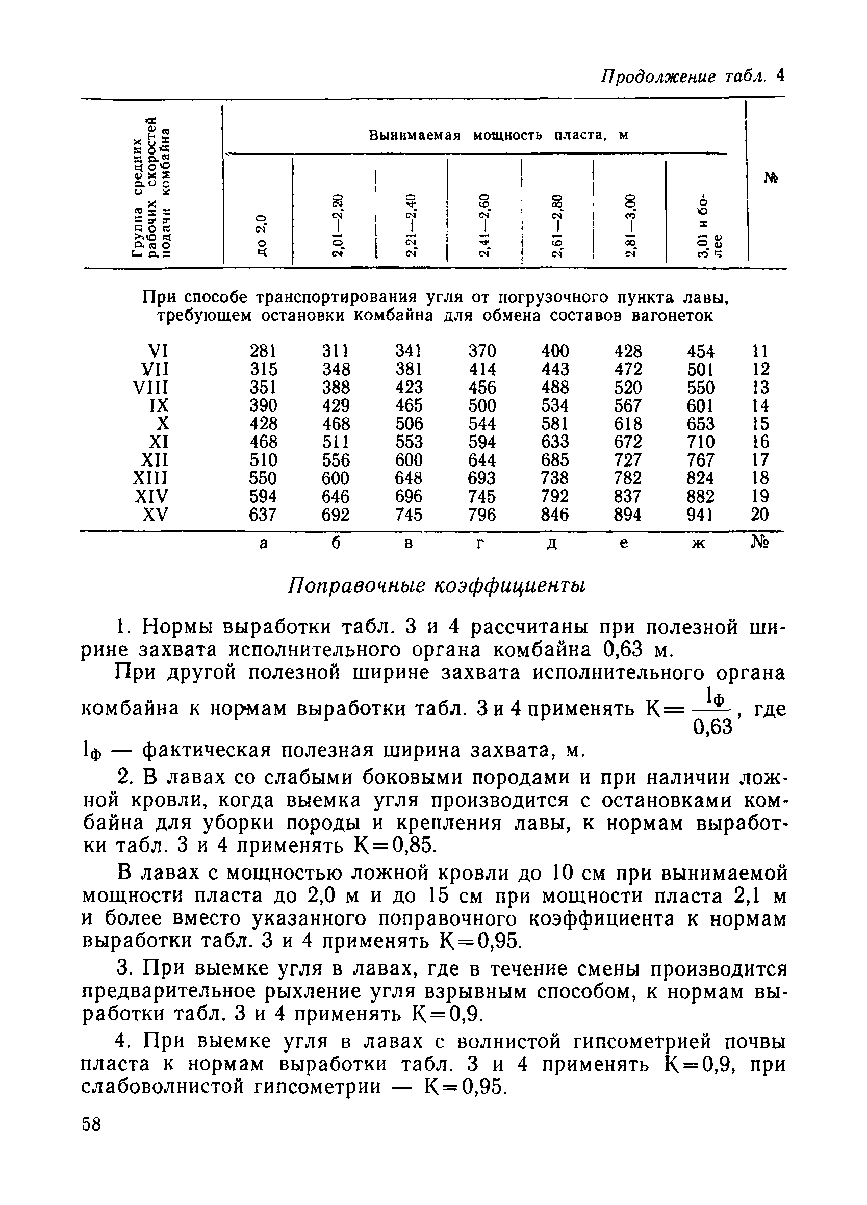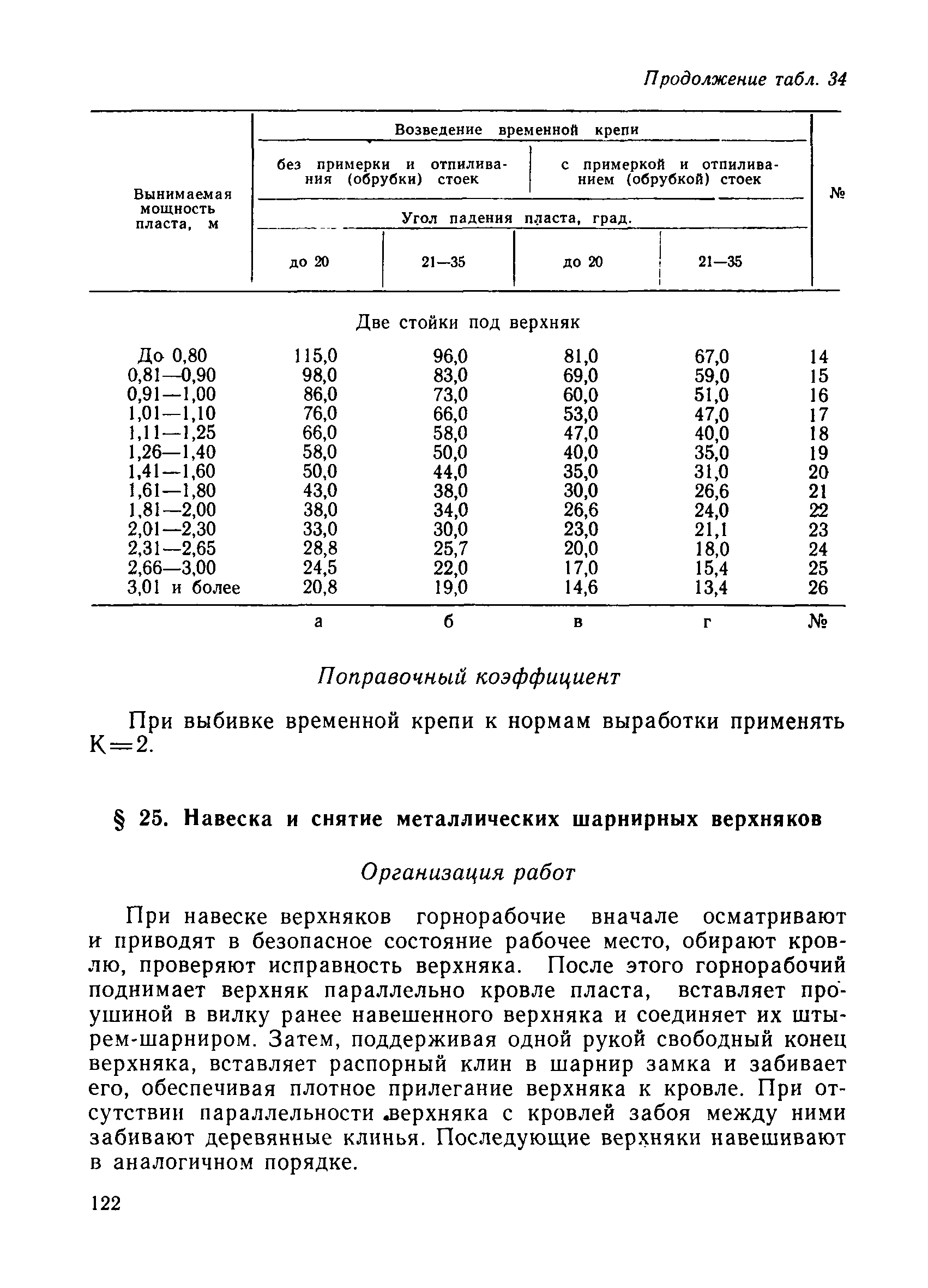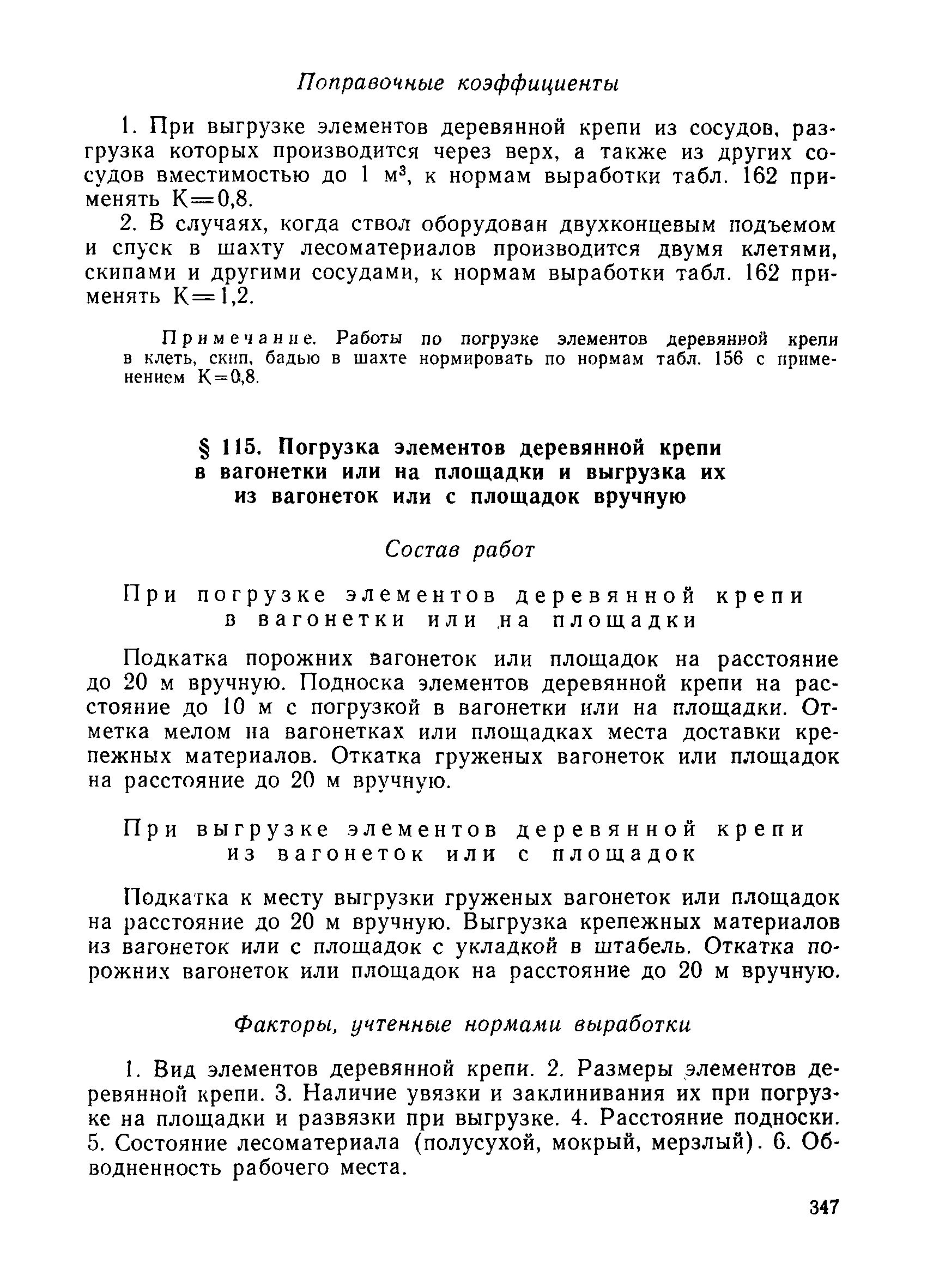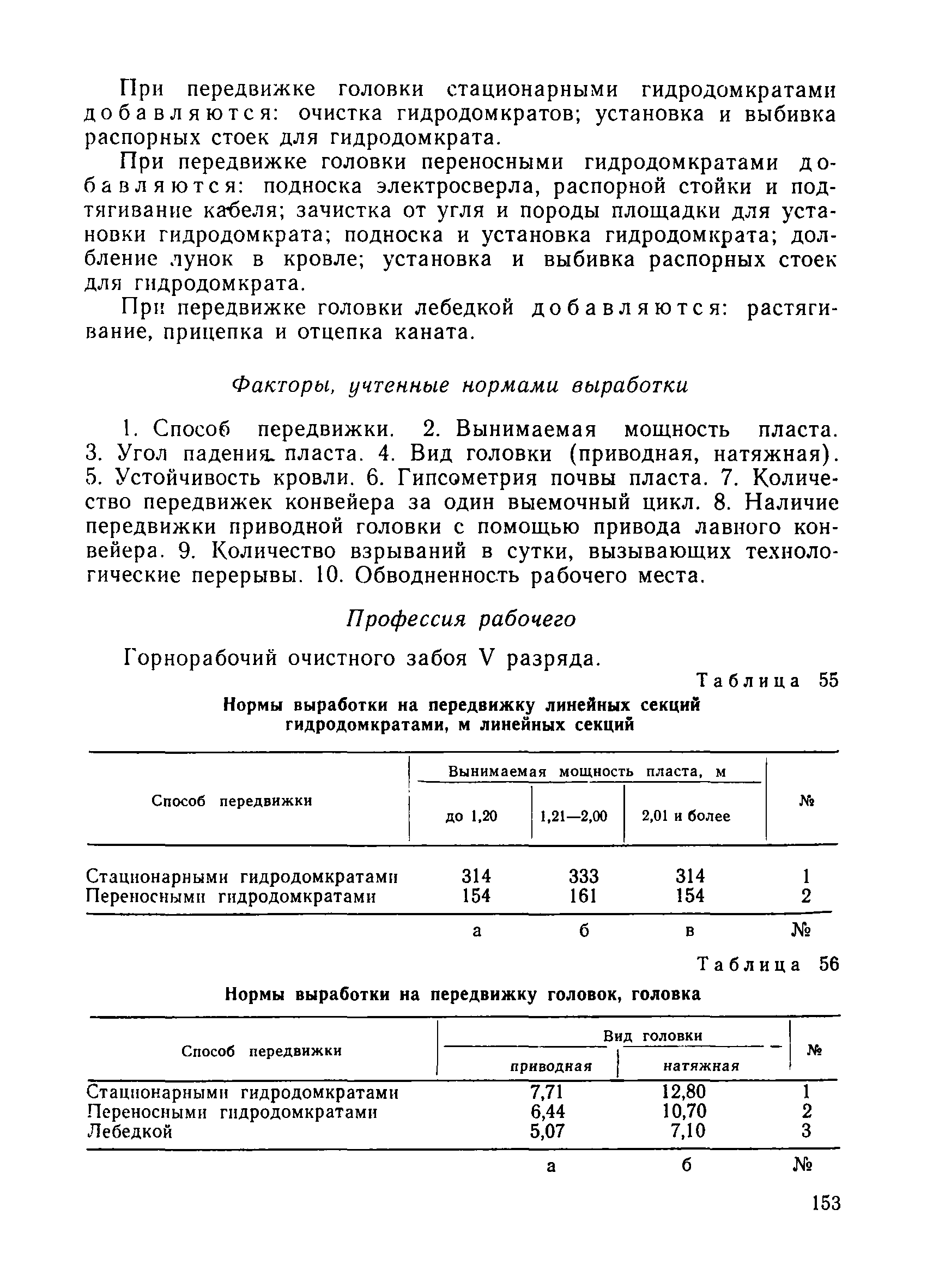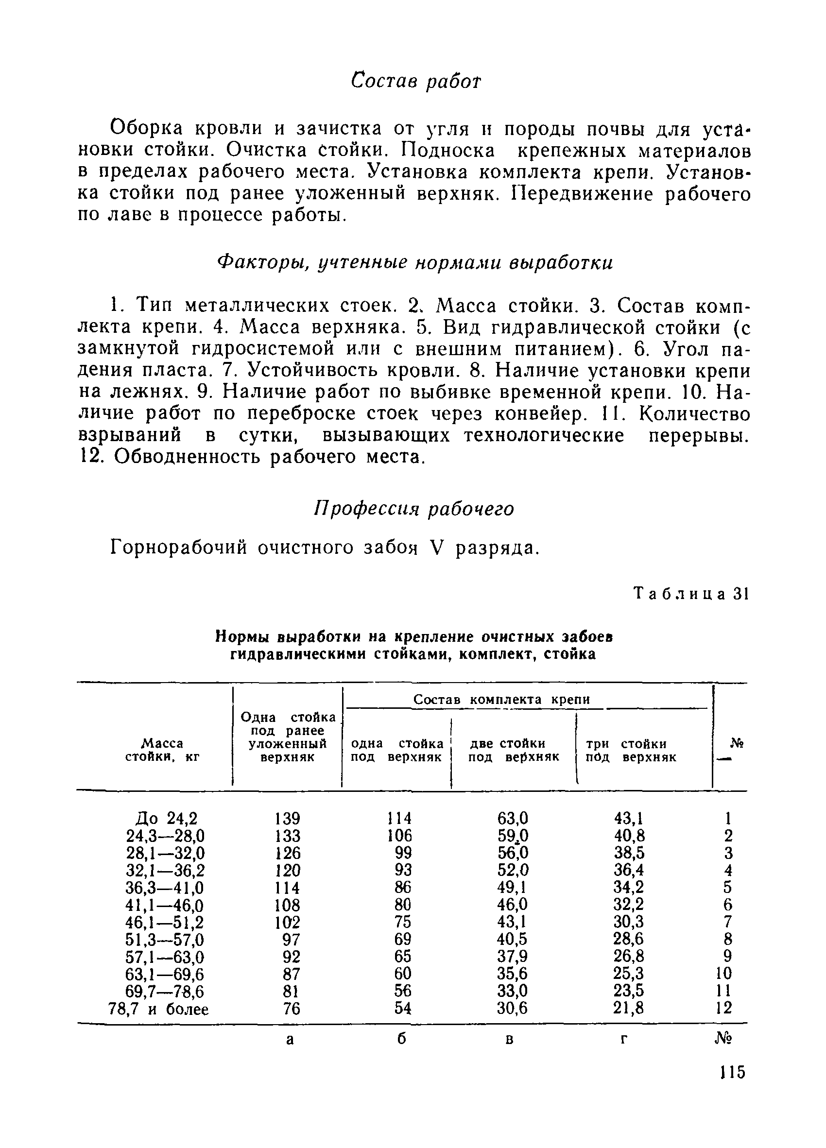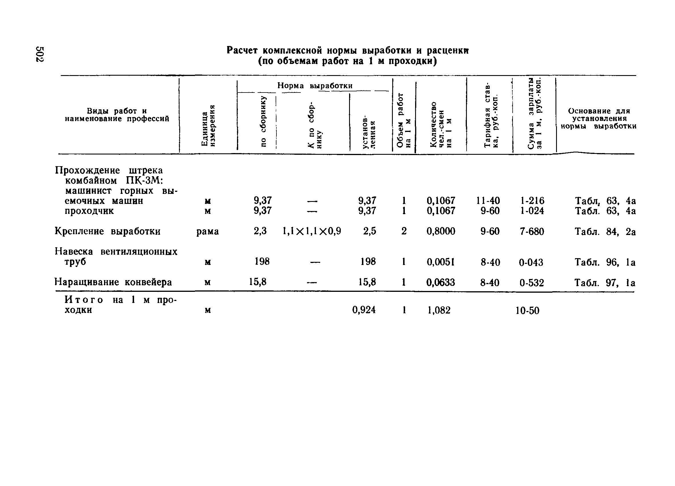 Единые нормы выработки (времени) для шахт производственного объединения "Приморскуголь"| Статус: | справочные материалы, мп, тпр | | Название рус.: | Единые нормы выработки (времени) для шахт производственного объединения "Приморскуголь" | | Дата добавления в базу: | 01.01.2018 | | Дата актуализации: | 01.01.2021 | | Область применения: | Единые нормы выработки (времени) обязательны для применения на всех действующих шахтах производственного объединения "Приморскуголь" | | Оглавление: | Общая часть Техническая часть Нормативная часть Раздел I. Очистные работы § 1. Выемка угля механизированными комплексами типа КМ-81 § 2. Выемка угля механизированными комплексами типов ОМКТ, ОКП, МК § 3. Выемка угля узкозахватными комбайнами типов КШ и ГШ-68 § 4. Оформление забоя после выемки угля узкозахватными комбайнами типов КШ и ГШ-68 § 5. Выемка угля узкозахватными комбайнами 1К-101, 2К-52, МК-67, БК-52 § 6. Оформление забоя после выемки угля узкозахватными комбайнами 1K-101, 2К-52, МК-67 и БК-52 § 7. Выемка угля комбайнами типов УКР, «Темп», КТ, А-70 в лавах на пластах наклонного и крутого падения § 8. Спуск (перегон) комбайнов типов УКР, «Темп», КТ, А-70 в лавах на пластах наклонного и крутого падения с передвижкой крана-балки § 9. Передвижка предохранительной лебедки 1ЛГКН § 10. Оформление забоя после выемки угля комбайнами типов УКР, «Темп», КТ, А-70 в лавах на пластах наклонного падения § 11. Выемка угля в лавах комбайном «Урал-2М» и подготовка его к выемке следующей полосы угля § 12. Оформление забоя после выемки угля комбайном «Урал-2М» § 13. Передвижка гидрофицированной посадочной крепи «Спутник» § 14. Выемка угля в лавах, оборудованных комбайнами К-56М A. Выемка угля Б. Разворот комбайна на пластах пологого падения B. Перегон комбайна § 15. Выемка угля проходческими комбайнами в очистных забоях на пластах пологого падения § 16. Навалоотбойка, навалка угля § 17. Бурение шпуров по углю ручными электросверлами (пневмосверлами) в лавах и камерах § 18. Уборка угля в очистных забоях с помощью скреперной установки § 19. Передвижка скреперной установки § 20. Выемка угля отбойными молотками § 21. Выемка угля с применением ВМ в очистных забоях на пластах крутого падения § 22. Крепление очистных забоев на пластах пологого и наклонного падения металлическими (клиновыми и гидравлическими) стойками § 23. Крепление очистных забоев деревянной крепью § 24. Возведение за комбайном временной деревянной крепи, предусмотренной паспортом крепления § 25. Навеска и снятие металлических шарнирных верхняков § 26. Затяжка кровли, почвы и забоя при креплении § 27. Передвижка специальной крепи типа ОКС на сопряжениях лав со штреками § 28. Установка рам на сопряжениях лав с прилегающими выработками § 29. Выбивка и извлечение металлических (клиновых и гидравлических) стоек в лавах на пластах пологого и наклонного падения при посадке кровли на металлическую органную крепь § 30. Возведение деревянной органной крепи § 31. Кладка и переноска деревянных костров § 32. Установка распорной крепи в очистных забоях § 33. Посадка кровли при помощи лебедки § 34. Бурение шпуров в стойках при посадке кровли с помощью малогабаритных патронов § 35. Передвижка перегружателей гидродомкратом при помощи упорной стойки § 36. Переноска рештаков (листов) в лавах на пластах пологого и наклонного падения § 37. Переноска деревянных рештаков (откосов) в лавах на пластах круто