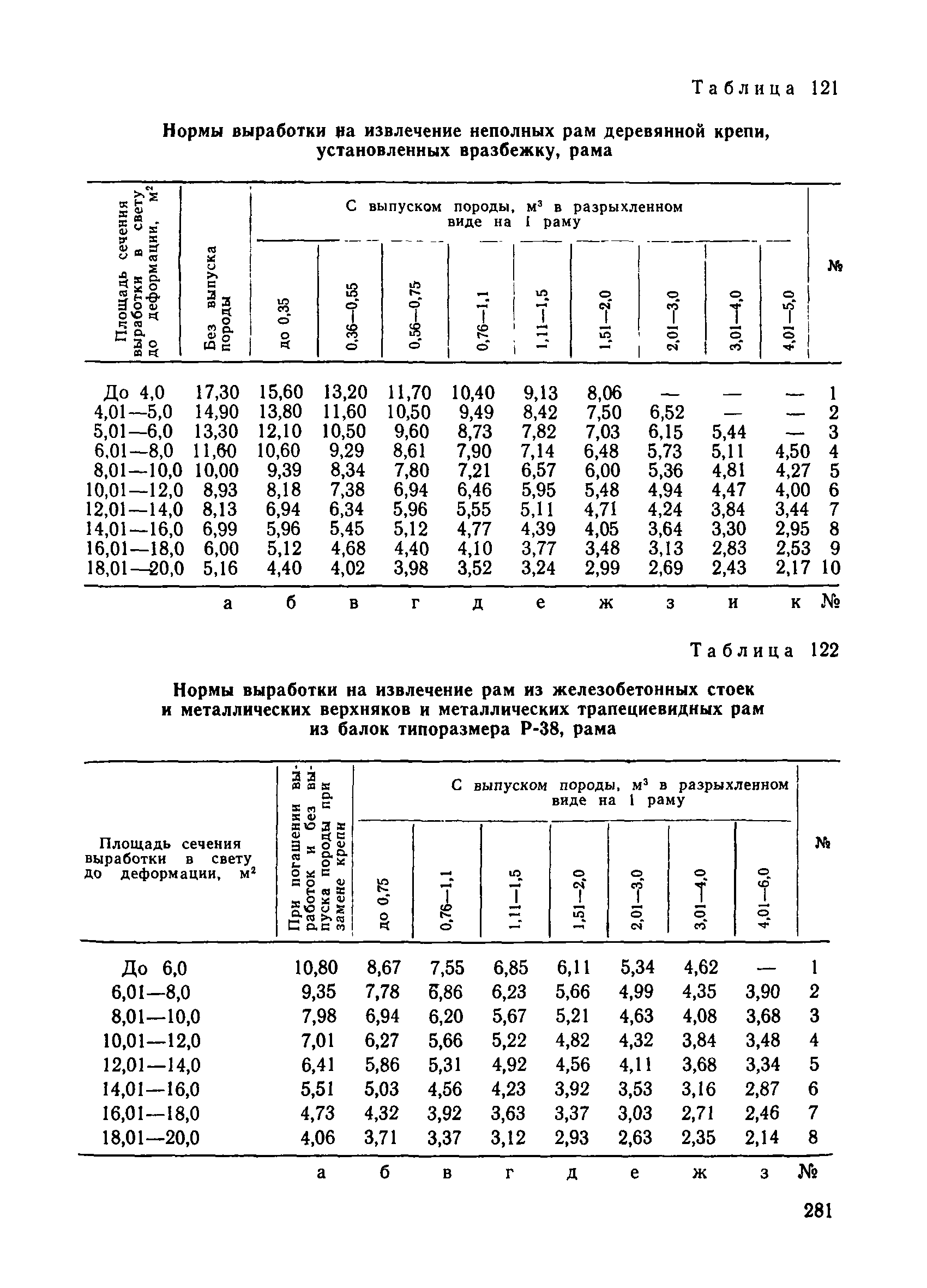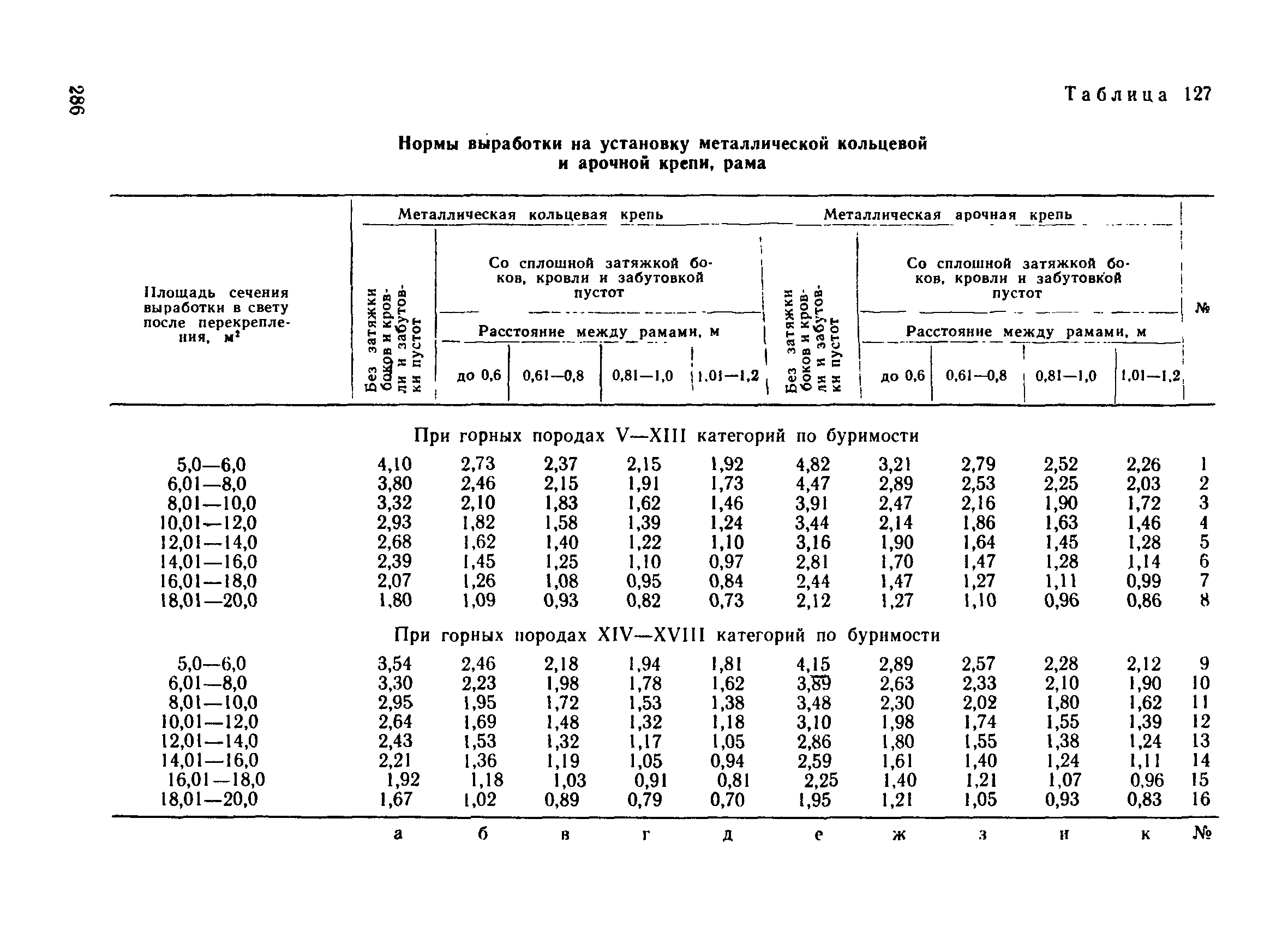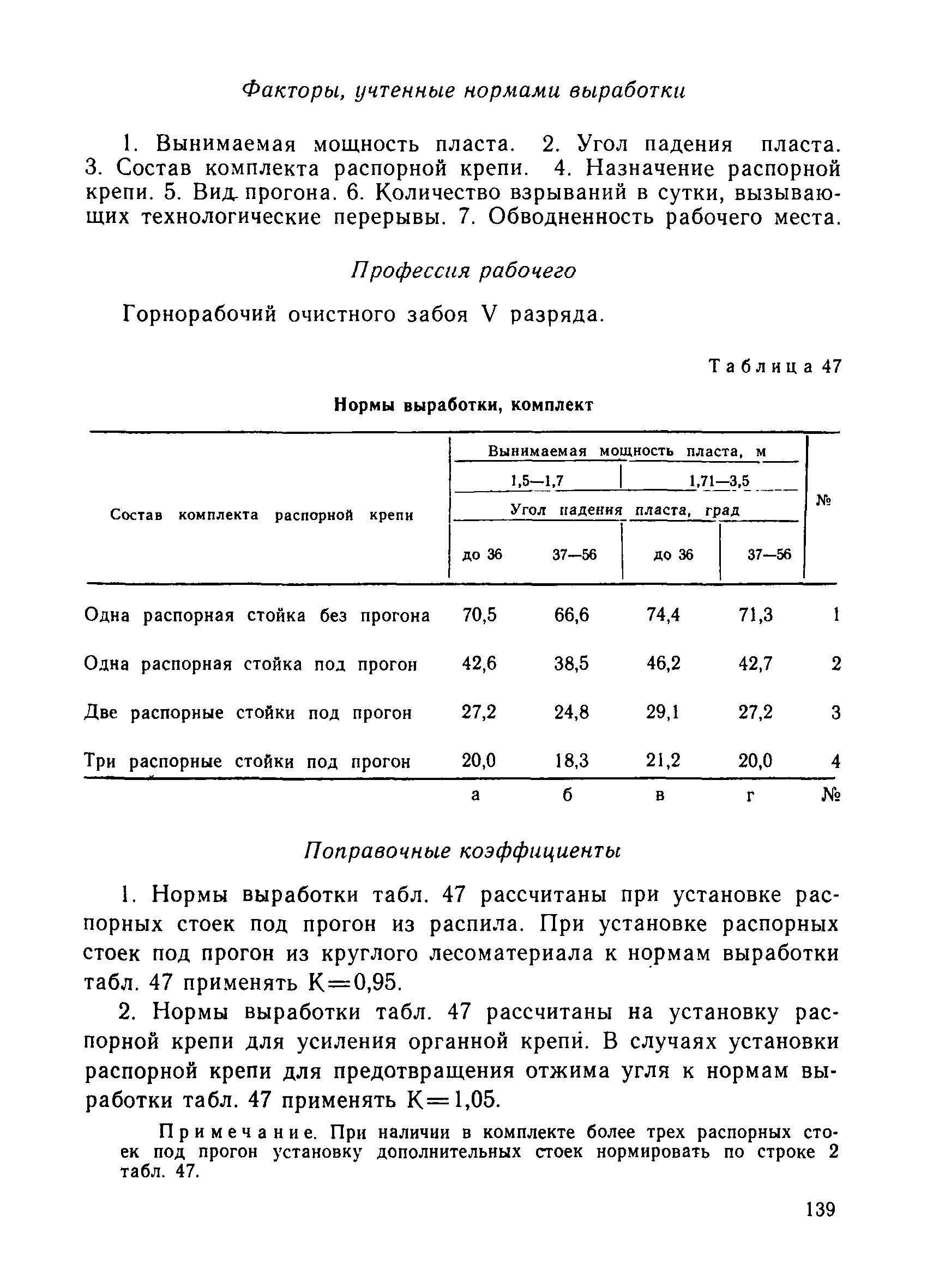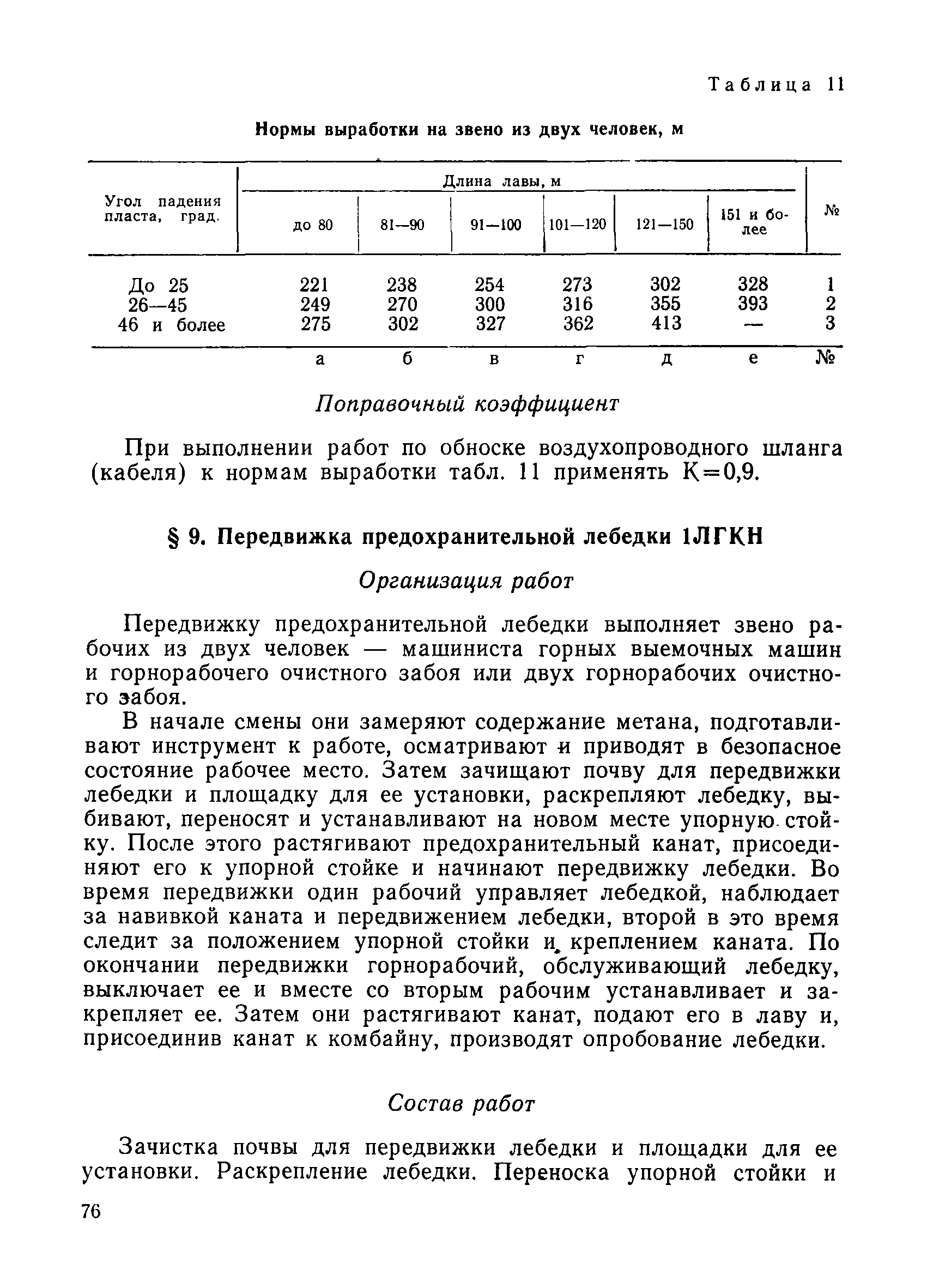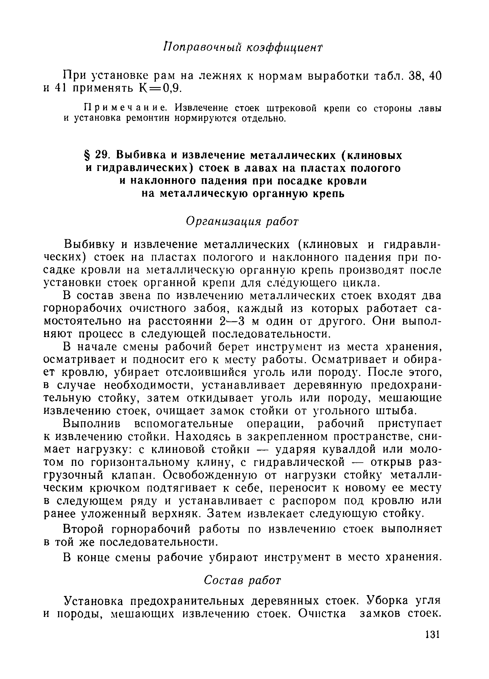 Единые нормы выработки (времени) для шахт производственного объединения "Приморскуголь"| Статус: | справочные материалы, мп, тпр | | Название рус.: | Единые нормы выработки (времени) для шахт производственного объединения "Приморскуголь" | | Дата добавления в базу: | 01.01.2018 | | Дата актуализации: | 01.01.2021 | | Область применения: | Единые нормы выработки (времени) обязательны для применения на всех действующих шахтах производственного объединения "Приморскуголь" | | Оглавление: | Общая часть Техническая часть Нормативная часть Раздел I. Очистные работы § 1. Выемка угля механизированными комплексами типа КМ-81 § 2. Выемка угля механизированными комплексами типов ОМКТ, ОКП, МК § 3. Выемка угля узкозахватными комбайнами типов КШ и ГШ-68 § 4. Оформление забоя после выемки угля узкозахватными комбайнами типов КШ и ГШ-68 § 5. Выемка угля узкозахватными комбайнами 1К-101, 2К-52, МК-67, БК-52 § 6. Оформление забоя после выемки угля узкозахватными комбайнами 1K-101, 2К-52, МК-67 и БК-52 § 7. Выемка угля комбайнами типов УКР, «Темп», КТ, А-70 в лавах на пластах наклонного и крутого падения § 8. Спуск (перегон) комбайнов типов УКР, «Темп», КТ, А-70 в лавах на пластах наклонного и крутого падения с передвижкой крана-балки § 9. Передвижка предохранительной лебедки 1ЛГКН § 10. Оформление забоя после выемки угля комбайнами типов УКР, «Темп», КТ, А-70 в лавах на пластах наклонного падения § 11. Выемка угля в лавах комбайном «Урал-2М» и подготовка его к выемке следующей полосы угля § 12. Оформление забоя после выемки угля комбайном «Урал-2М» § 13. Передвижка гидрофицированной посадочной крепи «Спутник» § 14. Выемка угля в лавах, оборудованных комбайнами К-56М A. Выемка угля Б. Разворот комбайна на пластах пологого падения B. Перегон комбайна § 15. Выемка угля проходческими комбайнами в очистных забоях на пластах пологого падения § 16. Навалоотбойка, навалка угля § 17. Бурение шпуров по углю ручными электросверлами (пневмосверлами) в лавах и камерах § 18. Уборка угля в очистных забоях с помощью скреперной установки § 19. Передвижка скреперной установки § 20. Выемка угля отбойными молотками § 21. Выемка угля с применением ВМ в очистных забоях на пластах крутого падения § 22. Крепление очистных забоев на пластах пологого и наклонного падения металлическими (клиновыми и гидравлическими) стойками § 23. Крепление очистных забоев деревянной крепью § 24. Возведение за комбайном временной деревянной крепи, предусмотренной паспортом крепления § 25. Навеска и снятие металлических шарнирных верхняков § 26. Затяжка кровли, почвы и забоя при креплении § 27. Передвижка специальной крепи типа ОКС на сопряжениях лав со штреками § 28. Установка рам на сопряжениях лав с прилегающими выработками § 29. Выбивка и извлечение металлических (клиновых и гидравлических) стоек в лавах на пластах пологого и наклонного падения при посадке кровли на металлическую органную крепь § 30. Возведение деревянной органной крепи § 31. Кладка и переноска деревянных костров § 32. Установка распорной крепи в очистных забоях § 33. Посадка кровли при помощи лебедки § 34. Бурение шпуров в стойках при посадке кровли с помощью малогабаритных патронов § 35. Передвижка перегружателей гидродомкратом при помощи упорной стойки § 36. Переноска рештаков (листов) в лавах на пластах пологого и наклонного падения § 37. Переноска деревянных рештаков (откосов) в лавах на пластах круто