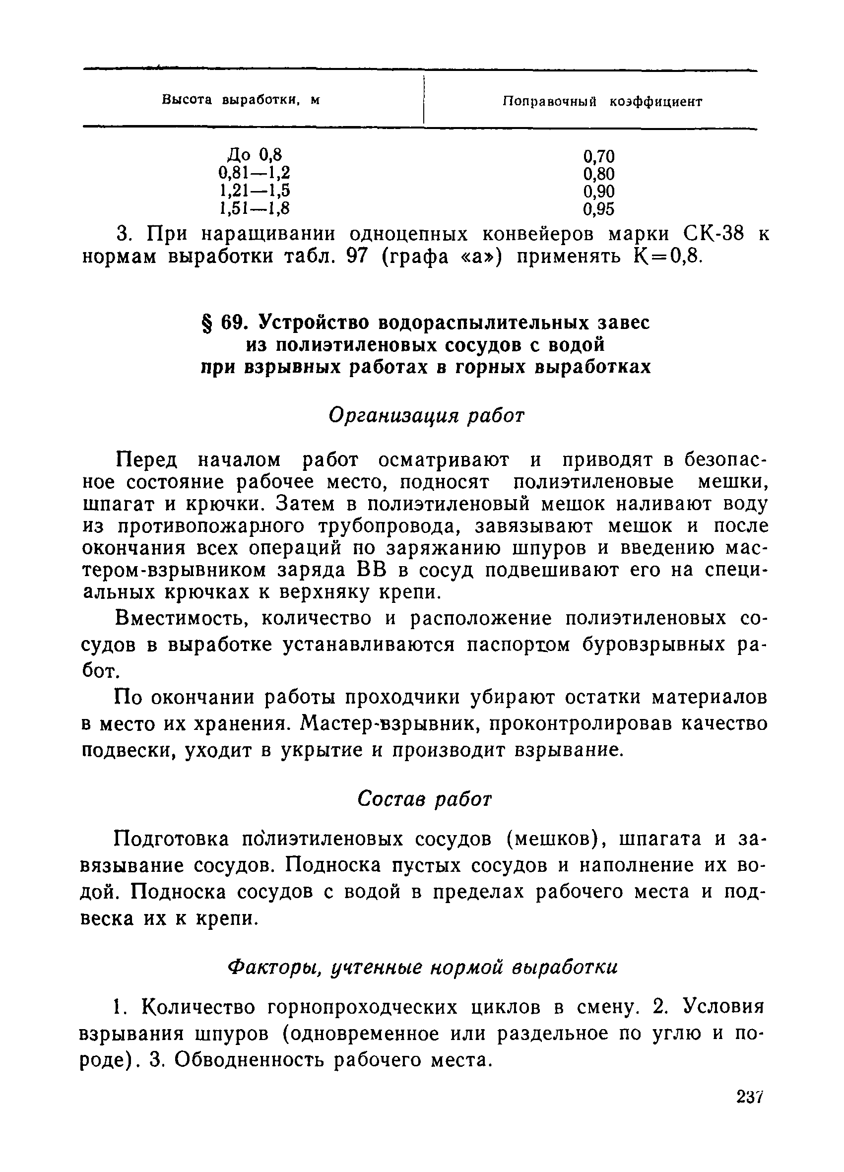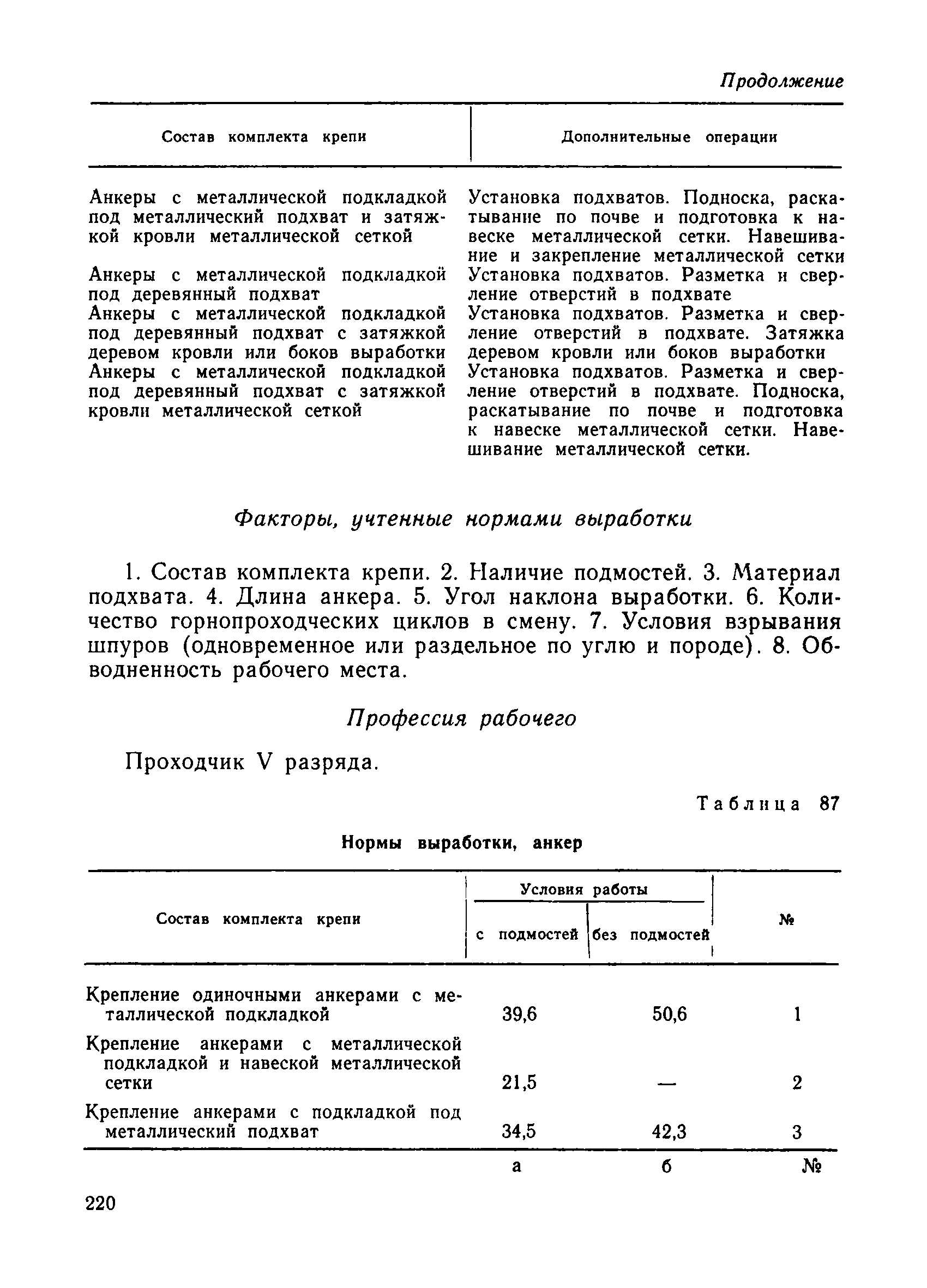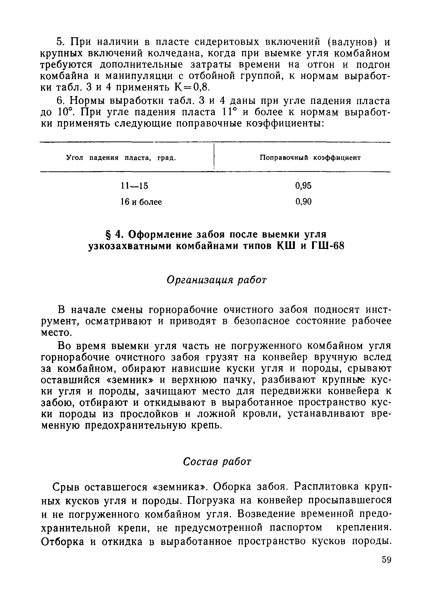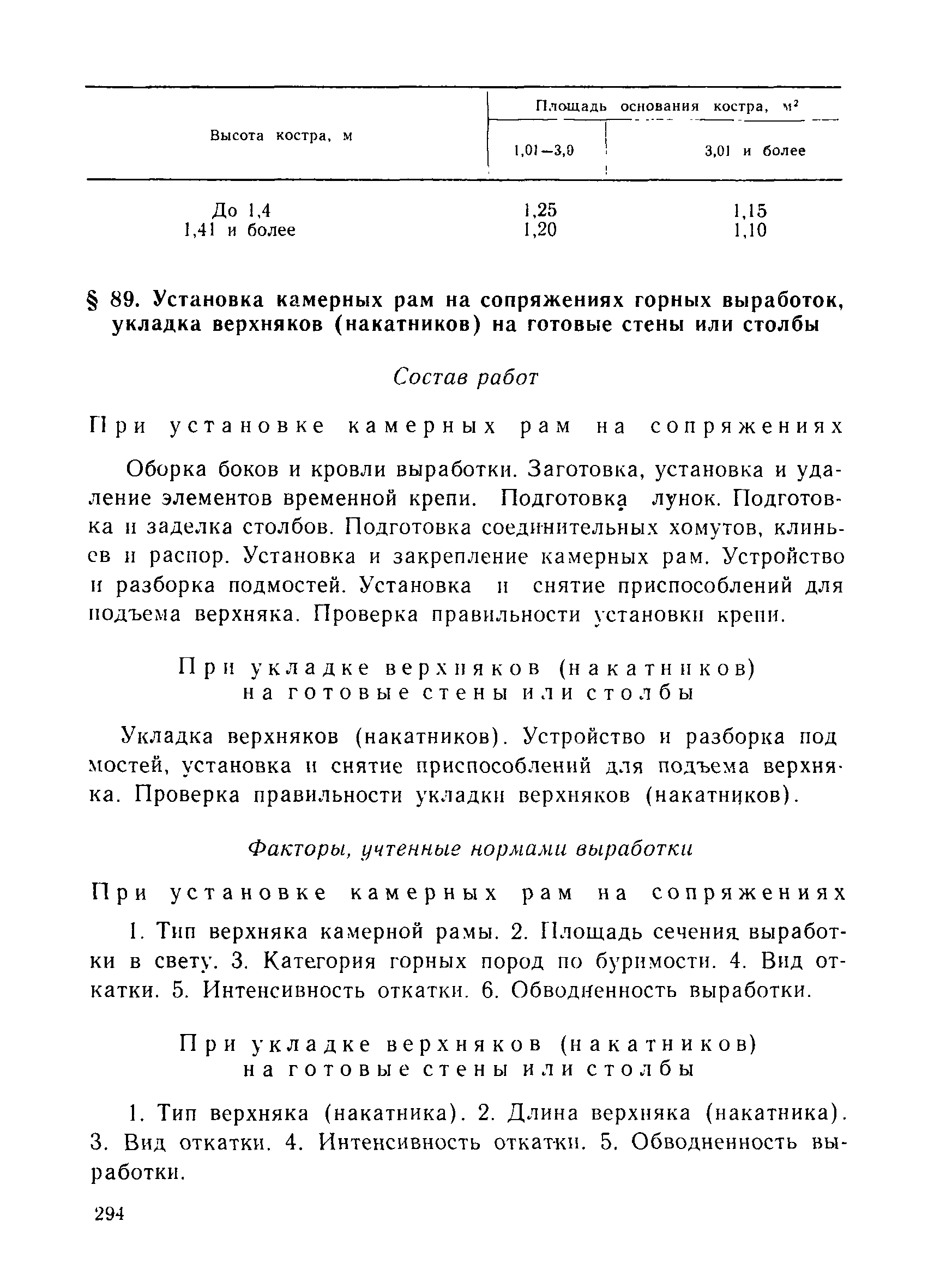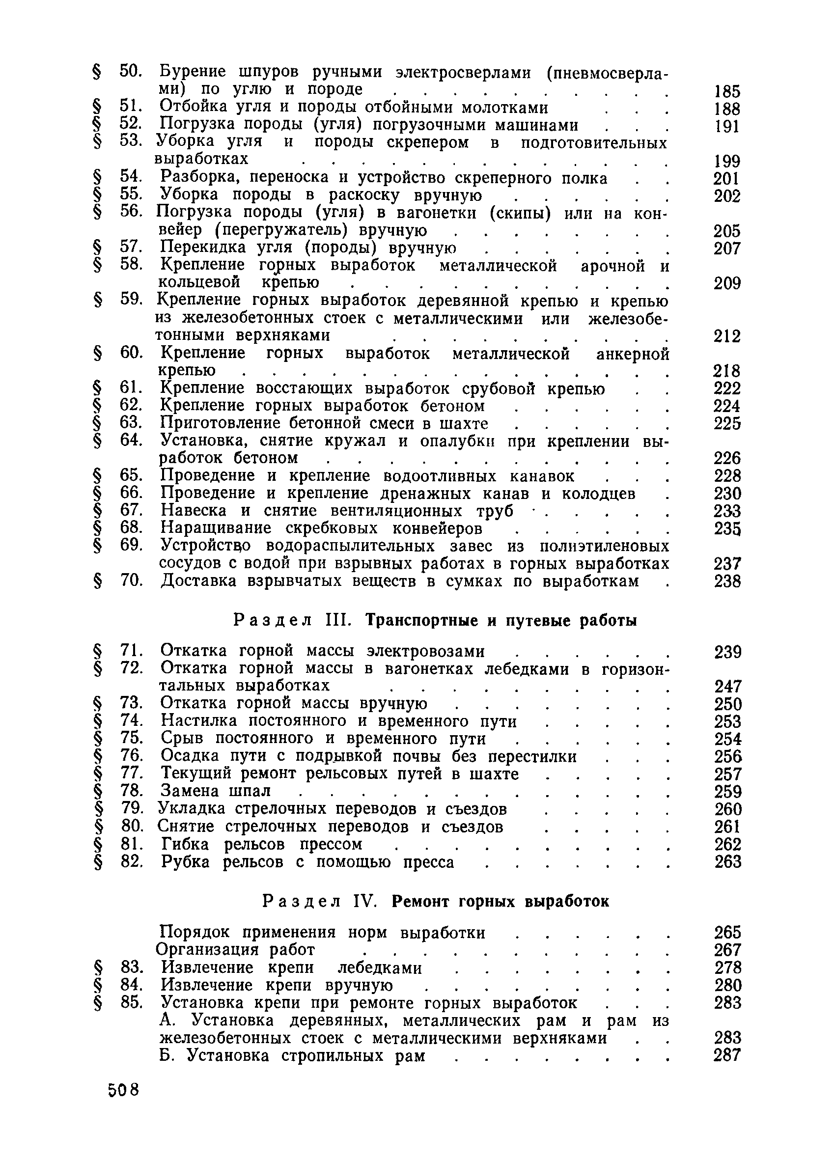 Единые нормы выработки (времени) для шахт производственного объединения "Приморскуголь"| Статус: | справочные материалы, мп, тпр | | Название рус.: | Единые нормы выработки (времени) для шахт производственного объединения "Приморскуголь" | | Дата добавления в базу: | 01.01.2018 | | Дата актуализации: | 01.01.2021 | | Область применения: | Единые нормы выработки (времени) обязательны для применения на всех действующих шахтах производственного объединения "Приморскуголь" | | Оглавление: | Общая часть Техническая часть Нормативная часть Раздел I. Очистные работы § 1. Выемка угля механизированными комплексами типа КМ-81 § 2. Выемка угля механизированными комплексами типов ОМКТ, ОКП, МК § 3. Выемка угля узкозахватными комбайнами типов КШ и ГШ-68 § 4. Оформление забоя после выемки угля узкозахватными комбайнами типов КШ и ГШ-68 § 5. Выемка угля узкозахватными комбайнами 1К-101, 2К-52, МК-67, БК-52 § 6. Оформление забоя после выемки угля узкозахватными комбайнами 1K-101, 2К-52, МК-67 и БК-52 § 7. Выемка угля комбайнами типов УКР, «Темп», КТ, А-70 в лавах на пластах наклонного и крутого падения § 8. Спуск (перегон) комбайнов типов УКР, «Темп», КТ, А-70 в лавах на пластах наклонного и крутого падения с передвижкой крана-балки § 9. Передвижка предохранительной лебедки 1ЛГКН § 10. Оформление забоя после выемки угля комбайнами типов УКР, «Темп», КТ, А-70 в лавах на пластах наклонного падения § 11. Выемка угля в лавах комбайном «Урал-2М» и подготовка его к выемке следующей полосы угля § 12. Оформление забоя после выемки угля комбайном «Урал-2М» § 13. Передвижка гидрофицированной посадочной крепи «Спутник» § 14. Выемка угля в лавах, оборудованных комбайнами К-56М A. Выемка угля Б. Разворот комбайна на пластах пологого падения B. Перегон комбайна § 15. Выемка угля проходческими комбайнами в очистных забоях на пластах пологого падения § 16. Навалоотбойка, навалка угля § 17. Бурение шпуров по углю ручными электросверлами (пневмосверлами) в лавах и камерах § 18. Уборка угля в очистных забоях с помощью скреперной установки § 19. Передвижка скреперной установки § 20. Выемка угля отбойными молотками § 21. Выемка угля с применением ВМ в очистных забоях на пластах крутого падения § 22. Крепление очистных забоев на пластах пологого и наклонного падения металлическими (клиновыми и гидравлическими) стойками § 23. Крепление очистных забоев деревянной крепью § 24. Возведение за комбайном временной деревянной крепи, предусмотренной паспортом крепления § 25. Навеска и снятие металлических шарнирных верхняков § 26. Затяжка кровли, почвы и забоя при креплении § 27. Передвижка специальной крепи типа ОКС на сопряжениях лав со штреками § 28. Установка рам на сопряжениях лав с прилегающими выработками § 29. Выбивка и извлечение металлических (клиновых и гидравлических) стоек в лавах на пластах пологого и наклонного падения при посадке кровли на металлическую органную крепь § 30. Возведение деревянной органной крепи § 31. Кладка и переноска деревянных костров § 32. Установка распорной крепи в очистных забоях § 33. Посадка кровли при помощи лебедки § 34. Бурение шпуров в стойках при посадке кровли с помощью малогабаритных патронов § 35. Передвижка перегружателей гидродомкратом при помощи упорной стойки § 36. Переноска рештаков (листов) в лавах на пластах пологого и наклонного падения § 37. Переноска деревянных рештаков (откосов) в лавах на пластах круто