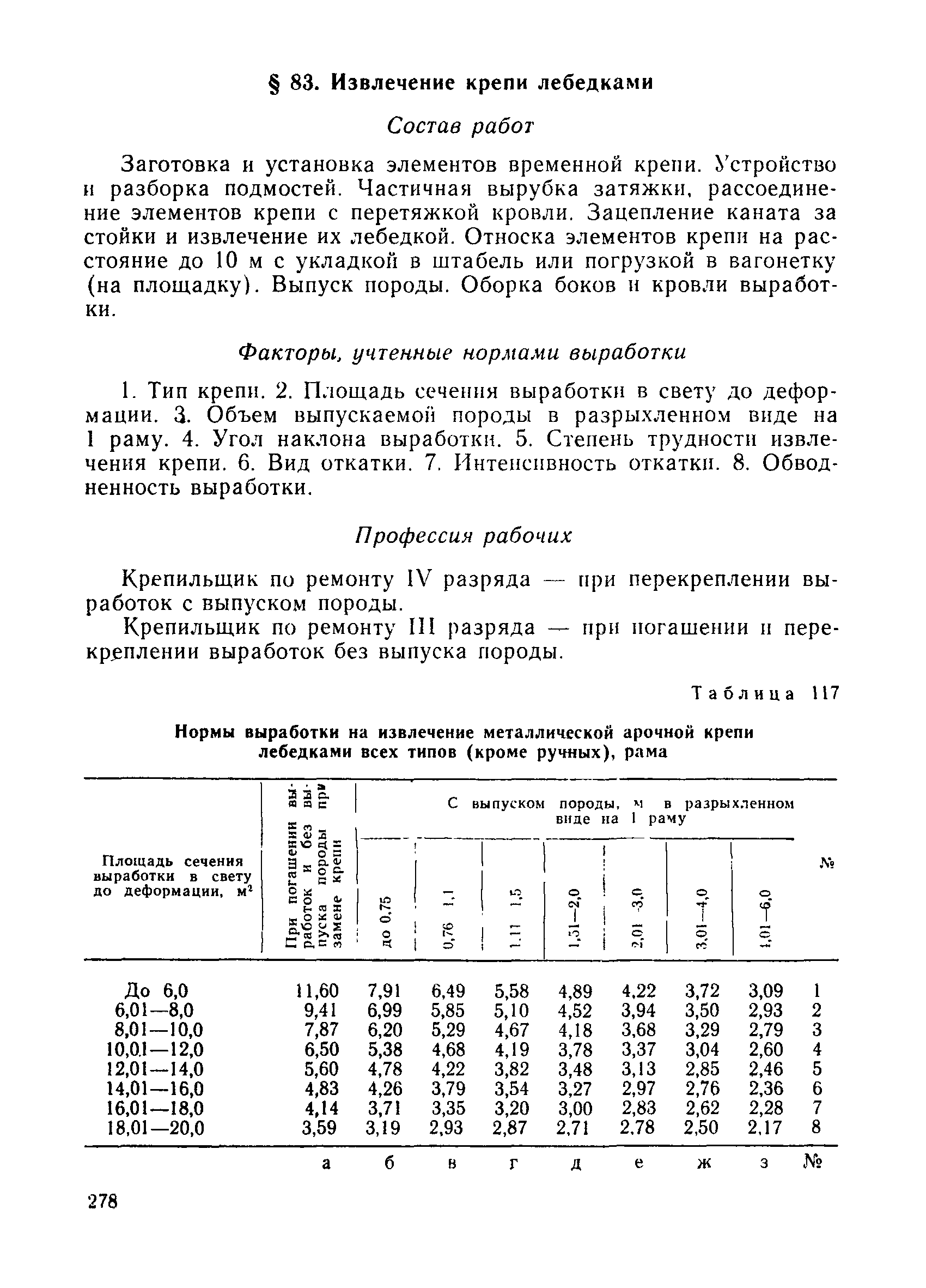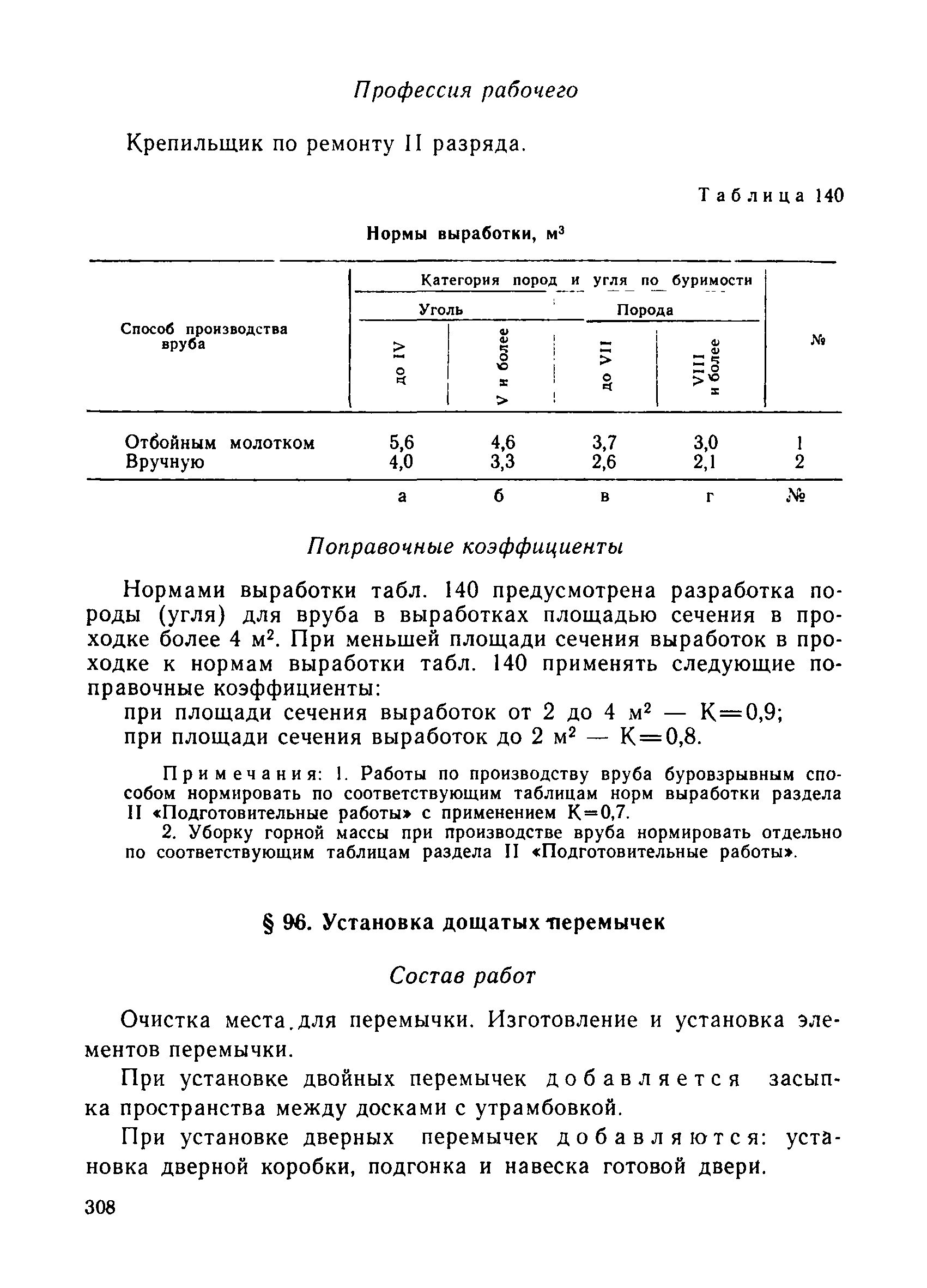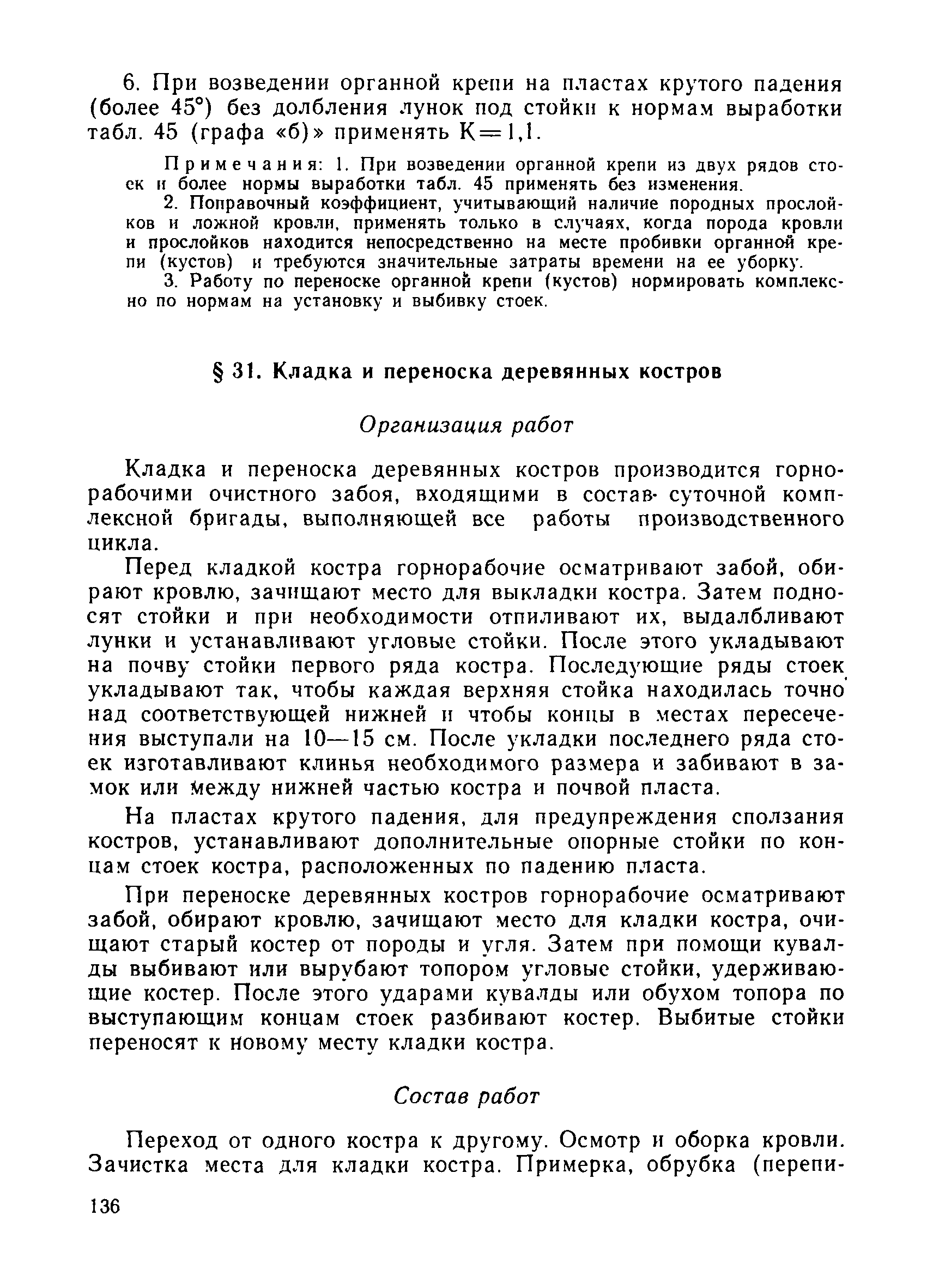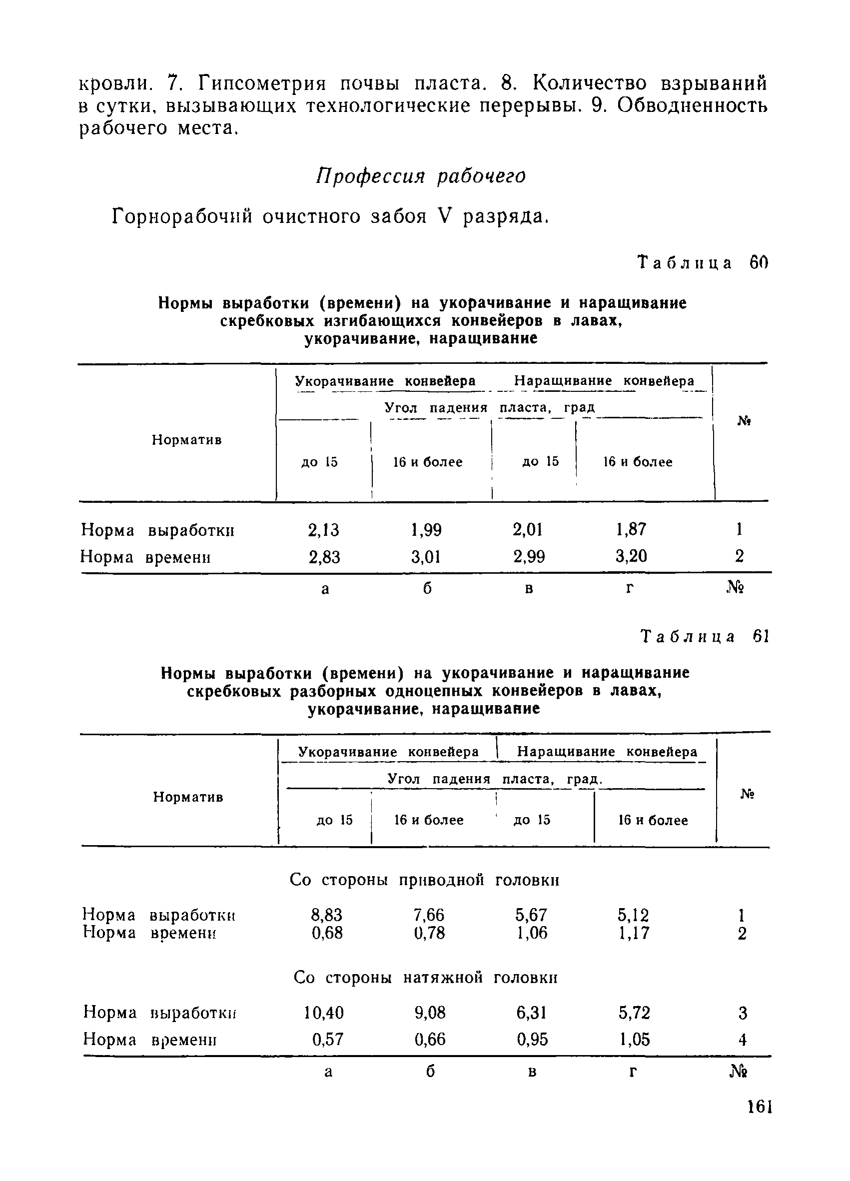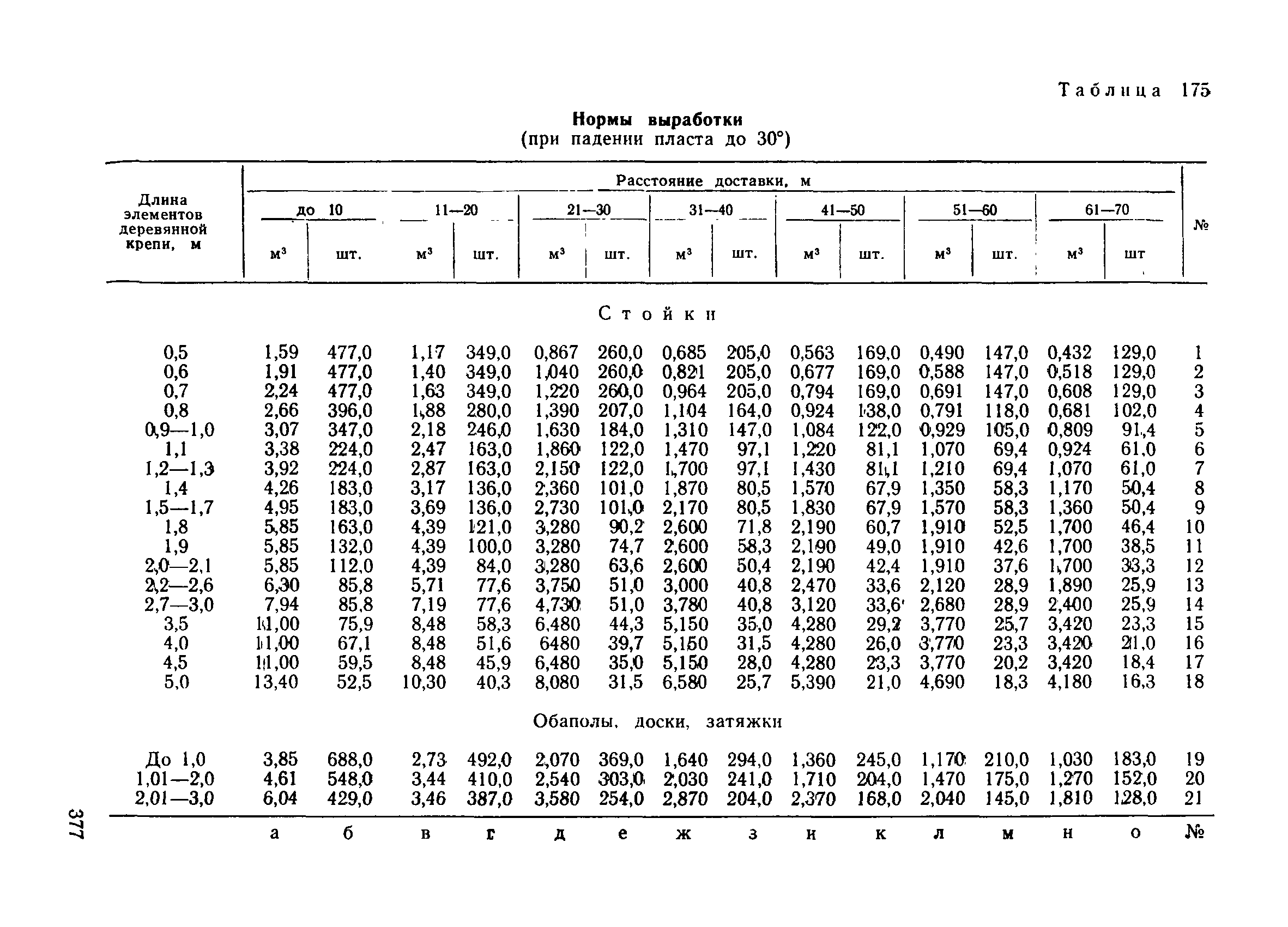 Единые нормы выработки (времени) для шахт производственного объединения "Приморскуголь"| Статус: | справочные материалы, мп, тпр | | Название рус.: | Единые нормы выработки (времени) для шахт производственного объединения "Приморскуголь" | | Дата добавления в базу: | 01.01.2018 | | Дата актуализации: | 01.01.2021 | | Область применения: | Единые нормы выработки (времени) обязательны для применения на всех действующих шахтах производственного объединения "Приморскуголь" | | Оглавление: | Общая часть Техническая часть Нормативная часть Раздел I. Очистные работы § 1. Выемка угля механизированными комплексами типа КМ-81 § 2. Выемка угля механизированными комплексами типов ОМКТ, ОКП, МК § 3. Выемка угля узкозахватными комбайнами типов КШ и ГШ-68 § 4. Оформление забоя после выемки угля узкозахватными комбайнами типов КШ и ГШ-68 § 5. Выемка угля узкозахватными комбайнами 1К-101, 2К-52, МК-67, БК-52 § 6. Оформление забоя после выемки угля узкозахватными комбайнами 1K-101, 2К-52, МК-67 и БК-52 § 7. Выемка угля комбайнами типов УКР, «Темп», КТ, А-70 в лавах на пластах наклонного и крутого падения § 8. Спуск (перегон) комбайнов типов УКР, «Темп», КТ, А-70 в лавах на пластах наклонного и крутого падения с передвижкой крана-балки § 9. Передвижка предохранительной лебедки 1ЛГКН § 10. Оформление забоя после выемки угля комбайнами типов УКР, «Темп», КТ, А-70 в лавах на пластах наклонного падения § 11. Выемка угля в лавах комбайном «Урал-2М» и подготовка его к выемке следующей полосы угля § 12. Оформление забоя после выемки угля комбайном «Урал-2М» § 13. Передвижка гидрофицированной посадочной крепи «Спутник» § 14. Выемка угля в лавах, оборудованных комбайнами К-56М A. Выемка угля Б. Разворот комбайна на пластах пологого падения B. Перегон комбайна § 15. Выемка угля проходческими комбайнами в очистных забоях на пластах пологого падения § 16. Навалоотбойка, навалка угля § 17. Бурение шпуров по углю ручными электросверлами (пневмосверлами) в лавах и камерах § 18. Уборка угля в очистных забоях с помощью скреперной установки § 19. Передвижка скреперной установки § 20. Выемка угля отбойными молотками § 21. Выемка угля с применением ВМ в очистных забоях на пластах крутого падения § 22. Крепление очистных забоев на пластах пологого и наклонного падения металлическими (клиновыми и гидравлическими) стойками § 23. Крепление очистных забоев деревянной крепью § 24. Возведение за комбайном временной деревянной крепи, предусмотренной паспортом крепления § 25. Навеска и снятие металлических шарнирных верхняков § 26. Затяжка кровли, почвы и забоя при креплении § 27. Передвижка специальной крепи типа ОКС на сопряжениях лав со штреками § 28. Установка рам на сопряжениях лав с прилегающими выработками § 29. Выбивка и извлечение металлических (клиновых и гидравлических) стоек в лавах на пластах пологого и наклонного падения при посадке кровли на металлическую органную крепь § 30. Возведение деревянной органной крепи § 31. Кладка и переноска деревянных костров § 32. Установка распорной крепи в очистных забоях § 33. Посадка кровли при помощи лебедки § 34. Бурение шпуров в стойках при посадке кровли с помощью малогабаритных патронов § 35. Передвижка перегружателей гидродомкратом при помощи упорной стойки § 36. Переноска рештаков (листов) в лавах на пластах пологого и наклонного падения § 37. Переноска деревянных рештаков (откосов) в лавах на пластах круто