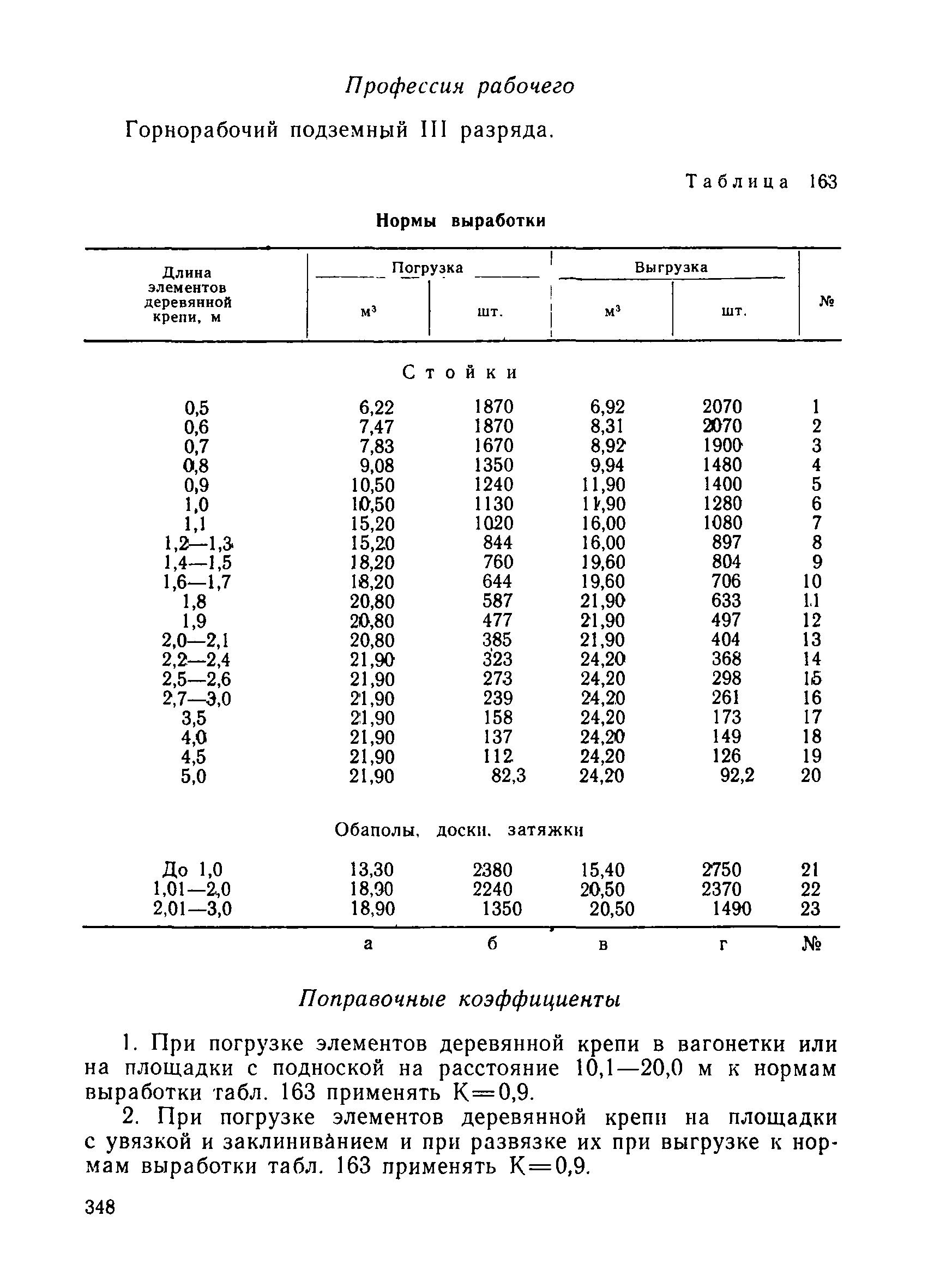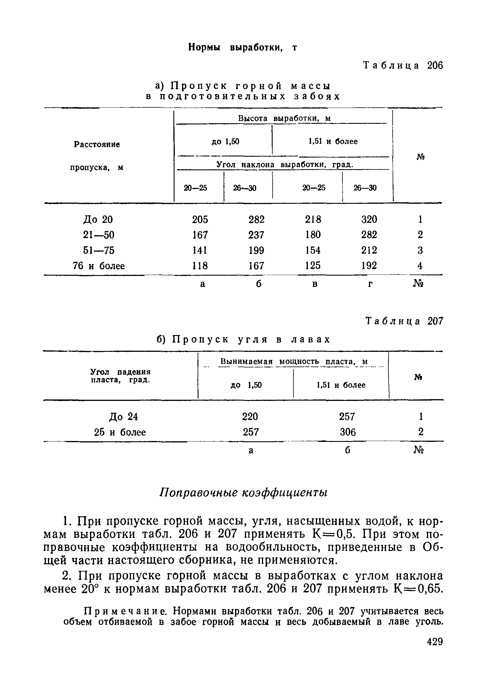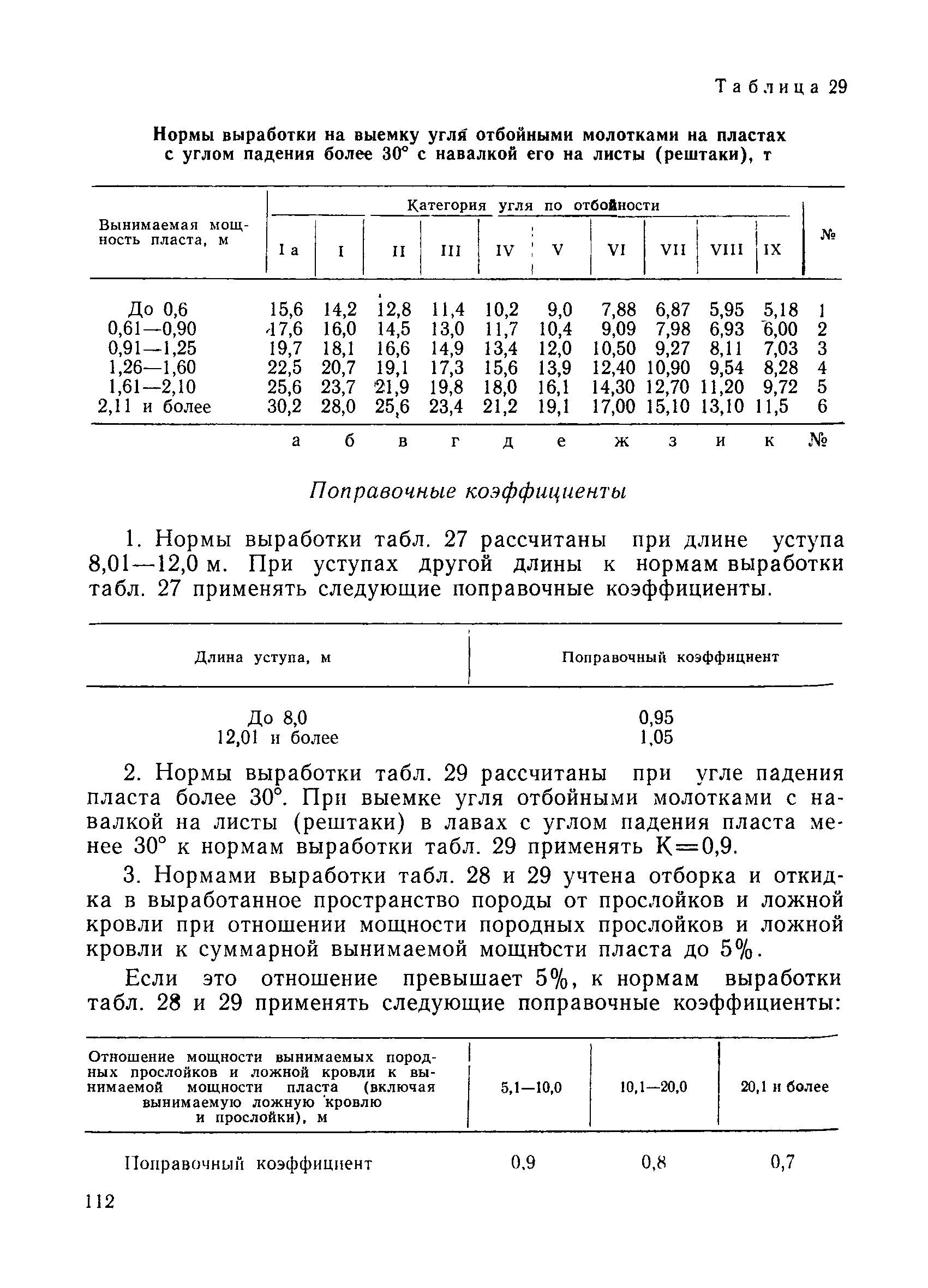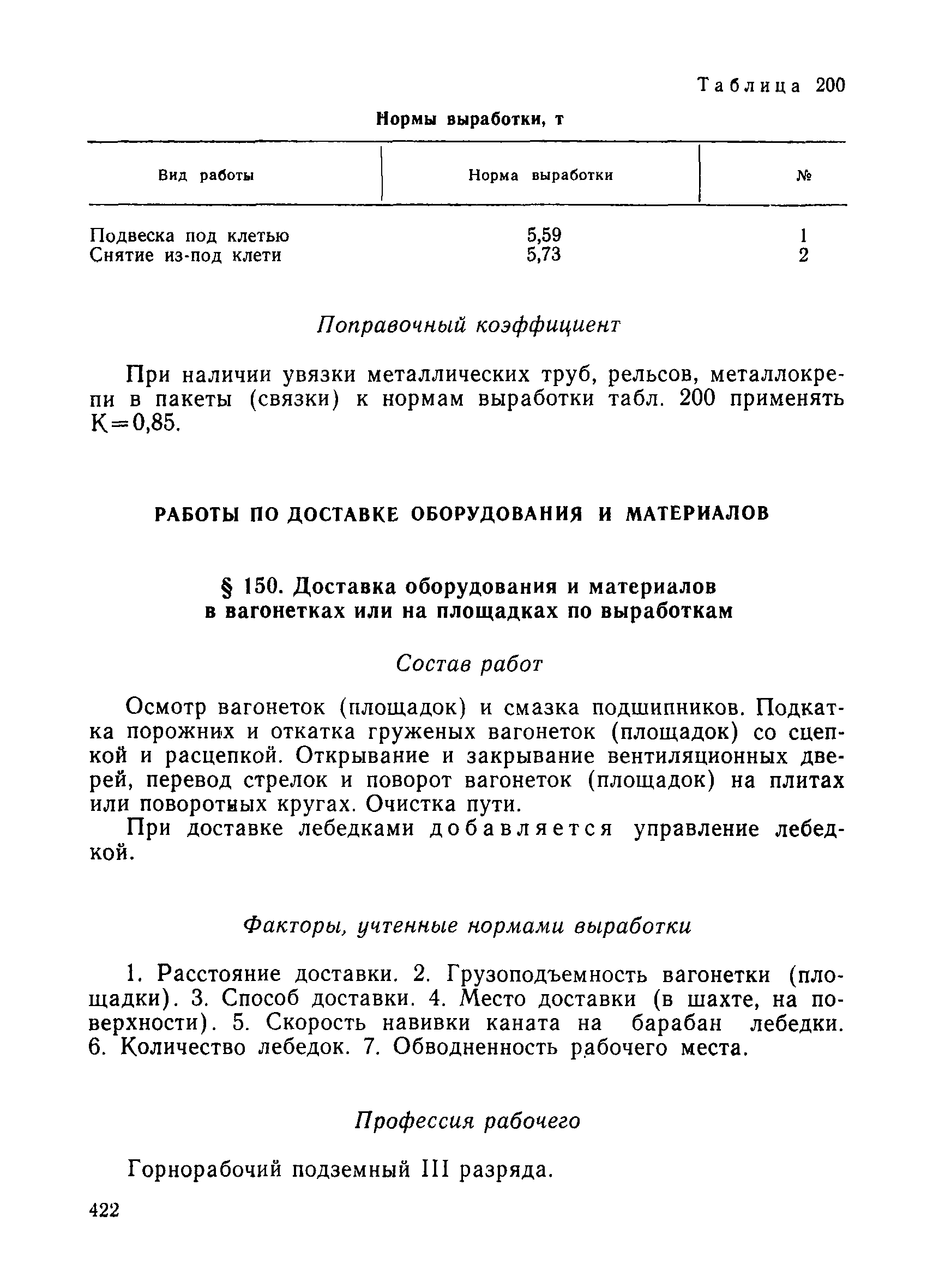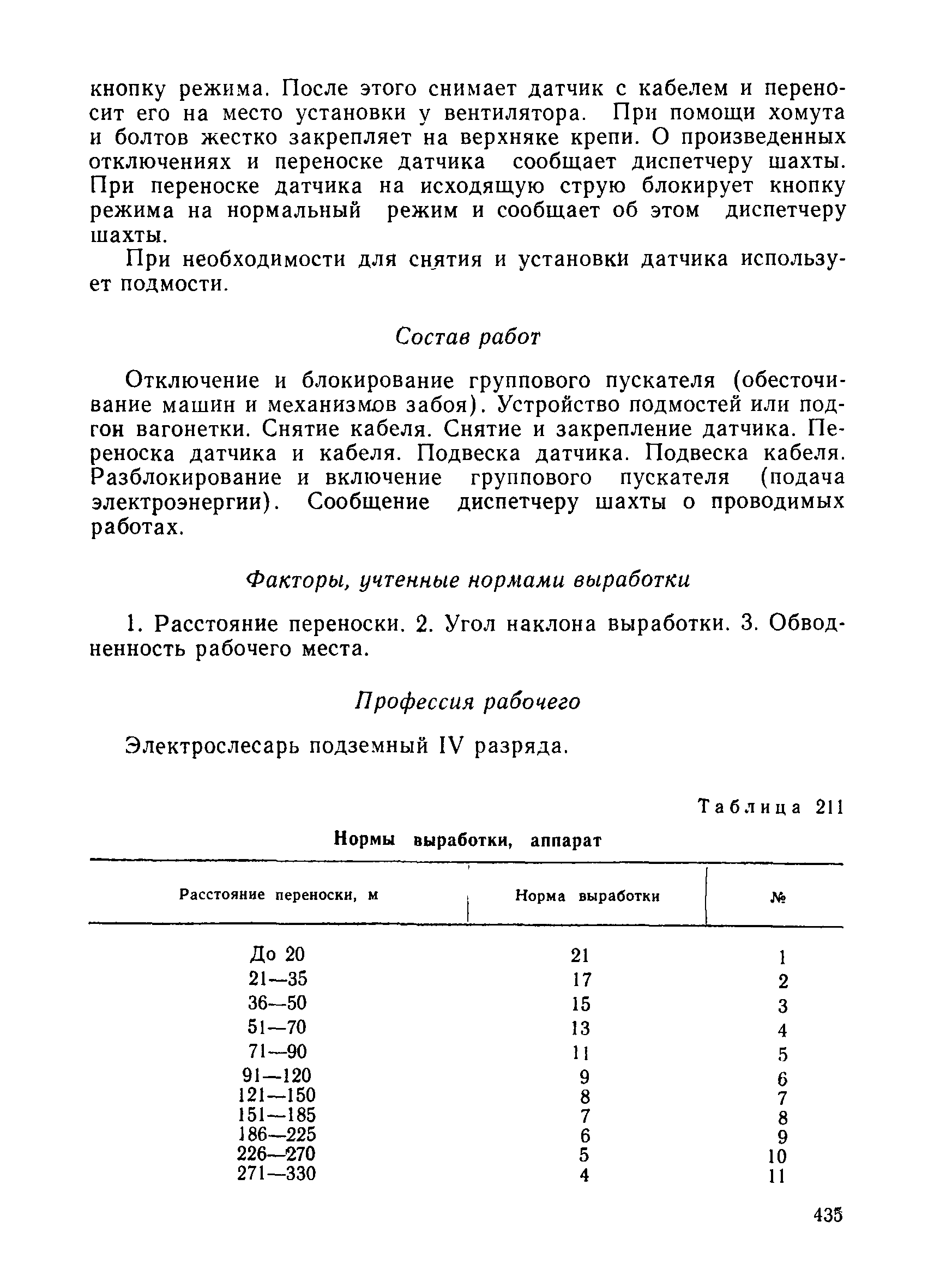 Единые нормы выработки (времени) для шахт производственного объединения "Приморскуголь"| Статус: | справочные материалы, мп, тпр | | Название рус.: | Единые нормы выработки (времени) для шахт производственного объединения "Приморскуголь" | | Дата добавления в базу: | 01.01.2018 | | Дата актуализации: | 01.01.2021 | | Область применения: | Единые нормы выработки (времени) обязательны для применения на всех действующих шахтах производственного объединения "Приморскуголь" | | Оглавление: | Общая часть Техническая часть Нормативная часть Раздел I. Очистные работы § 1. Выемка угля механизированными комплексами типа КМ-81 § 2. Выемка угля механизированными комплексами типов ОМКТ, ОКП, МК § 3. Выемка угля узкозахватными комбайнами типов КШ и ГШ-68 § 4. Оформление забоя после выемки угля узкозахватными комбайнами типов КШ и ГШ-68 § 5. Выемка угля узкозахватными комбайнами 1К-101, 2К-52, МК-67, БК-52 § 6. Оформление забоя после выемки угля узкозахватными комбайнами 1K-101, 2К-52, МК-67 и БК-52 § 7. Выемка угля комбайнами типов УКР, «Темп», КТ, А-70 в лавах на пластах наклонного и крутого падения § 8. Спуск (перегон) комбайнов типов УКР, «Темп», КТ, А-70 в лавах на пластах наклонного и крутого падения с передвижкой крана-балки § 9. Передвижка предохранительной лебедки 1ЛГКН § 10. Оформление забоя после выемки угля комбайнами типов УКР, «Темп», КТ, А-70 в лавах на пластах наклонного падения § 11. Выемка угля в лавах комбайном «Урал-2М» и подготовка его к выемке следующей полосы угля § 12. Оформление забоя после выемки угля комбайном «Урал-2М» § 13. Передвижка гидрофицированной посадочной крепи «Спутник» § 14. Выемка угля в лавах, оборудованных комбайнами К-56М A. Выемка угля Б. Разворот комбайна на пластах пологого падения B. Перегон комбайна § 15. Выемка угля проходческими комбайнами в очистных забоях на пластах пологого падения § 16. Навалоотбойка, навалка угля § 17. Бурение шпуров по углю ручными электросверлами (пневмосверлами) в лавах и камерах § 18. Уборка угля в очистных забоях с помощью скреперной установки § 19. Передвижка скреперной установки § 20. Выемка угля отбойными молотками § 21. Выемка угля с применением ВМ в очистных забоях на пластах крутого падения § 22. Крепление очистных забоев на пластах пологого и наклонного падения металлическими (клиновыми и гидравлическими) стойками § 23. Крепление очистных забоев деревянной крепью § 24. Возведение за комбайном временной деревянной крепи, предусмотренной паспортом крепления § 25. Навеска и снятие металлических шарнирных верхняков § 26. Затяжка кровли, почвы и забоя при креплении § 27. Передвижка специальной крепи типа ОКС на сопряжениях лав со штреками § 28. Установка рам на сопряжениях лав с прилегающими выработками § 29. Выбивка и извлечение металлических (клиновых и гидравлических) стоек в лавах на пластах пологого и наклонного падения при посадке кровли на металлическую органную крепь § 30. Возведение деревянной органной крепи § 31. Кладка и переноска деревянных костров § 32. Установка распорной крепи в очистных забоях § 33. Посадка кровли при помощи лебедки § 34. Бурение шпуров в стойках при посадке кровли с помощью малогабаритных патронов § 35. Передвижка перегружателей гидродомкратом при помощи упорной стойки § 36. Переноска рештаков (листов) в лавах на пластах пологого и наклонного падения § 37. Переноска деревянных рештаков (откосов) в лавах на пластах круто