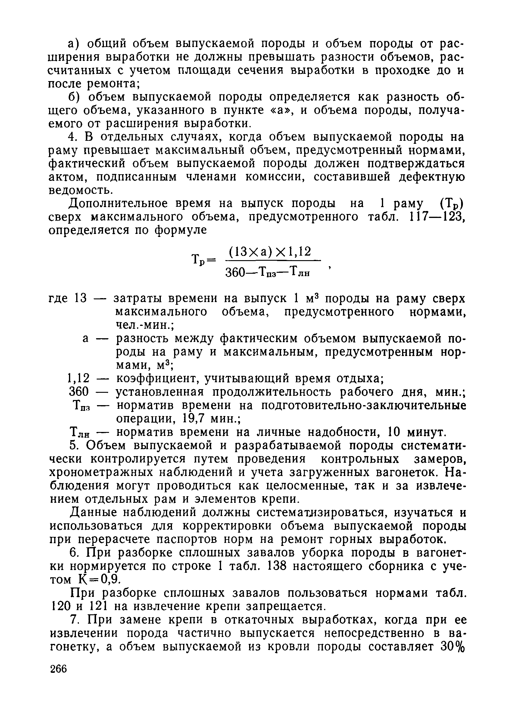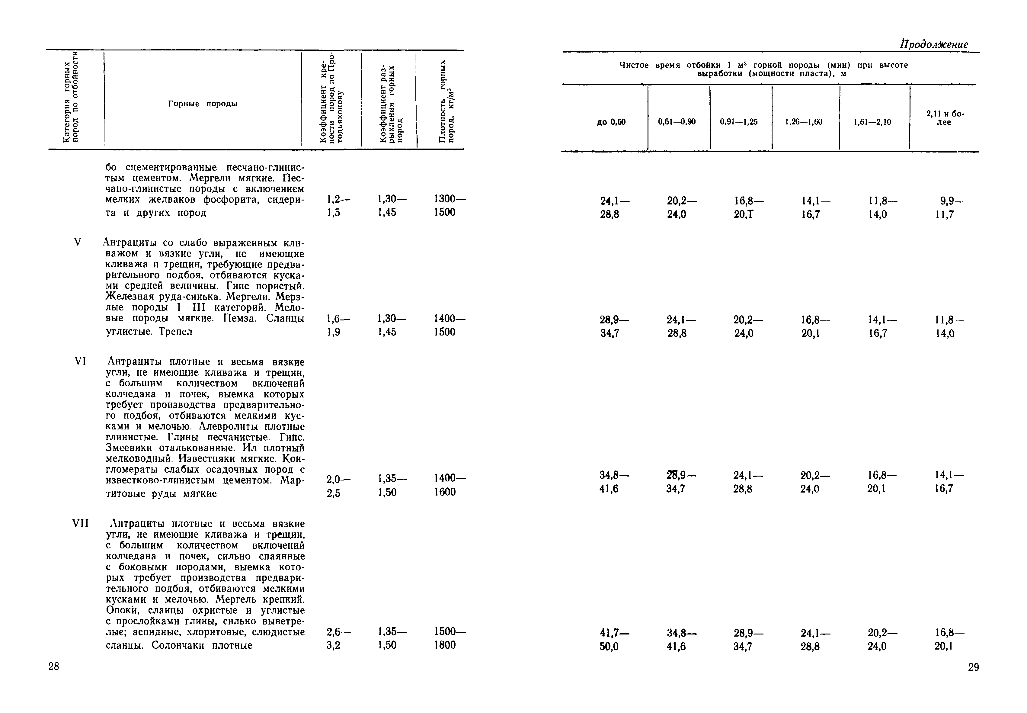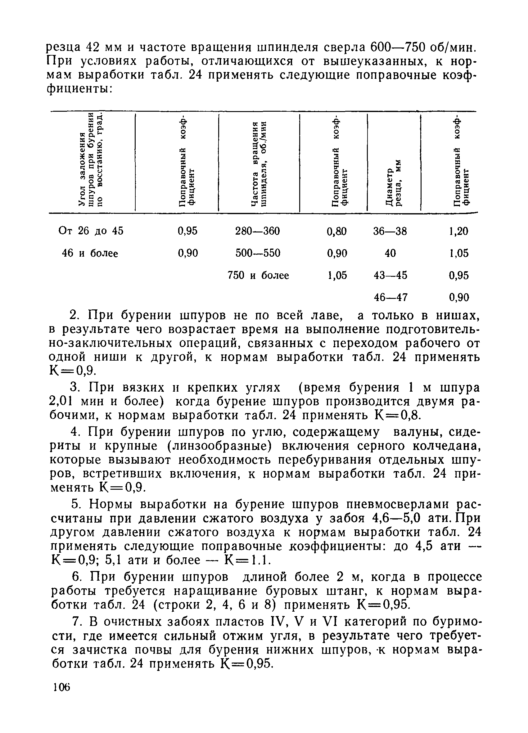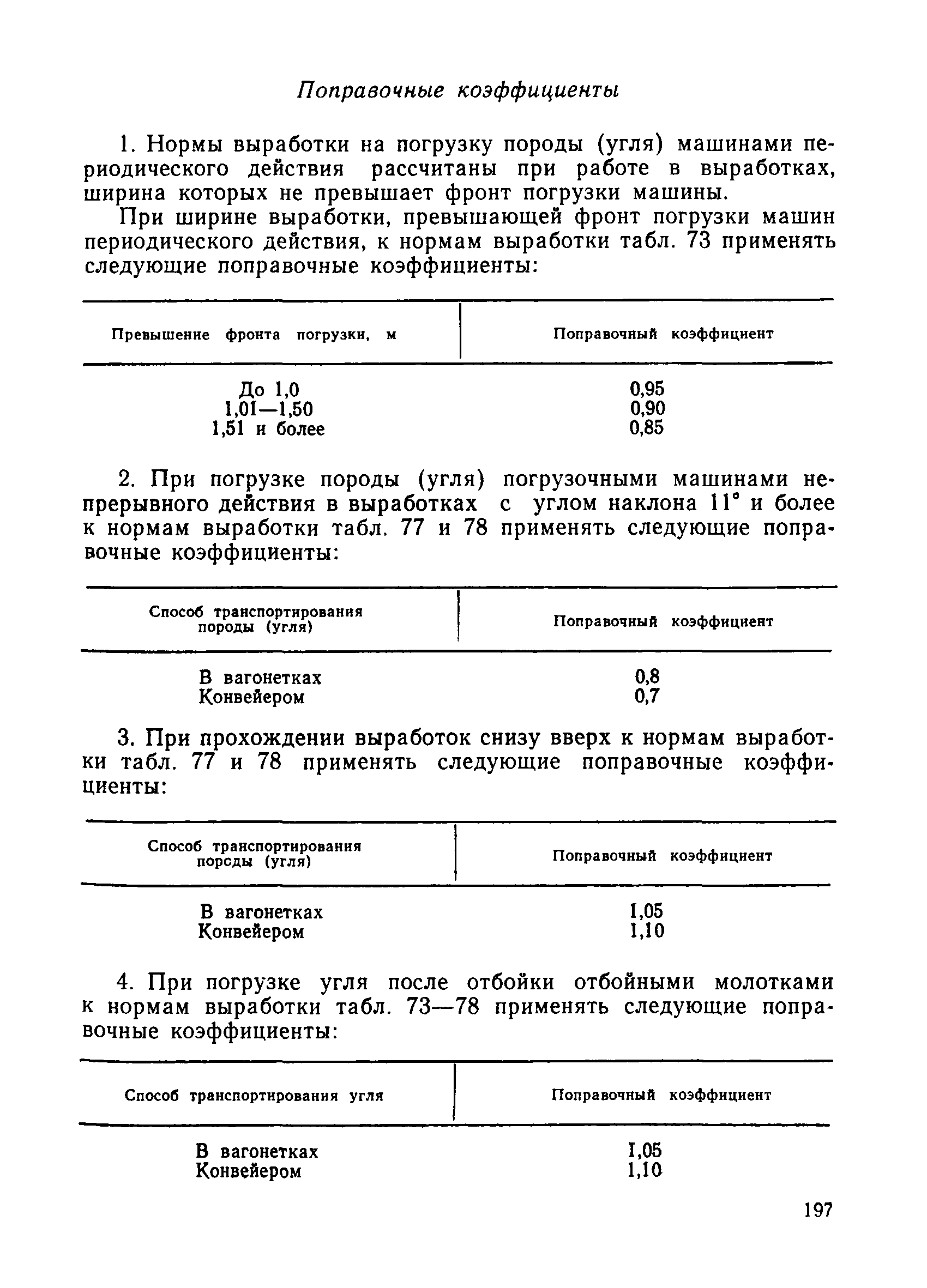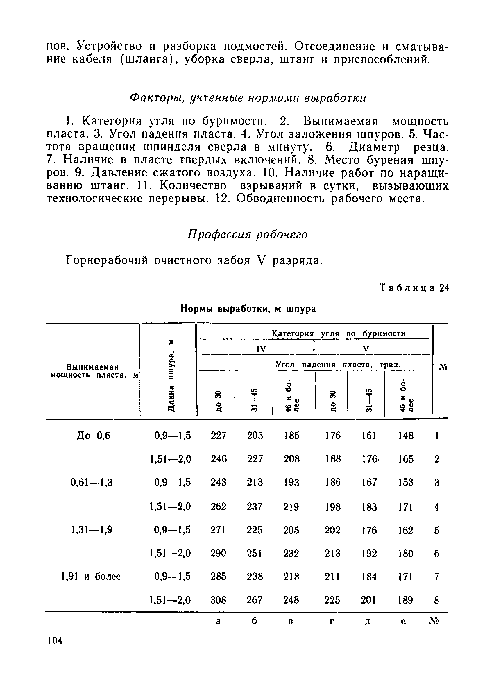 Единые нормы выработки (времени) для шахт производственного объединения "Приморскуголь"| Статус: | справочные материалы, мп, тпр | | Название рус.: | Единые нормы выработки (времени) для шахт производственного объединения "Приморскуголь" | | Дата добавления в базу: | 01.01.2018 | | Дата актуализации: | 01.01.2021 | | Область применения: | Единые нормы выработки (времени) обязательны для применения на всех действующих шахтах производственного объединения "Приморскуголь" | | Оглавление: | Общая часть Техническая часть Нормативная часть Раздел I. Очистные работы § 1. Выемка угля механизированными комплексами типа КМ-81 § 2. Выемка угля механизированными комплексами типов ОМКТ, ОКП, МК § 3. Выемка угля узкозахватными комбайнами типов КШ и ГШ-68 § 4. Оформление забоя после выемки угля узкозахватными комбайнами типов КШ и ГШ-68 § 5. Выемка угля узкозахватными комбайнами 1К-101, 2К-52, МК-67, БК-52 § 6. Оформление забоя после выемки угля узкозахватными комбайнами 1K-101, 2К-52, МК-67 и БК-52 § 7. Выемка угля комбайнами типов УКР, «Темп», КТ, А-70 в лавах на пластах наклонного и крутого падения § 8. Спуск (перегон) комбайнов типов УКР, «Темп», КТ, А-70 в лавах на пластах наклонного и крутого падения с передвижкой крана-балки § 9. Передвижка предохранительной лебедки 1ЛГКН § 10. Оформление забоя после выемки угля комбайнами типов УКР, «Темп», КТ, А-70 в лавах на пластах наклонного падения § 11. Выемка угля в лавах комбайном «Урал-2М» и подготовка его к выемке следующей полосы угля § 12. Оформление забоя после выемки угля комбайном «Урал-2М» § 13. Передвижка гидрофицированной посадочной крепи «Спутник» § 14. Выемка угля в лавах, оборудованных комбайнами К-56М A. Выемка угля Б. Разворот комбайна на пластах пологого падения B. Перегон комбайна § 15. Выемка угля проходческими комбайнами в очистных забоях на пластах пологого падения § 16. Навалоотбойка, навалка угля § 17. Бурение шпуров по углю ручными электросверлами (пневмосверлами) в лавах и камерах § 18. Уборка угля в очистных забоях с помощью скреперной установки § 19. Передвижка скреперной установки § 20. Выемка угля отбойными молотками § 21. Выемка угля с применением ВМ в очистных забоях на пластах крутого падения § 22. Крепление очистных забоев на пластах пологого и наклонного падения металлическими (клиновыми и гидравлическими) стойками § 23. Крепление очистных забоев деревянной крепью § 24. Возведение за комбайном временной деревянной крепи, предусмотренной паспортом крепления § 25. Навеска и снятие металлических шарнирных верхняков § 26. Затяжка кровли, почвы и забоя при креплении § 27. Передвижка специальной крепи типа ОКС на сопряжениях лав со штреками § 28. Установка рам на сопряжениях лав с прилегающими выработками § 29. Выбивка и извлечение металлических (клиновых и гидравлических) стоек в лавах на пластах пологого и наклонного падения при посадке кровли на металлическую органную крепь § 30. Возведение деревянной органной крепи § 31. Кладка и переноска деревянных костров § 32. Установка распорной крепи в очистных забоях § 33. Посадка кровли при помощи лебедки § 34. Бурение шпуров в стойках при посадке кровли с помощью малогабаритных патронов § 35. Передвижка перегружателей гидродомкратом при помощи упорной стойки § 36. Переноска рештаков (листов) в лавах на пластах пологого и наклонного падения § 37. Переноска деревянных рештаков (откосов) в лавах на пластах круто