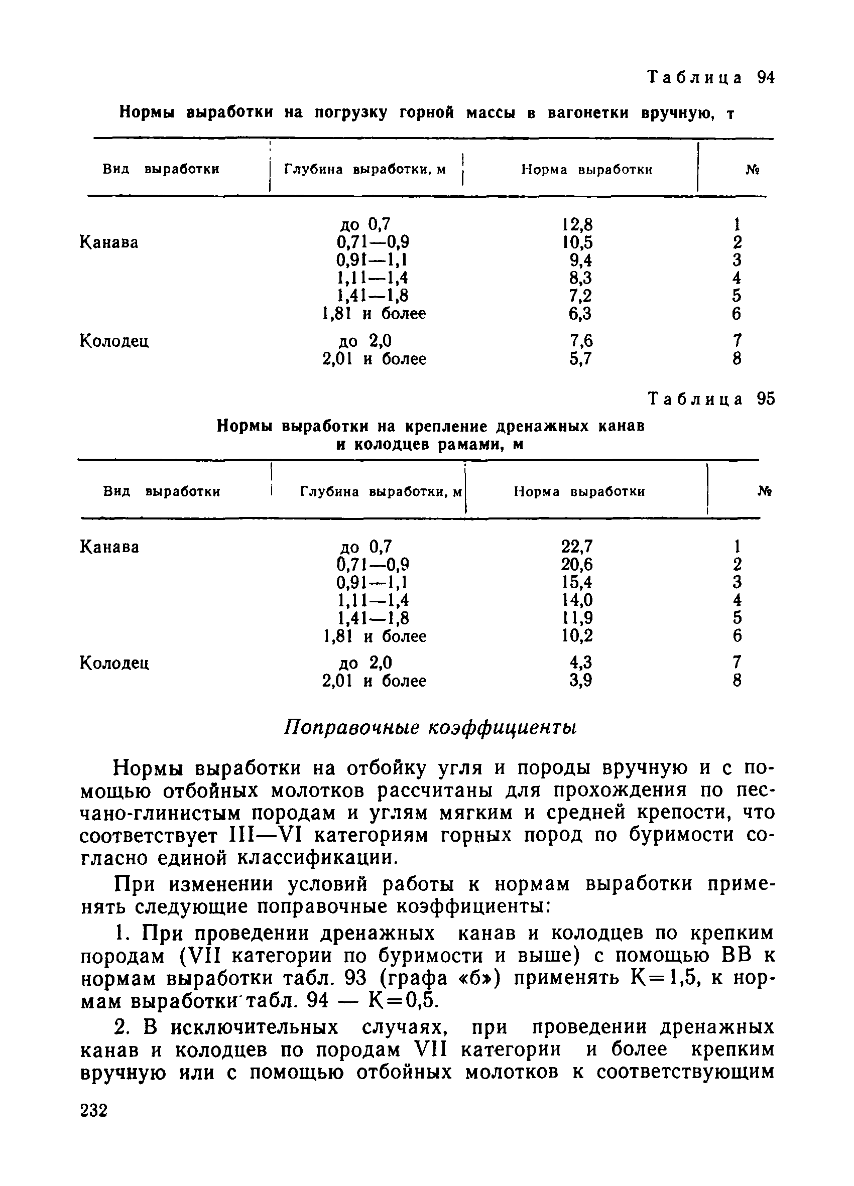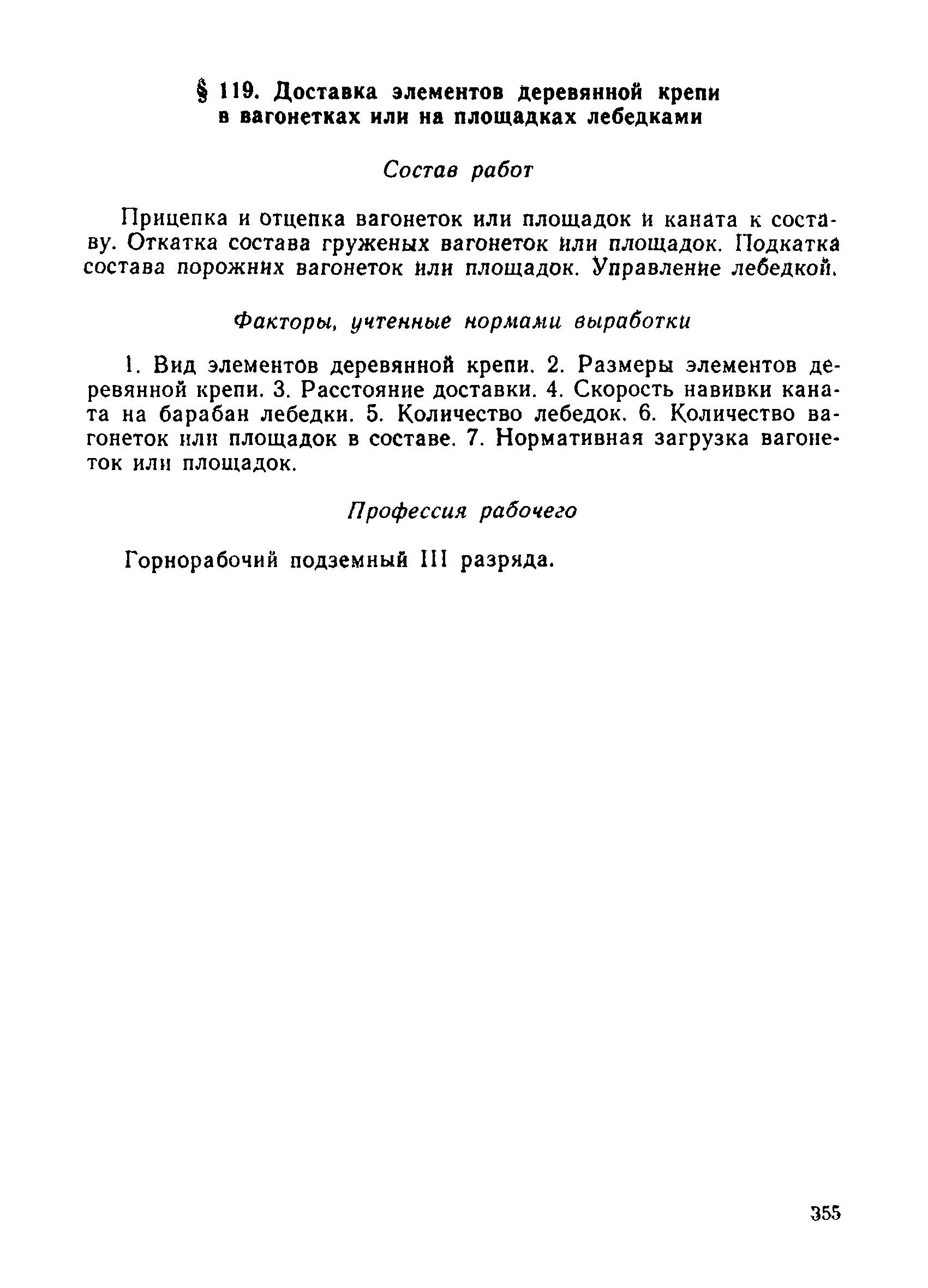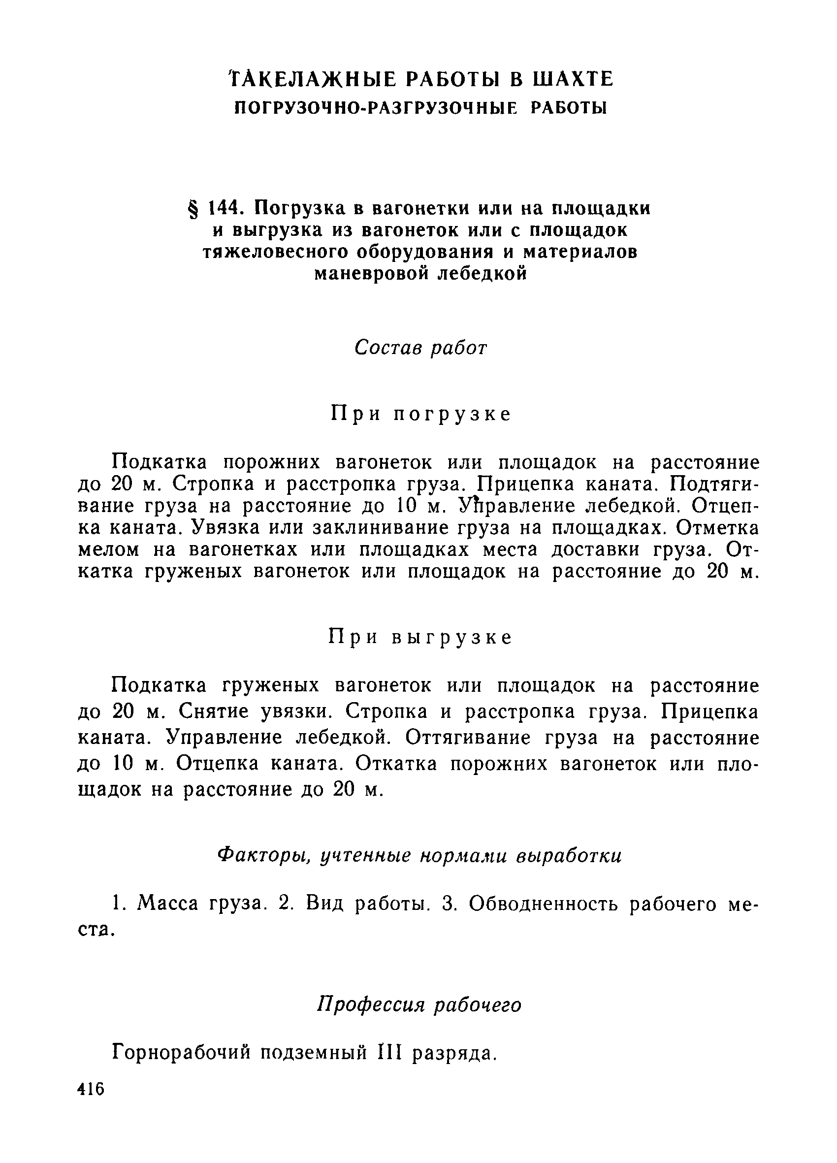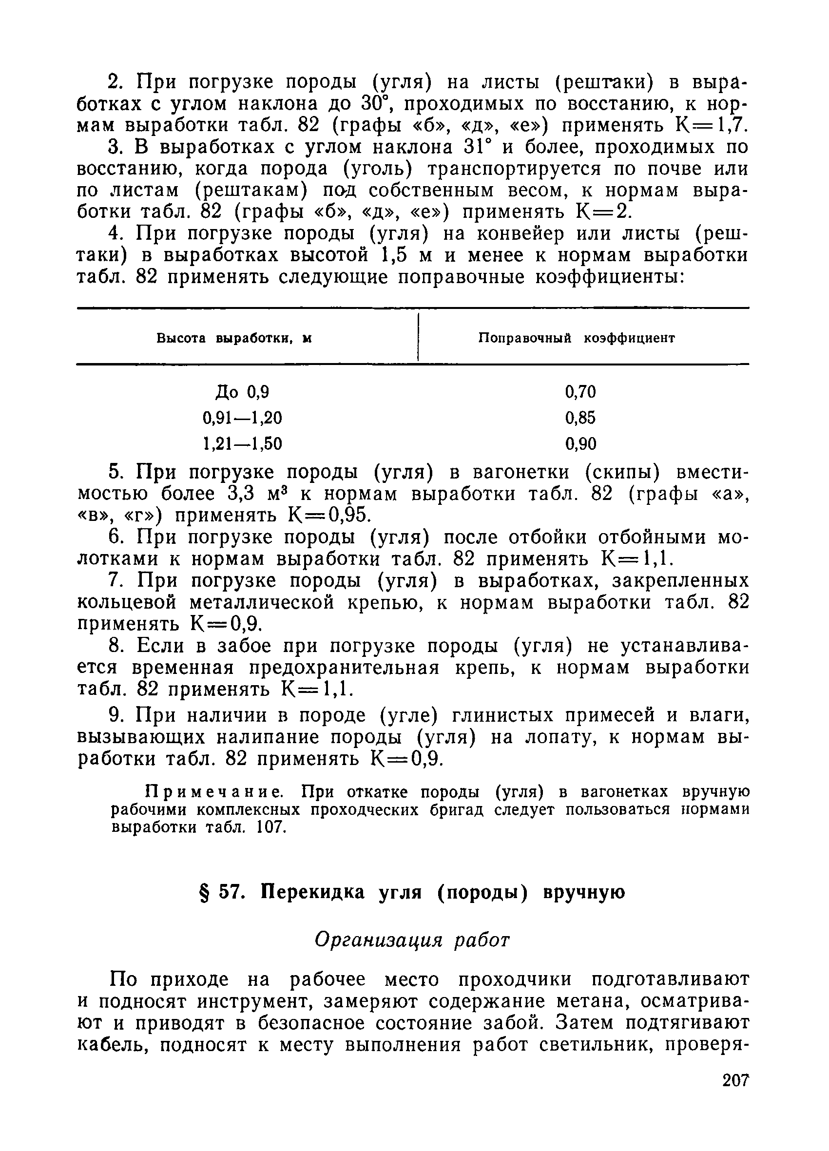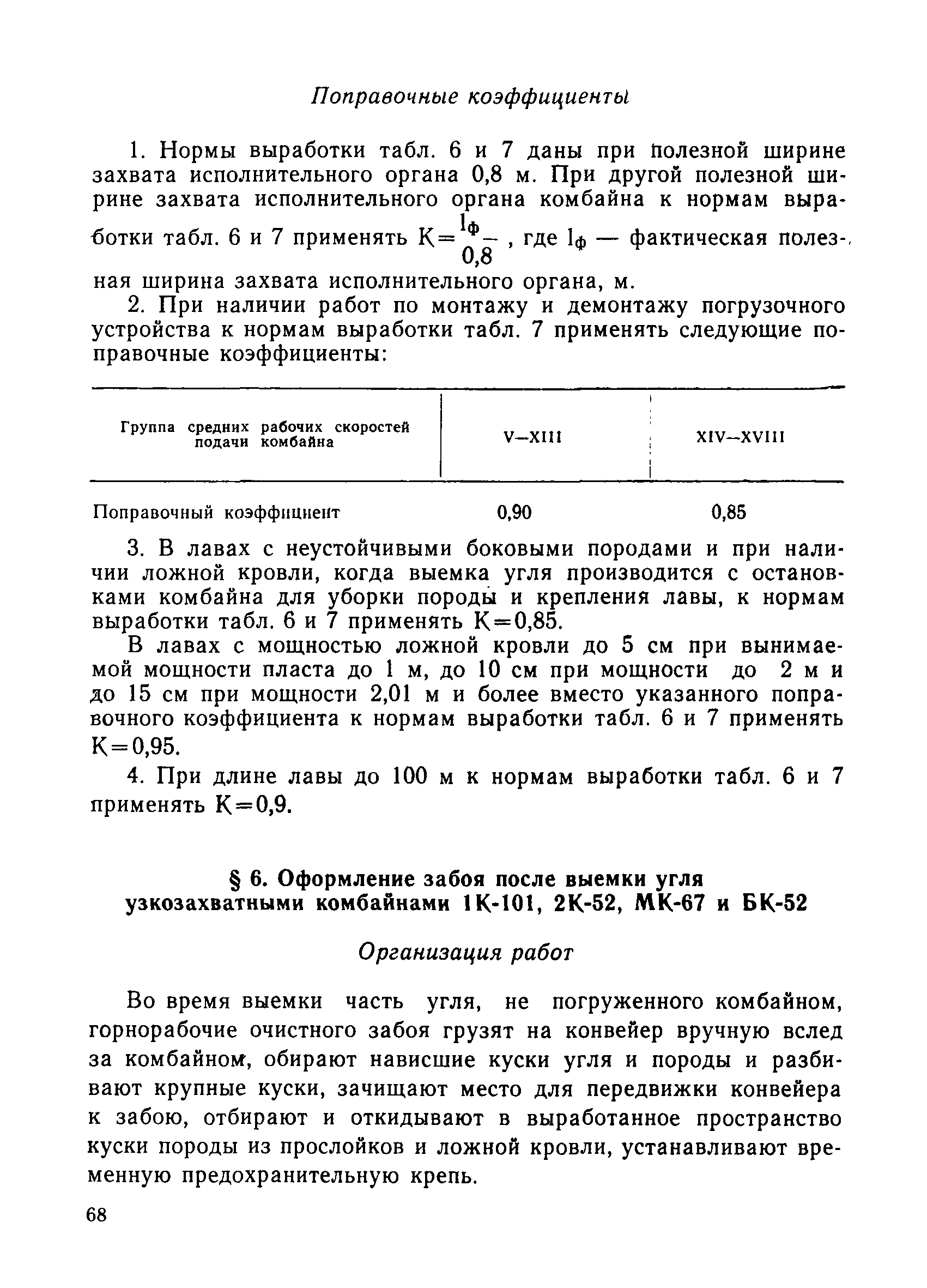 Единые нормы выработки (времени) для шахт производственного объединения "Приморскуголь"| Статус: | справочные материалы, мп, тпр | | Название рус.: | Единые нормы выработки (времени) для шахт производственного объединения "Приморскуголь" | | Дата добавления в базу: | 01.01.2018 | | Дата актуализации: | 01.01.2021 | | Область применения: | Единые нормы выработки (времени) обязательны для применения на всех действующих шахтах производственного объединения "Приморскуголь" | | Оглавление: | Общая часть Техническая часть Нормативная часть Раздел I. Очистные работы § 1. Выемка угля механизированными комплексами типа КМ-81 § 2. Выемка угля механизированными комплексами типов ОМКТ, ОКП, МК § 3. Выемка угля узкозахватными комбайнами типов КШ и ГШ-68 § 4. Оформление забоя после выемки угля узкозахватными комбайнами типов КШ и ГШ-68 § 5. Выемка угля узкозахватными комбайнами 1К-101, 2К-52, МК-67, БК-52 § 6. Оформление забоя после выемки угля узкозахватными комбайнами 1K-101, 2К-52, МК-67 и БК-52 § 7. Выемка угля комбайнами типов УКР, «Темп», КТ, А-70 в лавах на пластах наклонного и крутого падения § 8. Спуск (перегон) комбайнов типов УКР, «Темп», КТ, А-70 в лавах на пластах наклонного и крутого падения с передвижкой крана-балки § 9. Передвижка предохранительной лебедки 1ЛГКН § 10. Оформление забоя после выемки угля комбайнами типов УКР, «Темп», КТ, А-70 в лавах на пластах наклонного падения § 11. Выемка угля в лавах комбайном «Урал-2М» и подготовка его к выемке следующей полосы угля § 12. Оформление забоя после выемки угля комбайном «Урал-2М» § 13. Передвижка гидрофицированной посадочной крепи «Спутник» § 14. Выемка угля в лавах, оборудованных комбайнами К-56М A. Выемка угля Б. Разворот комбайна на пластах пологого падения B. Перегон комбайна § 15. Выемка угля проходческими комбайнами в очистных забоях на пластах пологого падения § 16. Навалоотбойка, навалка угля § 17. Бурение шпуров по углю ручными электросверлами (пневмосверлами) в лавах и камерах § 18. Уборка угля в очистных забоях с помощью скреперной установки § 19. Передвижка скреперной установки § 20. Выемка угля отбойными молотками § 21. Выемка угля с применением ВМ в очистных забоях на пластах крутого падения § 22. Крепление очистных забоев на пластах пологого и наклонного падения металлическими (клиновыми и гидравлическими) стойками § 23. Крепление очистных забоев деревянной крепью § 24. Возведение за комбайном временной деревянной крепи, предусмотренной паспортом крепления § 25. Навеска и снятие металлических шарнирных верхняков § 26. Затяжка кровли, почвы и забоя при креплении § 27. Передвижка специальной крепи типа ОКС на сопряжениях лав со штреками § 28. Установка рам на сопряжениях лав с прилегающими выработками § 29. Выбивка и извлечение металлических (клиновых и гидравлических) стоек в лавах на пластах пологого и наклонного падения при посадке кровли на металлическую органную крепь § 30. Возведение деревянной органной крепи § 31. Кладка и переноска деревянных костров § 32. Установка распорной крепи в очистных забоях § 33. Посадка кровли при помощи лебедки § 34. Бурение шпуров в стойках при посадке кровли с помощью малогабаритных патронов § 35. Передвижка перегружателей гидродомкратом при помощи упорной стойки § 36. Переноска рештаков (листов) в лавах на пластах пологого и наклонного падения § 37. Переноска деревянных рештаков (откосов) в лавах на пластах круто