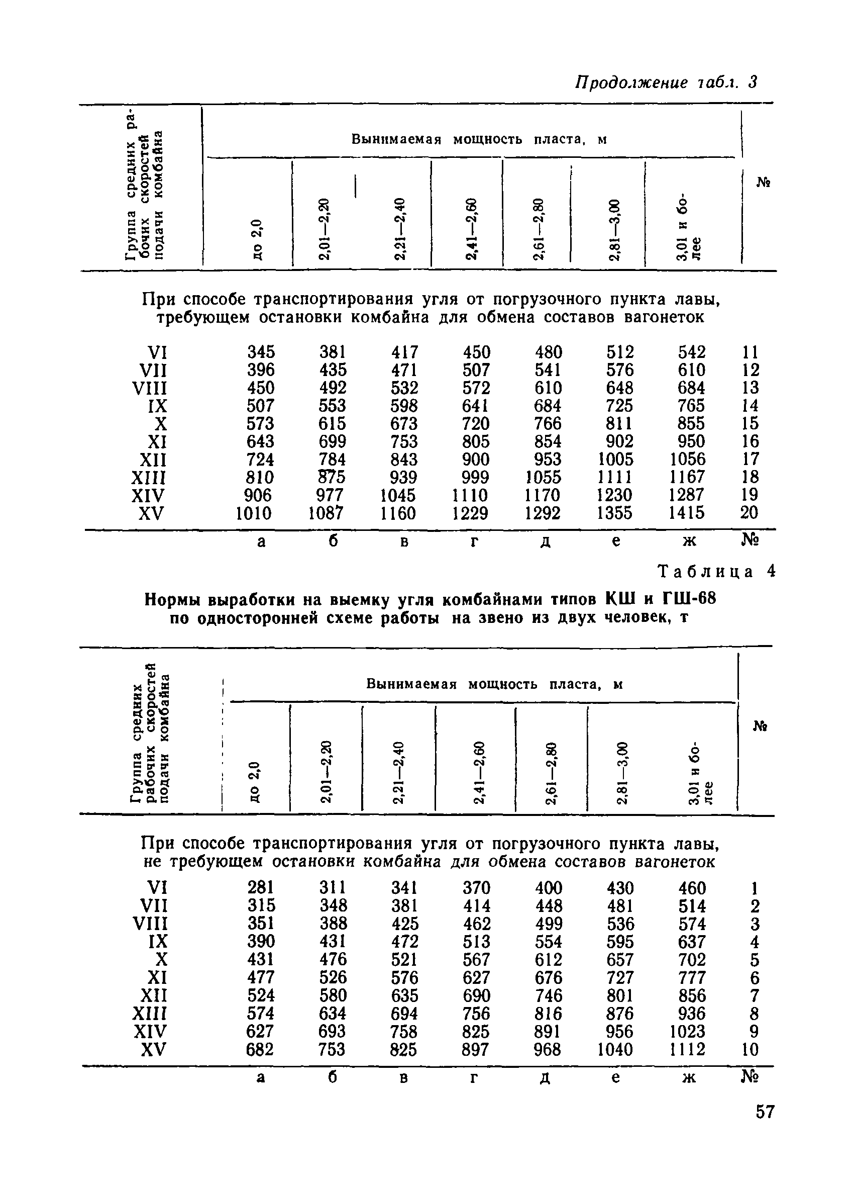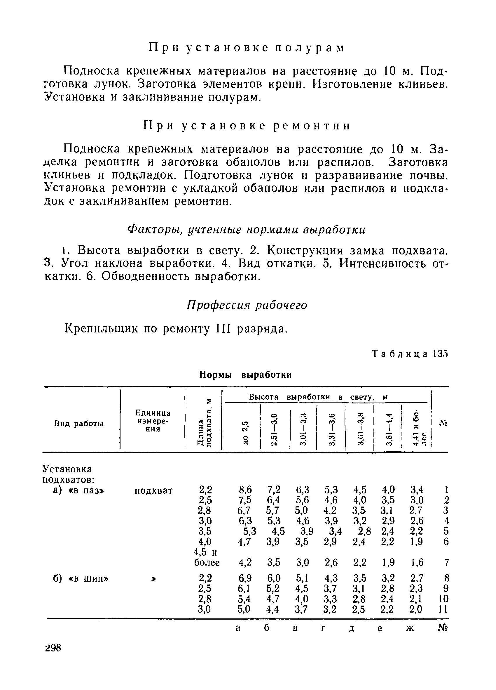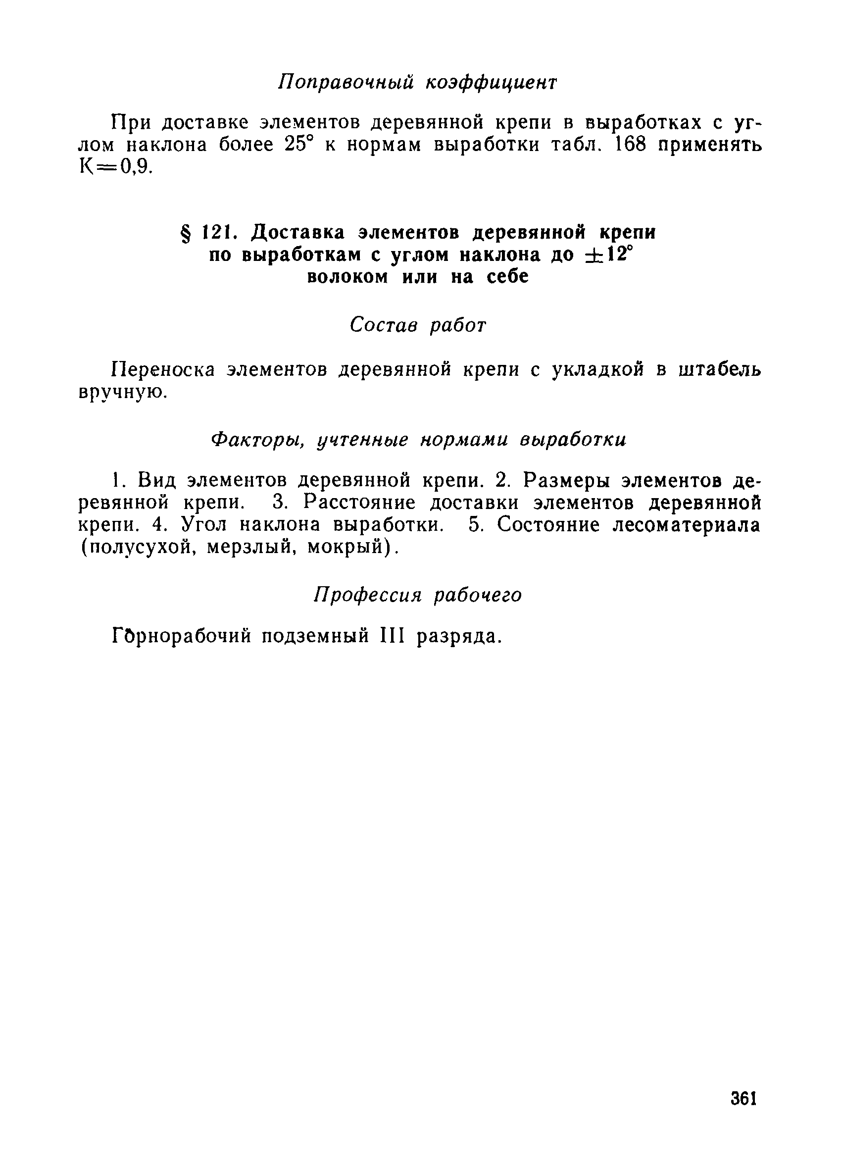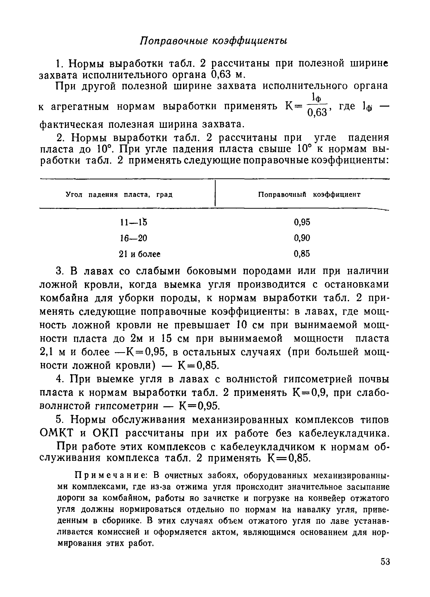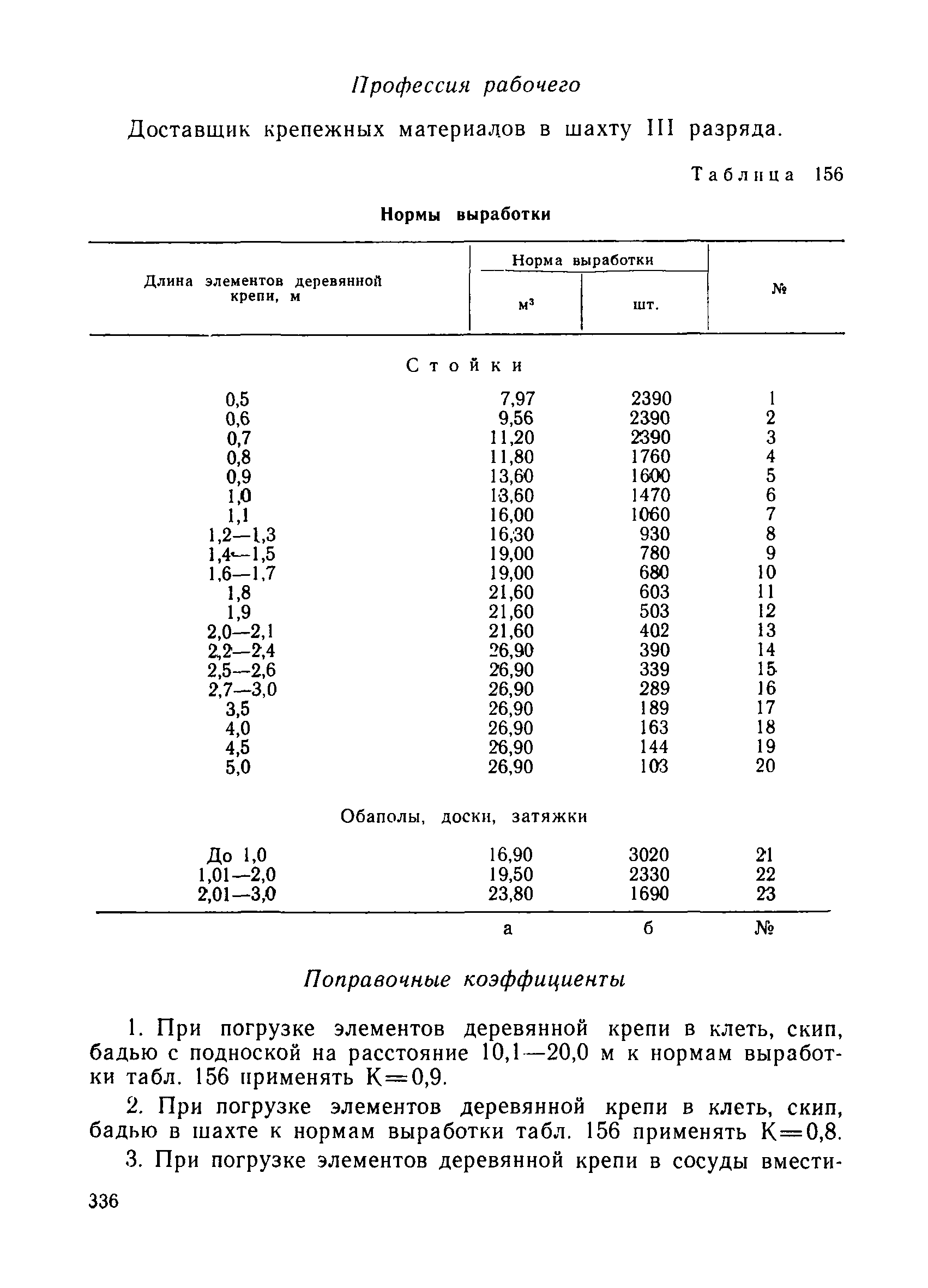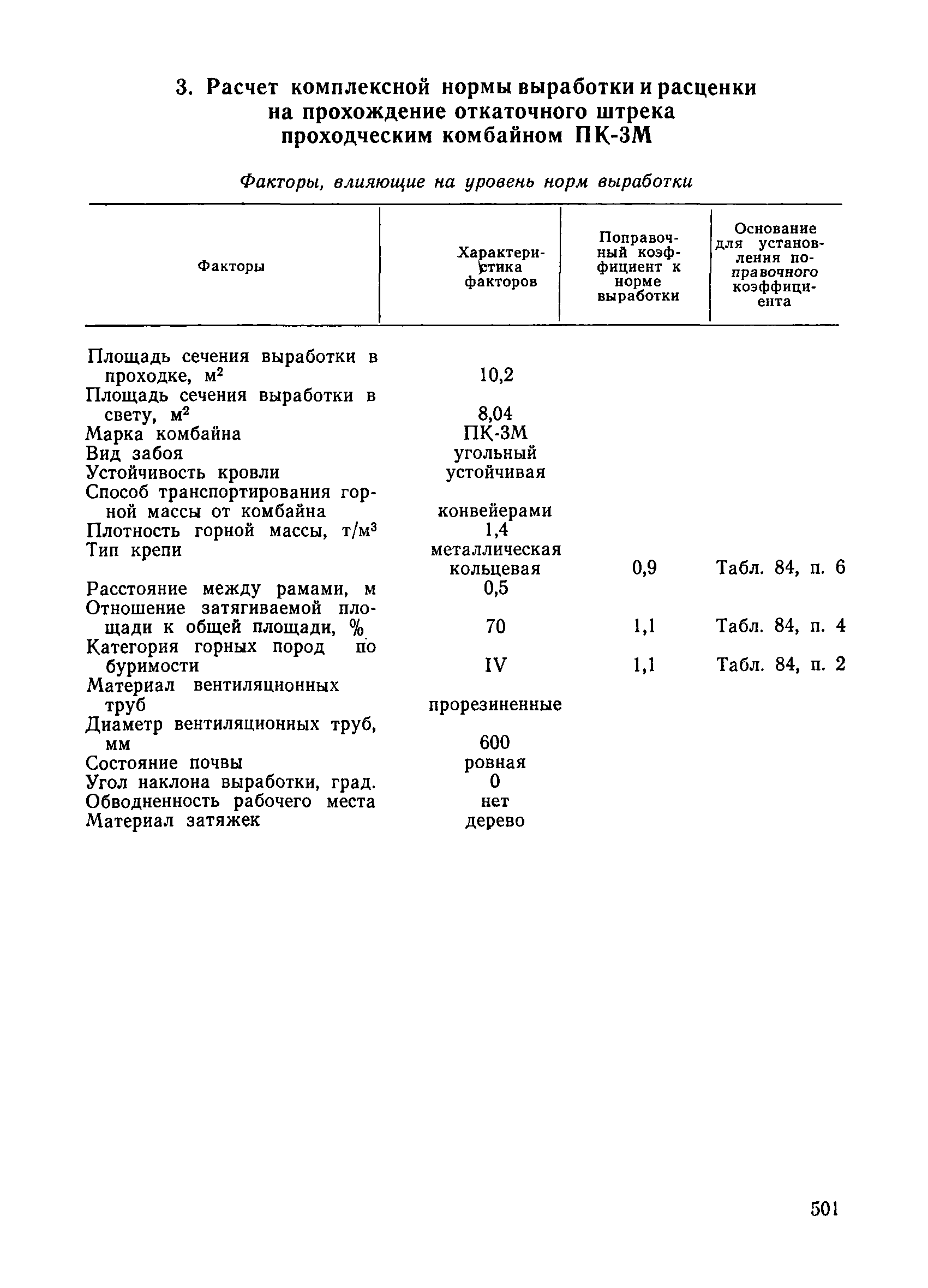 Единые нормы выработки (времени) для шахт производственного объединения "Приморскуголь"| Статус: | справочные материалы, мп, тпр | | Название рус.: | Единые нормы выработки (времени) для шахт производственного объединения "Приморскуголь" | | Дата добавления в базу: | 01.01.2018 | | Дата актуализации: | 01.01.2021 | | Область применения: | Единые нормы выработки (времени) обязательны для применения на всех действующих шахтах производственного объединения "Приморскуголь" | | Оглавление: | Общая часть Техническая часть Нормативная часть Раздел I. Очистные работы § 1. Выемка угля механизированными комплексами типа КМ-81 § 2. Выемка угля механизированными комплексами типов ОМКТ, ОКП, МК § 3. Выемка угля узкозахватными комбайнами типов КШ и ГШ-68 § 4. Оформление забоя после выемки угля узкозахватными комбайнами типов КШ и ГШ-68 § 5. Выемка угля узкозахватными комбайнами 1К-101, 2К-52, МК-67, БК-52 § 6. Оформление забоя после выемки угля узкозахватными комбайнами 1K-101, 2К-52, МК-67 и БК-52 § 7. Выемка угля комбайнами типов УКР, «Темп», КТ, А-70 в лавах на пластах наклонного и крутого падения § 8. Спуск (перегон) комбайнов типов УКР, «Темп», КТ, А-70 в лавах на пластах наклонного и крутого падения с передвижкой крана-балки § 9. Передвижка предохранительной лебедки 1ЛГКН § 10. Оформление забоя после выемки угля комбайнами типов УКР, «Темп», КТ, А-70 в лавах на пластах наклонного падения § 11. Выемка угля в лавах комбайном «Урал-2М» и подготовка его к выемке следующей полосы угля § 12. Оформление забоя после выемки угля комбайном «Урал-2М» § 13. Передвижка гидрофицированной посадочной крепи «Спутник» § 14. Выемка угля в лавах, оборудованных комбайнами К-56М A. Выемка угля Б. Разворот комбайна на пластах пологого падения B. Перегон комбайна § 15. Выемка угля проходческими комбайнами в очистных забоях на пластах пологого падения § 16. Навалоотбойка, навалка угля § 17. Бурение шпуров по углю ручными электросверлами (пневмосверлами) в лавах и камерах § 18. Уборка угля в очистных забоях с помощью скреперной установки § 19. Передвижка скреперной установки § 20. Выемка угля отбойными молотками § 21. Выемка угля с применением ВМ в очистных забоях на пластах крутого падения § 22. Крепление очистных забоев на пластах пологого и наклонного падения металлическими (клиновыми и гидравлическими) стойками § 23. Крепление очистных забоев деревянной крепью § 24. Возведение за комбайном временной деревянной крепи, предусмотренной паспортом крепления § 25. Навеска и снятие металлических шарнирных верхняков § 26. Затяжка кровли, почвы и забоя при креплении § 27. Передвижка специальной крепи типа ОКС на сопряжениях лав со штреками § 28. Установка рам на сопряжениях лав с прилегающими выработками § 29. Выбивка и извлечение металлических (клиновых и гидравлических) стоек в лавах на пластах пологого и наклонного падения при посадке кровли на металлическую органную крепь § 30. Возведение деревянной органной крепи § 31. Кладка и переноска деревянных костров § 32. Установка распорной крепи в очистных забоях § 33. Посадка кровли при помощи лебедки § 34. Бурение шпуров в стойках при посадке кровли с помощью малогабаритных патронов § 35. Передвижка перегружателей гидродомкратом при помощи упорной стойки § 36. Переноска рештаков (листов) в лавах на пластах пологого и наклонного падения § 37. Переноска деревянных рештаков (откосов) в лавах на пластах круто