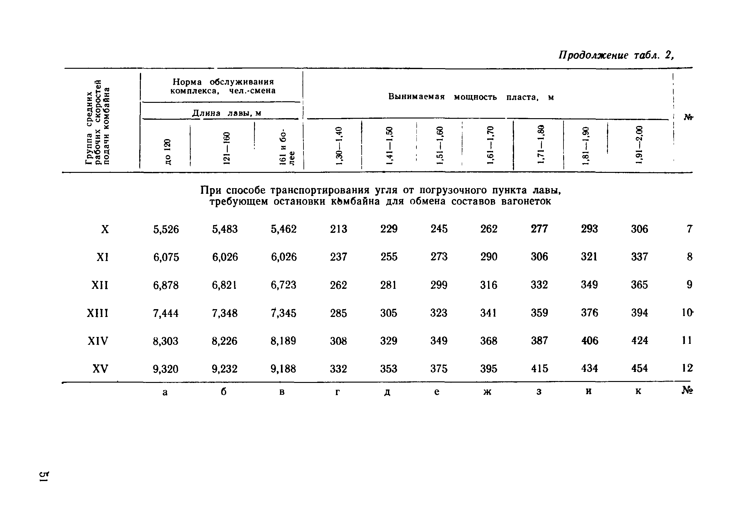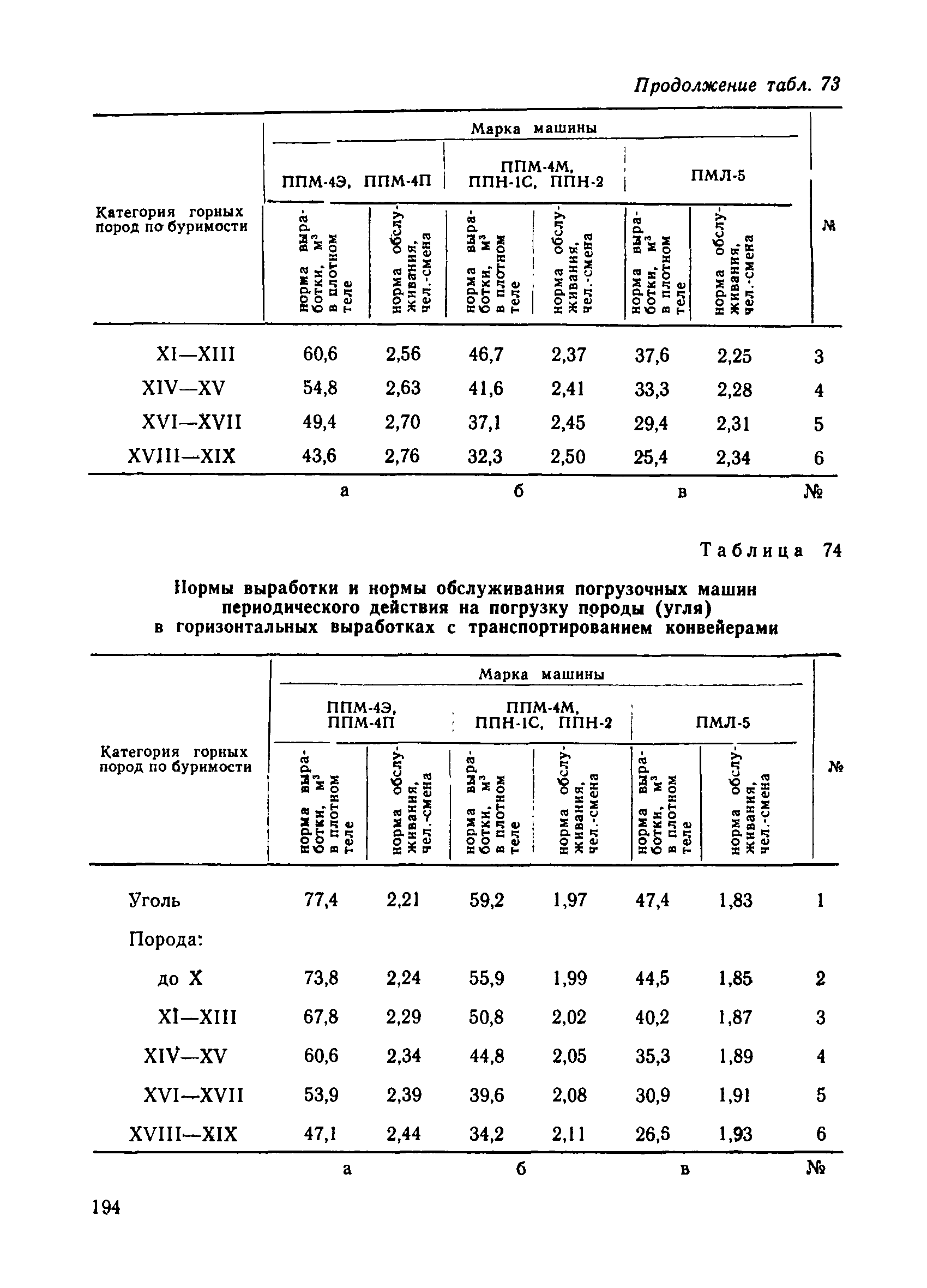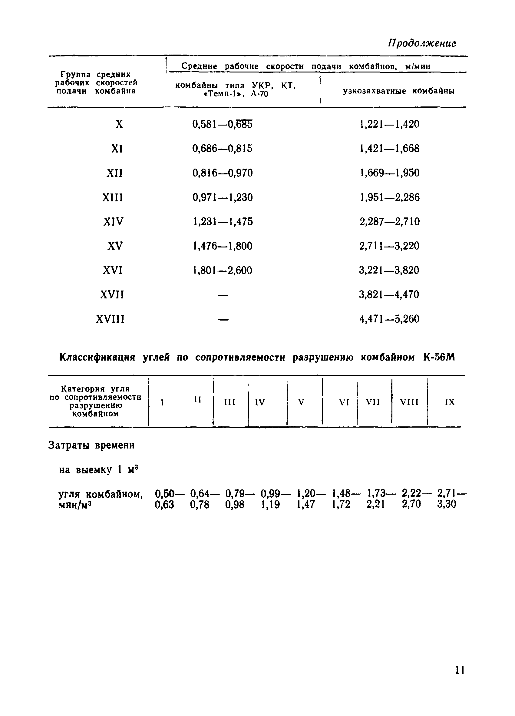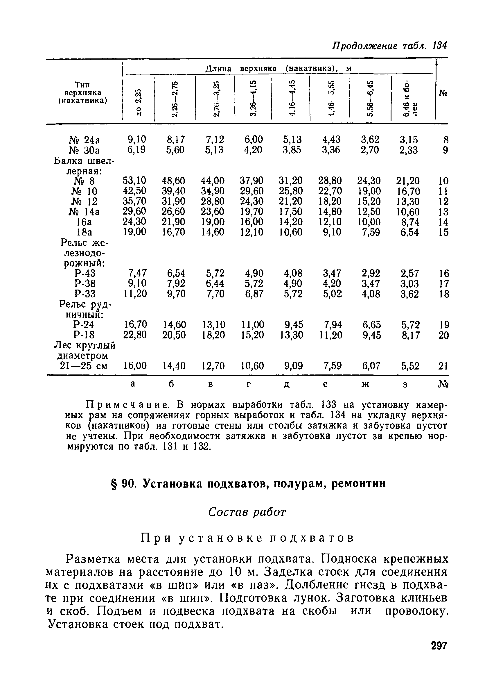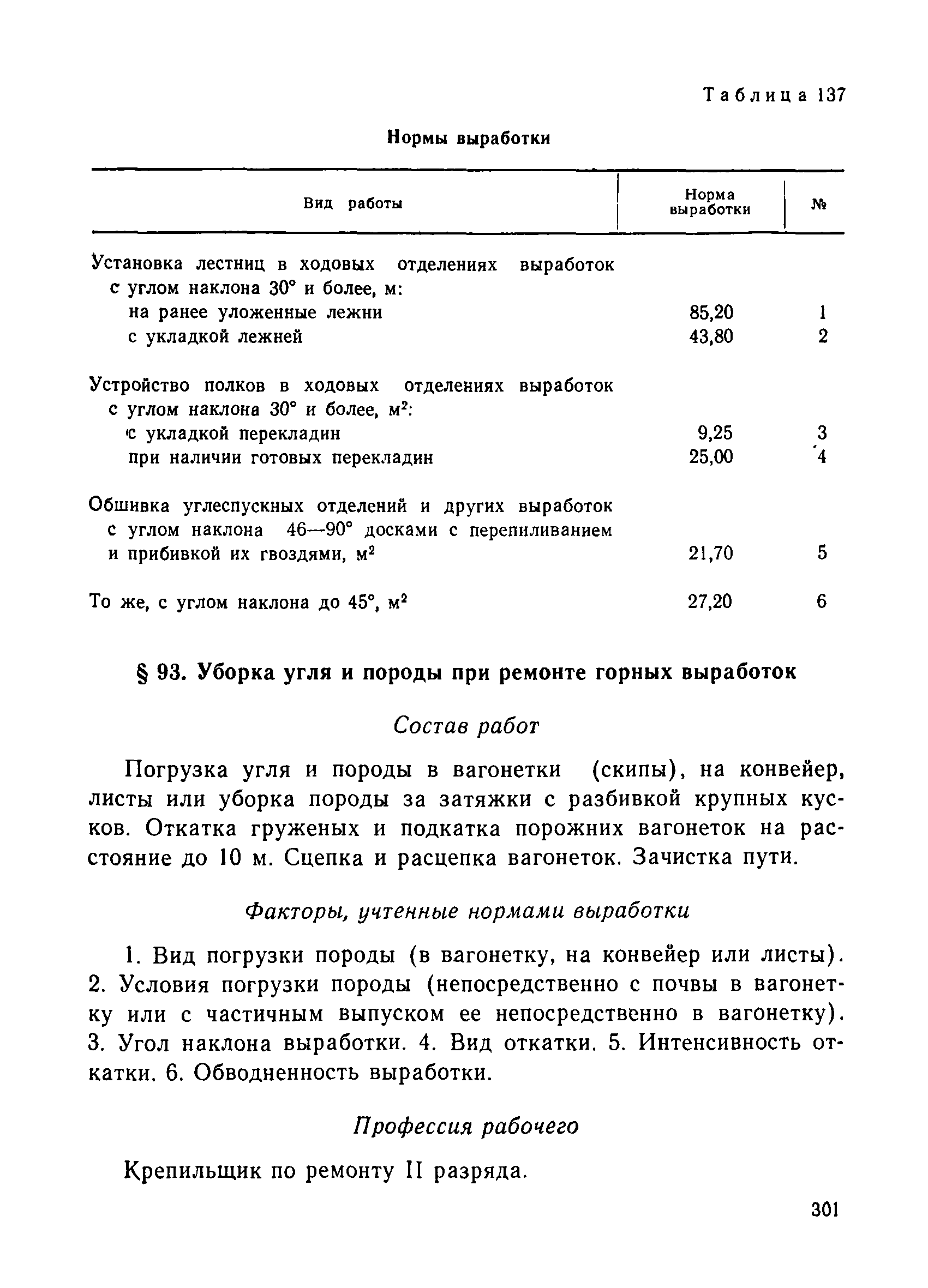 Единые нормы выработки (времени) для шахт производственного объединения "Приморскуголь"| Статус: | справочные материалы, мп, тпр | | Название рус.: | Единые нормы выработки (времени) для шахт производственного объединения "Приморскуголь" | | Дата добавления в базу: | 01.01.2018 | | Дата актуализации: | 01.01.2021 | | Область применения: | Единые нормы выработки (времени) обязательны для применения на всех действующих шахтах производственного объединения "Приморскуголь" | | Оглавление: | Общая часть Техническая часть Нормативная часть Раздел I. Очистные работы § 1. Выемка угля механизированными комплексами типа КМ-81 § 2. Выемка угля механизированными комплексами типов ОМКТ, ОКП, МК § 3. Выемка угля узкозахватными комбайнами типов КШ и ГШ-68 § 4. Оформление забоя после выемки угля узкозахватными комбайнами типов КШ и ГШ-68 § 5. Выемка угля узкозахватными комбайнами 1К-101, 2К-52, МК-67, БК-52 § 6. Оформление забоя после выемки угля узкозахватными комбайнами 1K-101, 2К-52, МК-67 и БК-52 § 7. Выемка угля комбайнами типов УКР, «Темп», КТ, А-70 в лавах на пластах наклонного и крутого падения § 8. Спуск (перегон) комбайнов типов УКР, «Темп», КТ, А-70 в лавах на пластах наклонного и крутого падения с передвижкой крана-балки § 9. Передвижка предохранительной лебедки 1ЛГКН § 10. Оформление забоя после выемки угля комбайнами типов УКР, «Темп», КТ, А-70 в лавах на пластах наклонного падения § 11. Выемка угля в лавах комбайном «Урал-2М» и подготовка его к выемке следующей полосы угля § 12. Оформление забоя после выемки угля комбайном «Урал-2М» § 13. Передвижка гидрофицированной посадочной крепи «Спутник» § 14. Выемка угля в лавах, оборудованных комбайнами К-56М A. Выемка угля Б. Разворот комбайна на пластах пологого падения B. Перегон комбайна § 15. Выемка угля проходческими комбайнами в очистных забоях на пластах пологого падения § 16. Навалоотбойка, навалка угля § 17. Бурение шпуров по углю ручными электросверлами (пневмосверлами) в лавах и камерах § 18. Уборка угля в очистных забоях с помощью скреперной установки § 19. Передвижка скреперной установки § 20. Выемка угля отбойными молотками § 21. Выемка угля с применением ВМ в очистных забоях на пластах крутого падения § 22. Крепление очистных забоев на пластах пологого и наклонного падения металлическими (клиновыми и гидравлическими) стойками § 23. Крепление очистных забоев деревянной крепью § 24. Возведение за комбайном временной деревянной крепи, предусмотренной паспортом крепления § 25. Навеска и снятие металлических шарнирных верхняков § 26. Затяжка кровли, почвы и забоя при креплении § 27. Передвижка специальной крепи типа ОКС на сопряжениях лав со штреками § 28. Установка рам на сопряжениях лав с прилегающими выработками § 29. Выбивка и извлечение металлических (клиновых и гидравлических) стоек в лавах на пластах пологого и наклонного падения при посадке кровли на металлическую органную крепь § 30. Возведение деревянной органной крепи § 31. Кладка и переноска деревянных костров § 32. Установка распорной крепи в очистных забоях § 33. Посадка кровли при помощи лебедки § 34. Бурение шпуров в стойках при посадке кровли с помощью малогабаритных патронов § 35. Передвижка перегружателей гидродомкратом при помощи упорной стойки § 36. Переноска рештаков (листов) в лавах на пластах пологого и наклонного падения § 37. Переноска деревянных рештаков (откосов) в лавах на пластах круто