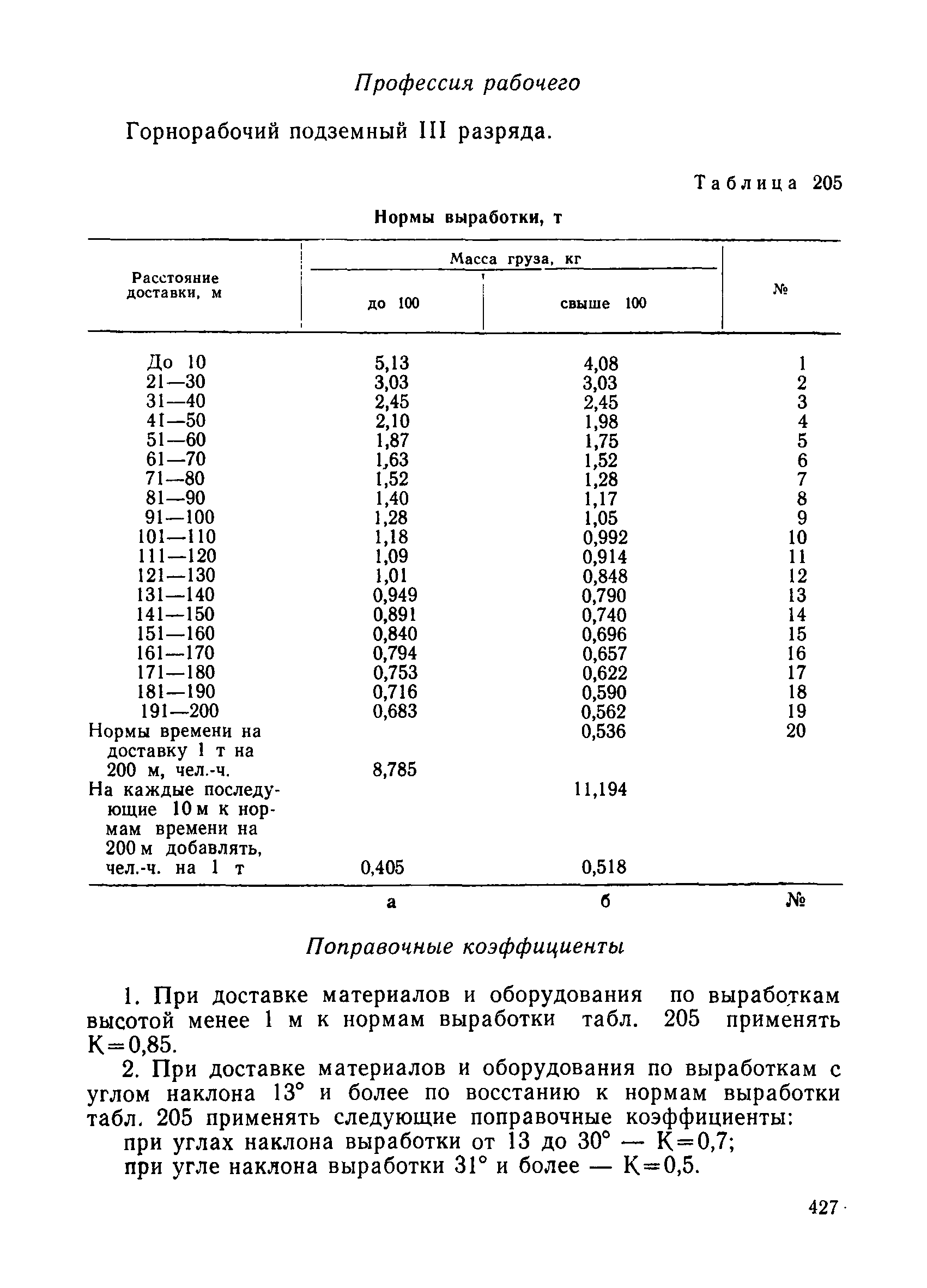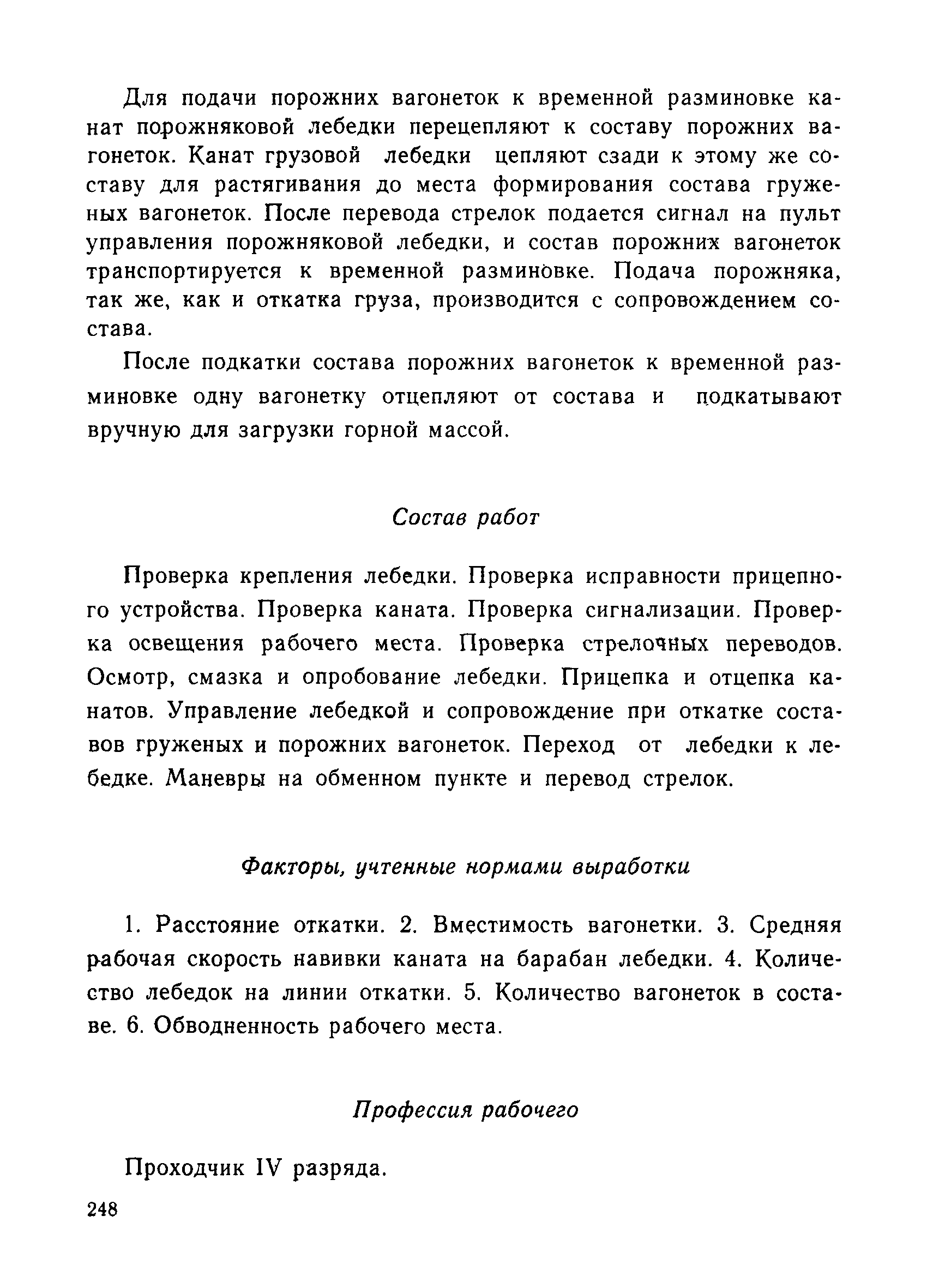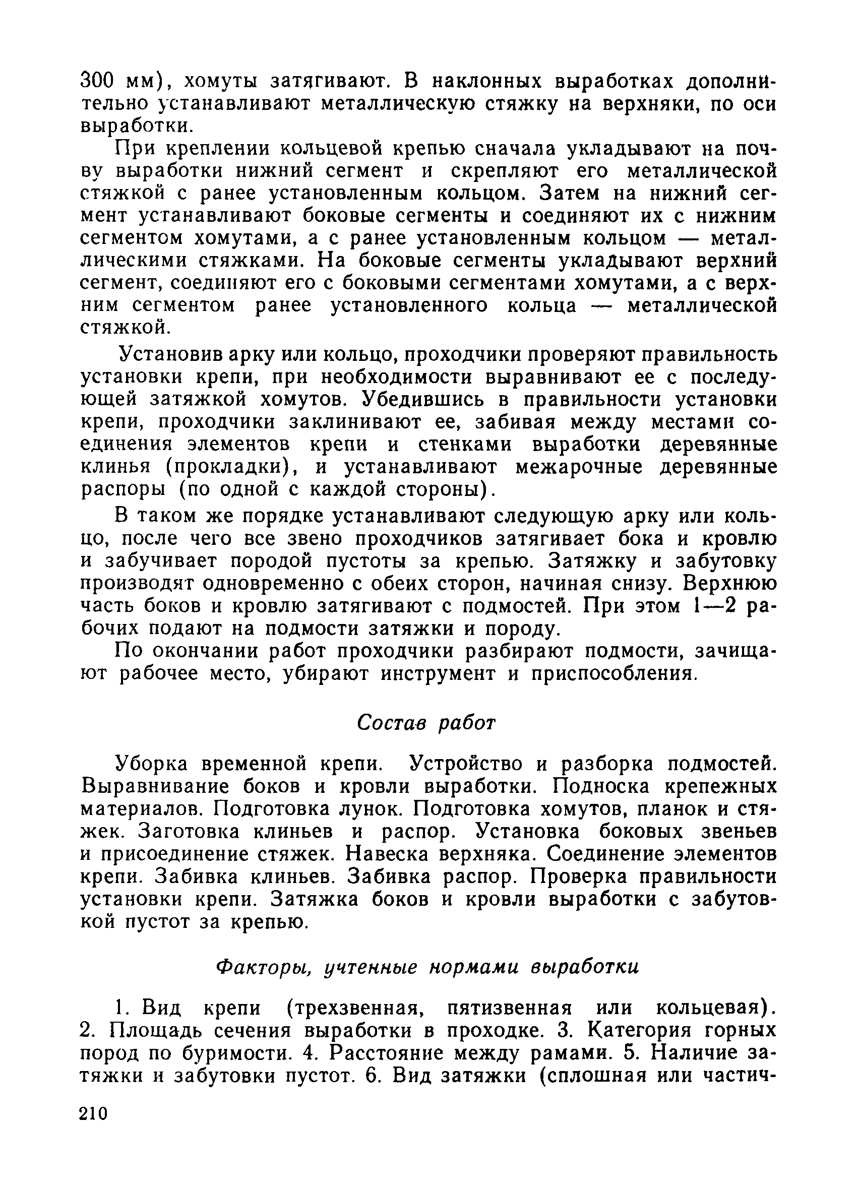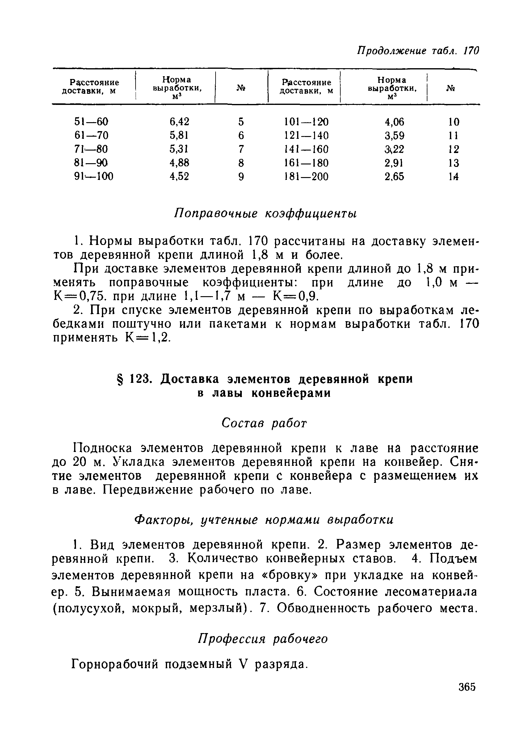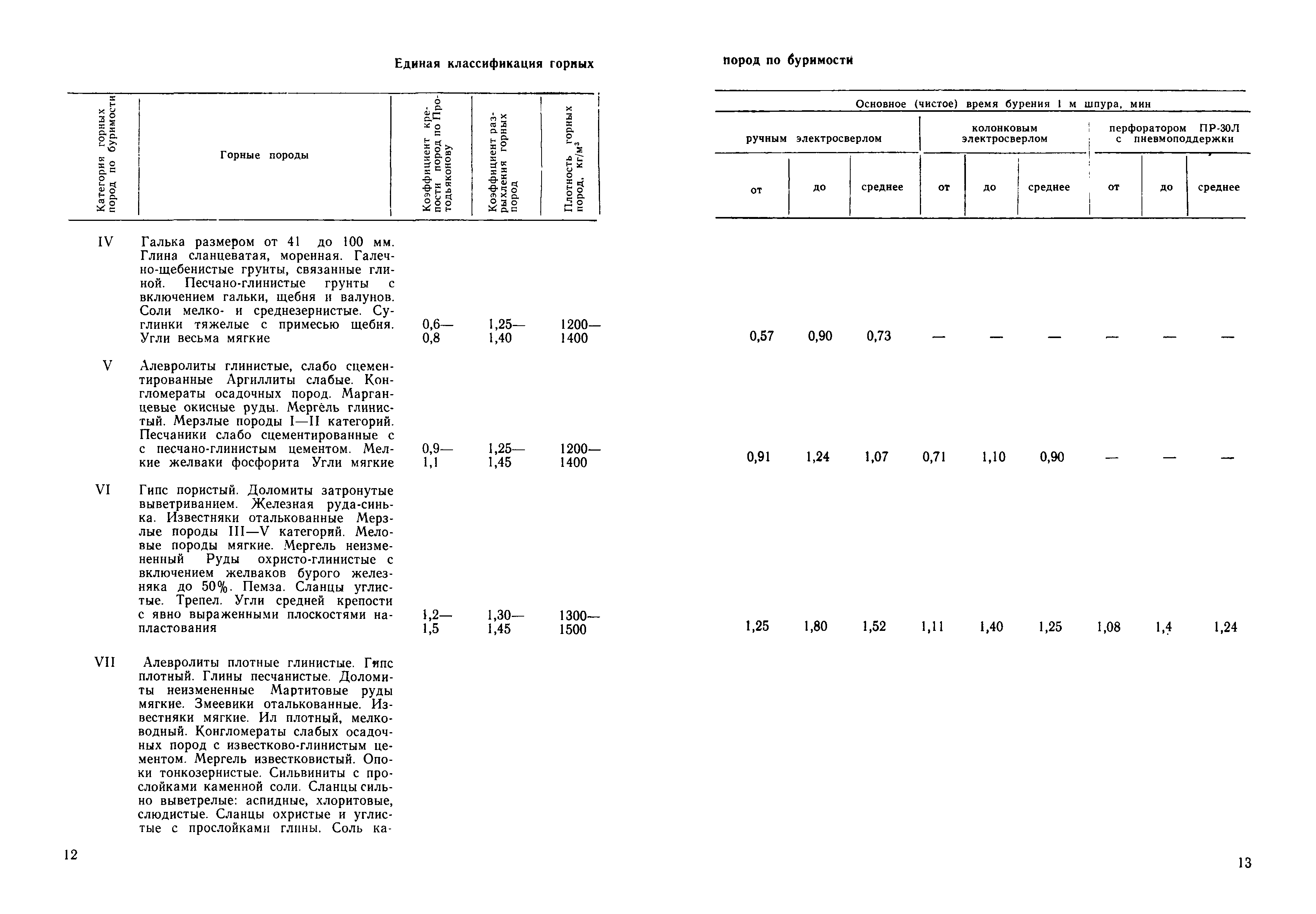 Единые нормы выработки (времени) для шахт производственного объединения "Приморскуголь"| Статус: | справочные материалы, мп, тпр | | Название рус.: | Единые нормы выработки (времени) для шахт производственного объединения "Приморскуголь" | | Дата добавления в базу: | 01.01.2018 | | Дата актуализации: | 01.01.2021 | | Область применения: | Единые нормы выработки (времени) обязательны для применения на всех действующих шахтах производственного объединения "Приморскуголь" | | Оглавление: | Общая часть Техническая часть Нормативная часть Раздел I. Очистные работы § 1. Выемка угля механизированными комплексами типа КМ-81 § 2. Выемка угля механизированными комплексами типов ОМКТ, ОКП, МК § 3. Выемка угля узкозахватными комбайнами типов КШ и ГШ-68 § 4. Оформление забоя после выемки угля узкозахватными комбайнами типов КШ и ГШ-68 § 5. Выемка угля узкозахватными комбайнами 1К-101, 2К-52, МК-67, БК-52 § 6. Оформление забоя после выемки угля узкозахватными комбайнами 1K-101, 2К-52, МК-67 и БК-52 § 7. Выемка угля комбайнами типов УКР, «Темп», КТ, А-70 в лавах на пластах наклонного и крутого падения § 8. Спуск (перегон) комбайнов типов УКР, «Темп», КТ, А-70 в лавах на пластах наклонного и крутого падения с передвижкой крана-балки § 9. Передвижка предохранительной лебедки 1ЛГКН § 10. Оформление забоя после выемки угля комбайнами типов УКР, «Темп», КТ, А-70 в лавах на пластах наклонного падения § 11. Выемка угля в лавах комбайном «Урал-2М» и подготовка его к выемке следующей полосы угля § 12. Оформление забоя после выемки угля комбайном «Урал-2М» § 13. Передвижка гидрофицированной посадочной крепи «Спутник» § 14. Выемка угля в лавах, оборудованных комбайнами К-56М A. Выемка угля Б. Разворот комбайна на пластах пологого падения B. Перегон комбайна § 15. Выемка угля проходческими комбайнами в очистных забоях на пластах пологого падения § 16. Навалоотбойка, навалка угля § 17. Бурение шпуров по углю ручными электросверлами (пневмосверлами) в лавах и камерах § 18. Уборка угля в очистных забоях с помощью скреперной установки § 19. Передвижка скреперной установки § 20. Выемка угля отбойными молотками § 21. Выемка угля с применением ВМ в очистных забоях на пластах крутого падения § 22. Крепление очистных забоев на пластах пологого и наклонного падения металлическими (клиновыми и гидравлическими) стойками § 23. Крепление очистных забоев деревянной крепью § 24. Возведение за комбайном временной деревянной крепи, предусмотренной паспортом крепления § 25. Навеска и снятие металлических шарнирных верхняков § 26. Затяжка кровли, почвы и забоя при креплении § 27. Передвижка специальной крепи типа ОКС на сопряжениях лав со штреками § 28. Установка рам на сопряжениях лав с прилегающими выработками § 29. Выбивка и извлечение металлических (клиновых и гидравлических) стоек в лавах на пластах пологого и наклонного падения при посадке кровли на металлическую органную крепь § 30. Возведение деревянной органной крепи § 31. Кладка и переноска деревянных костров § 32. Установка распорной крепи в очистных забоях § 33. Посадка кровли при помощи лебедки § 34. Бурение шпуров в стойках при посадке кровли с помощью малогабаритных патронов § 35. Передвижка перегружателей гидродомкратом при помощи упорной стойки § 36. Переноска рештаков (листов) в лавах на пластах пологого и наклонного падения § 37. Переноска деревянных рештаков (откосов) в лавах на пластах круто
