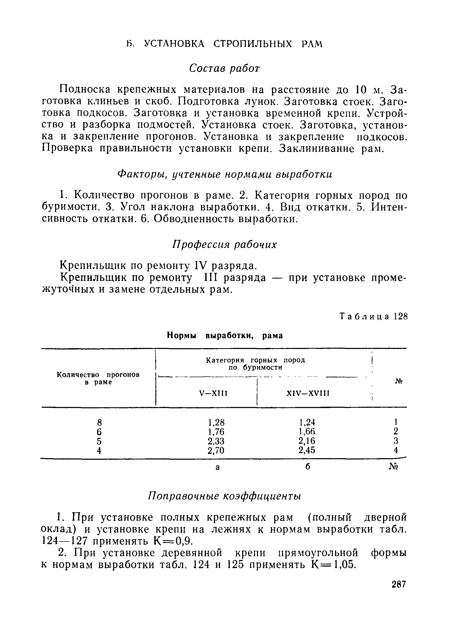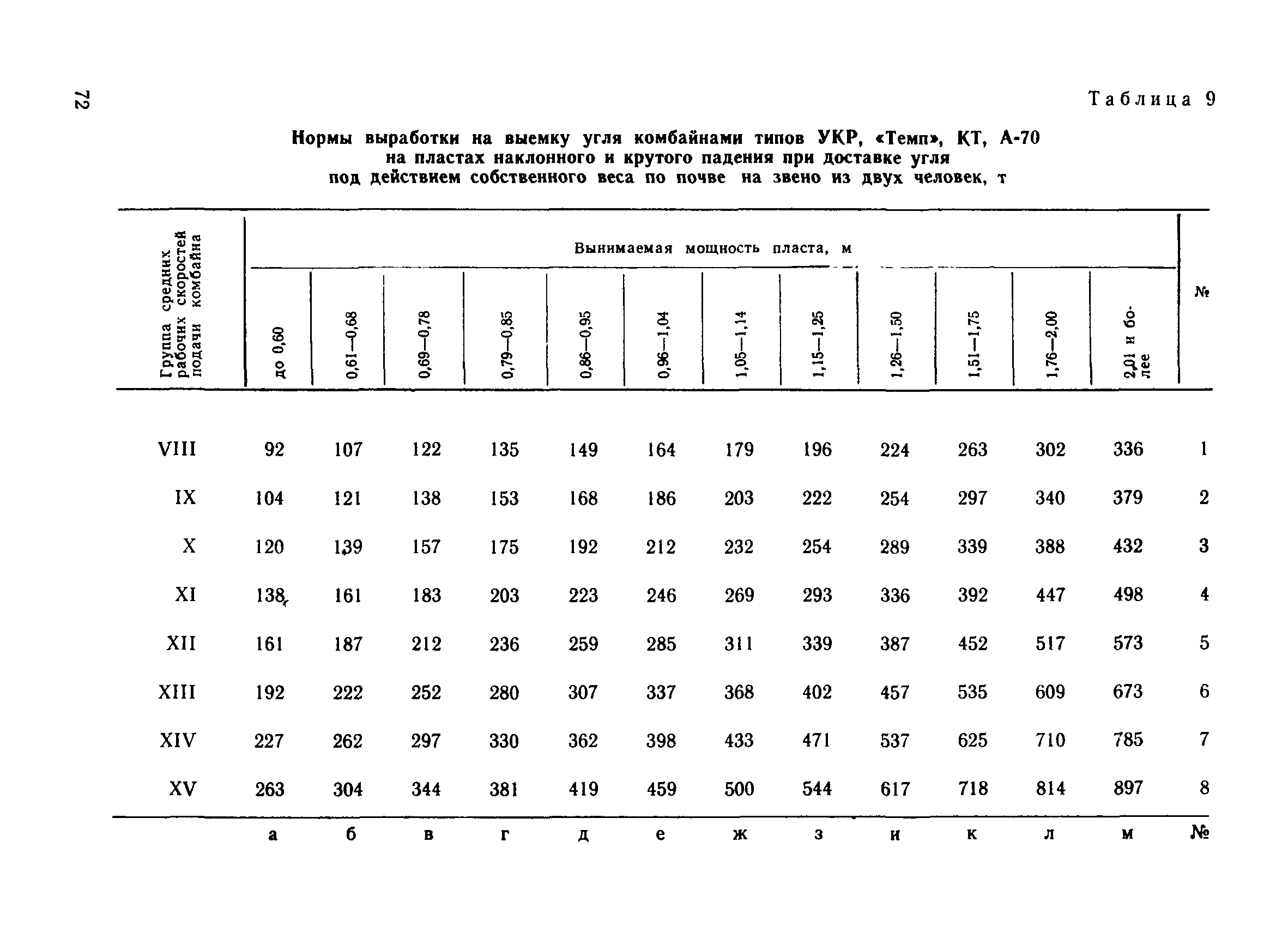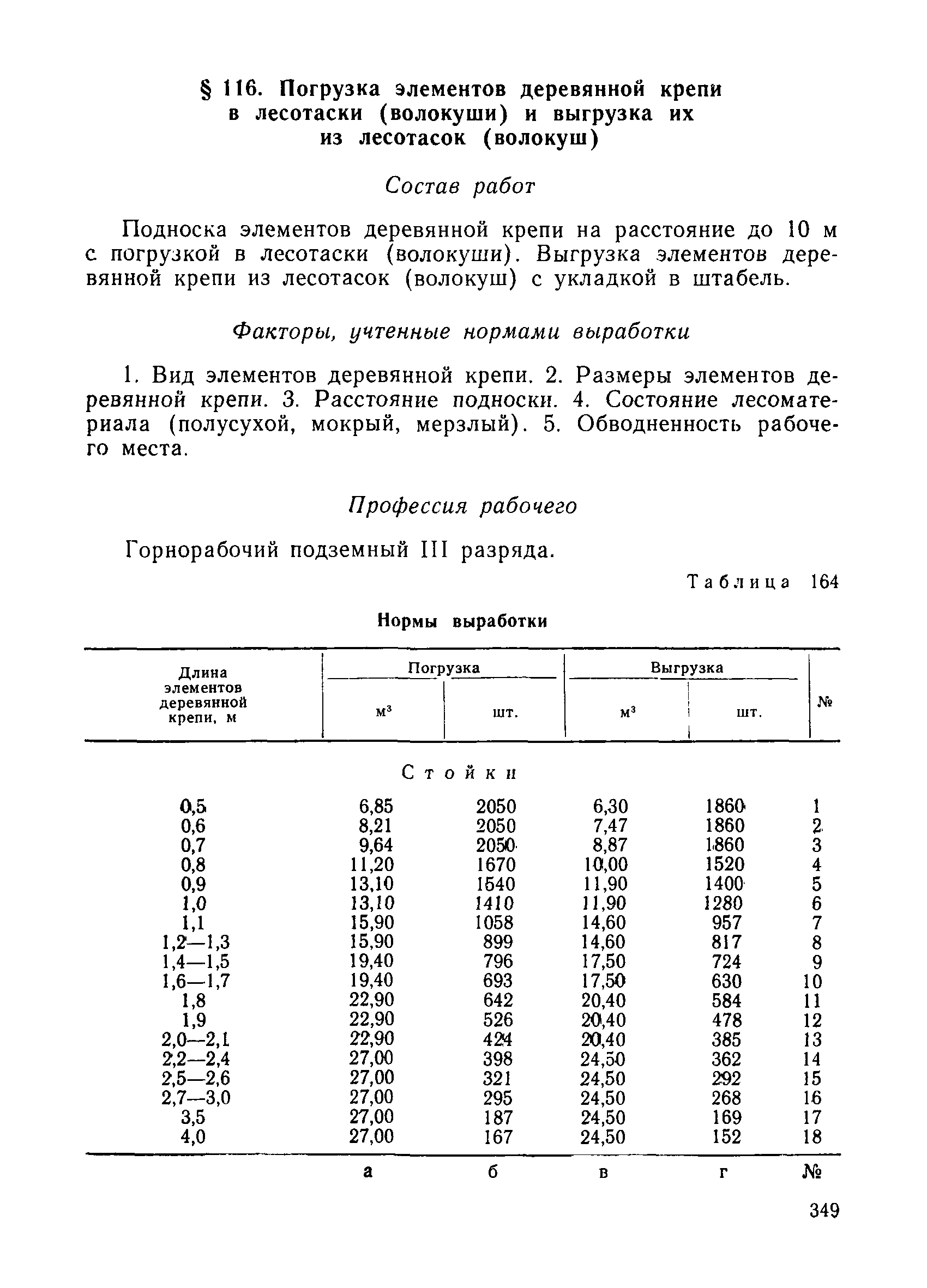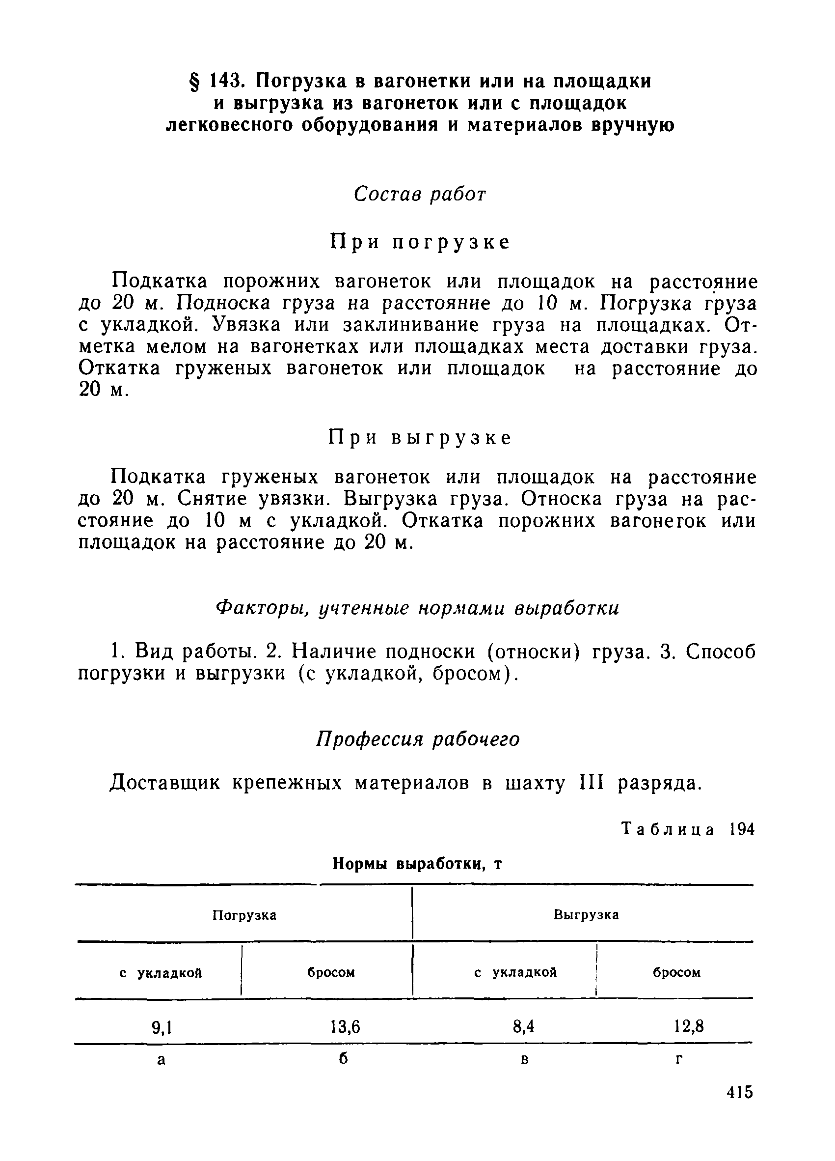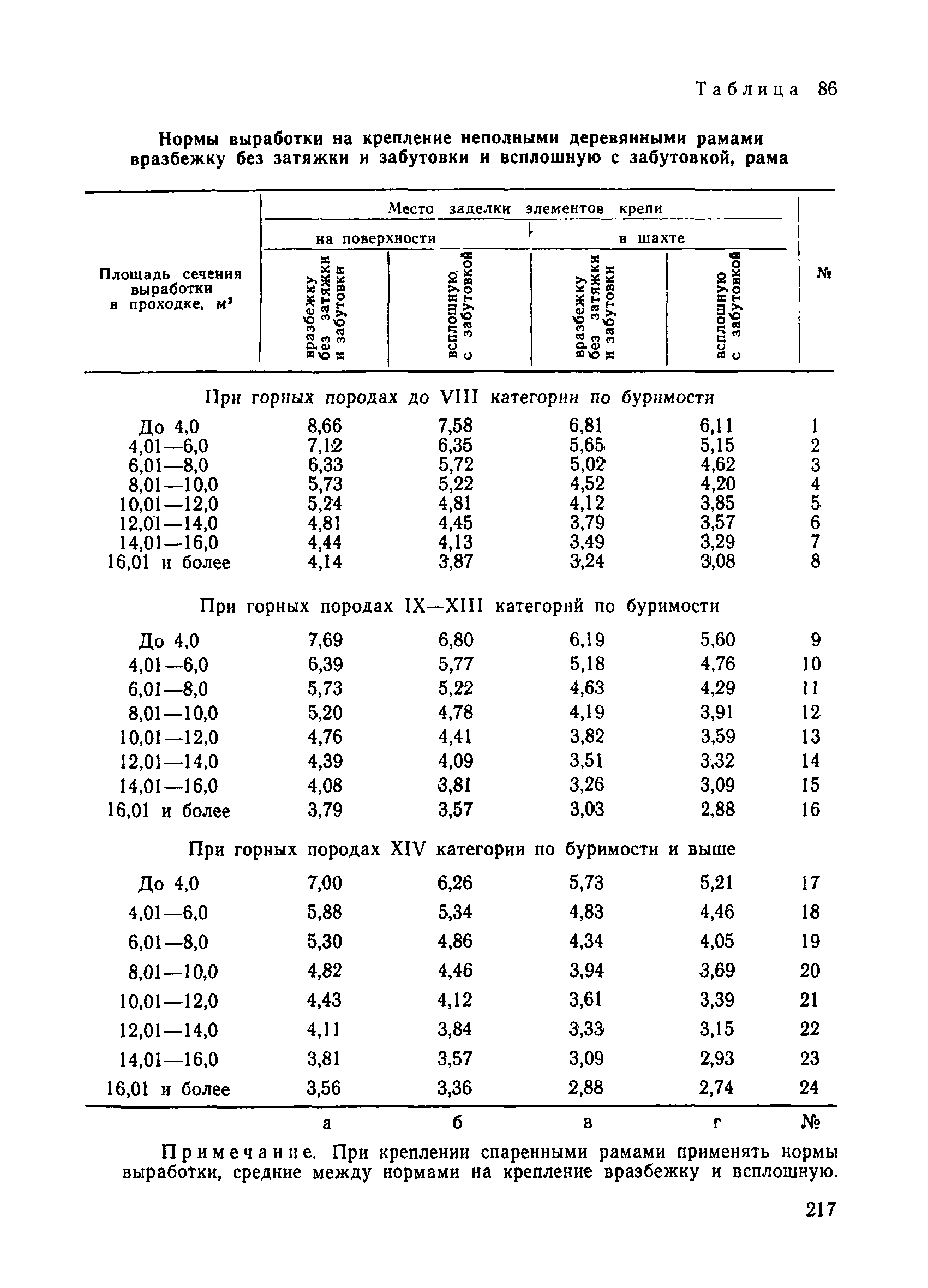 Единые нормы выработки (времени) для шахт производственного объединения "Приморскуголь"| Статус: | справочные материалы, мп, тпр | | Название рус.: | Единые нормы выработки (времени) для шахт производственного объединения "Приморскуголь" | | Дата добавления в базу: | 01.01.2018 | | Дата актуализации: | 01.01.2021 | | Область применения: | Единые нормы выработки (времени) обязательны для применения на всех действующих шахтах производственного объединения "Приморскуголь" | | Оглавление: | Общая часть Техническая часть Нормативная часть Раздел I. Очистные работы § 1. Выемка угля механизированными комплексами типа КМ-81 § 2. Выемка угля механизированными комплексами типов ОМКТ, ОКП, МК § 3. Выемка угля узкозахватными комбайнами типов КШ и ГШ-68 § 4. Оформление забоя после выемки угля узкозахватными комбайнами типов КШ и ГШ-68 § 5. Выемка угля узкозахватными комбайнами 1К-101, 2К-52, МК-67, БК-52 § 6. Оформление забоя после выемки угля узкозахватными комбайнами 1K-101, 2К-52, МК-67 и БК-52 § 7. Выемка угля комбайнами типов УКР, «Темп», КТ, А-70 в лавах на пластах наклонного и крутого падения § 8. Спуск (перегон) комбайнов типов УКР, «Темп», КТ, А-70 в лавах на пластах наклонного и крутого падения с передвижкой крана-балки § 9. Передвижка предохранительной лебедки 1ЛГКН § 10. Оформление забоя после выемки угля комбайнами типов УКР, «Темп», КТ, А-70 в лавах на пластах наклонного падения § 11. Выемка угля в лавах комбайном «Урал-2М» и подготовка его к выемке следующей полосы угля § 12. Оформление забоя после выемки угля комбайном «Урал-2М» § 13. Передвижка гидрофицированной посадочной крепи «Спутник» § 14. Выемка угля в лавах, оборудованных комбайнами К-56М A. Выемка угля Б. Разворот комбайна на пластах пологого падения B. Перегон комбайна § 15. Выемка угля проходческими комбайнами в очистных забоях на пластах пологого падения § 16. Навалоотбойка, навалка угля § 17. Бурение шпуров по углю ручными электросверлами (пневмосверлами) в лавах и камерах § 18. Уборка угля в очистных забоях с помощью скреперной установки § 19. Передвижка скреперной установки § 20. Выемка угля отбойными молотками § 21. Выемка угля с применением ВМ в очистных забоях на пластах крутого падения § 22. Крепление очистных забоев на пластах пологого и наклонного падения металлическими (клиновыми и гидравлическими) стойками § 23. Крепление очистных забоев деревянной крепью § 24. Возведение за комбайном временной деревянной крепи, предусмотренной паспортом крепления § 25. Навеска и снятие металлических шарнирных верхняков § 26. Затяжка кровли, почвы и забоя при креплении § 27. Передвижка специальной крепи типа ОКС на сопряжениях лав со штреками § 28. Установка рам на сопряжениях лав с прилегающими выработками § 29. Выбивка и извлечение металлических (клиновых и гидравлических) стоек в лавах на пластах пологого и наклонного падения при посадке кровли на металлическую органную крепь § 30. Возведение деревянной органной крепи § 31. Кладка и переноска деревянных костров § 32. Установка распорной крепи в очистных забоях § 33. Посадка кровли при помощи лебедки § 34. Бурение шпуров в стойках при посадке кровли с помощью малогабаритных патронов § 35. Передвижка перегружателей гидродомкратом при помощи упорной стойки § 36. Переноска рештаков (листов) в лавах на пластах пологого и наклонного падения § 37. Переноска деревянных рештаков (откосов) в лавах на пластах круто