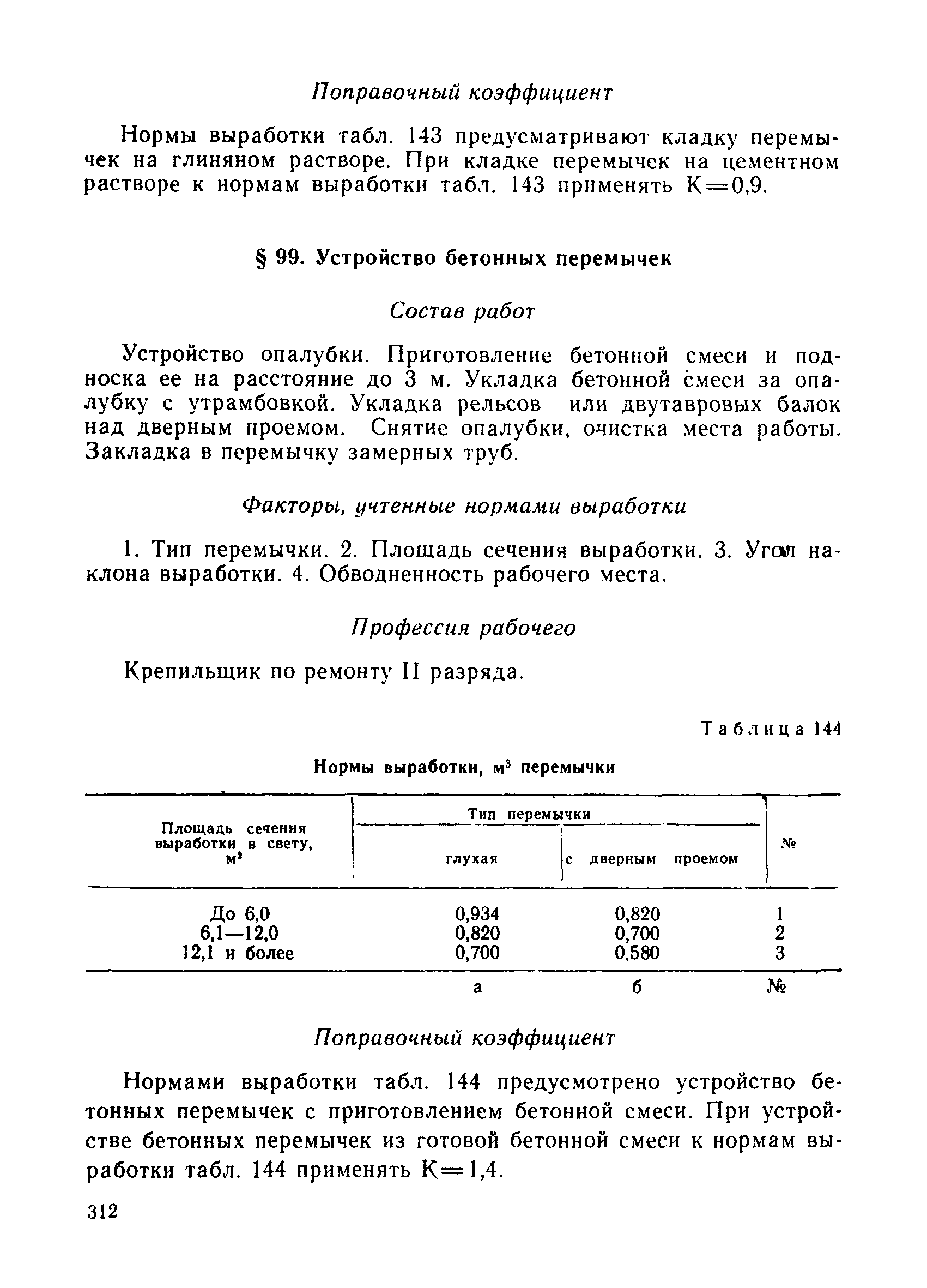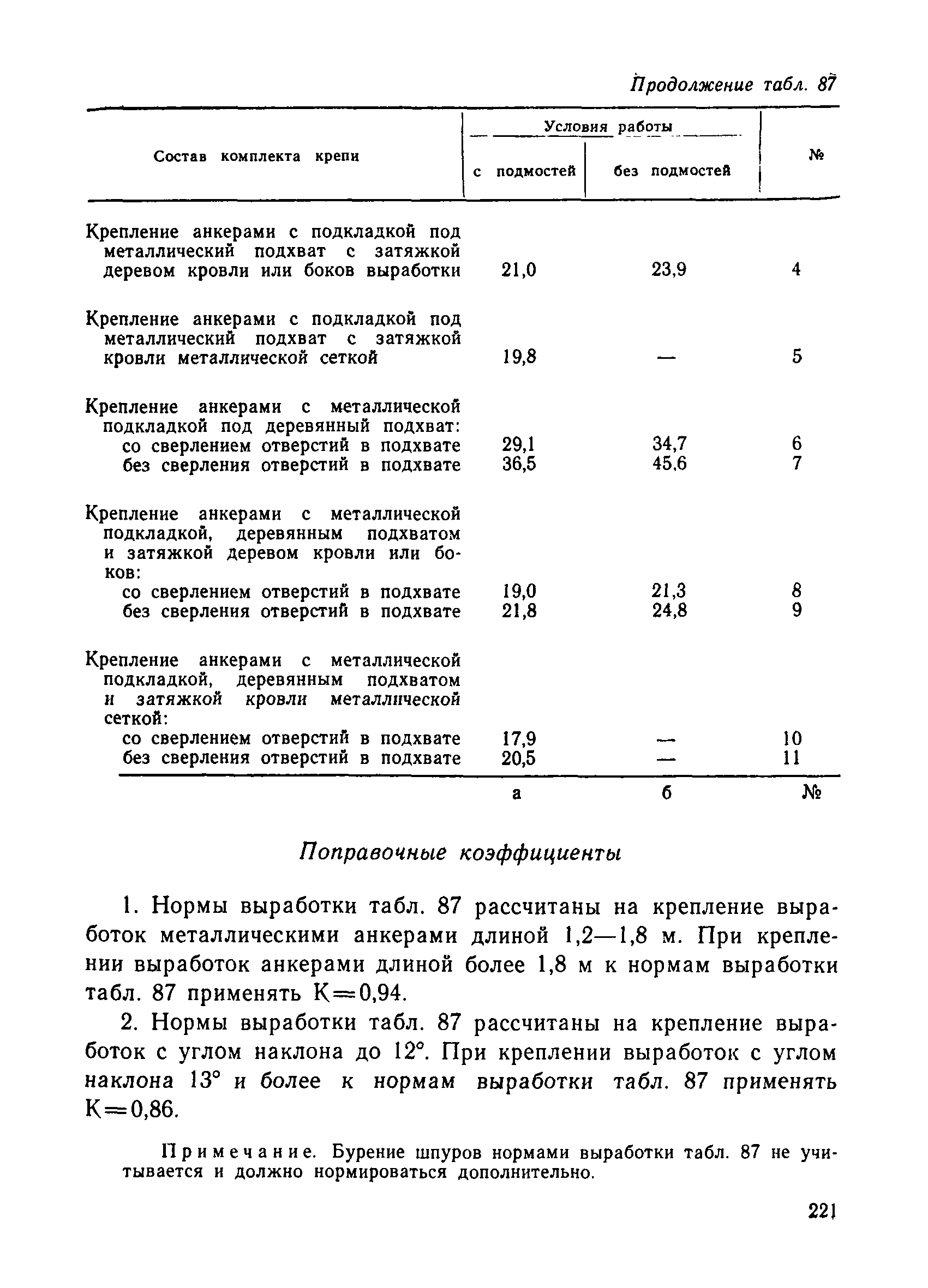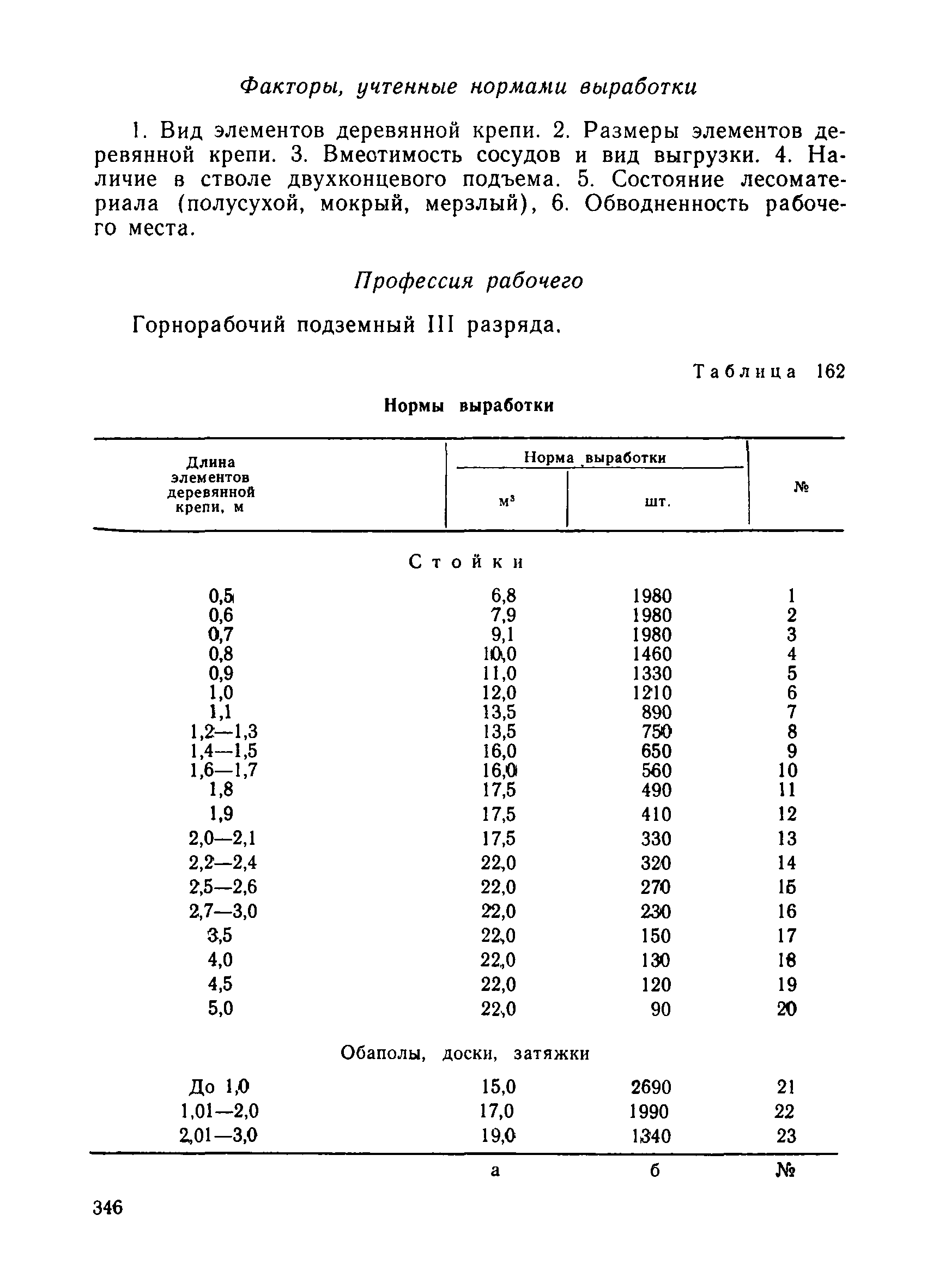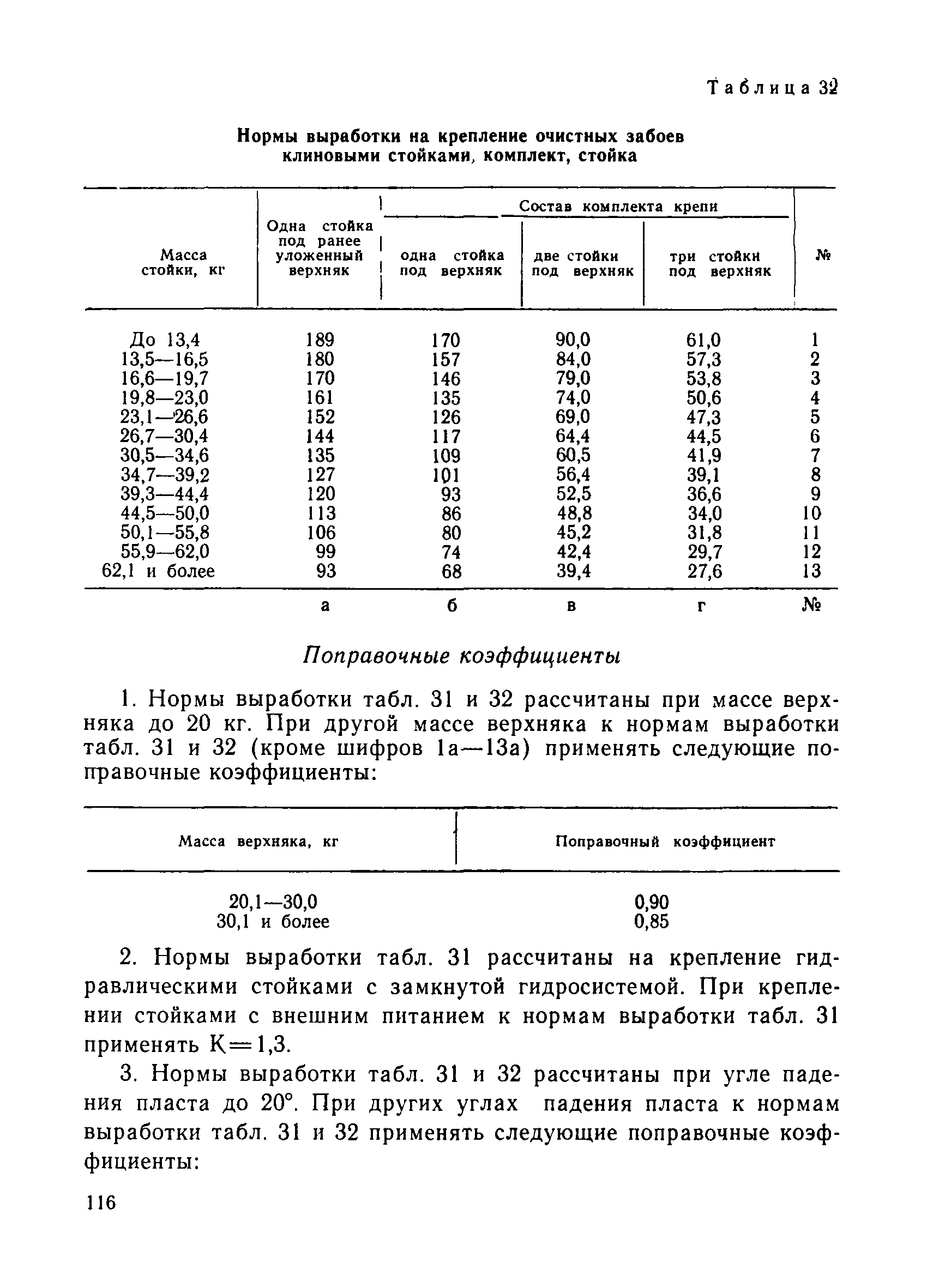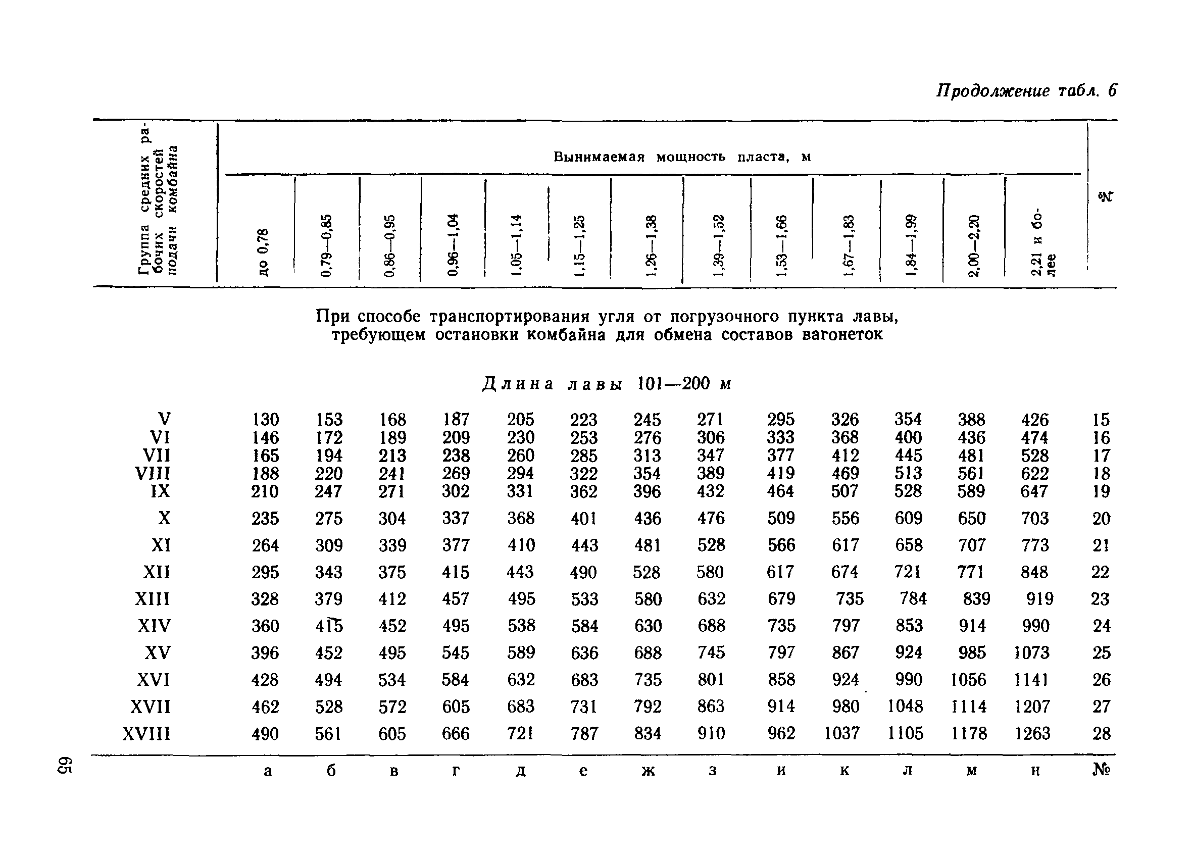 Единые нормы выработки (времени) для шахт производственного объединения "Приморскуголь"| Статус: | справочные материалы, мп, тпр | | Название рус.: | Единые нормы выработки (времени) для шахт производственного объединения "Приморскуголь" | | Дата добавления в базу: | 01.01.2018 | | Дата актуализации: | 01.01.2021 | | Область применения: | Единые нормы выработки (времени) обязательны для применения на всех действующих шахтах производственного объединения "Приморскуголь" | | Оглавление: | Общая часть Техническая часть Нормативная часть Раздел I. Очистные работы § 1. Выемка угля механизированными комплексами типа КМ-81 § 2. Выемка угля механизированными комплексами типов ОМКТ, ОКП, МК § 3. Выемка угля узкозахватными комбайнами типов КШ и ГШ-68 § 4. Оформление забоя после выемки угля узкозахватными комбайнами типов КШ и ГШ-68 § 5. Выемка угля узкозахватными комбайнами 1К-101, 2К-52, МК-67, БК-52 § 6. Оформление забоя после выемки угля узкозахватными комбайнами 1K-101, 2К-52, МК-67 и БК-52 § 7. Выемка угля комбайнами типов УКР, «Темп», КТ, А-70 в лавах на пластах наклонного и крутого падения § 8. Спуск (перегон) комбайнов типов УКР, «Темп», КТ, А-70 в лавах на пластах наклонного и крутого падения с передвижкой крана-балки § 9. Передвижка предохранительной лебедки 1ЛГКН § 10. Оформление забоя после выемки угля комбайнами типов УКР, «Темп», КТ, А-70 в лавах на пластах наклонного падения § 11. Выемка угля в лавах комбайном «Урал-2М» и подготовка его к выемке следующей полосы угля § 12. Оформление забоя после выемки угля комбайном «Урал-2М» § 13. Передвижка гидрофицированной посадочной крепи «Спутник» § 14. Выемка угля в лавах, оборудованных комбайнами К-56М A. Выемка угля Б. Разворот комбайна на пластах пологого падения B. Перегон комбайна § 15. Выемка угля проходческими комбайнами в очистных забоях на пластах пологого падения § 16. Навалоотбойка, навалка угля § 17. Бурение шпуров по углю ручными электросверлами (пневмосверлами) в лавах и камерах § 18. Уборка угля в очистных забоях с помощью скреперной установки § 19. Передвижка скреперной установки § 20. Выемка угля отбойными молотками § 21. Выемка угля с применением ВМ в очистных забоях на пластах крутого падения § 22. Крепление очистных забоев на пластах пологого и наклонного падения металлическими (клиновыми и гидравлическими) стойками § 23. Крепление очистных забоев деревянной крепью § 24. Возведение за комбайном временной деревянной крепи, предусмотренной паспортом крепления § 25. Навеска и снятие металлических шарнирных верхняков § 26. Затяжка кровли, почвы и забоя при креплении § 27. Передвижка специальной крепи типа ОКС на сопряжениях лав со штреками § 28. Установка рам на сопряжениях лав с прилегающими выработками § 29. Выбивка и извлечение металлических (клиновых и гидравлических) стоек в лавах на пластах пологого и наклонного падения при посадке кровли на металлическую органную крепь § 30. Возведение деревянной органной крепи § 31. Кладка и переноска деревянных костров § 32. Установка распорной крепи в очистных забоях § 33. Посадка кровли при помощи лебедки § 34. Бурение шпуров в стойках при посадке кровли с помощью малогабаритных патронов § 35. Передвижка перегружателей гидродомкратом при помощи упорной стойки § 36. Переноска рештаков (листов) в лавах на пластах пологого и наклонного падения § 37. Переноска деревянных рештаков (откосов) в лавах на пластах круто