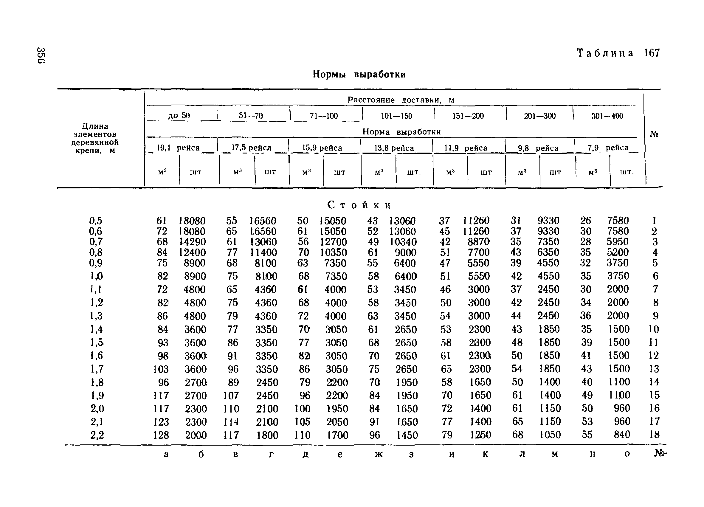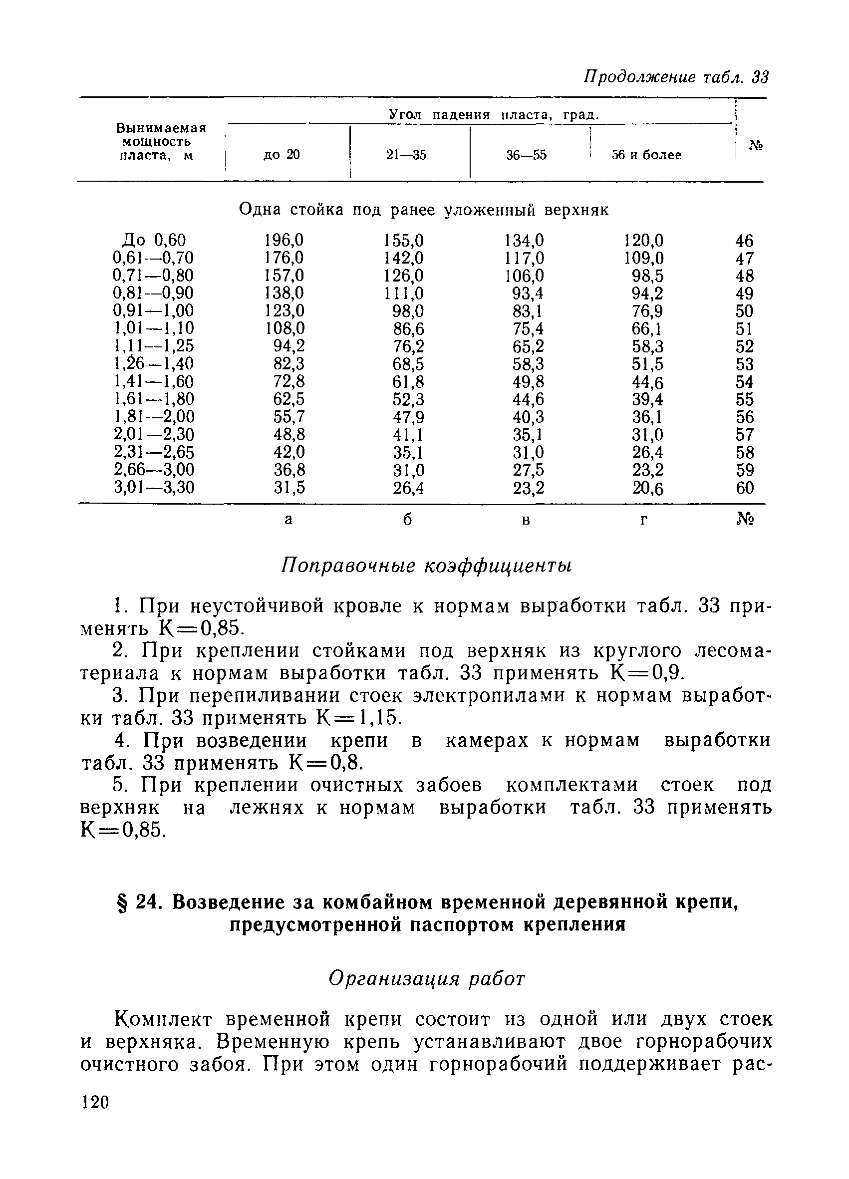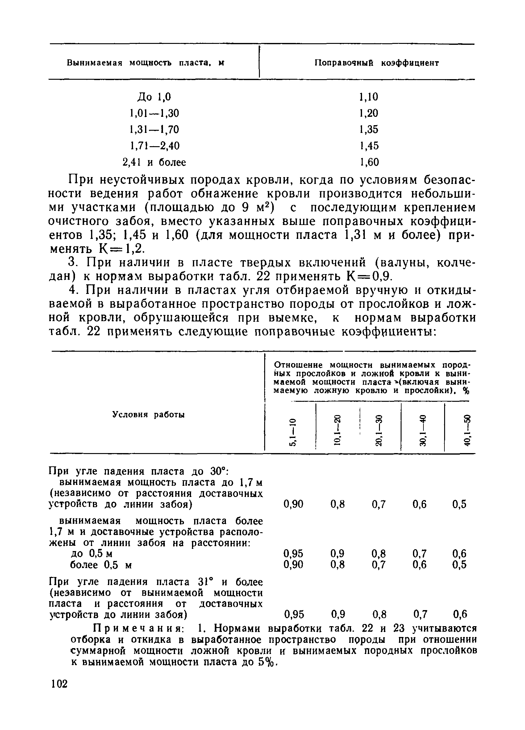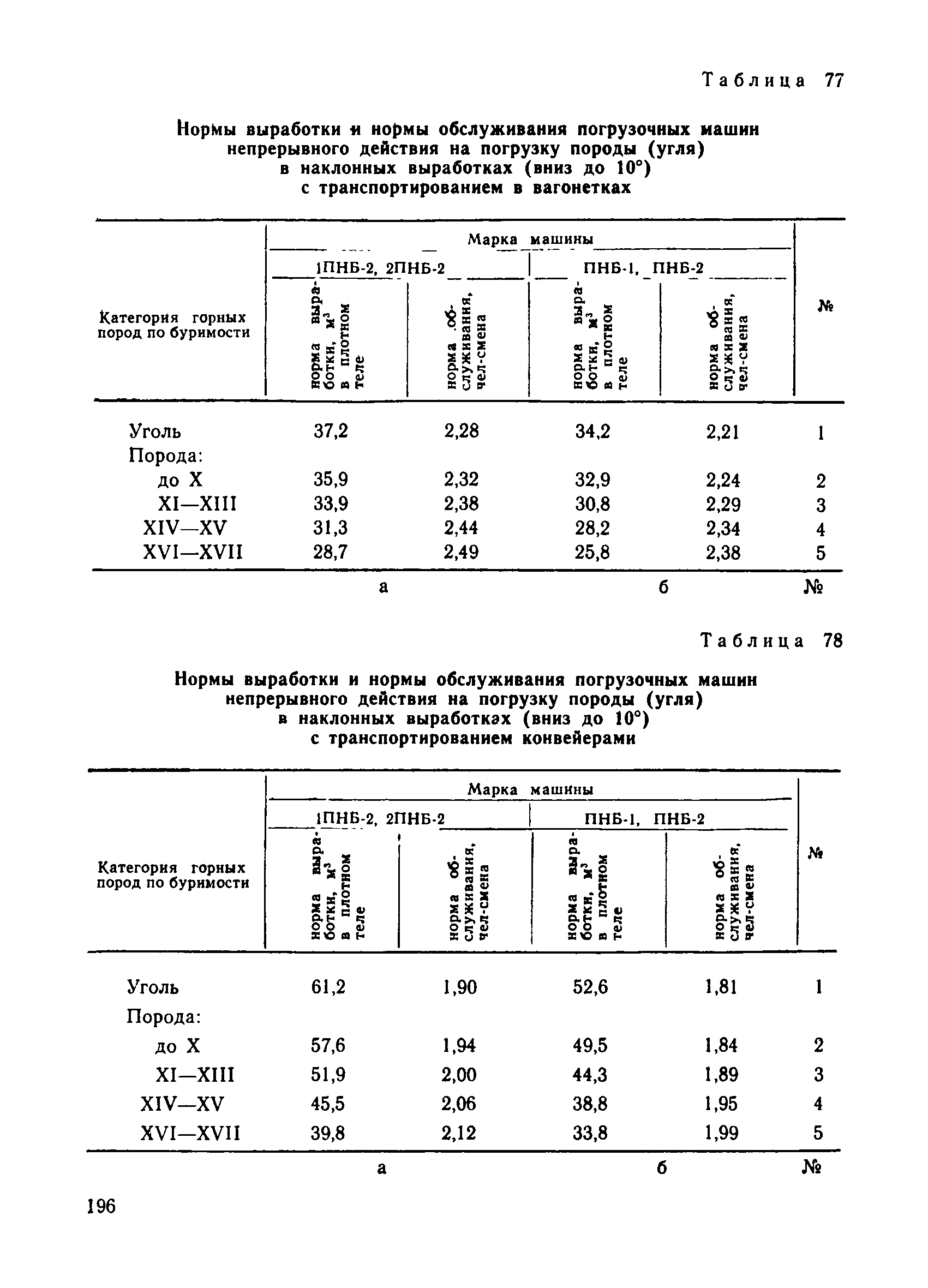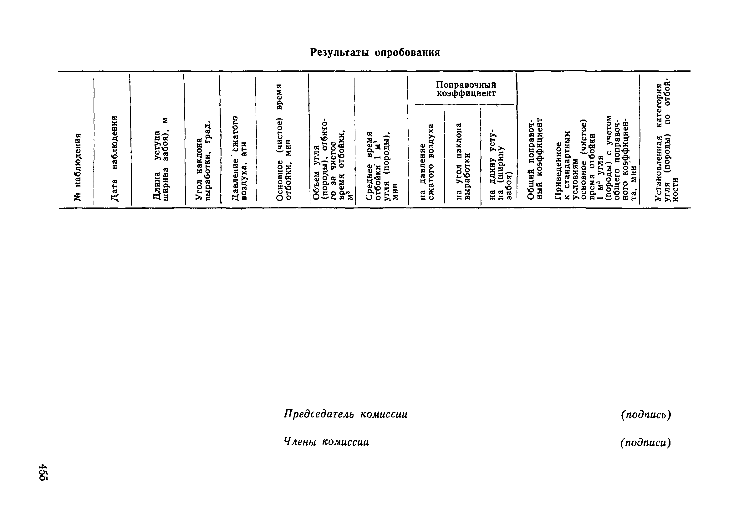 Единые нормы выработки (времени) для шахт производственного объединения "Приморскуголь"| Статус: | справочные материалы, мп, тпр | | Название рус.: | Единые нормы выработки (времени) для шахт производственного объединения "Приморскуголь" | | Дата добавления в базу: | 01.01.2018 | | Дата актуализации: | 01.01.2021 | | Область применения: | Единые нормы выработки (времени) обязательны для применения на всех действующих шахтах производственного объединения "Приморскуголь" | | Оглавление: | Общая часть Техническая часть Нормативная часть Раздел I. Очистные работы § 1. Выемка угля механизированными комплексами типа КМ-81 § 2. Выемка угля механизированными комплексами типов ОМКТ, ОКП, МК § 3. Выемка угля узкозахватными комбайнами типов КШ и ГШ-68 § 4. Оформление забоя после выемки угля узкозахватными комбайнами типов КШ и ГШ-68 § 5. Выемка угля узкозахватными комбайнами 1К-101, 2К-52, МК-67, БК-52 § 6. Оформление забоя после выемки угля узкозахватными комбайнами 1K-101, 2К-52, МК-67 и БК-52 § 7. Выемка угля комбайнами типов УКР, «Темп», КТ, А-70 в лавах на пластах наклонного и крутого падения § 8. Спуск (перегон) комбайнов типов УКР, «Темп», КТ, А-70 в лавах на пластах наклонного и крутого падения с передвижкой крана-балки § 9. Передвижка предохранительной лебедки 1ЛГКН § 10. Оформление забоя после выемки угля комбайнами типов УКР, «Темп», КТ, А-70 в лавах на пластах наклонного падения § 11. Выемка угля в лавах комбайном «Урал-2М» и подготовка его к выемке следующей полосы угля § 12. Оформление забоя после выемки угля комбайном «Урал-2М» § 13. Передвижка гидрофицированной посадочной крепи «Спутник» § 14. Выемка угля в лавах, оборудованных комбайнами К-56М A. Выемка угля Б. Разворот комбайна на пластах пологого падения B. Перегон комбайна § 15. Выемка угля проходческими комбайнами в очистных забоях на пластах пологого падения § 16. Навалоотбойка, навалка угля § 17. Бурение шпуров по углю ручными электросверлами (пневмосверлами) в лавах и камерах § 18. Уборка угля в очистных забоях с помощью скреперной установки § 19. Передвижка скреперной установки § 20. Выемка угля отбойными молотками § 21. Выемка угля с применением ВМ в очистных забоях на пластах крутого падения § 22. Крепление очистных забоев на пластах пологого и наклонного падения металлическими (клиновыми и гидравлическими) стойками § 23. Крепление очистных забоев деревянной крепью § 24. Возведение за комбайном временной деревянной крепи, предусмотренной паспортом крепления § 25. Навеска и снятие металлических шарнирных верхняков § 26. Затяжка кровли, почвы и забоя при креплении § 27. Передвижка специальной крепи типа ОКС на сопряжениях лав со штреками § 28. Установка рам на сопряжениях лав с прилегающими выработками § 29. Выбивка и извлечение металлических (клиновых и гидравлических) стоек в лавах на пластах пологого и наклонного падения при посадке кровли на металлическую органную крепь § 30. Возведение деревянной органной крепи § 31. Кладка и переноска деревянных костров § 32. Установка распорной крепи в очистных забоях § 33. Посадка кровли при помощи лебедки § 34. Бурение шпуров в стойках при посадке кровли с помощью малогабаритных патронов § 35. Передвижка перегружателей гидродомкратом при помощи упорной стойки § 36. Переноска рештаков (листов) в лавах на пластах пологого и наклонного падения § 37. Переноска деревянных рештаков (откосов) в лавах на пластах круто