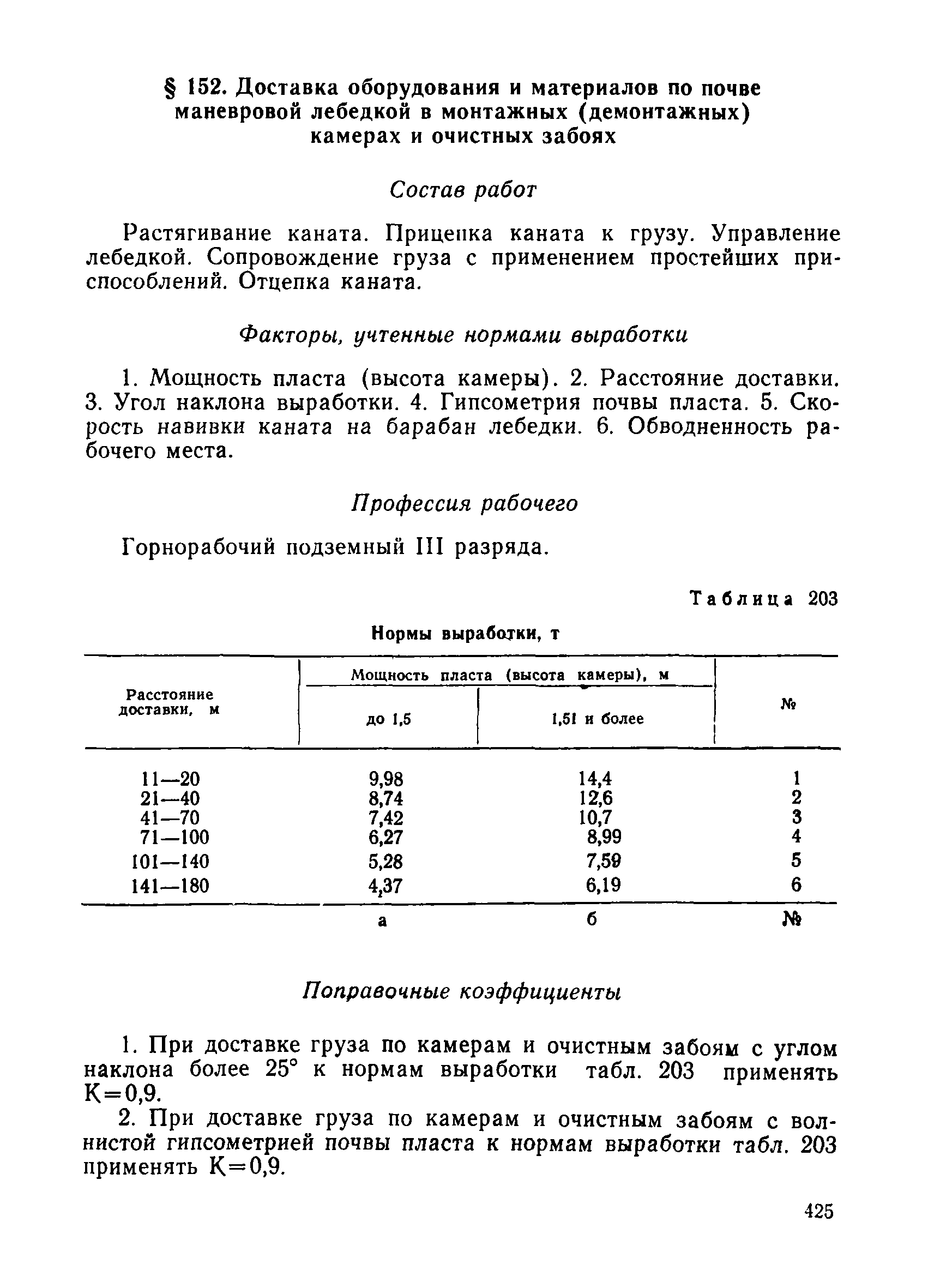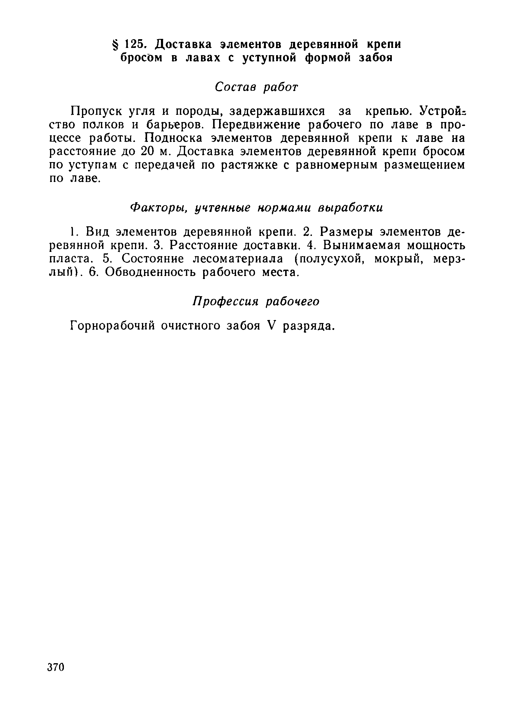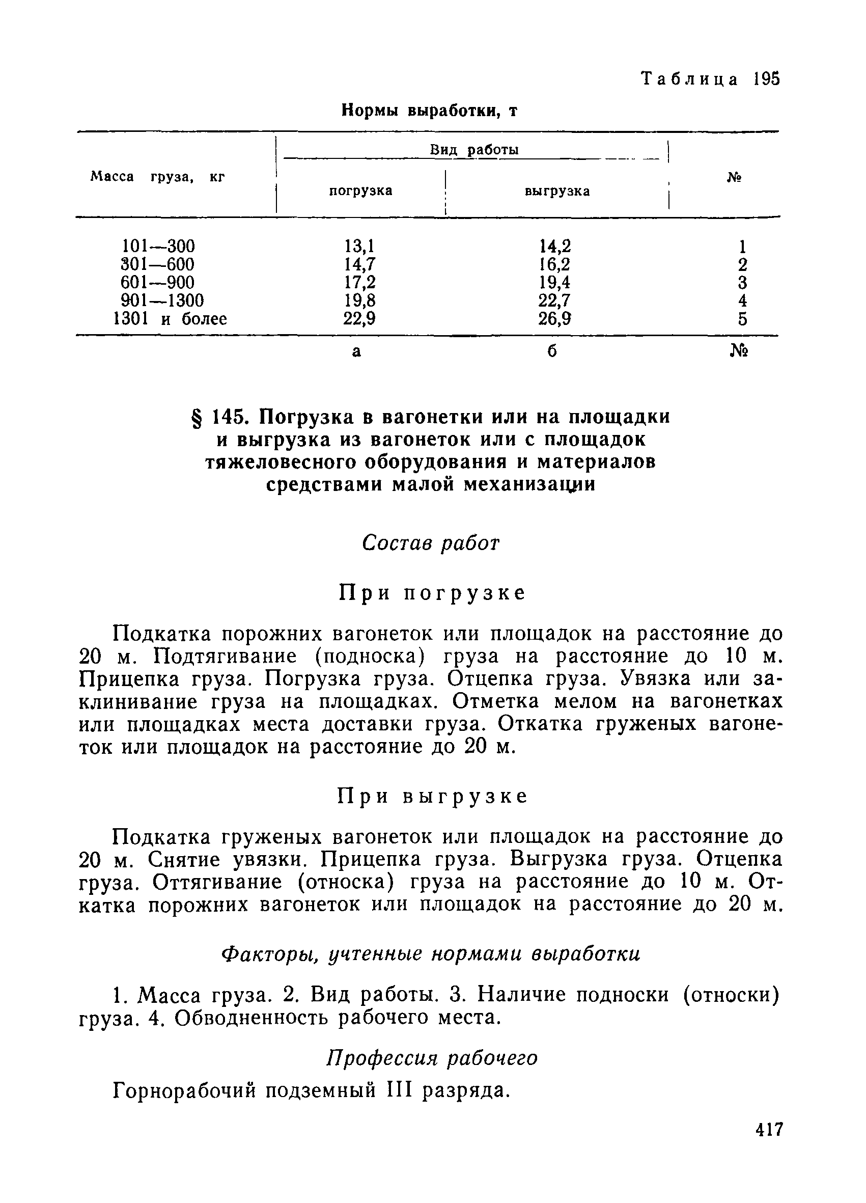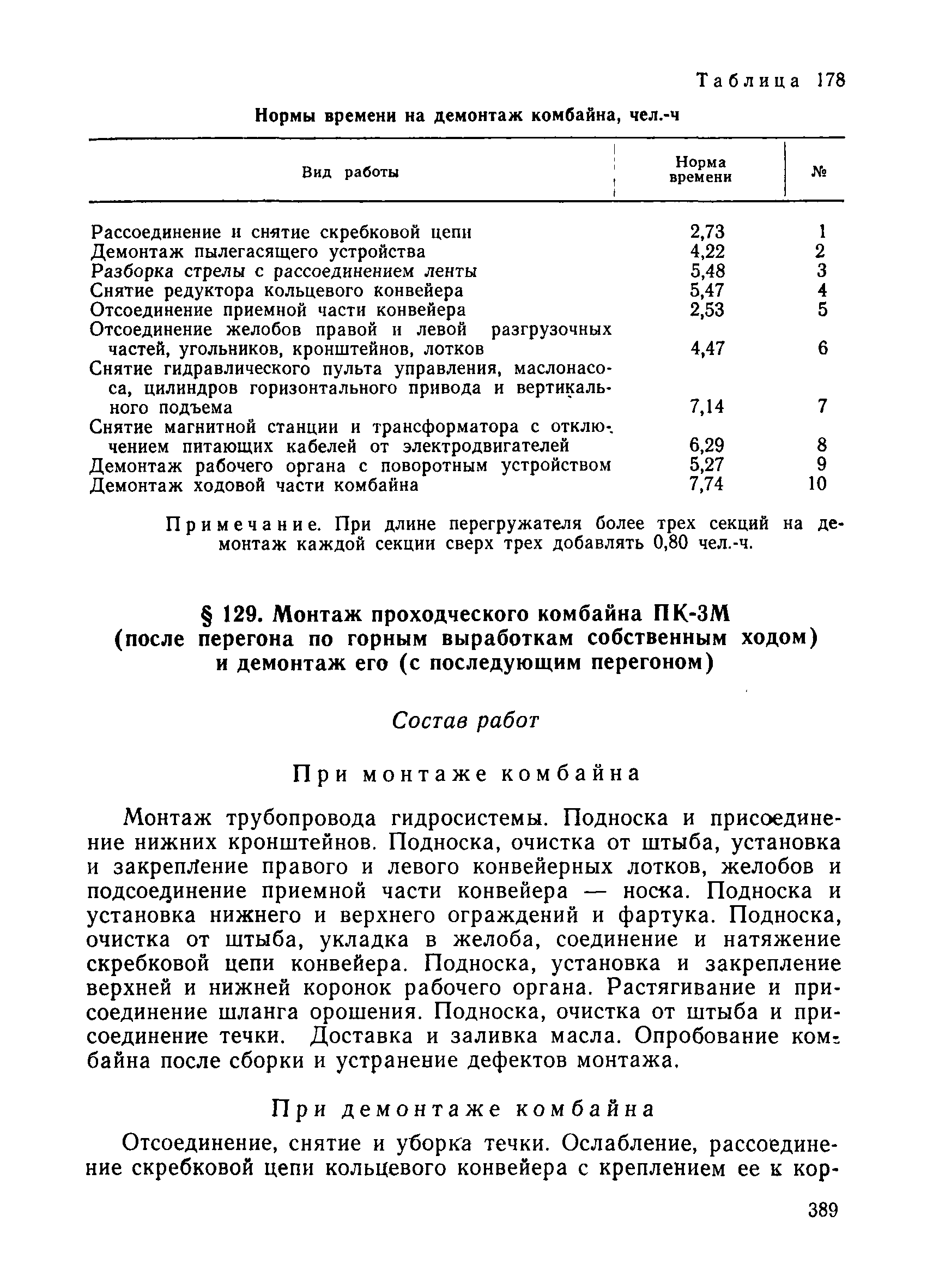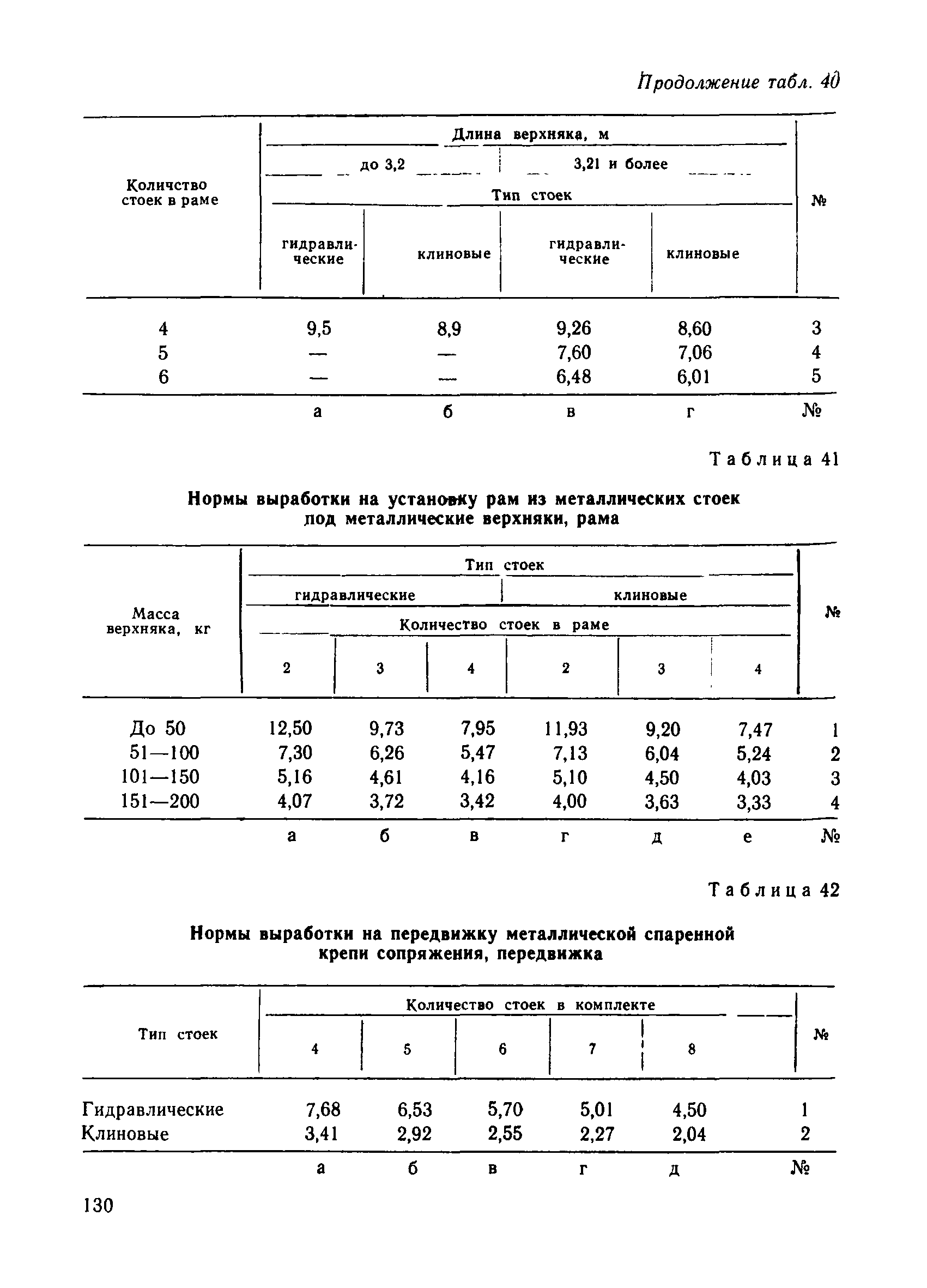 Единые нормы выработки (времени) для шахт производственного объединения "Приморскуголь"| Статус: | справочные материалы, мп, тпр | | Название рус.: | Единые нормы выработки (времени) для шахт производственного объединения "Приморскуголь" | | Дата добавления в базу: | 01.01.2018 | | Дата актуализации: | 01.01.2021 | | Область применения: | Единые нормы выработки (времени) обязательны для применения на всех действующих шахтах производственного объединения "Приморскуголь" | | Оглавление: | Общая часть Техническая часть Нормативная часть Раздел I. Очистные работы § 1. Выемка угля механизированными комплексами типа КМ-81 § 2. Выемка угля механизированными комплексами типов ОМКТ, ОКП, МК § 3. Выемка угля узкозахватными комбайнами типов КШ и ГШ-68 § 4. Оформление забоя после выемки угля узкозахватными комбайнами типов КШ и ГШ-68 § 5. Выемка угля узкозахватными комбайнами 1К-101, 2К-52, МК-67, БК-52 § 6. Оформление забоя после выемки угля узкозахватными комбайнами 1K-101, 2К-52, МК-67 и БК-52 § 7. Выемка угля комбайнами типов УКР, «Темп», КТ, А-70 в лавах на пластах наклонного и крутого падения § 8. Спуск (перегон) комбайнов типов УКР, «Темп», КТ, А-70 в лавах на пластах наклонного и крутого падения с передвижкой крана-балки § 9. Передвижка предохранительной лебедки 1ЛГКН § 10. Оформление забоя после выемки угля комбайнами типов УКР, «Темп», КТ, А-70 в лавах на пластах наклонного падения § 11. Выемка угля в лавах комбайном «Урал-2М» и подготовка его к выемке следующей полосы угля § 12. Оформление забоя после выемки угля комбайном «Урал-2М» § 13. Передвижка гидрофицированной посадочной крепи «Спутник» § 14. Выемка угля в лавах, оборудованных комбайнами К-56М A. Выемка угля Б. Разворот комбайна на пластах пологого падения B. Перегон комбайна § 15. Выемка угля проходческими комбайнами в очистных забоях на пластах пологого падения § 16. Навалоотбойка, навалка угля § 17. Бурение шпуров по углю ручными электросверлами (пневмосверлами) в лавах и камерах § 18. Уборка угля в очистных забоях с помощью скреперной установки § 19. Передвижка скреперной установки § 20. Выемка угля отбойными молотками § 21. Выемка угля с применением ВМ в очистных забоях на пластах крутого падения § 22. Крепление очистных забоев на пластах пологого и наклонного падения металлическими (клиновыми и гидравлическими) стойками § 23. Крепление очистных забоев деревянной крепью § 24. Возведение за комбайном временной деревянной крепи, предусмотренной паспортом крепления § 25. Навеска и снятие металлических шарнирных верхняков § 26. Затяжка кровли, почвы и забоя при креплении § 27. Передвижка специальной крепи типа ОКС на сопряжениях лав со штреками § 28. Установка рам на сопряжениях лав с прилегающими выработками § 29. Выбивка и извлечение металлических (клиновых и гидравлических) стоек в лавах на пластах пологого и наклонного падения при посадке кровли на металлическую органную крепь § 30. Возведение деревянной органной крепи § 31. Кладка и переноска деревянных костров § 32. Установка распорной крепи в очистных забоях § 33. Посадка кровли при помощи лебедки § 34. Бурение шпуров в стойках при посадке кровли с помощью малогабаритных патронов § 35. Передвижка перегружателей гидродомкратом при помощи упорной стойки § 36. Переноска рештаков (листов) в лавах на пластах пологого и наклонного падения § 37. Переноска деревянных рештаков (откосов) в лавах на пластах круто