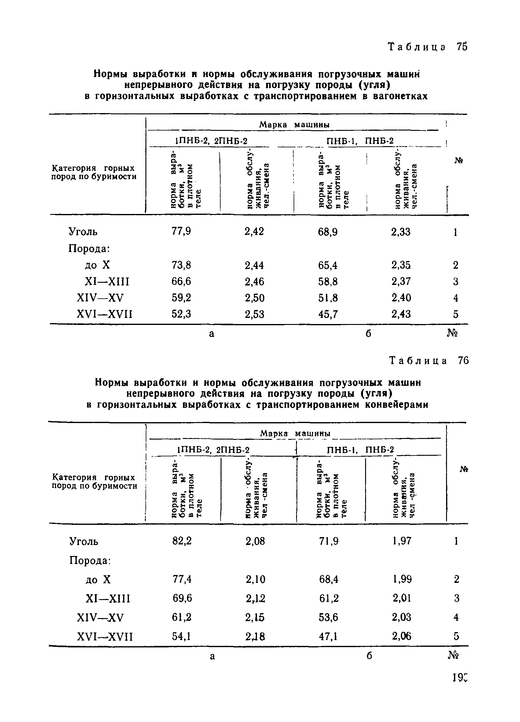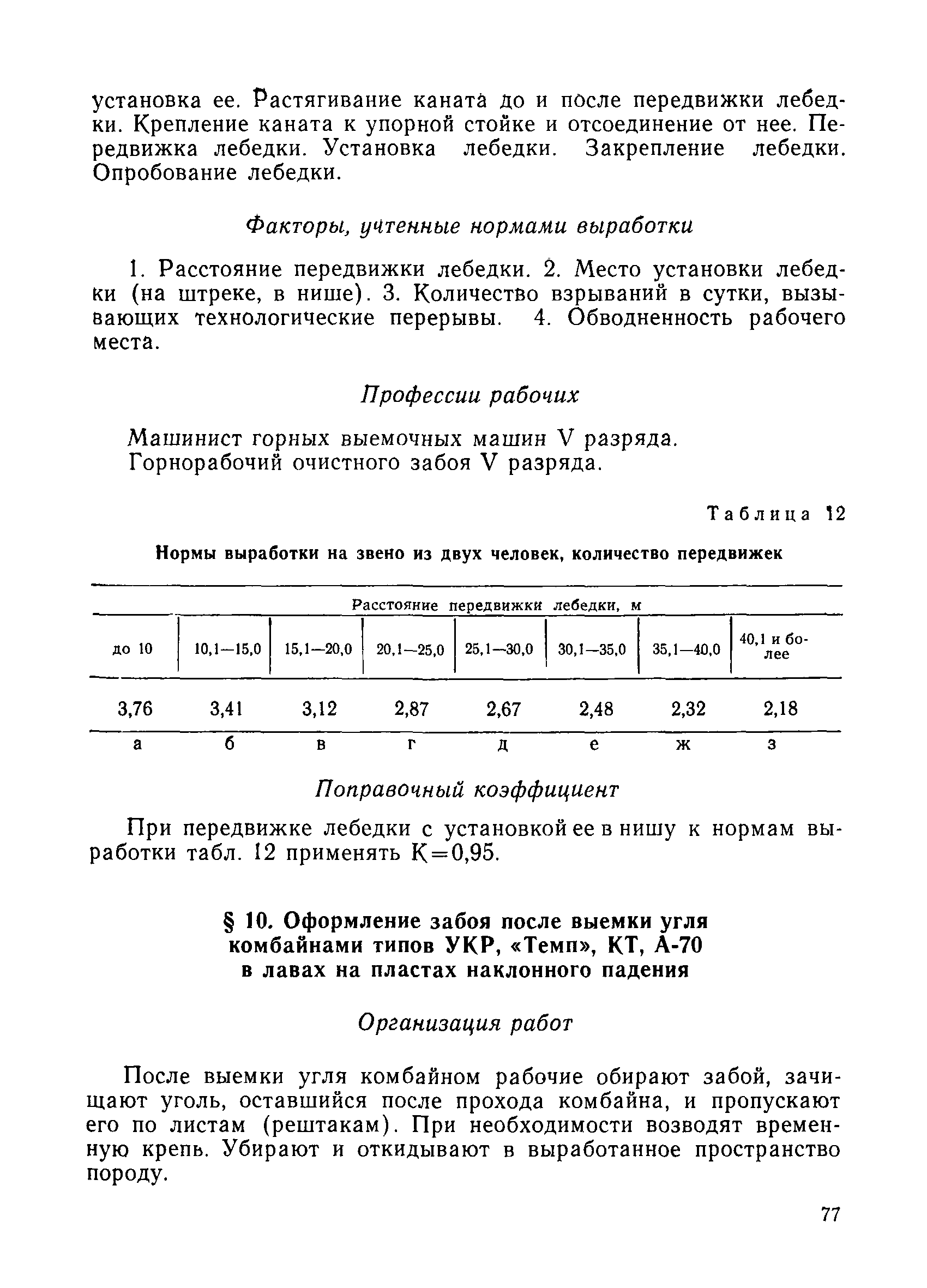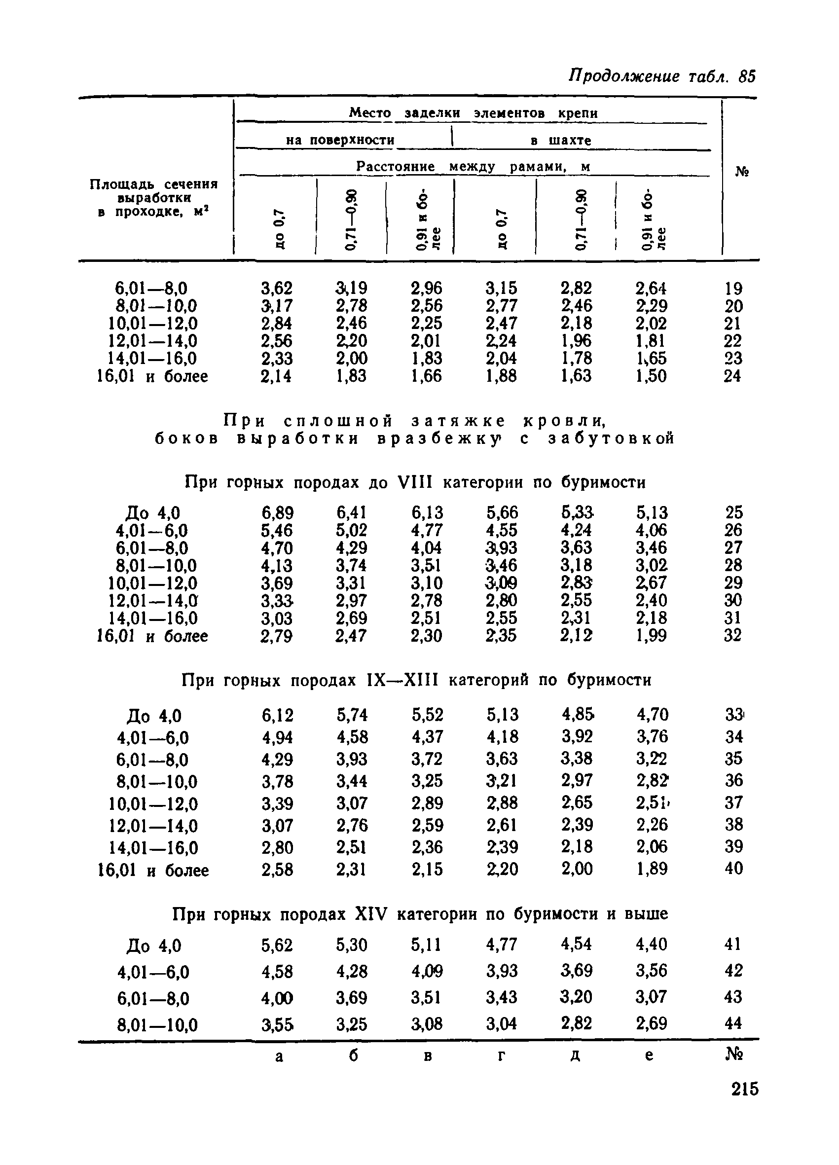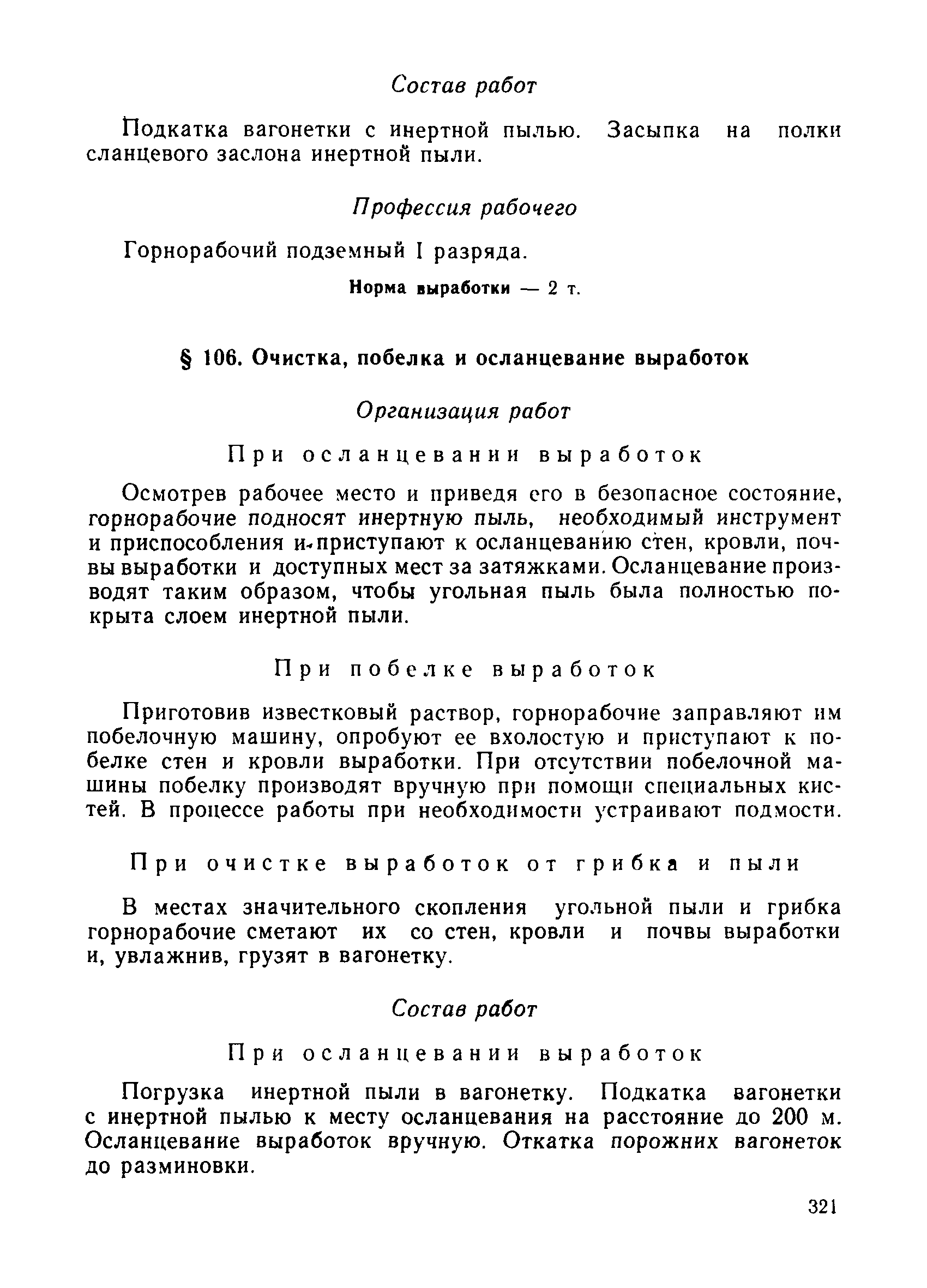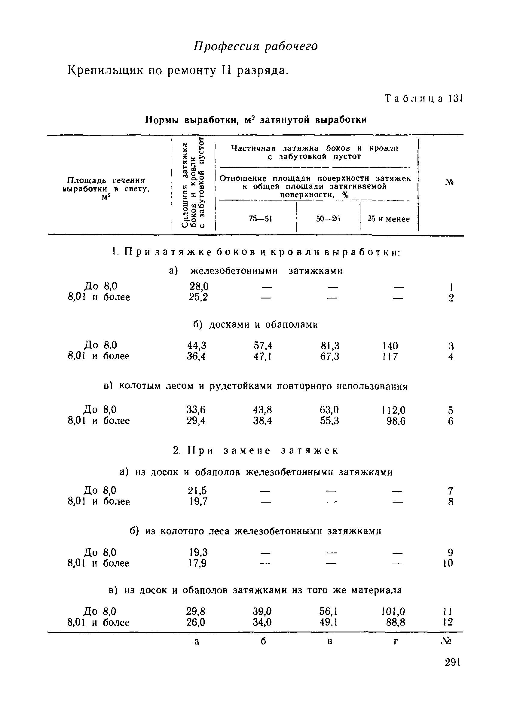 Единые нормы выработки (времени) для шахт производственного объединения "Приморскуголь"| Статус: | справочные материалы, мп, тпр | | Название рус.: | Единые нормы выработки (времени) для шахт производственного объединения "Приморскуголь" | | Дата добавления в базу: | 01.01.2018 | | Дата актуализации: | 01.01.2021 | | Область применения: | Единые нормы выработки (времени) обязательны для применения на всех действующих шахтах производственного объединения "Приморскуголь" | | Оглавление: | Общая часть Техническая часть Нормативная часть Раздел I. Очистные работы § 1. Выемка угля механизированными комплексами типа КМ-81 § 2. Выемка угля механизированными комплексами типов ОМКТ, ОКП, МК § 3. Выемка угля узкозахватными комбайнами типов КШ и ГШ-68 § 4. Оформление забоя после выемки угля узкозахватными комбайнами типов КШ и ГШ-68 § 5. Выемка угля узкозахватными комбайнами 1К-101, 2К-52, МК-67, БК-52 § 6. Оформление забоя после выемки угля узкозахватными комбайнами 1K-101, 2К-52, МК-67 и БК-52 § 7. Выемка угля комбайнами типов УКР, «Темп», КТ, А-70 в лавах на пластах наклонного и крутого падения § 8. Спуск (перегон) комбайнов типов УКР, «Темп», КТ, А-70 в лавах на пластах наклонного и крутого падения с передвижкой крана-балки § 9. Передвижка предохранительной лебедки 1ЛГКН § 10. Оформление забоя после выемки угля комбайнами типов УКР, «Темп», КТ, А-70 в лавах на пластах наклонного падения § 11. Выемка угля в лавах комбайном «Урал-2М» и подготовка его к выемке следующей полосы угля § 12. Оформление забоя после выемки угля комбайном «Урал-2М» § 13. Передвижка гидрофицированной посадочной крепи «Спутник» § 14. Выемка угля в лавах, оборудованных комбайнами К-56М A. Выемка угля Б. Разворот комбайна на пластах пологого падения B. Перегон комбайна § 15. Выемка угля проходческими комбайнами в очистных забоях на пластах пологого падения § 16. Навалоотбойка, навалка угля § 17. Бурение шпуров по углю ручными электросверлами (пневмосверлами) в лавах и камерах § 18. Уборка угля в очистных забоях с помощью скреперной установки § 19. Передвижка скреперной установки § 20. Выемка угля отбойными молотками § 21. Выемка угля с применением ВМ в очистных забоях на пластах крутого падения § 22. Крепление очистных забоев на пластах пологого и наклонного падения металлическими (клиновыми и гидравлическими) стойками § 23. Крепление очистных забоев деревянной крепью § 24. Возведение за комбайном временной деревянной крепи, предусмотренной паспортом крепления § 25. Навеска и снятие металлических шарнирных верхняков § 26. Затяжка кровли, почвы и забоя при креплении § 27. Передвижка специальной крепи типа ОКС на сопряжениях лав со штреками § 28. Установка рам на сопряжениях лав с прилегающими выработками § 29. Выбивка и извлечение металлических (клиновых и гидравлических) стоек в лавах на пластах пологого и наклонного падения при посадке кровли на металлическую органную крепь § 30. Возведение деревянной органной крепи § 31. Кладка и переноска деревянных костров § 32. Установка распорной крепи в очистных забоях § 33. Посадка кровли при помощи лебедки § 34. Бурение шпуров в стойках при посадке кровли с помощью малогабаритных патронов § 35. Передвижка перегружателей гидродомкратом при помощи упорной стойки § 36. Переноска рештаков (листов) в лавах на пластах пологого и наклонного падения § 37. Переноска деревянных рештаков (откосов) в лавах на пластах круто