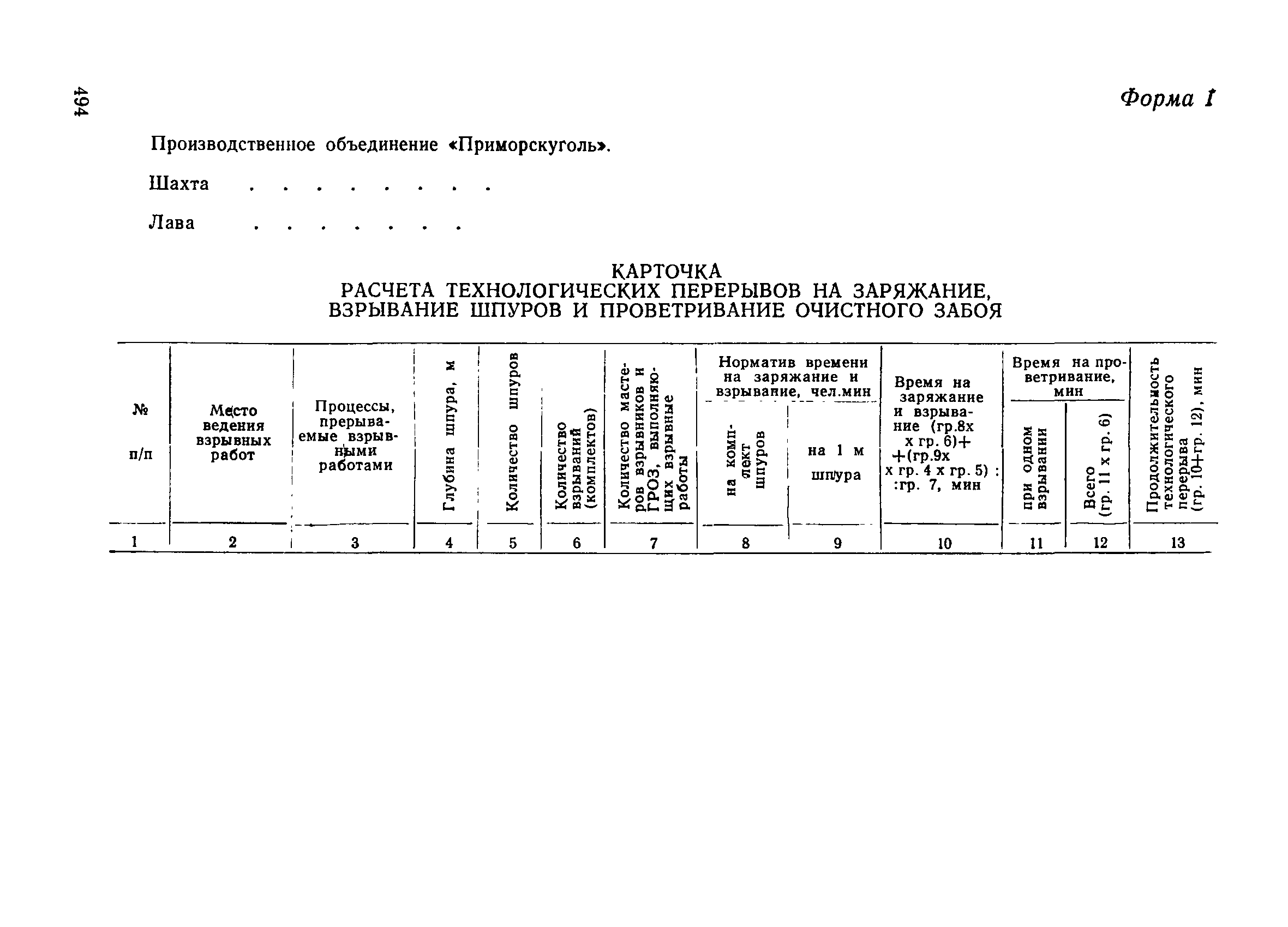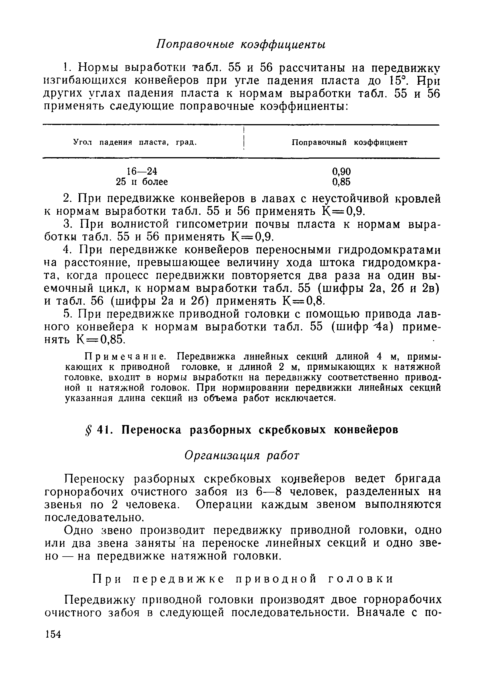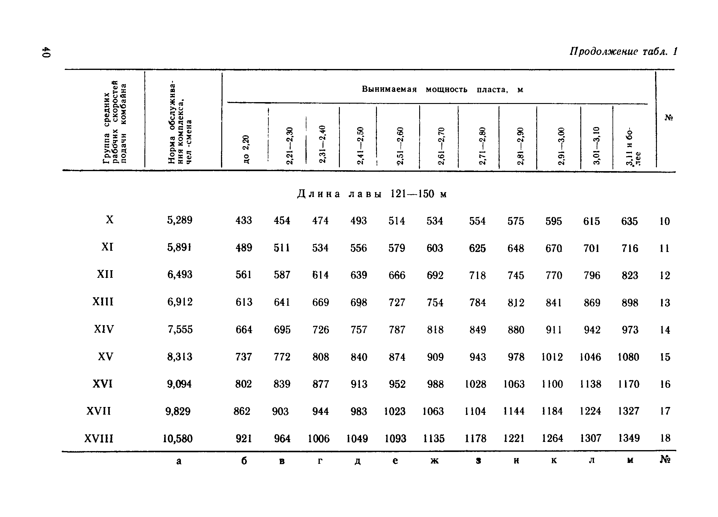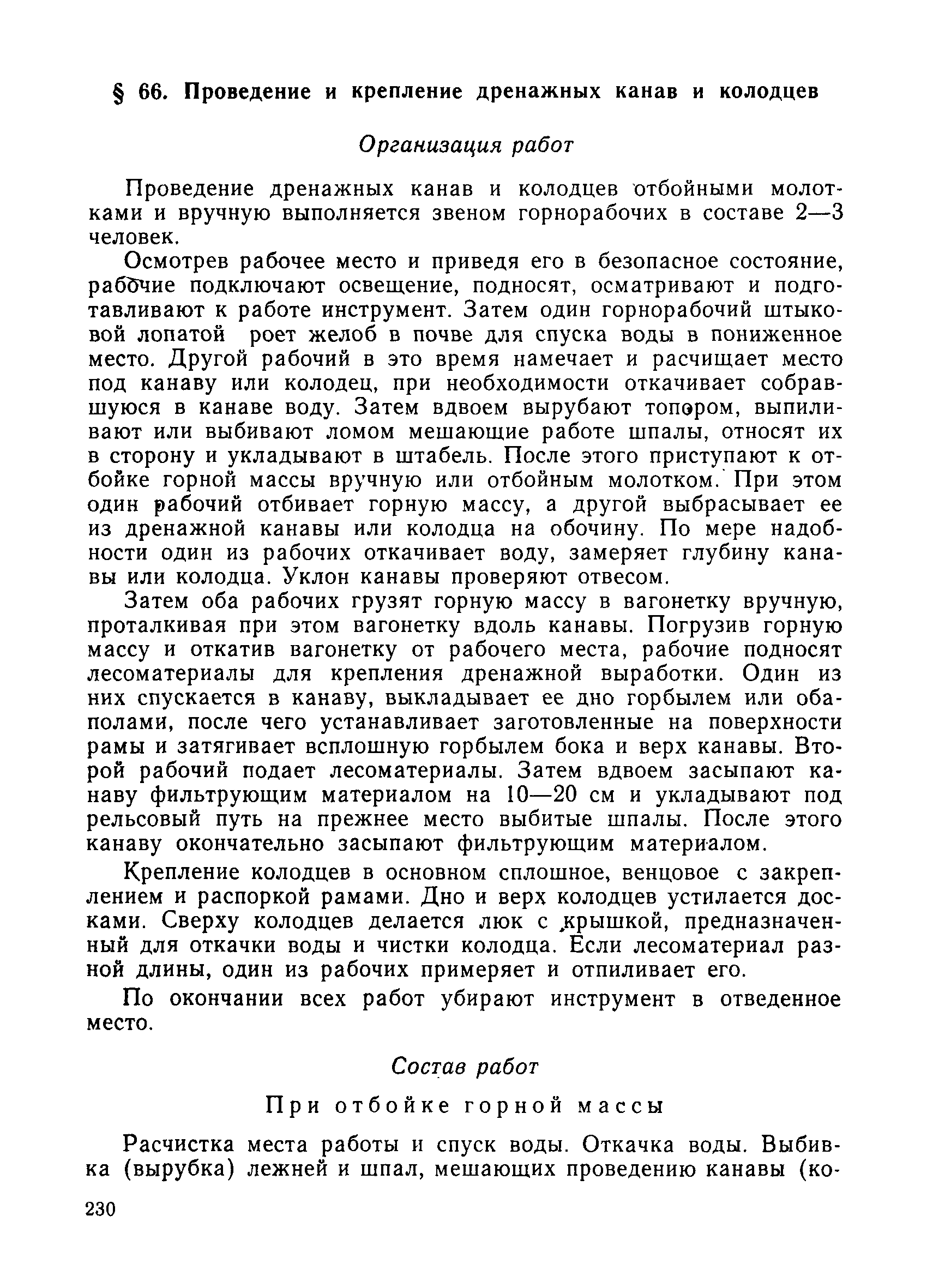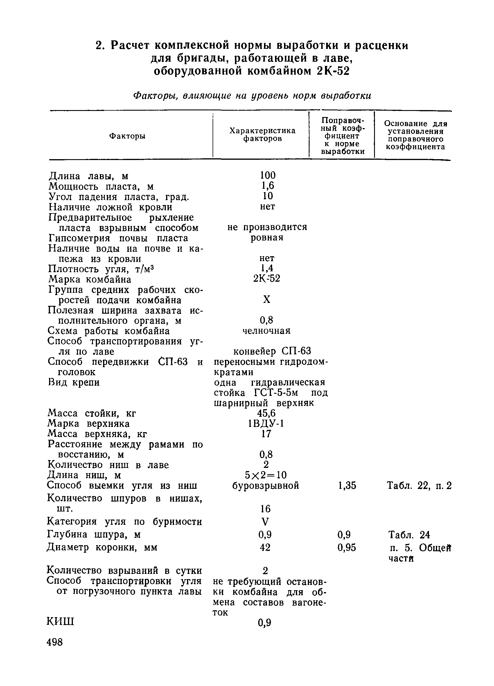 Единые нормы выработки (времени) для шахт производственного объединения "Приморскуголь"| Статус: | справочные материалы, мп, тпр | | Название рус.: | Единые нормы выработки (времени) для шахт производственного объединения "Приморскуголь" | | Дата добавления в базу: | 01.01.2018 | | Дата актуализации: | 01.01.2021 | | Область применения: | Единые нормы выработки (времени) обязательны для применения на всех действующих шахтах производственного объединения "Приморскуголь" | | Оглавление: | Общая часть Техническая часть Нормативная часть Раздел I. Очистные работы § 1. Выемка угля механизированными комплексами типа КМ-81 § 2. Выемка угля механизированными комплексами типов ОМКТ, ОКП, МК § 3. Выемка угля узкозахватными комбайнами типов КШ и ГШ-68 § 4. Оформление забоя после выемки угля узкозахватными комбайнами типов КШ и ГШ-68 § 5. Выемка угля узкозахватными комбайнами 1К-101, 2К-52, МК-67, БК-52 § 6. Оформление забоя после выемки угля узкозахватными комбайнами 1K-101, 2К-52, МК-67 и БК-52 § 7. Выемка угля комбайнами типов УКР, «Темп», КТ, А-70 в лавах на пластах наклонного и крутого падения § 8. Спуск (перегон) комбайнов типов УКР, «Темп», КТ, А-70 в лавах на пластах наклонного и крутого падения с передвижкой крана-балки § 9. Передвижка предохранительной лебедки 1ЛГКН § 10. Оформление забоя после выемки угля комбайнами типов УКР, «Темп», КТ, А-70 в лавах на пластах наклонного падения § 11. Выемка угля в лавах комбайном «Урал-2М» и подготовка его к выемке следующей полосы угля § 12. Оформление забоя после выемки угля комбайном «Урал-2М» § 13. Передвижка гидрофицированной посадочной крепи «Спутник» § 14. Выемка угля в лавах, оборудованных комбайнами К-56М A. Выемка угля Б. Разворот комбайна на пластах пологого падения B. Перегон комбайна § 15. Выемка угля проходческими комбайнами в очистных забоях на пластах пологого падения § 16. Навалоотбойка, навалка угля § 17. Бурение шпуров по углю ручными электросверлами (пневмосверлами) в лавах и камерах § 18. Уборка угля в очистных забоях с помощью скреперной установки § 19. Передвижка скреперной установки § 20. Выемка угля отбойными молотками § 21. Выемка угля с применением ВМ в очистных забоях на пластах крутого падения § 22. Крепление очистных забоев на пластах пологого и наклонного падения металлическими (клиновыми и гидравлическими) стойками § 23. Крепление очистных забоев деревянной крепью § 24. Возведение за комбайном временной деревянной крепи, предусмотренной паспортом крепления § 25. Навеска и снятие металлических шарнирных верхняков § 26. Затяжка кровли, почвы и забоя при креплении § 27. Передвижка специальной крепи типа ОКС на сопряжениях лав со штреками § 28. Установка рам на сопряжениях лав с прилегающими выработками § 29. Выбивка и извлечение металлических (клиновых и гидравлических) стоек в лавах на пластах пологого и наклонного падения при посадке кровли на металлическую органную крепь § 30. Возведение деревянной органной крепи § 31. Кладка и переноска деревянных костров § 32. Установка распорной крепи в очистных забоях § 33. Посадка кровли при помощи лебедки § 34. Бурение шпуров в стойках при посадке кровли с помощью малогабаритных патронов § 35. Передвижка перегружателей гидродомкратом при помощи упорной стойки § 36. Переноска рештаков (листов) в лавах на пластах пологого и наклонного падения § 37. Переноска деревянных рештаков (откосов) в лавах на пластах круто