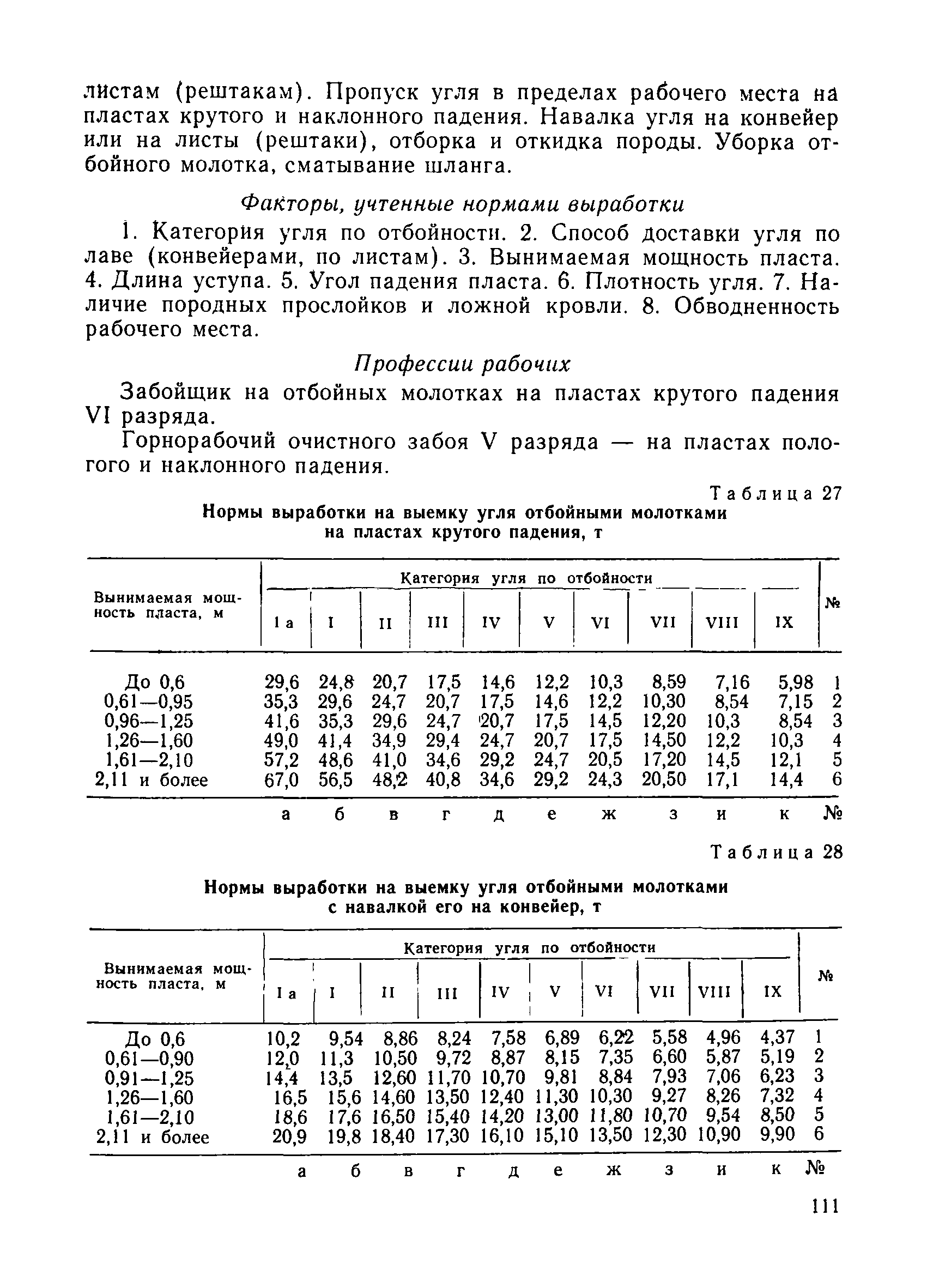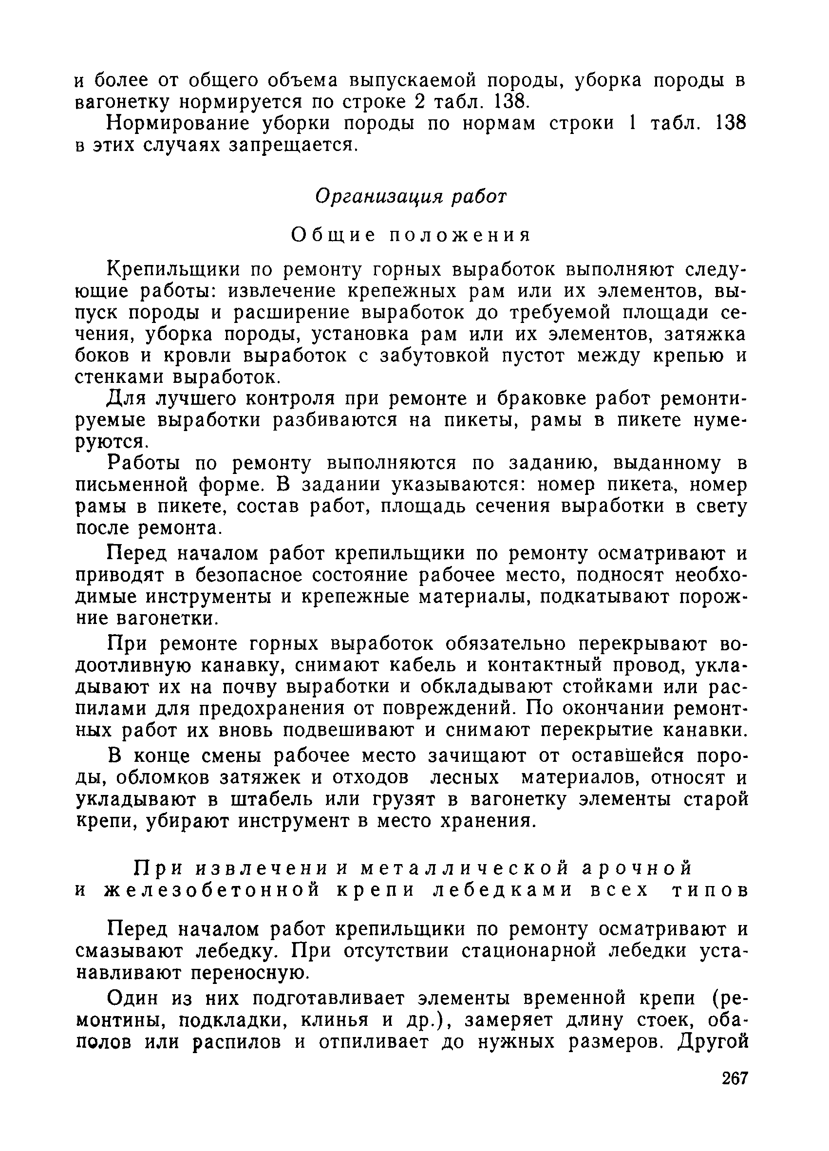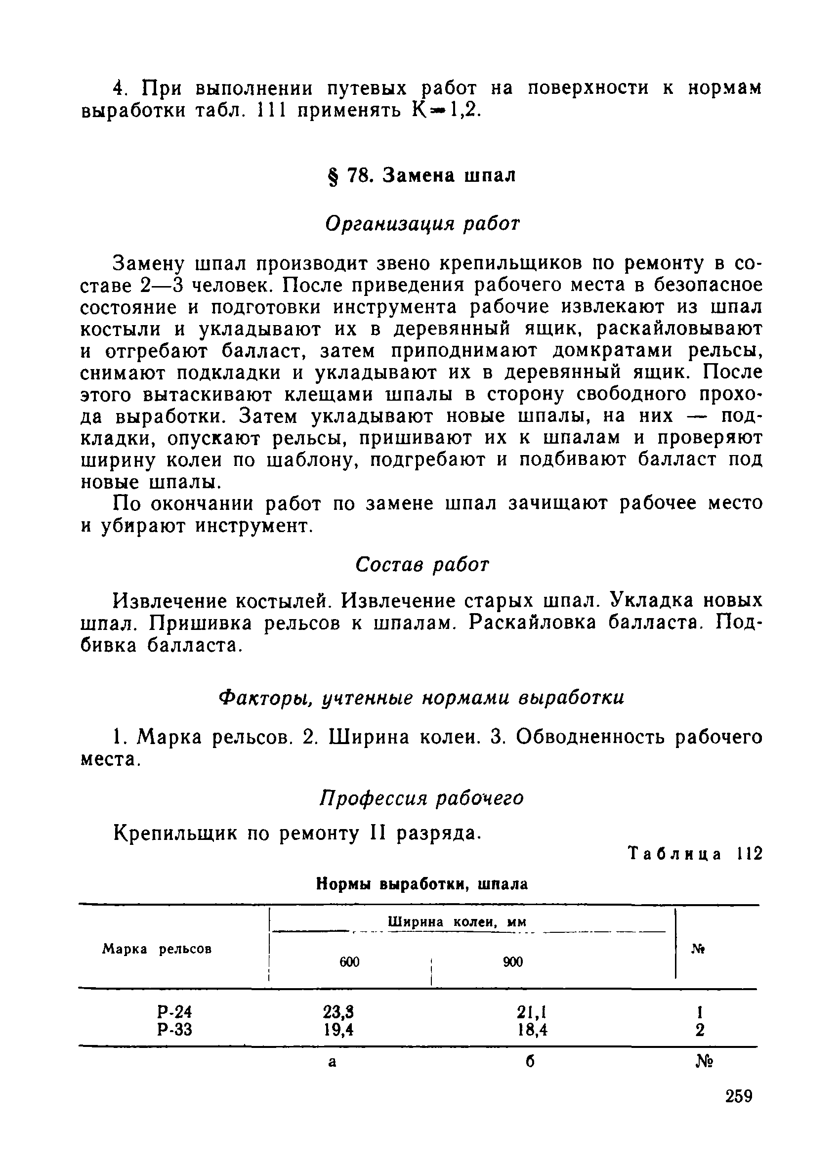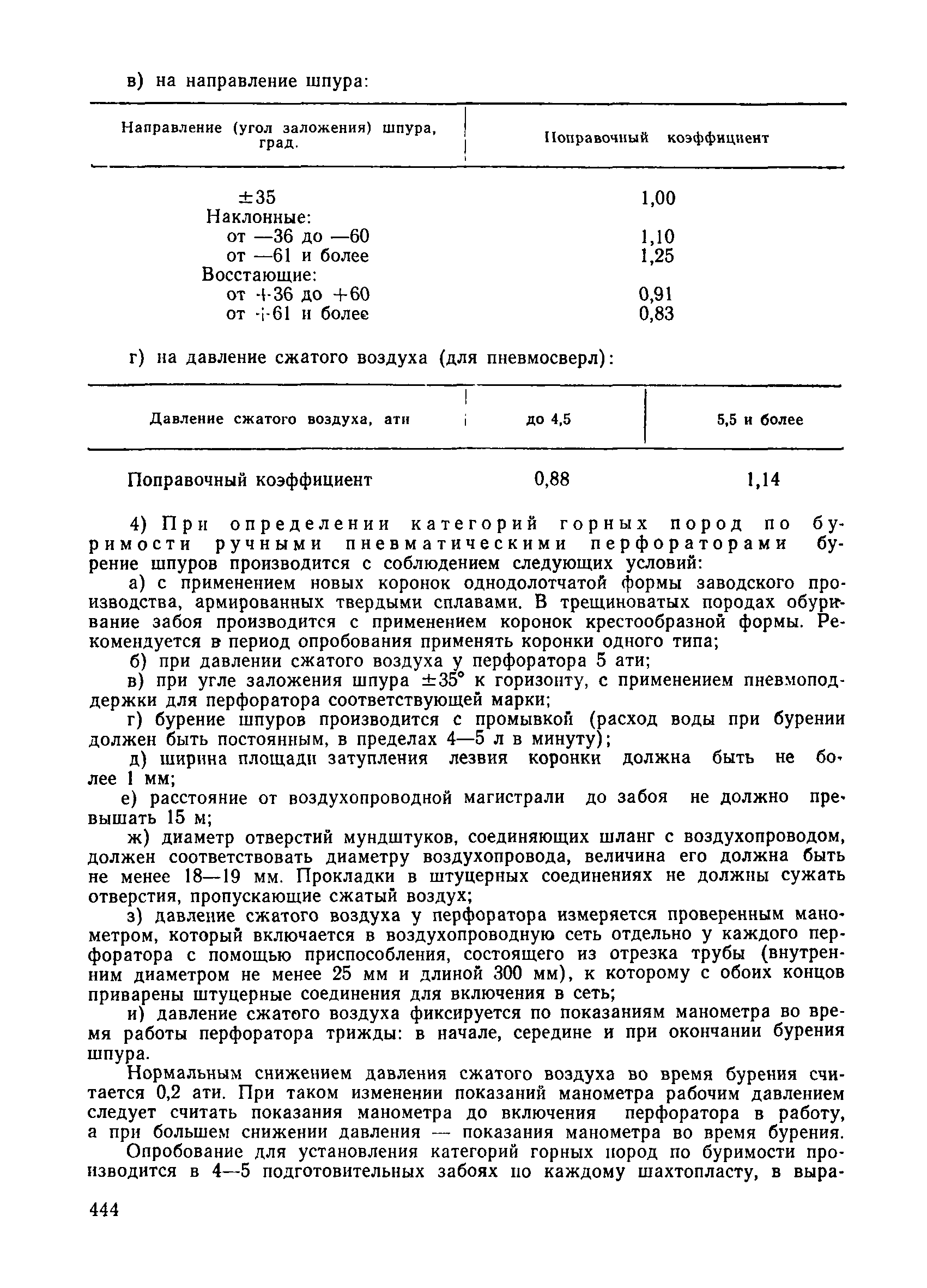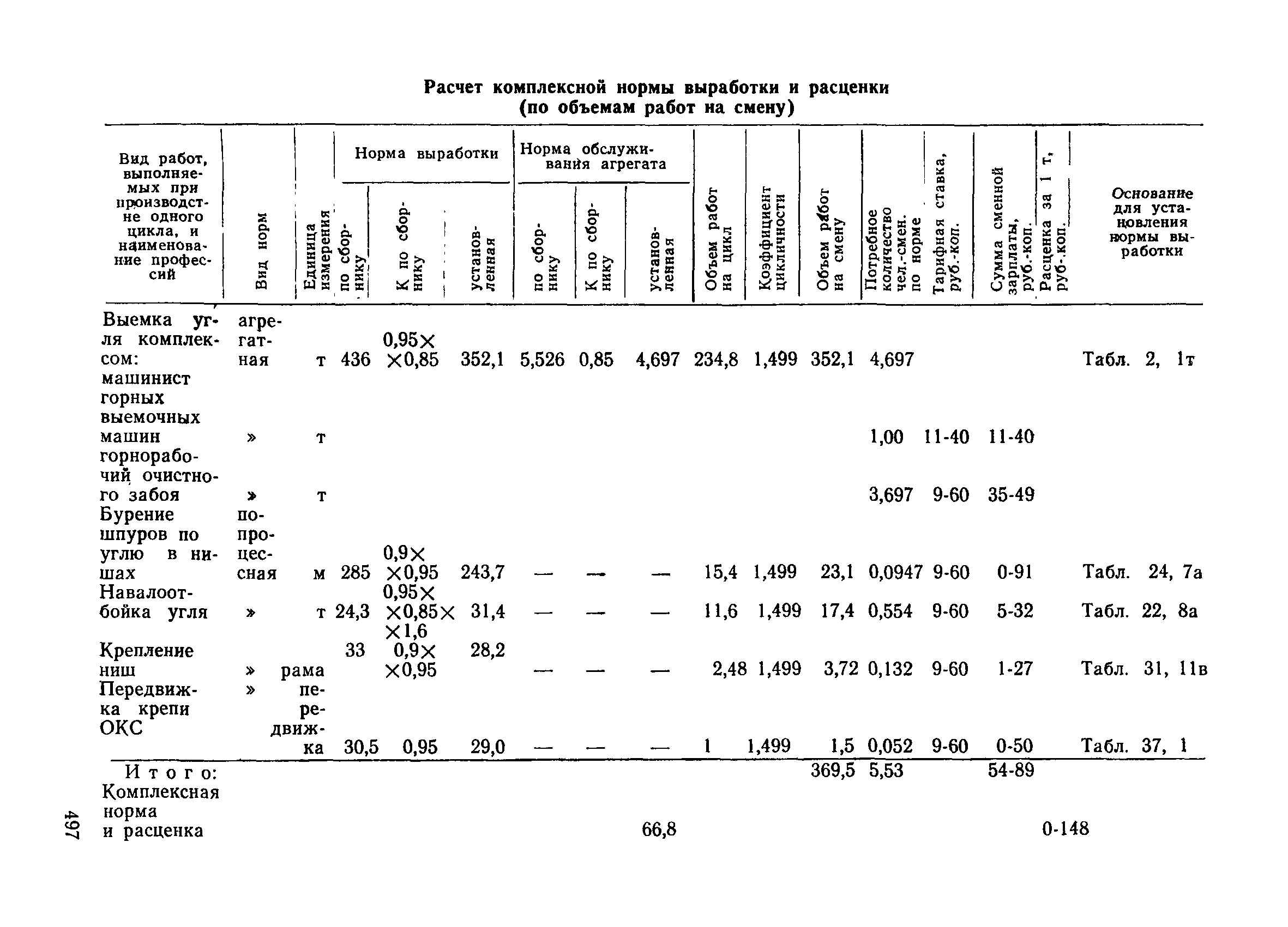 Единые нормы выработки (времени) для шахт производственного объединения "Приморскуголь"| Статус: | справочные материалы, мп, тпр | | Название рус.: | Единые нормы выработки (времени) для шахт производственного объединения "Приморскуголь" | | Дата добавления в базу: | 01.01.2018 | | Дата актуализации: | 01.01.2021 | | Область применения: | Единые нормы выработки (времени) обязательны для применения на всех действующих шахтах производственного объединения "Приморскуголь" | | Оглавление: | Общая часть Техническая часть Нормативная часть Раздел I. Очистные работы § 1. Выемка угля механизированными комплексами типа КМ-81 § 2. Выемка угля механизированными комплексами типов ОМКТ, ОКП, МК § 3. Выемка угля узкозахватными комбайнами типов КШ и ГШ-68 § 4. Оформление забоя после выемки угля узкозахватными комбайнами типов КШ и ГШ-68 § 5. Выемка угля узкозахватными комбайнами 1К-101, 2К-52, МК-67, БК-52 § 6. Оформление забоя после выемки угля узкозахватными комбайнами 1K-101, 2К-52, МК-67 и БК-52 § 7. Выемка угля комбайнами типов УКР, «Темп», КТ, А-70 в лавах на пластах наклонного и крутого падения § 8. Спуск (перегон) комбайнов типов УКР, «Темп», КТ, А-70 в лавах на пластах наклонного и крутого падения с передвижкой крана-балки § 9. Передвижка предохранительной лебедки 1ЛГКН § 10. Оформление забоя после выемки угля комбайнами типов УКР, «Темп», КТ, А-70 в лавах на пластах наклонного падения § 11. Выемка угля в лавах комбайном «Урал-2М» и подготовка его к выемке следующей полосы угля § 12. Оформление забоя после выемки угля комбайном «Урал-2М» § 13. Передвижка гидрофицированной посадочной крепи «Спутник» § 14. Выемка угля в лавах, оборудованных комбайнами К-56М A. Выемка угля Б. Разворот комбайна на пластах пологого падения B. Перегон комбайна § 15. Выемка угля проходческими комбайнами в очистных забоях на пластах пологого падения § 16. Навалоотбойка, навалка угля § 17. Бурение шпуров по углю ручными электросверлами (пневмосверлами) в лавах и камерах § 18. Уборка угля в очистных забоях с помощью скреперной установки § 19. Передвижка скреперной установки § 20. Выемка угля отбойными молотками § 21. Выемка угля с применением ВМ в очистных забоях на пластах крутого падения § 22. Крепление очистных забоев на пластах пологого и наклонного падения металлическими (клиновыми и гидравлическими) стойками § 23. Крепление очистных забоев деревянной крепью § 24. Возведение за комбайном временной деревянной крепи, предусмотренной паспортом крепления § 25. Навеска и снятие металлических шарнирных верхняков § 26. Затяжка кровли, почвы и забоя при креплении § 27. Передвижка специальной крепи типа ОКС на сопряжениях лав со штреками § 28. Установка рам на сопряжениях лав с прилегающими выработками § 29. Выбивка и извлечение металлических (клиновых и гидравлических) стоек в лавах на пластах пологого и наклонного падения при посадке кровли на металлическую органную крепь § 30. Возведение деревянной органной крепи § 31. Кладка и переноска деревянных костров § 32. Установка распорной крепи в очистных забоях § 33. Посадка кровли при помощи лебедки § 34. Бурение шпуров в стойках при посадке кровли с помощью малогабаритных патронов § 35. Передвижка перегружателей гидродомкратом при помощи упорной стойки § 36. Переноска рештаков (листов) в лавах на пластах пологого и наклонного падения § 37. Переноска деревянных рештаков (откосов) в лавах на пластах круто