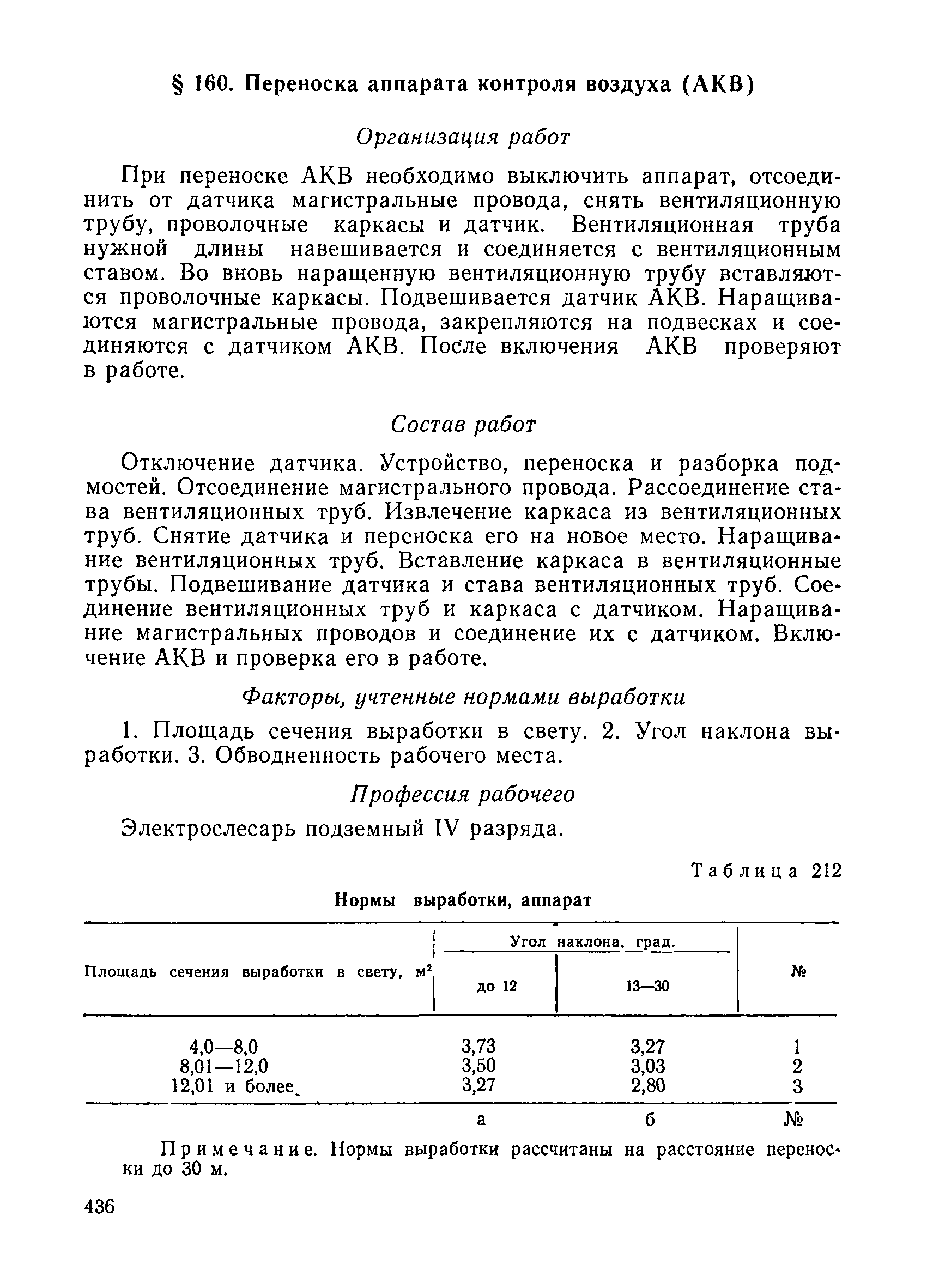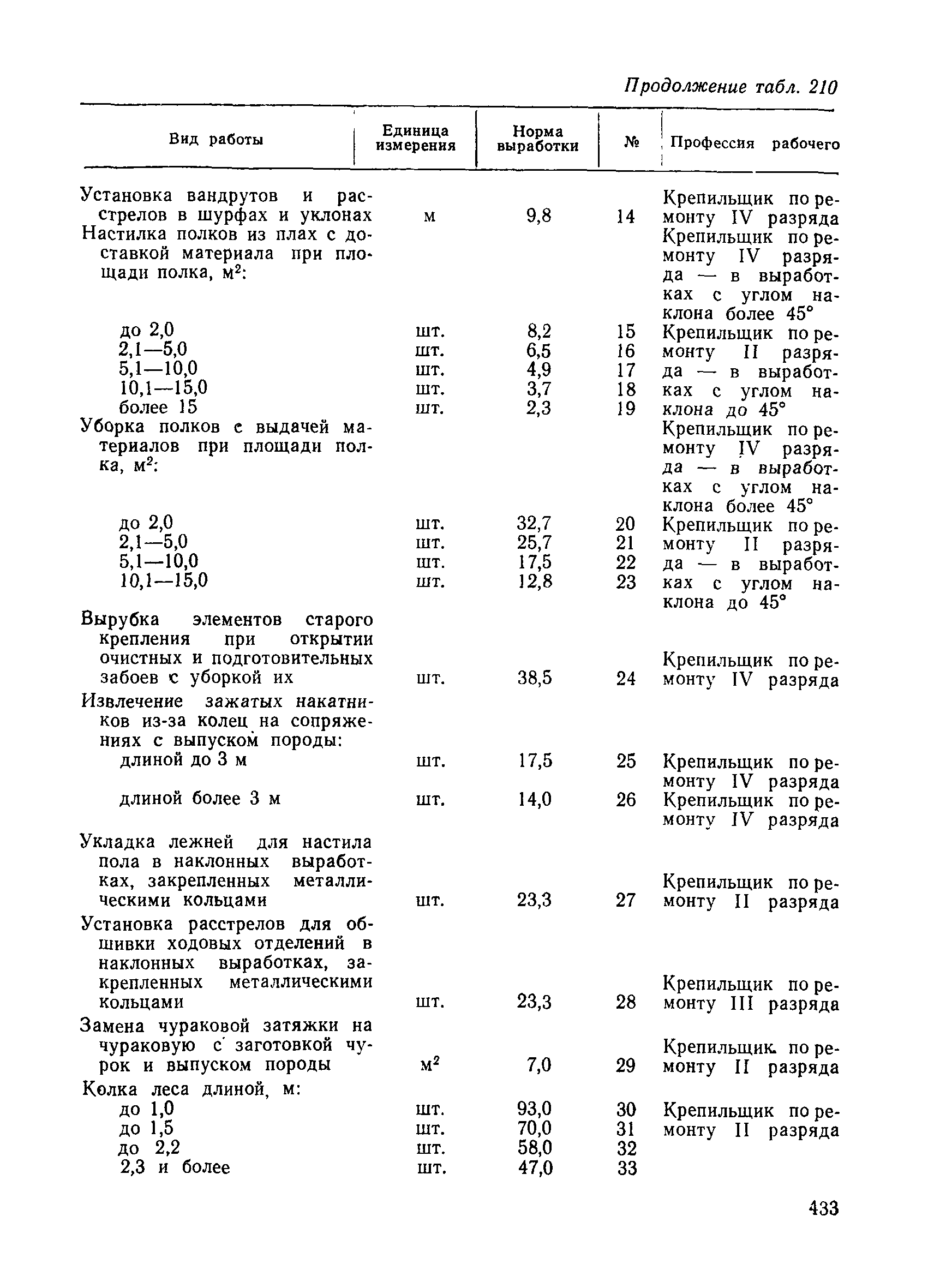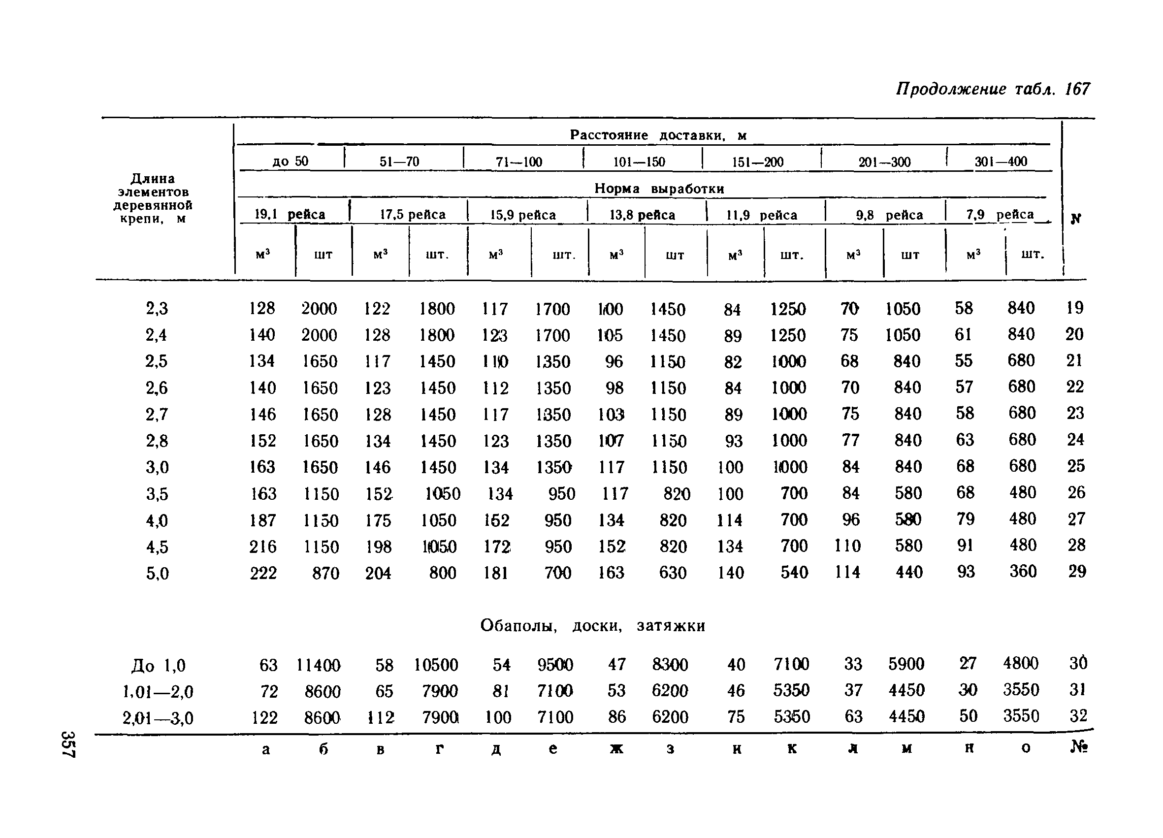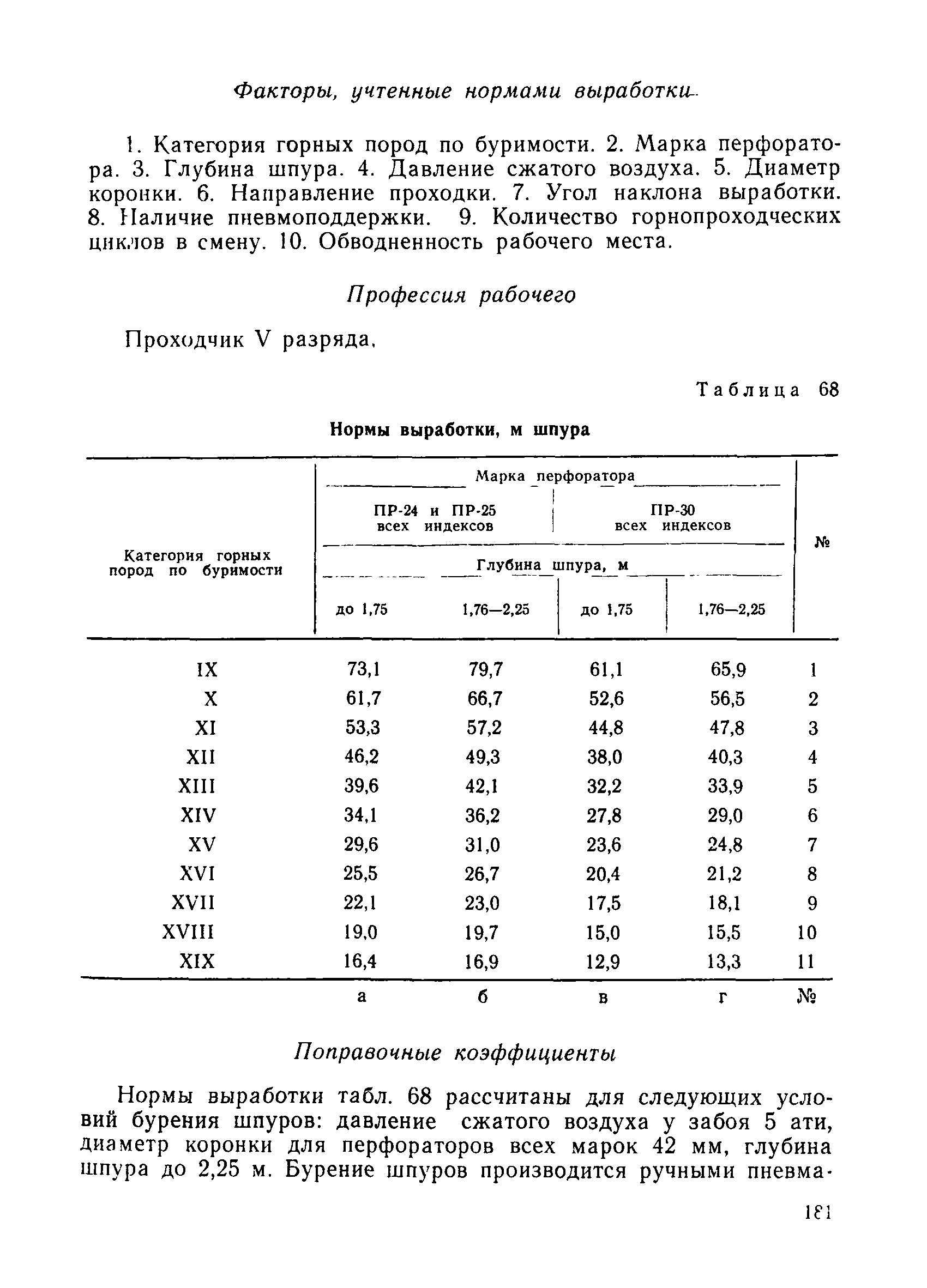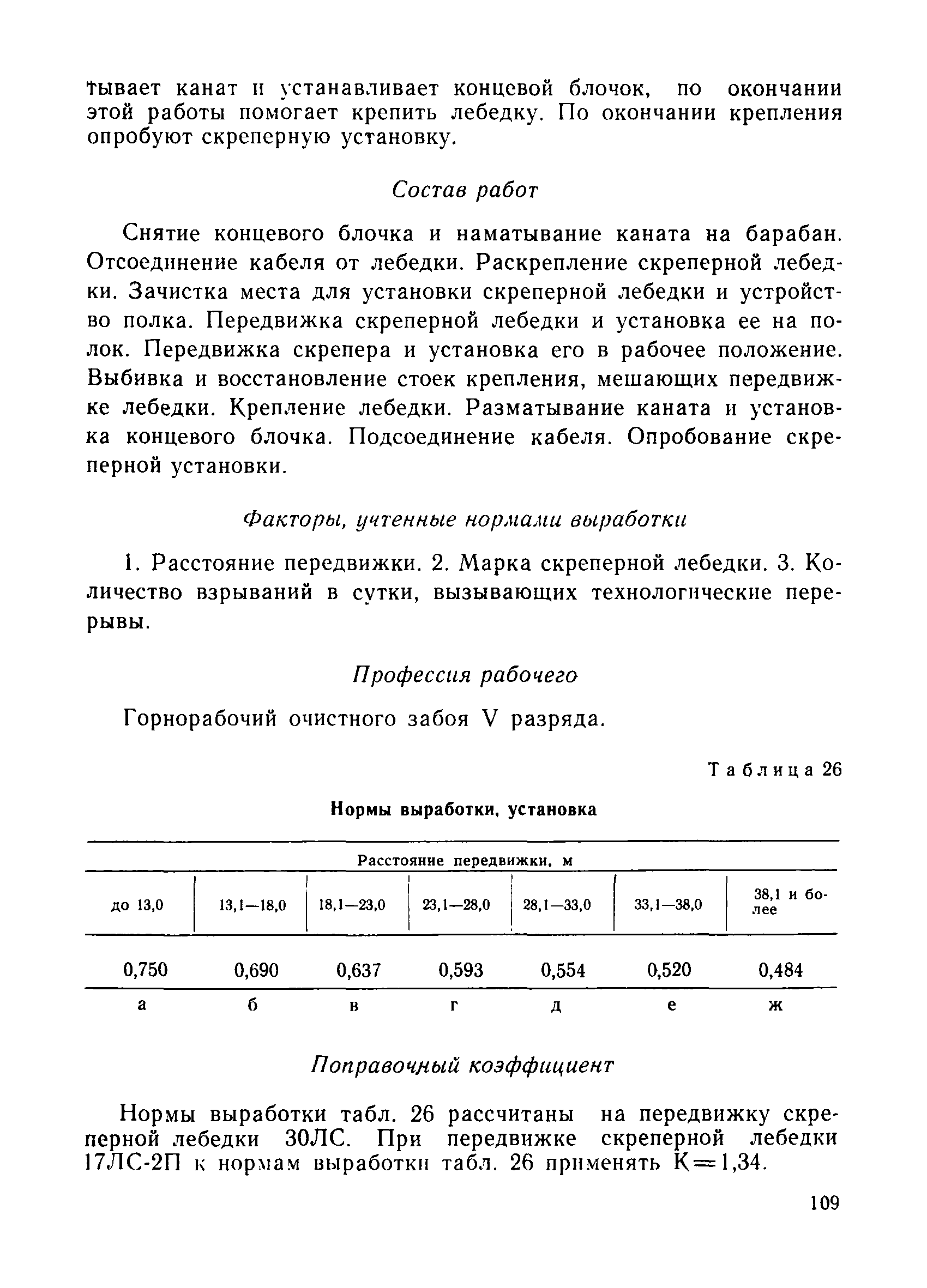 Единые нормы выработки (времени) для шахт производственного объединения "Приморскуголь"| Статус: | справочные материалы, мп, тпр | | Название рус.: | Единые нормы выработки (времени) для шахт производственного объединения "Приморскуголь" | | Дата добавления в базу: | 01.01.2018 | | Дата актуализации: | 01.01.2021 | | Область применения: | Единые нормы выработки (времени) обязательны для применения на всех действующих шахтах производственного объединения "Приморскуголь" | | Оглавление: | Общая часть Техническая часть Нормативная часть Раздел I. Очистные работы § 1. Выемка угля механизированными комплексами типа КМ-81 § 2. Выемка угля механизированными комплексами типов ОМКТ, ОКП, МК § 3. Выемка угля узкозахватными комбайнами типов КШ и ГШ-68 § 4. Оформление забоя после выемки угля узкозахватными комбайнами типов КШ и ГШ-68 § 5. Выемка угля узкозахватными комбайнами 1К-101, 2К-52, МК-67, БК-52 § 6. Оформление забоя после выемки угля узкозахватными комбайнами 1K-101, 2К-52, МК-67 и БК-52 § 7. Выемка угля комбайнами типов УКР, «Темп», КТ, А-70 в лавах на пластах наклонного и крутого падения § 8. Спуск (перегон) комбайнов типов УКР, «Темп», КТ, А-70 в лавах на пластах наклонного и крутого падения с передвижкой крана-балки § 9. Передвижка предохранительной лебедки 1ЛГКН § 10. Оформление забоя после выемки угля комбайнами типов УКР, «Темп», КТ, А-70 в лавах на пластах наклонного падения § 11. Выемка угля в лавах комбайном «Урал-2М» и подготовка его к выемке следующей полосы угля § 12. Оформление забоя после выемки угля комбайном «Урал-2М» § 13. Передвижка гидрофицированной посадочной крепи «Спутник» § 14. Выемка угля в лавах, оборудованных комбайнами К-56М A. Выемка угля Б. Разворот комбайна на пластах пологого падения B. Перегон комбайна § 15. Выемка угля проходческими комбайнами в очистных забоях на пластах пологого падения § 16. Навалоотбойка, навалка угля § 17. Бурение шпуров по углю ручными электросверлами (пневмосверлами) в лавах и камерах § 18. Уборка угля в очистных забоях с помощью скреперной установки § 19. Передвижка скреперной установки § 20. Выемка угля отбойными молотками § 21. Выемка угля с применением ВМ в очистных забоях на пластах крутого падения § 22. Крепление очистных забоев на пластах пологого и наклонного падения металлическими (клиновыми и гидравлическими) стойками § 23. Крепление очистных забоев деревянной крепью § 24. Возведение за комбайном временной деревянной крепи, предусмотренной паспортом крепления § 25. Навеска и снятие металлических шарнирных верхняков § 26. Затяжка кровли, почвы и забоя при креплении § 27. Передвижка специальной крепи типа ОКС на сопряжениях лав со штреками § 28. Установка рам на сопряжениях лав с прилегающими выработками § 29. Выбивка и извлечение металлических (клиновых и гидравлических) стоек в лавах на пластах пологого и наклонного падения при посадке кровли на металлическую органную крепь § 30. Возведение деревянной органной крепи § 31. Кладка и переноска деревянных костров § 32. Установка распорной крепи в очистных забоях § 33. Посадка кровли при помощи лебедки § 34. Бурение шпуров в стойках при посадке кровли с помощью малогабаритных патронов § 35. Передвижка перегружателей гидродомкратом при помощи упорной стойки § 36. Переноска рештаков (листов) в лавах на пластах пологого и наклонного падения § 37. Переноска деревянных рештаков (откосов) в лавах на пластах круто