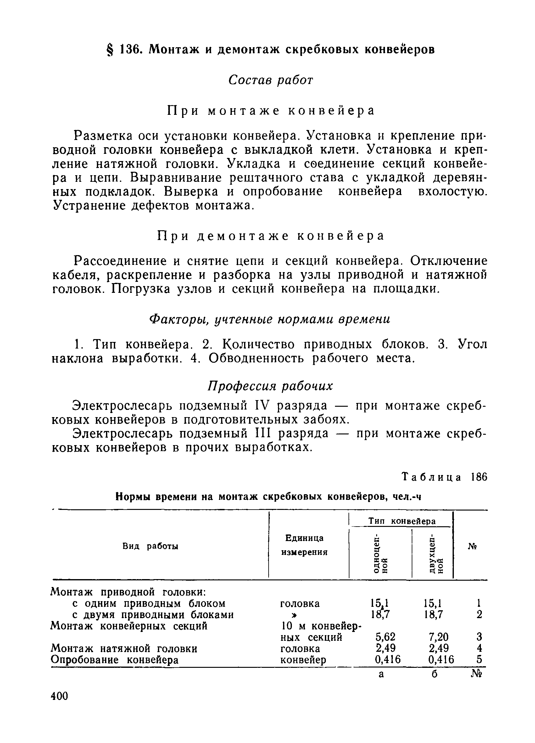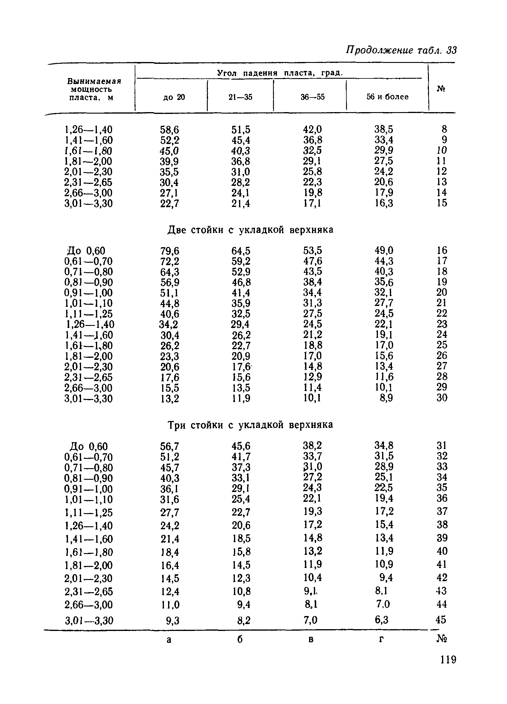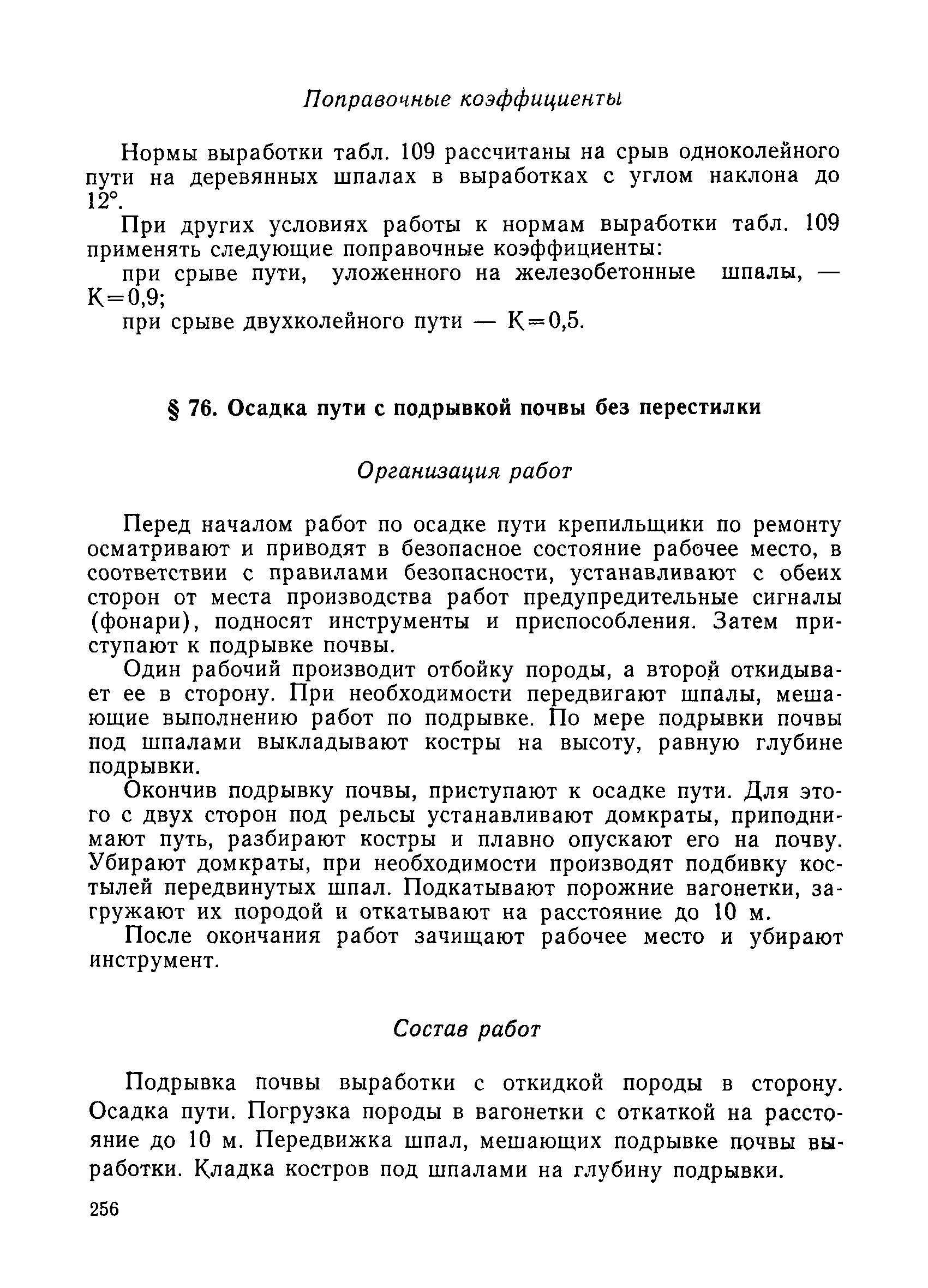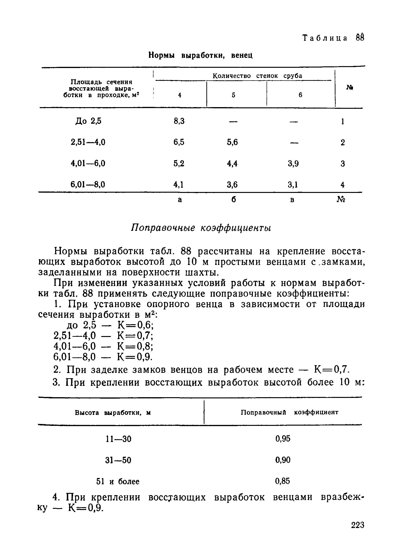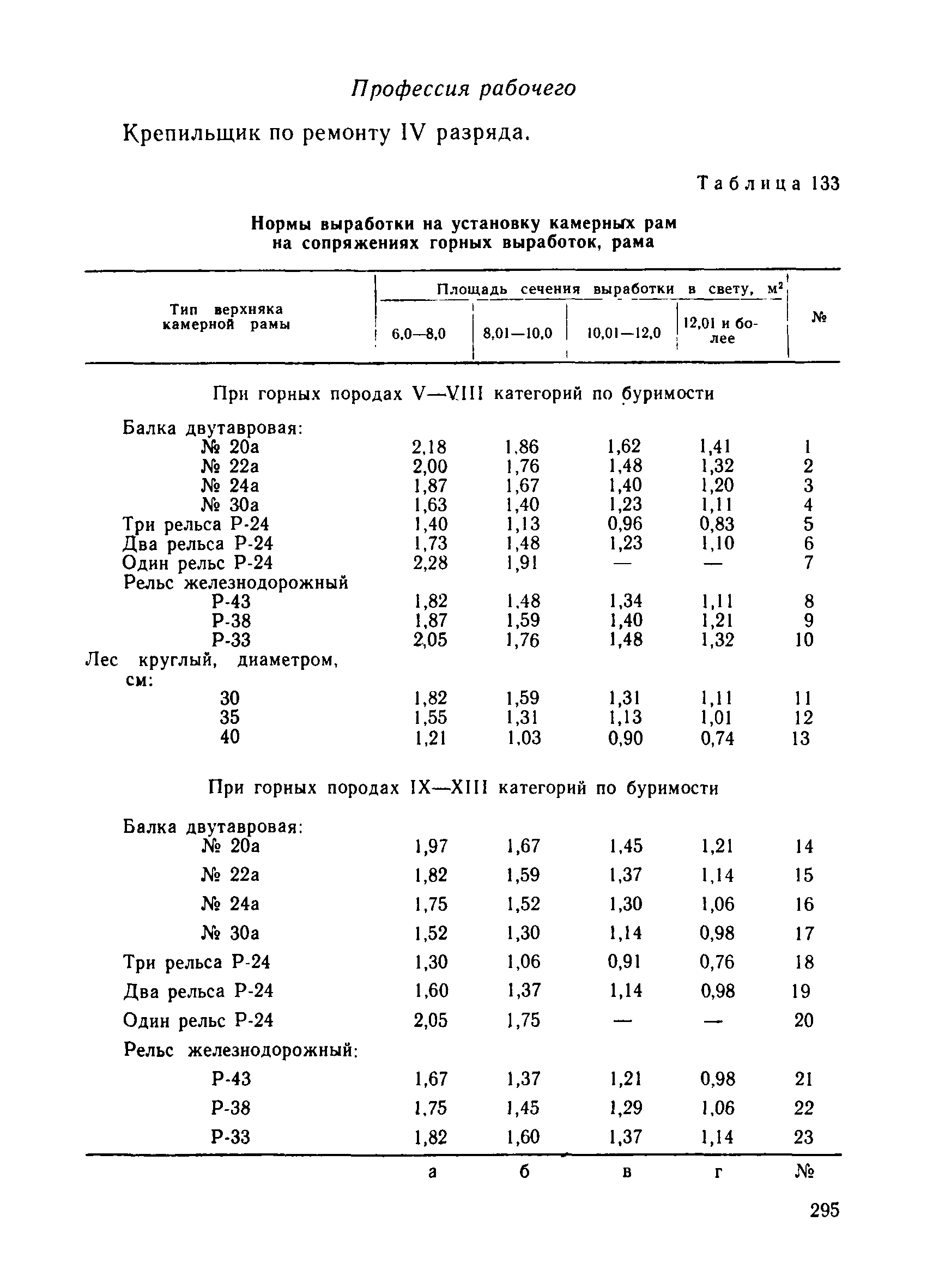 Единые нормы выработки (времени) для шахт производственного объединения "Приморскуголь"| Статус: | справочные материалы, мп, тпр | | Название рус.: | Единые нормы выработки (времени) для шахт производственного объединения "Приморскуголь" | | Дата добавления в базу: | 01.01.2018 | | Дата актуализации: | 01.01.2021 | | Область применения: | Единые нормы выработки (времени) обязательны для применения на всех действующих шахтах производственного объединения "Приморскуголь" | | Оглавление: | Общая часть Техническая часть Нормативная часть Раздел I. Очистные работы § 1. Выемка угля механизированными комплексами типа КМ-81 § 2. Выемка угля механизированными комплексами типов ОМКТ, ОКП, МК § 3. Выемка угля узкозахватными комбайнами типов КШ и ГШ-68 § 4. Оформление забоя после выемки угля узкозахватными комбайнами типов КШ и ГШ-68 § 5. Выемка угля узкозахватными комбайнами 1К-101, 2К-52, МК-67, БК-52 § 6. Оформление забоя после выемки угля узкозахватными комбайнами 1K-101, 2К-52, МК-67 и БК-52 § 7. Выемка угля комбайнами типов УКР, «Темп», КТ, А-70 в лавах на пластах наклонного и крутого падения § 8. Спуск (перегон) комбайнов типов УКР, «Темп», КТ, А-70 в лавах на пластах наклонного и крутого падения с передвижкой крана-балки § 9. Передвижка предохранительной лебедки 1ЛГКН § 10. Оформление забоя после выемки угля комбайнами типов УКР, «Темп», КТ, А-70 в лавах на пластах наклонного падения § 11. Выемка угля в лавах комбайном «Урал-2М» и подготовка его к выемке следующей полосы угля § 12. Оформление забоя после выемки угля комбайном «Урал-2М» § 13. Передвижка гидрофицированной посадочной крепи «Спутник» § 14. Выемка угля в лавах, оборудованных комбайнами К-56М A. Выемка угля Б. Разворот комбайна на пластах пологого падения B. Перегон комбайна § 15. Выемка угля проходческими комбайнами в очистных забоях на пластах пологого падения § 16. Навалоотбойка, навалка угля § 17. Бурение шпуров по углю ручными электросверлами (пневмосверлами) в лавах и камерах § 18. Уборка угля в очистных забоях с помощью скреперной установки § 19. Передвижка скреперной установки § 20. Выемка угля отбойными молотками § 21. Выемка угля с применением ВМ в очистных забоях на пластах крутого падения § 22. Крепление очистных забоев на пластах пологого и наклонного падения металлическими (клиновыми и гидравлическими) стойками § 23. Крепление очистных забоев деревянной крепью § 24. Возведение за комбайном временной деревянной крепи, предусмотренной паспортом крепления § 25. Навеска и снятие металлических шарнирных верхняков § 26. Затяжка кровли, почвы и забоя при креплении § 27. Передвижка специальной крепи типа ОКС на сопряжениях лав со штреками § 28. Установка рам на сопряжениях лав с прилегающими выработками § 29. Выбивка и извлечение металлических (клиновых и гидравлических) стоек в лавах на пластах пологого и наклонного падения при посадке кровли на металлическую органную крепь § 30. Возведение деревянной органной крепи § 31. Кладка и переноска деревянных костров § 32. Установка распорной крепи в очистных забоях § 33. Посадка кровли при помощи лебедки § 34. Бурение шпуров в стойках при посадке кровли с помощью малогабаритных патронов § 35. Передвижка перегружателей гидродомкратом при помощи упорной стойки § 36. Переноска рештаков (листов) в лавах на пластах пологого и наклонного падения § 37. Переноска деревянных рештаков (откосов) в лавах на пластах круто