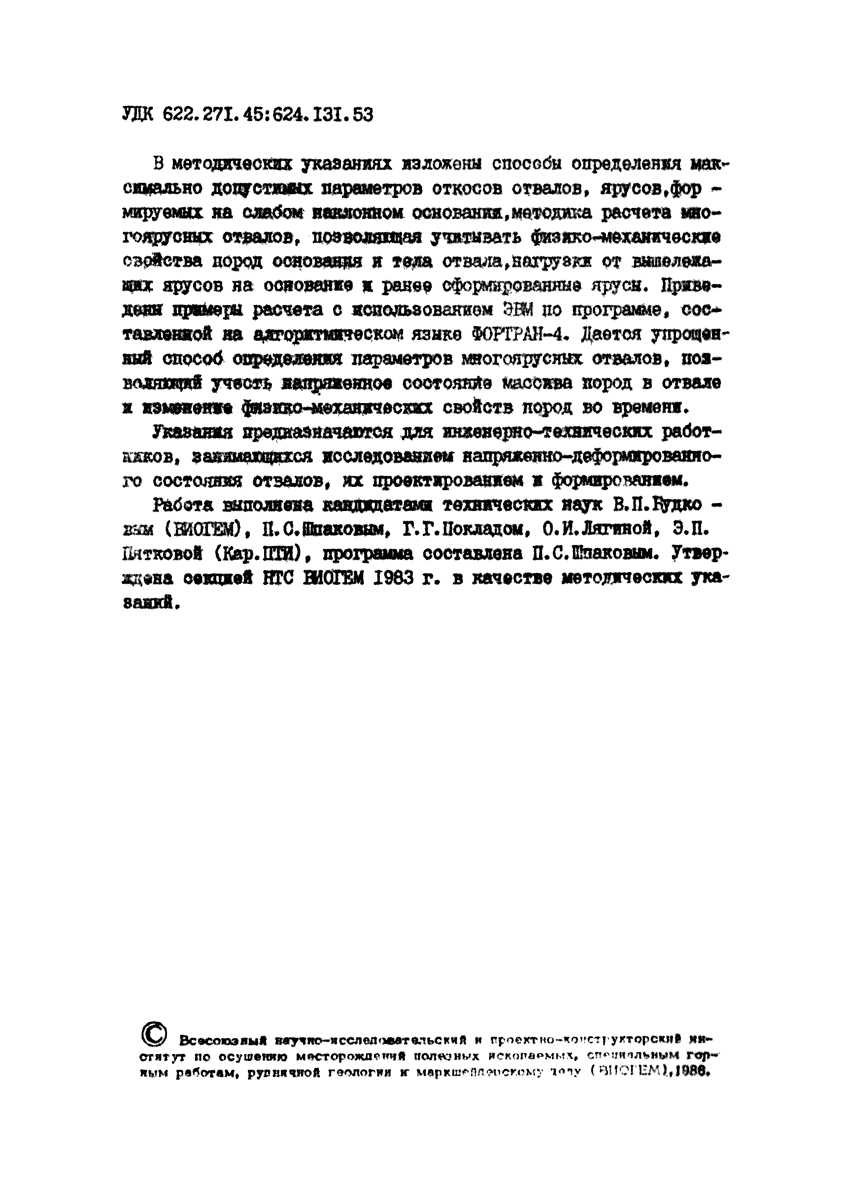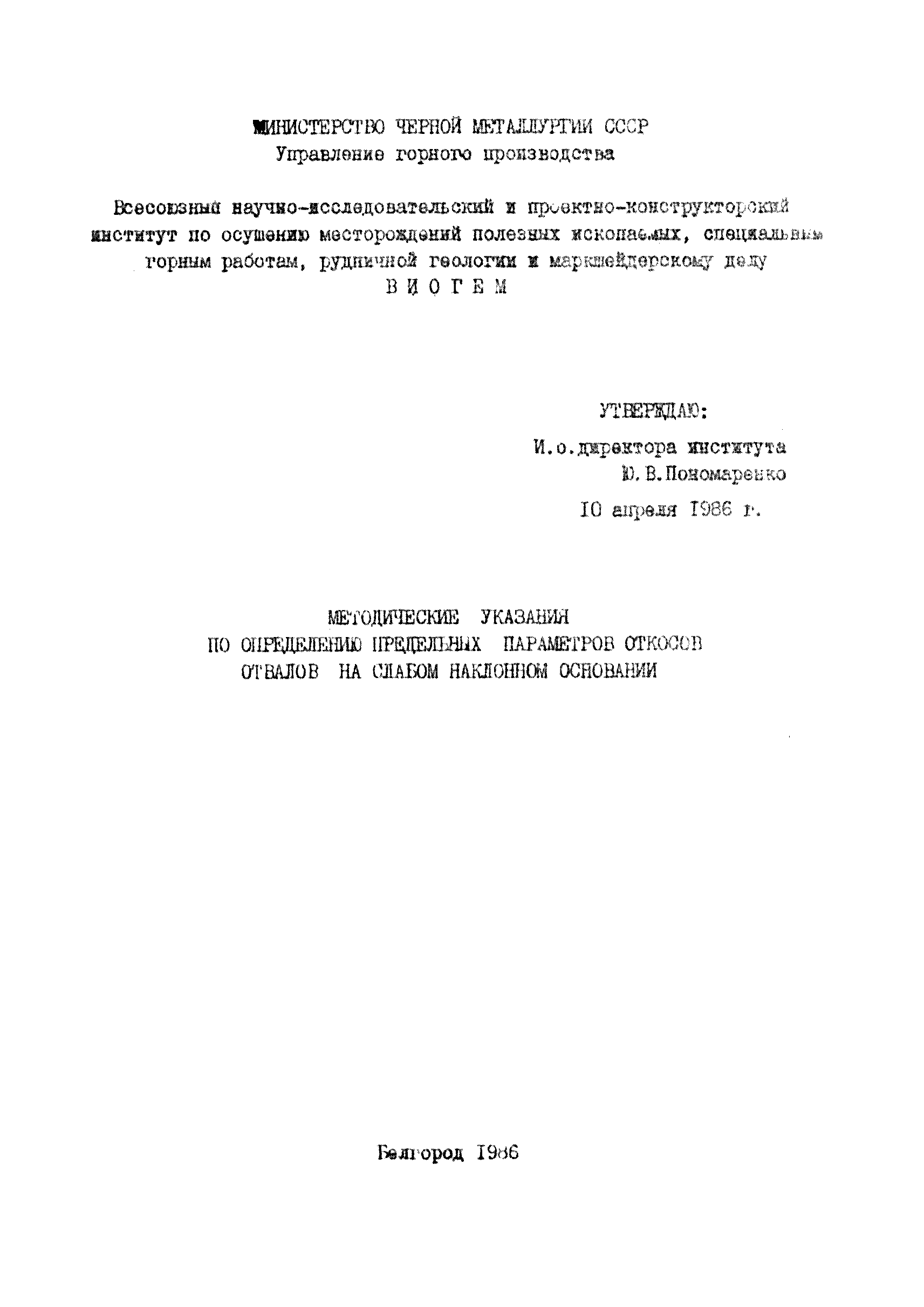 | Название рус.: | Методические указания по определению предельных параметров откосов отвалов на слабом наклонном основании |