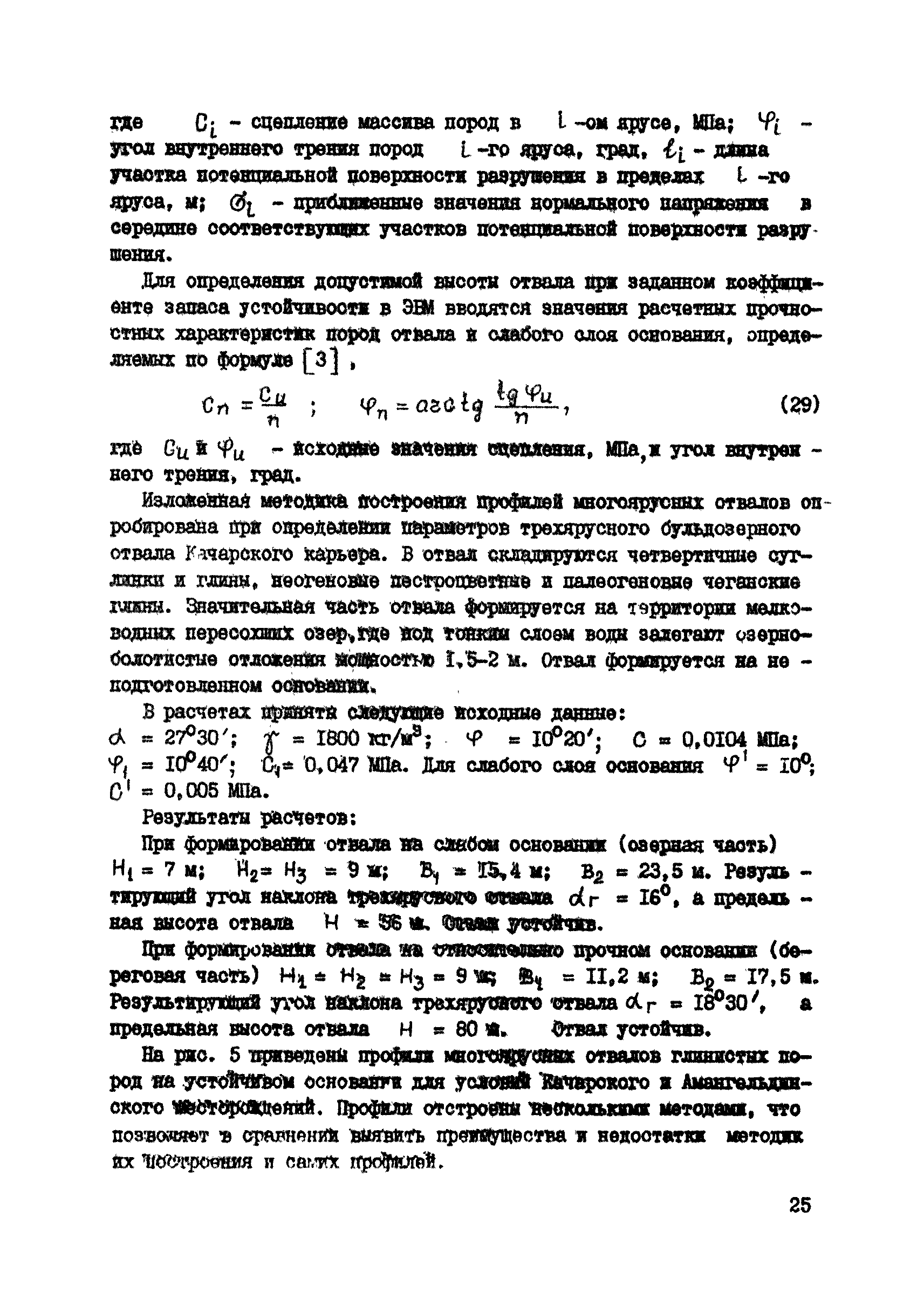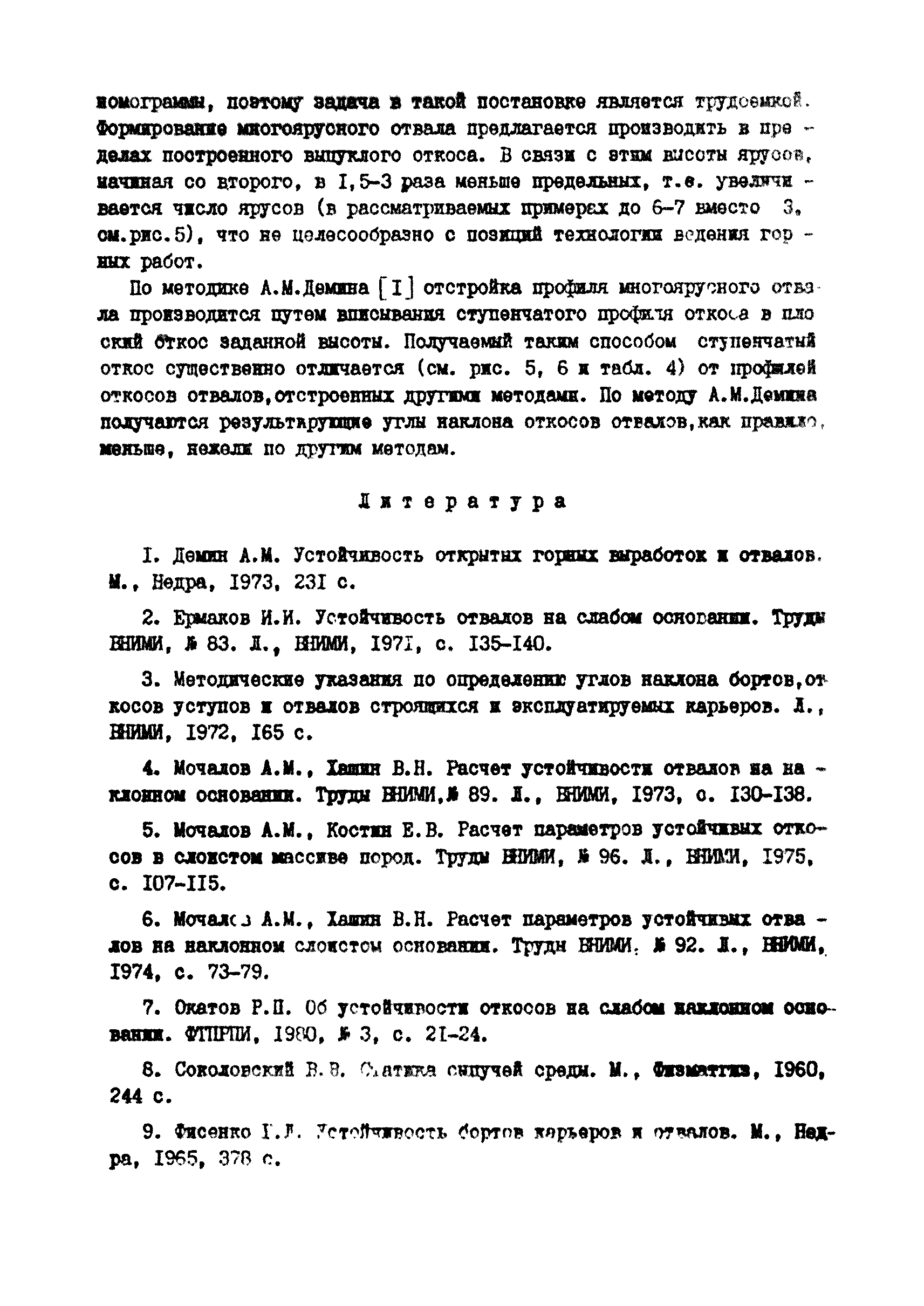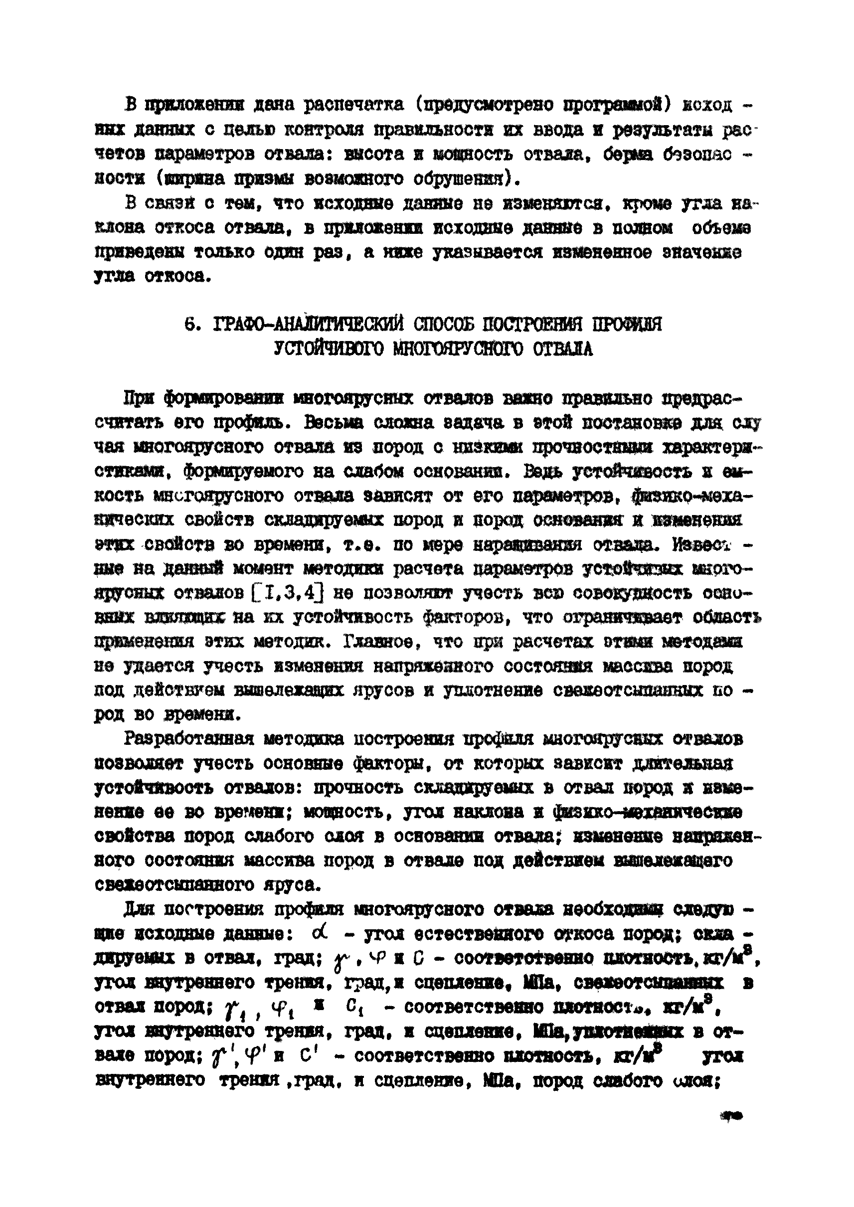 | Оглавление: | Общие положения 1 Краткий анализ применяемых методов расчета 2 Механизм формирования нарушений устойчивости отвалов на слабом основании 3 Обоснование методики расчета параметров отвалов на слабом основании 4 Сравнительный анализ результатов расчетов параметров отваловна слабом основании 5 Пример расчета параметров отвала на ЭВМ по разработанной программе 6 Графо-аналитический способ построения профиля устойчивого многоярусного отвала Литература Приложение. Распечатка контрольного примера |