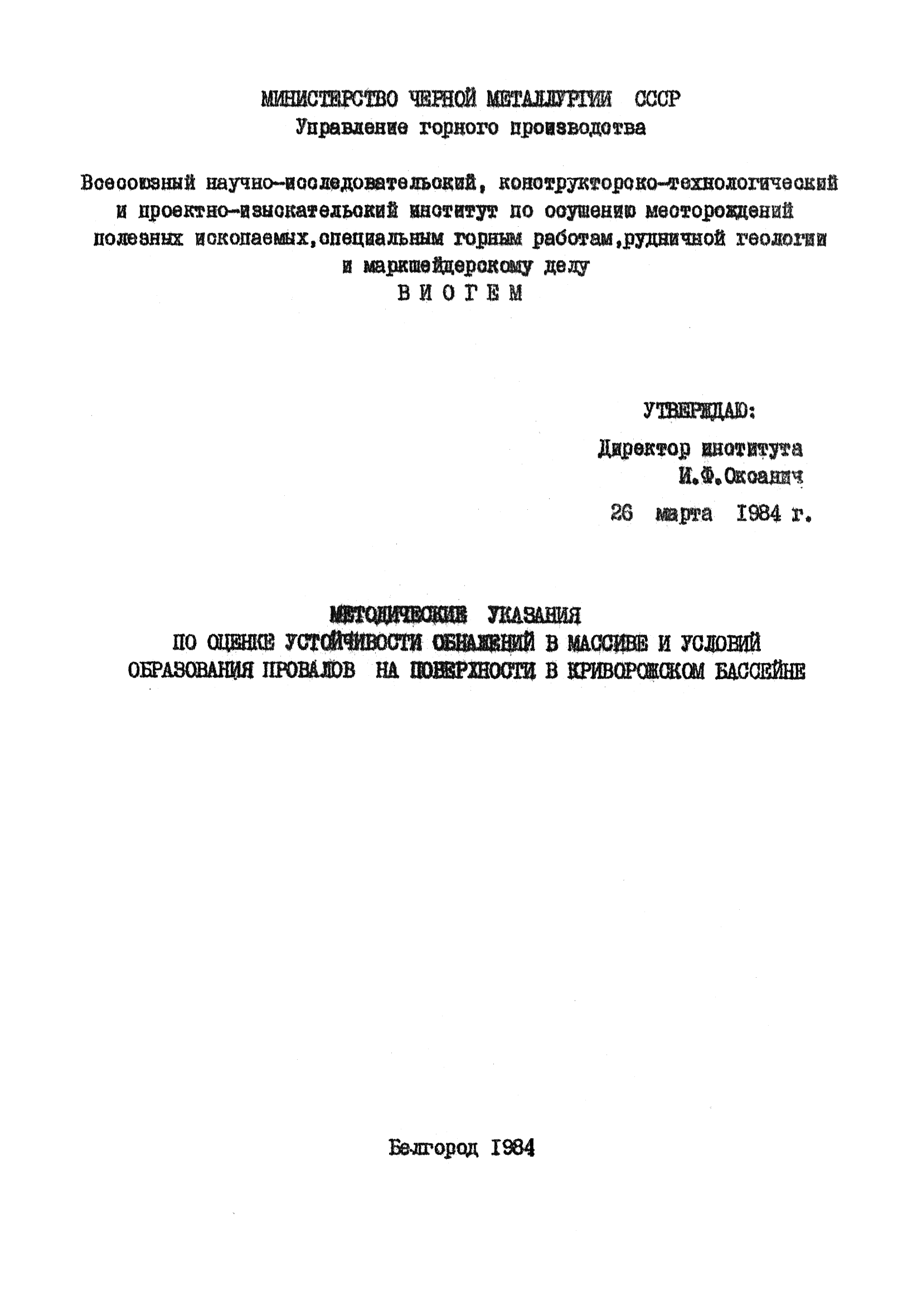 Скачать Методические указания по оценке устойчивости обнажений в массиве и условий образования провалов на поверхности в Криворожском бассейнеДата актуализации: 01.01.2021