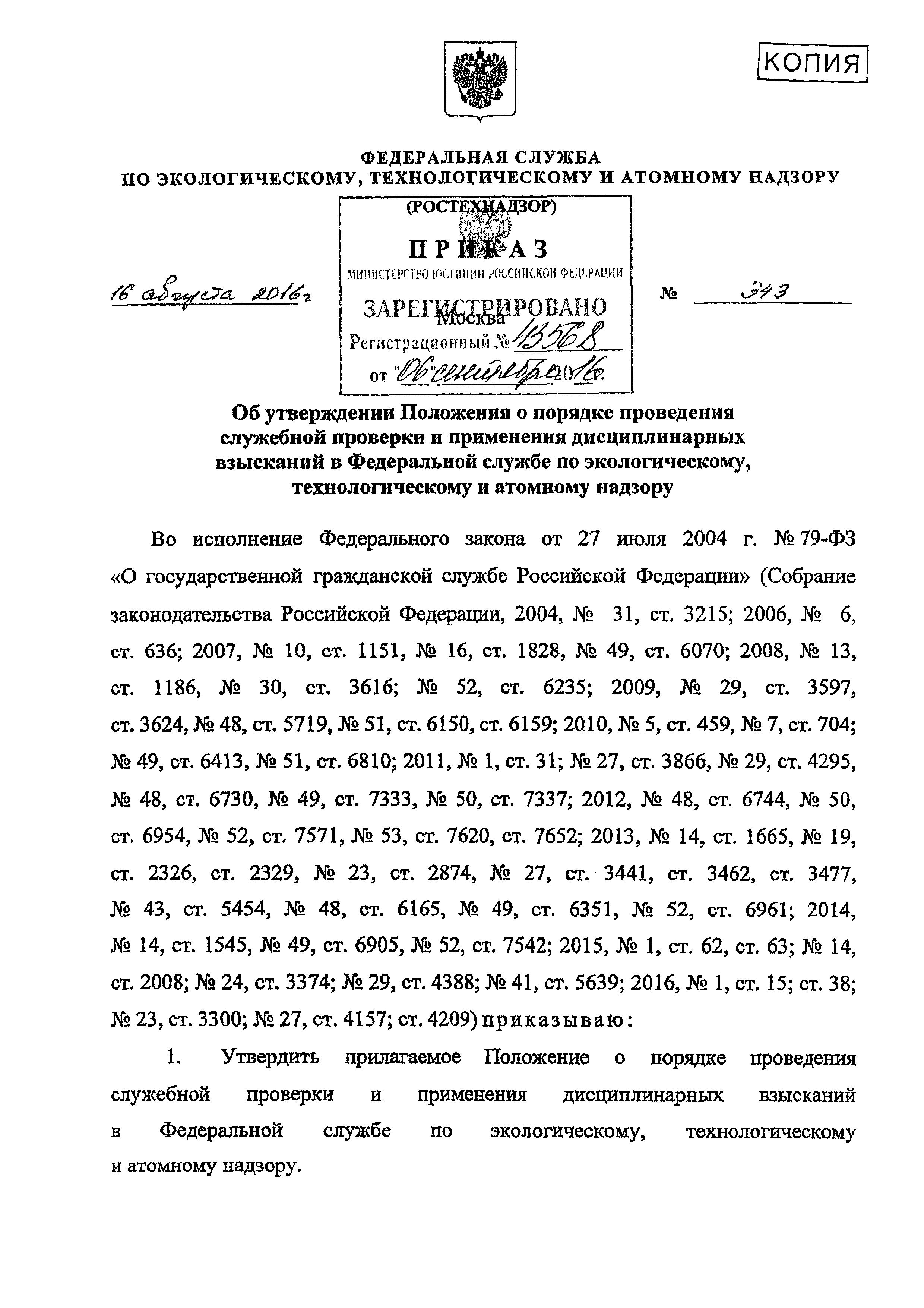 | Название рус.: | Положение о порядке проведения служебной проверки и применения дисциплинарных взысканий в Федеральной службе по экологическому, технологическому и атомному надзору |