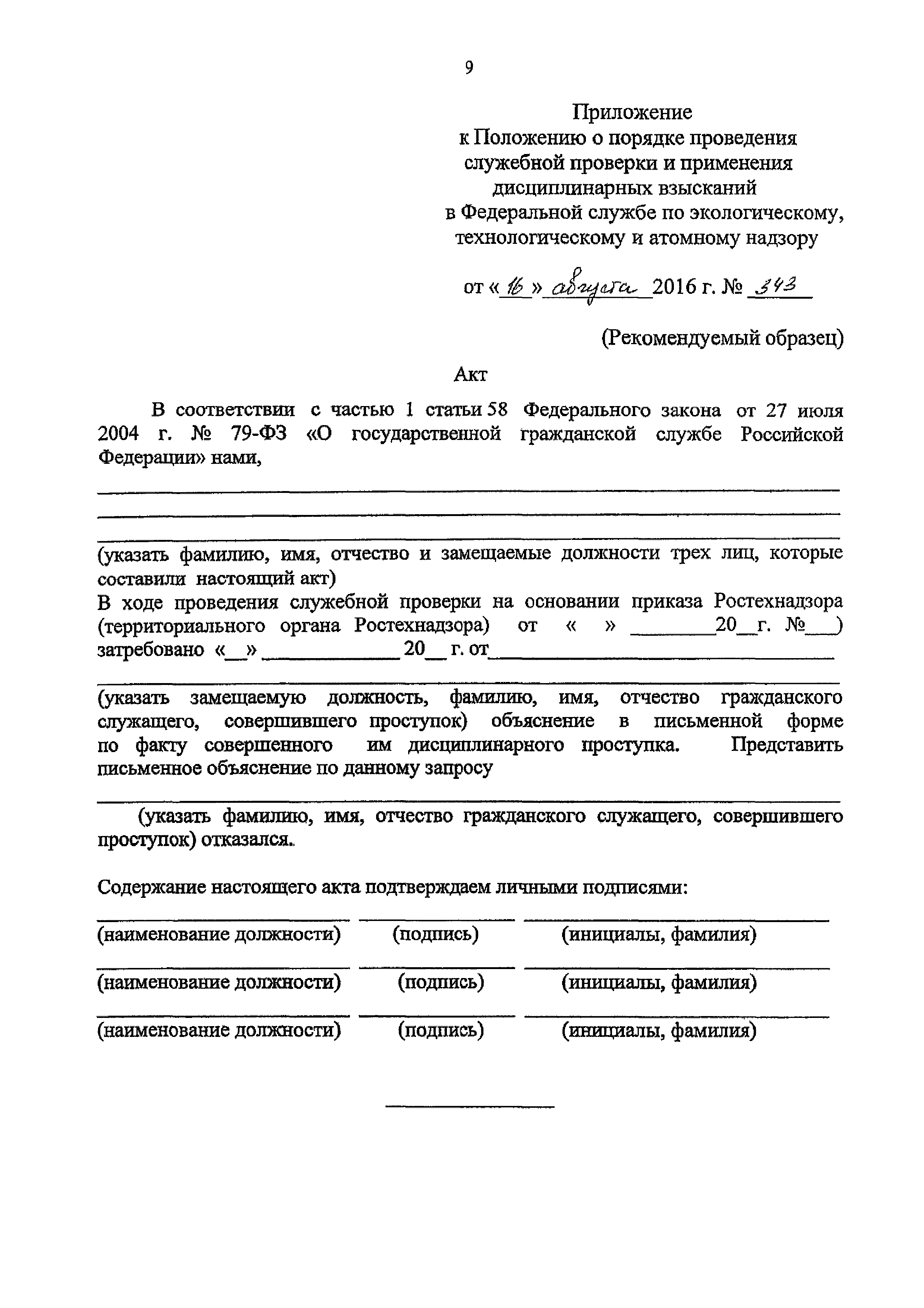 | Оглавление: | I Общие положения II Порядок проведения служебной проверки III Права гражданского служащего, в отношении которого проводится служебная проверка IV Порядок составления и представления заключения по результатам проведения служебной проверки V Порядок применения и снятия дисциплинарных взысканий Приложение. Рекомендуемый образец акта |