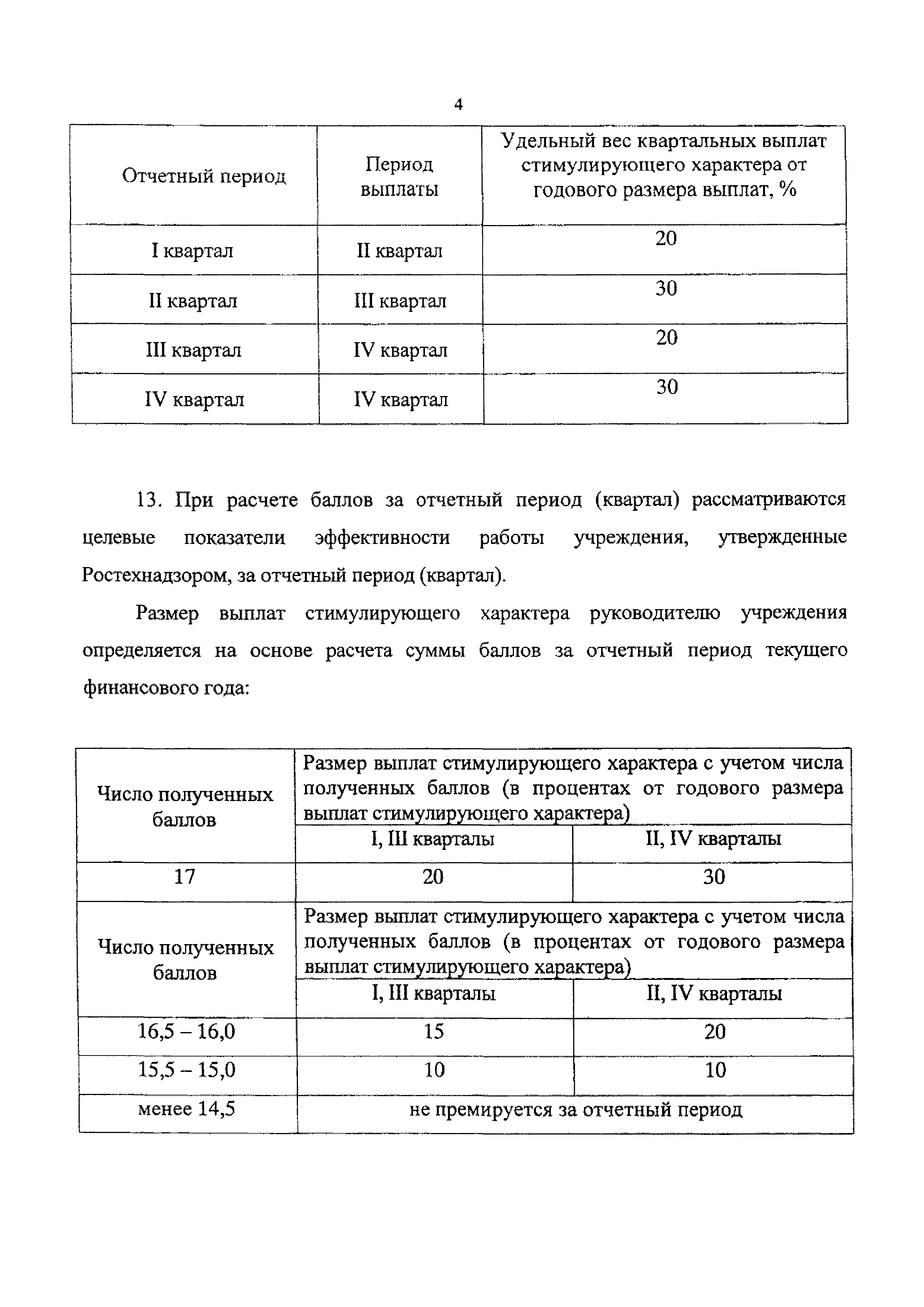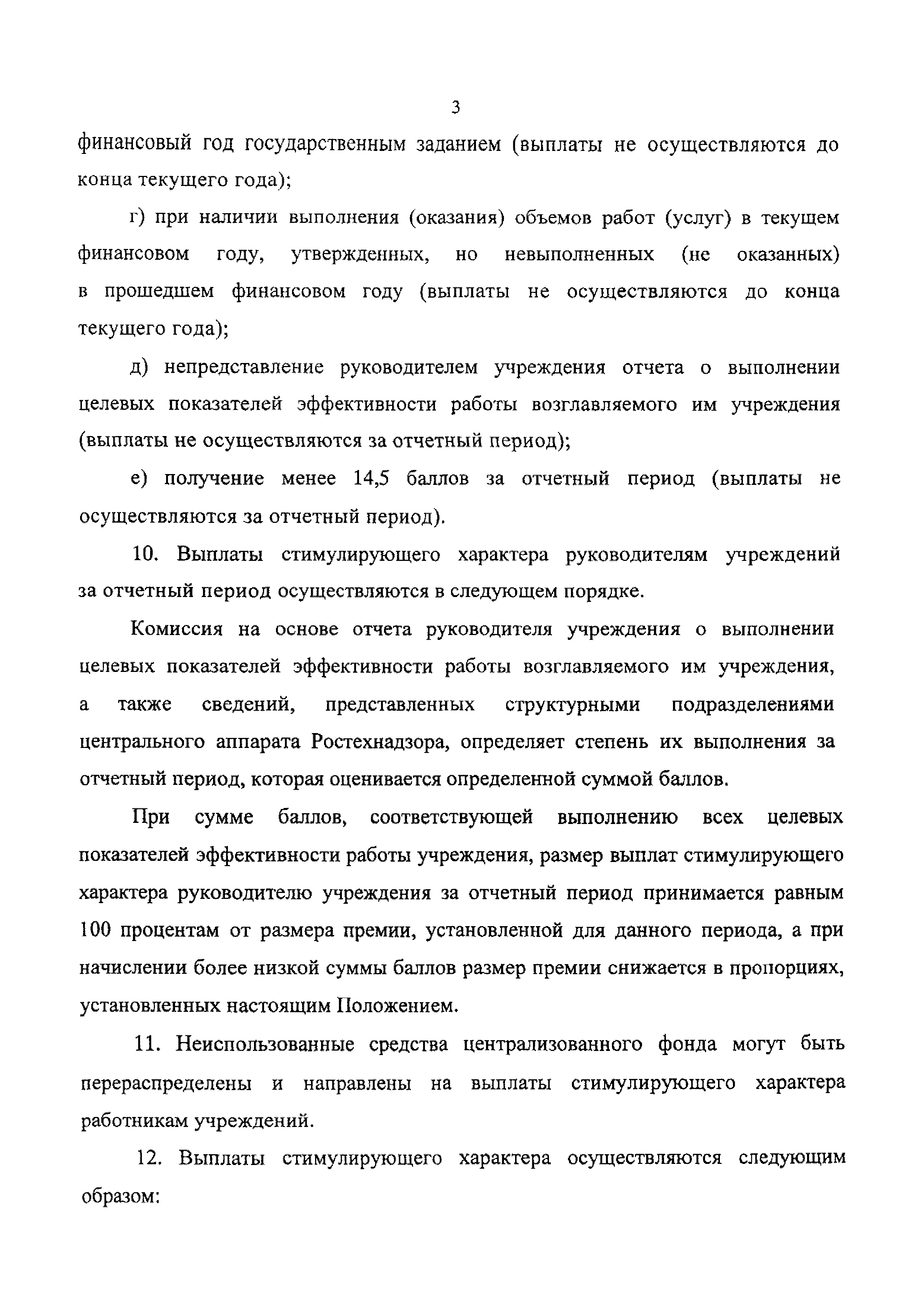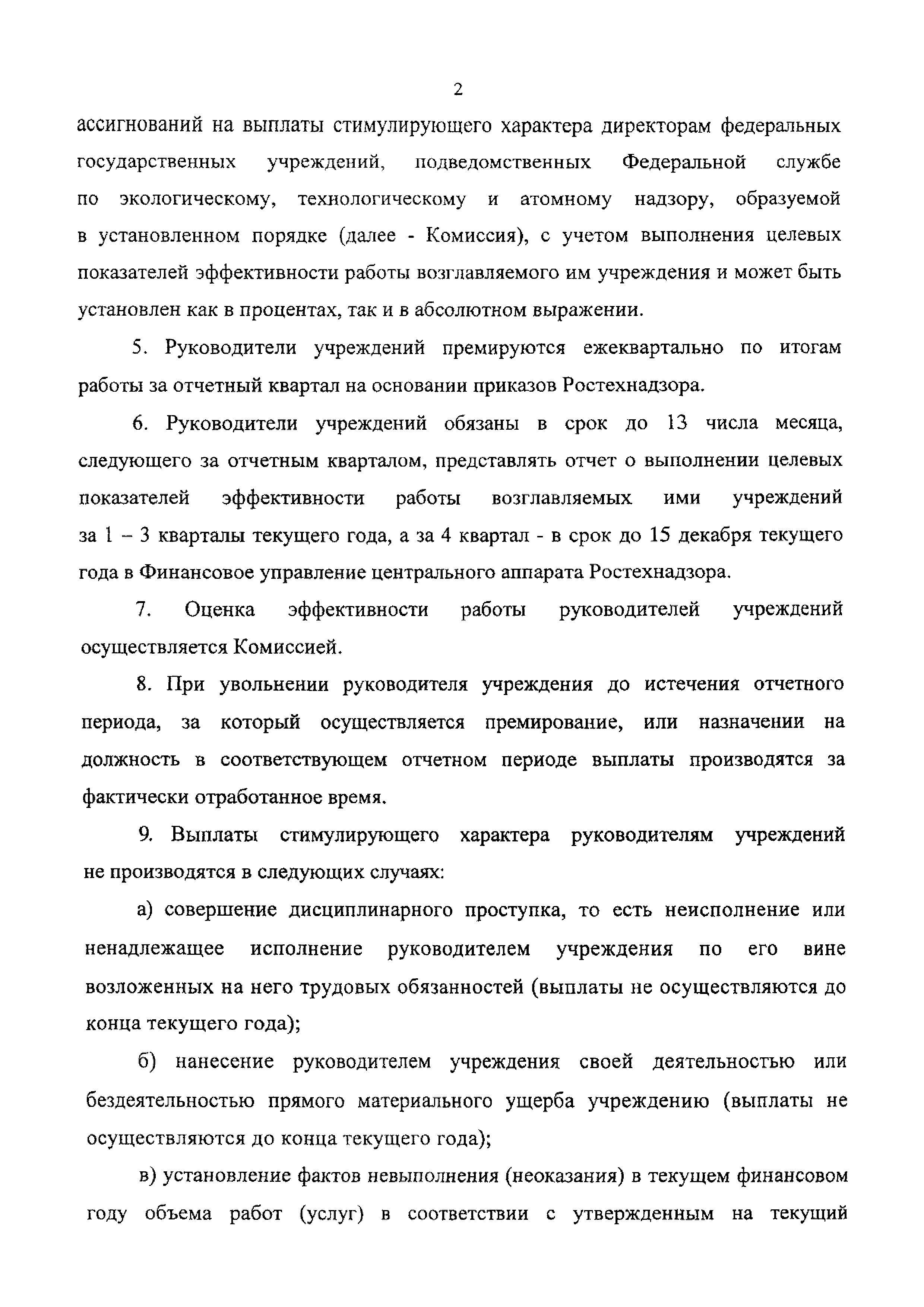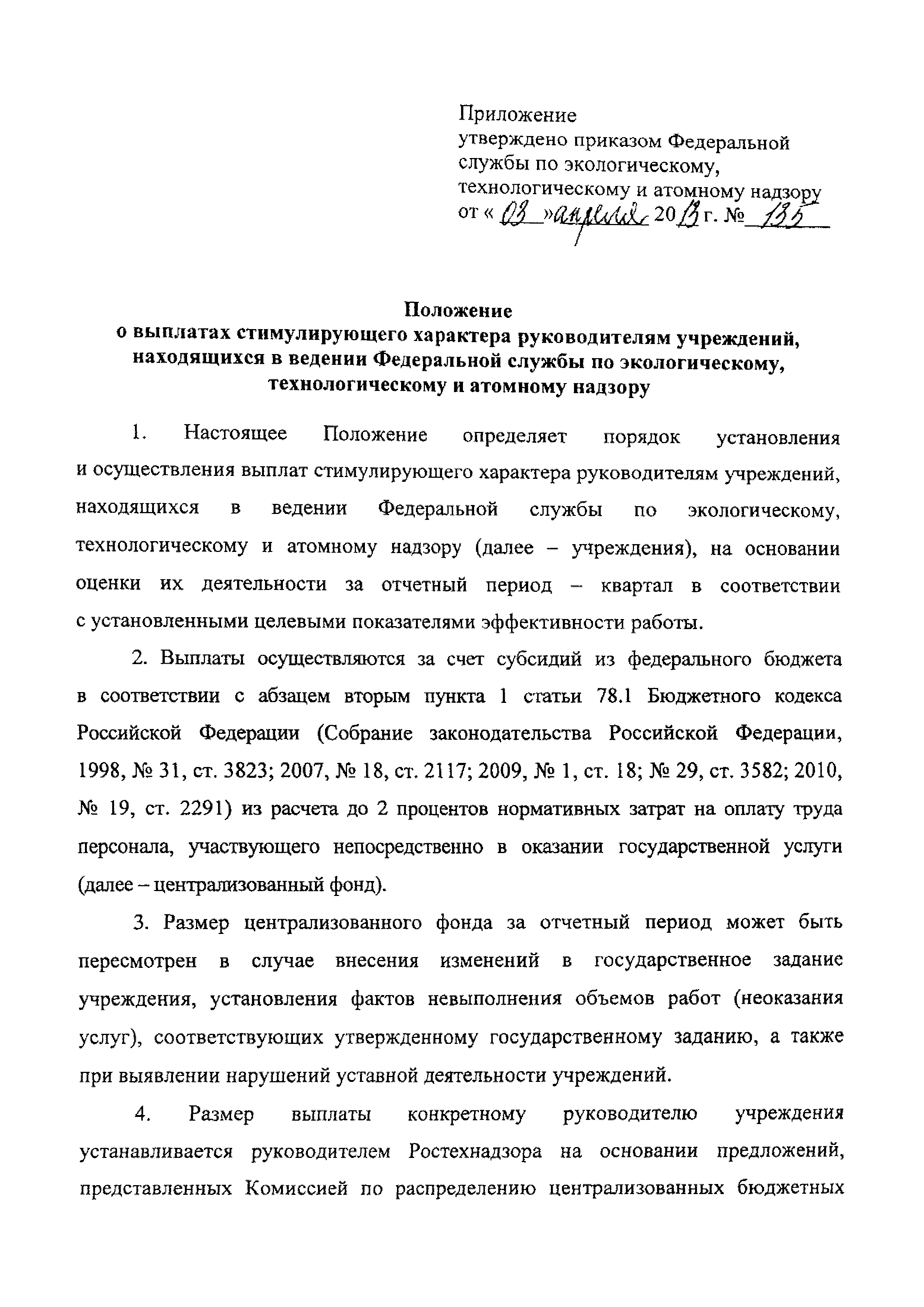 Положение о выплатах стимулирующего характера руководителям учреждений, находящихся в ведении Федеральной службы по экологическому, технологическому и атомному надзору| Статус: | действует | | Название рус.: | Положение о выплатах стимулирующего характера руководителям учреждений, находящихся в ведении Федеральной службы по экологическому, технологическому и атомному надзору | | Дата добавления в базу: | 01.01.2021 | | Дата актуализации: | 01.01.2021 | | Дата введения: | 28.07.2013 | | Область применения: | Положение определяет порядок установления и осуществления выплат стимулирующего характера руководителям учреждений, находящихся в ведении Федеральной службы по экологическому, технологическому и атомному надзору, на основании оценки их деятельности за отчетный период — квартал в соответствии с установленными целевыми показателями эффективности работы. | | Утверждён: | 03.04.2013 Федеральная служба по экологическому, технологическому и атомному надзору (135)