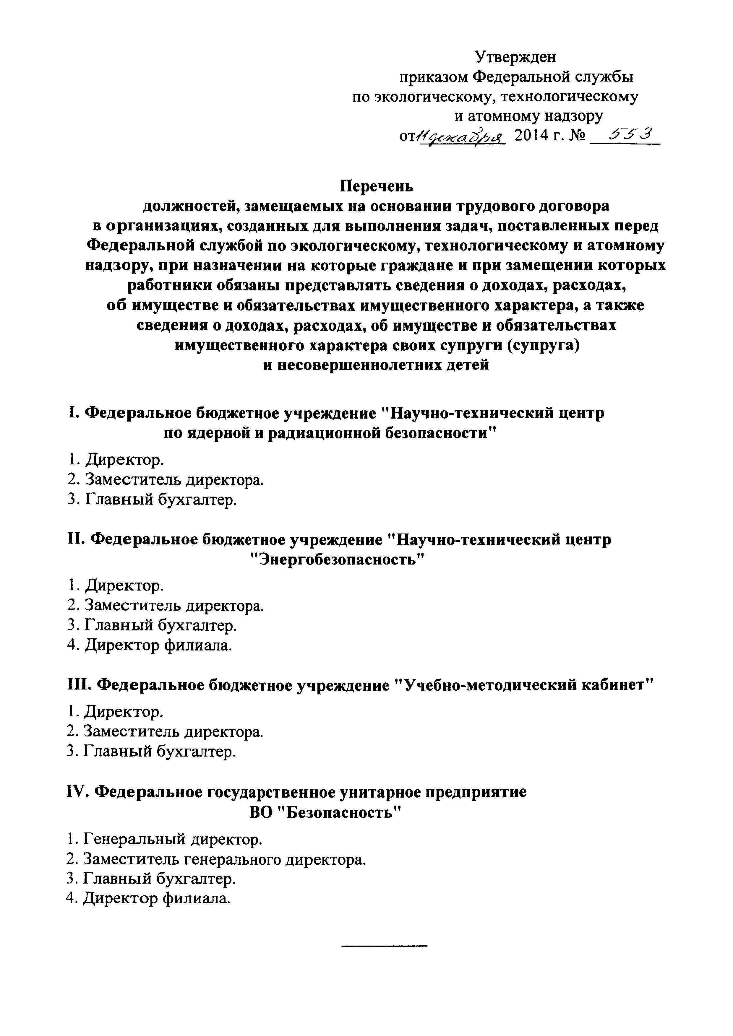 Перечень должностей, замещаемых на основании трудового договора в организациях, созданных для выполнения задач, поставленных перед Федеральной службой по экологическому, технологическому и атомному надзору, при назначении на которые граждане и при замещении которых работники обязаны представлять сведения о доходах, расходах, об имуществе и обязательствах имущественного характера, а также сведения о доходах, расходах, об имуществе и обязательствах имущественного характера своих супруги (супруга) и несовершеннолетних детей| Статус: | действует | | Название рус.: | Перечень должностей, замещаемых на основании трудового договора в организациях, созданных для выполнения задач, поставленных перед Федеральной службой по экологическому, технологическому и атомному надзору, при назначении на которые граждане и при замещении которых работники обязаны представлять сведения о доходах, расходах, об имуществе и обязательствах имущественного характера, а также сведения о доходах, расходах, об имуществе и обязательствах имущественного характера своих супруги (супруга) и несовершеннолетних детей | | Дата добавления в базу: | 01.01.2021 | | Дата актуализации: | 01.01.2021 | | Дата введения: | 10.02.2015 | | Утверждён: | 11.12.2014 Федеральная служба по экологическому, технологическому и атомному надзору (553)