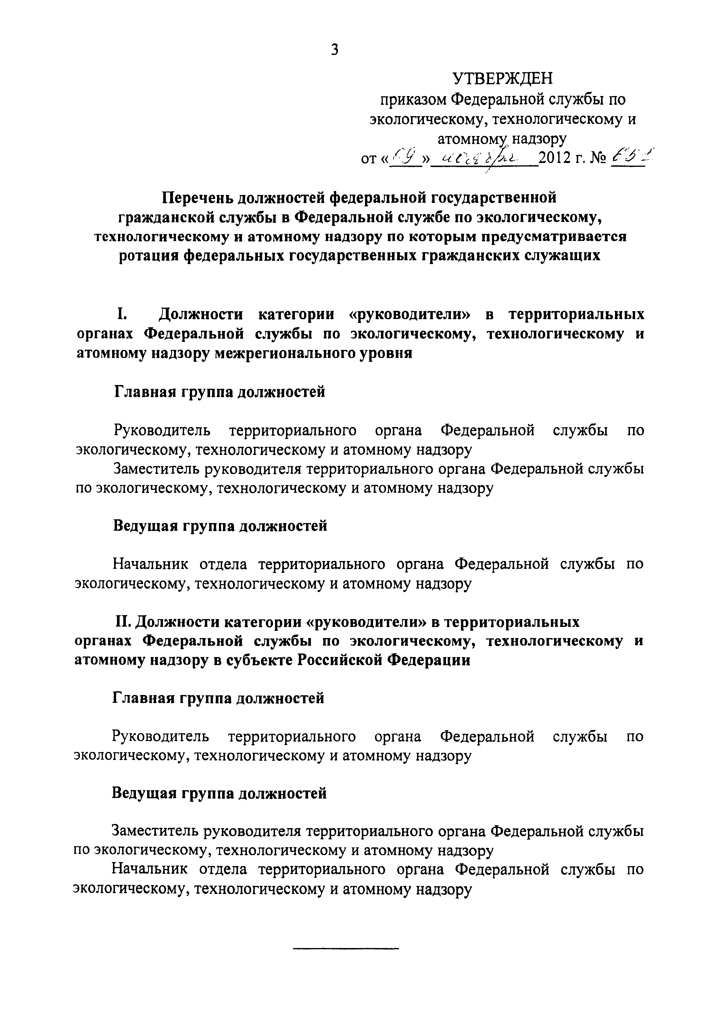 Перечень должностей федеральной государственной гражданской службы в Федеральной службе по экологическому, технологическому и атомному надзору, по которым предусматривается ротация федеральных государственных гражданских служащих| Статус: | утратил силу | | Название рус.: | Перечень должностей федеральной государственной гражданской службы в Федеральной службе по экологическому, технологическому и атомному надзору, по которым предусматривается ротация федеральных государственных гражданских служащих | | Дата добавления в базу: | 01.01.2019 | | Дата актуализации: | 01.01.2021 | | Дата введения: | 12.02.2013 | | Дата окончания срока действия: | 13.02.2018 | | Оглавление: | 1 Должности категории "руководители" в территориальных органах Федеральной службы по экологическому, технологическому и атомному надзору межрегионального уровня II Должности категории "руководители" в территориальных органах Федеральной службы по экологическому, технологическому и атомному надзору в субъекте Российской Федерации | | Утверждён: | 09.11.2012 Федеральная служба по экологическому, технологическому и атомному надзору (651)