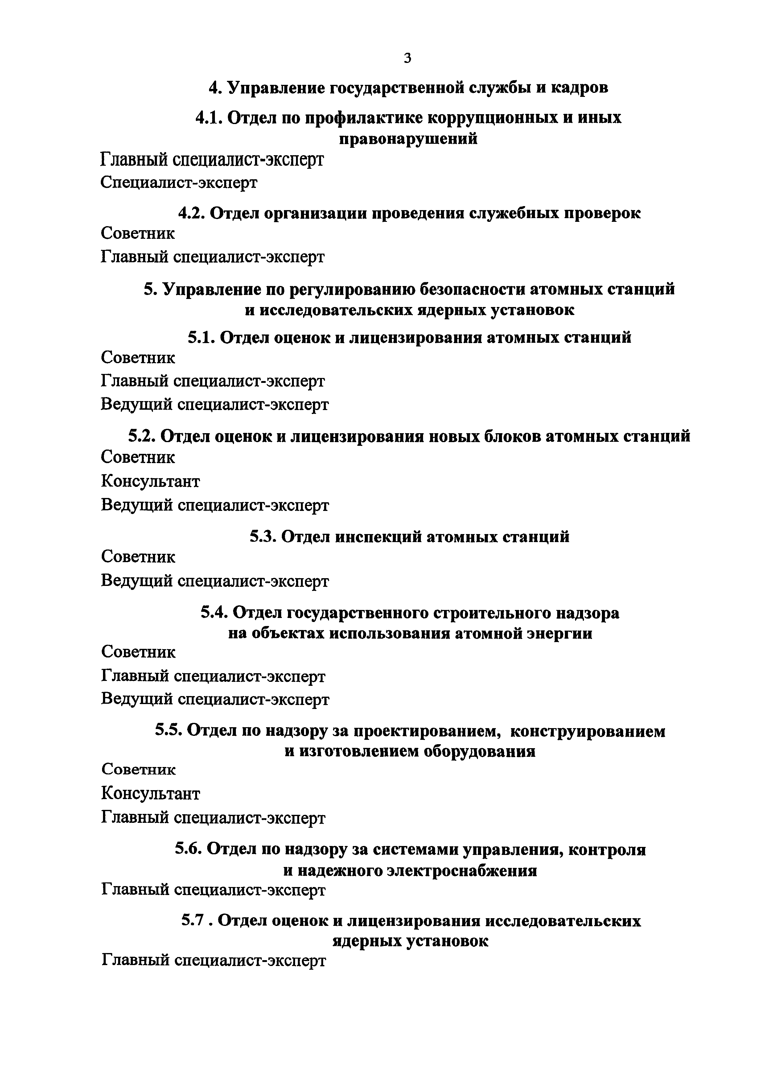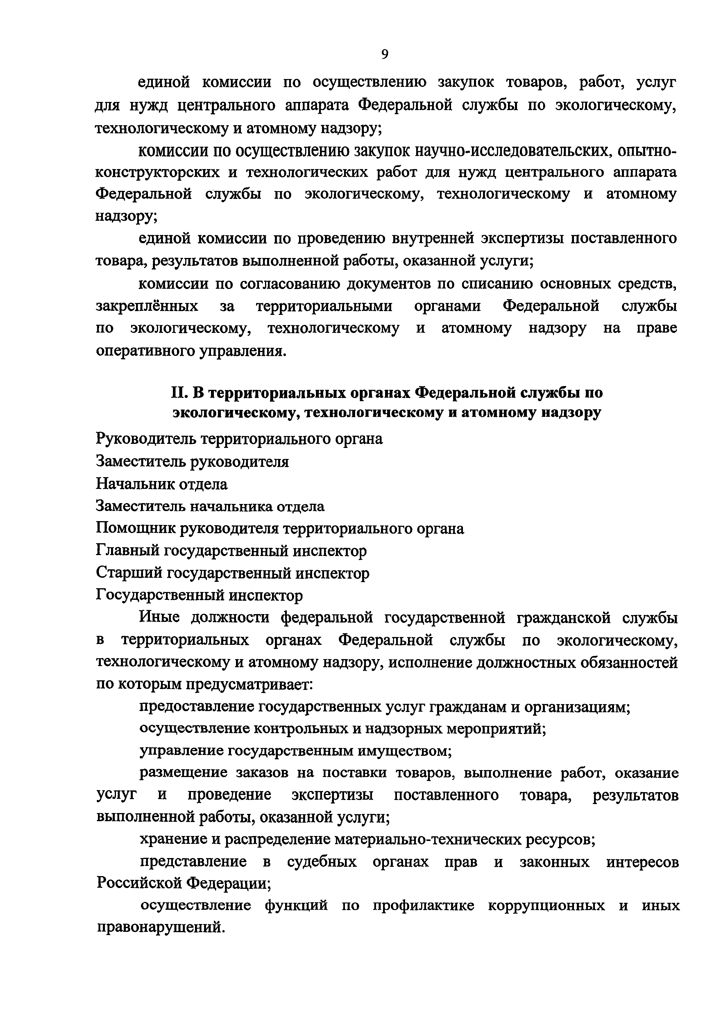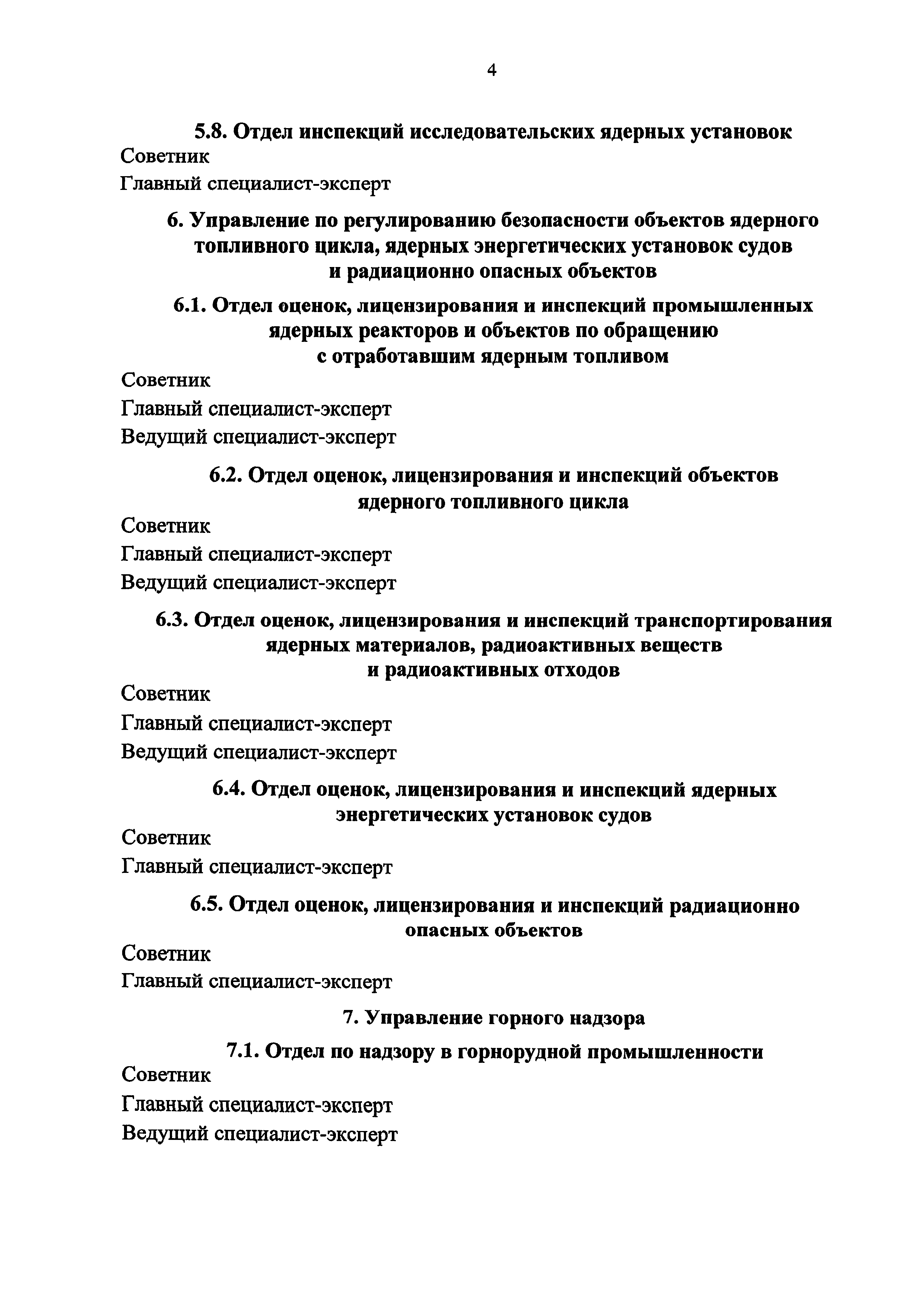 Перечень должностей федеральной государственной гражданской службы в Федеральной службе по экологическому, технологическому и атомному надзору, при замещении которых федеральные государственные гражданские служащие обязаны представлять сведения о своих доходах, об имуществе и обязательствах имущественного характера, а также сведения о доходах, об имуществе и обязательствах имущественного характера своих супруги (супруга) и несовершеннолетних детей| Статус: | утратил силу | | Название рус.: | Перечень должностей федеральной государственной гражданской службы в Федеральной службе по экологическому, технологическому и атомному надзору, при замещении которых федеральные государственные гражданские служащие обязаны представлять сведения о своих доходах, об имуществе и обязательствах имущественного характера, а также сведения о доходах, об имуществе и обязательствах имущественного характера своих супруги (супруга) и несовершеннолетних детей | | Дата добавления в базу: | 01.01.2019 | | Дата актуализации: | 01.01.2021 | | Дата окончания срока действия: | 25.12.2017 | | Оглавление: | I. В центральном аппарате Федеральной службы по экологическому, технологическому и атомному надзору 1. Управление делами 1.1. Отдел хозяйственного и организационного обеспечения 1.2. Отдел проведения государственных закупок 2. Управление обеспечения организационно-контрольной и лицензионно-разрешительной деятельности 2.1. Отдел организации лицензионной деятельности 2.2. Отдел организации и обеспечения контрольно-надзорной деятельности 2.3. Отдел контроля и координации деятельности территориальных органов 2.4. Отдел обеспечения оказания государственных услуг 3. Финансовое управление 3.1. Финансово-экономический отдел 4. Управление государственной службы и кадров 4.1. Отдел по профилактике коррупционных и иных правонарушений 4.2. Отдел организации проведения служебных проверок 5. Управление по регулированию безопасности атомных станций и исследовательских ядерных установок 5.1. Отдел оценок и лицензирования атомных станций 5.2. Отдел оценок и лицензирования новых блоков атомных станций 5.3. Отдел инспекций атомных станций 5.4. Отдел государственного строительного надзора на объектах использования атомной энергии 5.5. Отдел по надзору за проектированием, конструированием и изготовлением оборудования 5.6. Отдел по надзору за системами управления, контроля и надежного электроснабжения 5.7. Отдел оценка и лицензирования исследовательских ядерных установок 5.8. Отдел инспекций исследовательских ядерных установок 6. Управление по регулированию безопасности объектов ядерного топливного цикла, ядерных энергетических установок судов и радиационно опасных объектов 6.1. Отдел оценок, лицензирования и инспекций промышленных ядерных реакторов и объектов по обращению с отработавшим ядерным топливом 6.2. Отдел оценок, лицензирования и инспекций объектов ядерного топливного цикла 6.3. Отдел оценок, лицензирования и инспекций транспортирования ядерных материалов, радиоактивных веществ и радиоактивных отходов 6.4. Отдел оценок, лицензирования и инспекций ядерных энергетических установок судов 6.5. Отдел оценок. Лицензирования и инспекций радиационно опасных объектов 7. Управление горного надзора 7.1. Отдел по надзору в горнорудной промышленности 7.2. Отдел по надзору за металлургиче