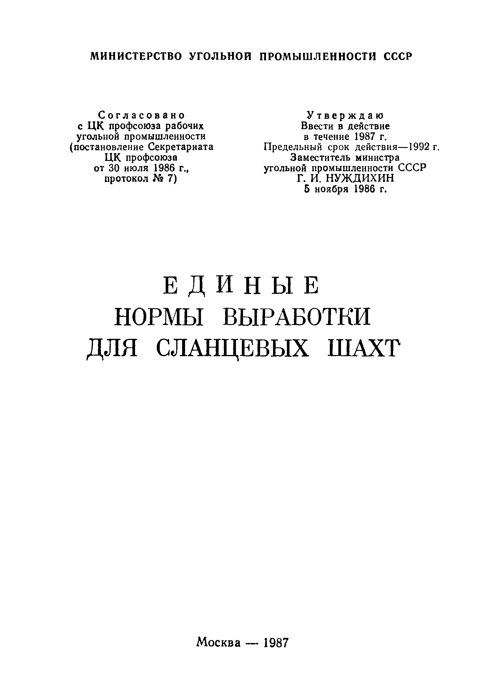 | | Принят: | 30.07.1986 ЦК профсоюза рабочих угольной промышленности СССР (7)