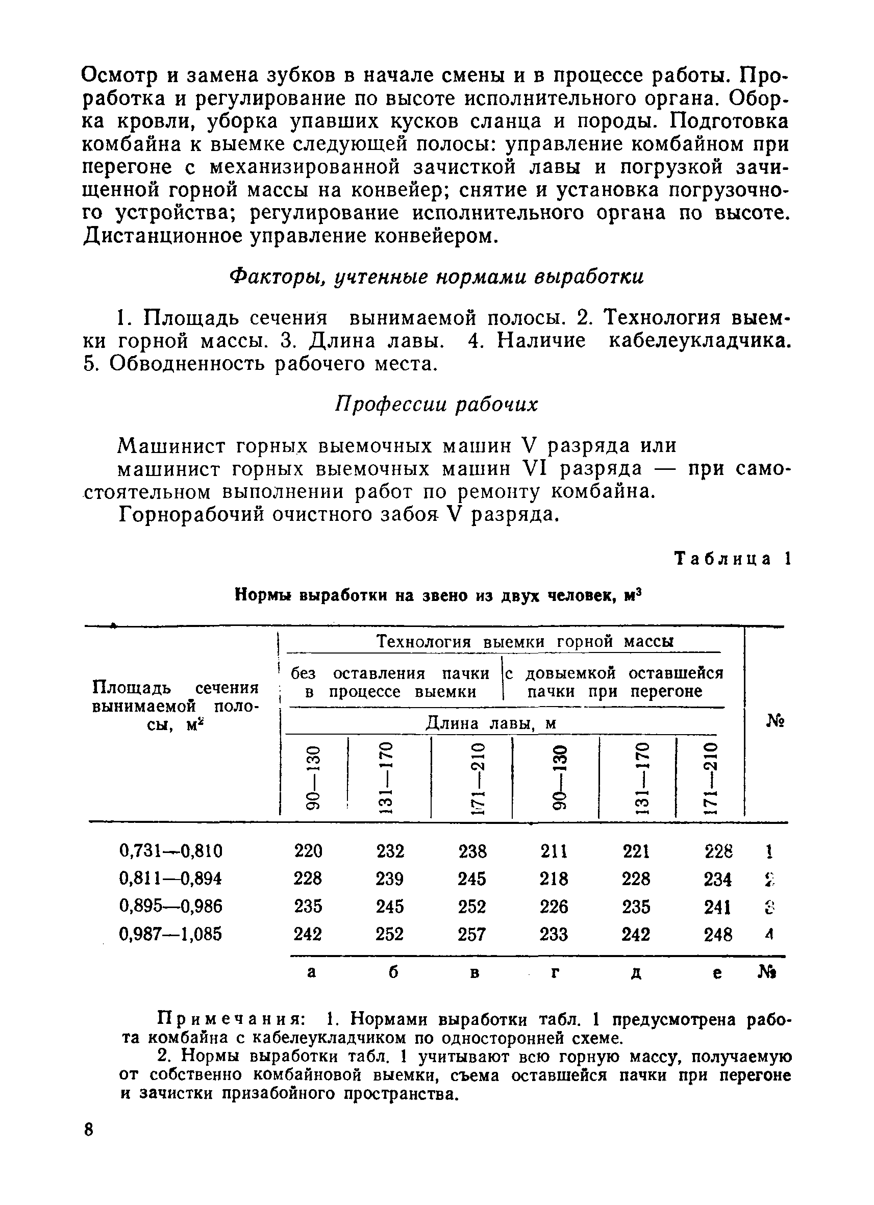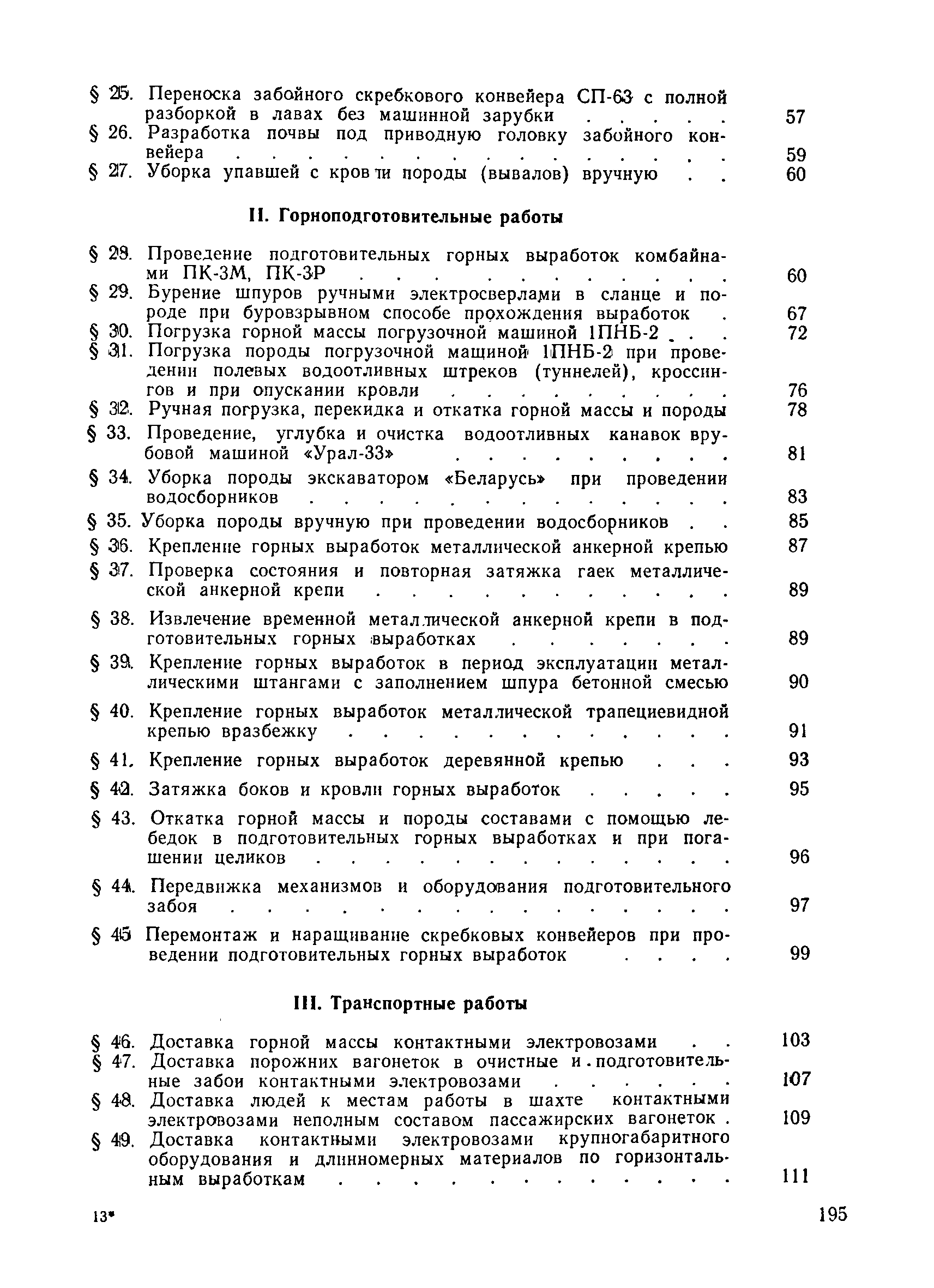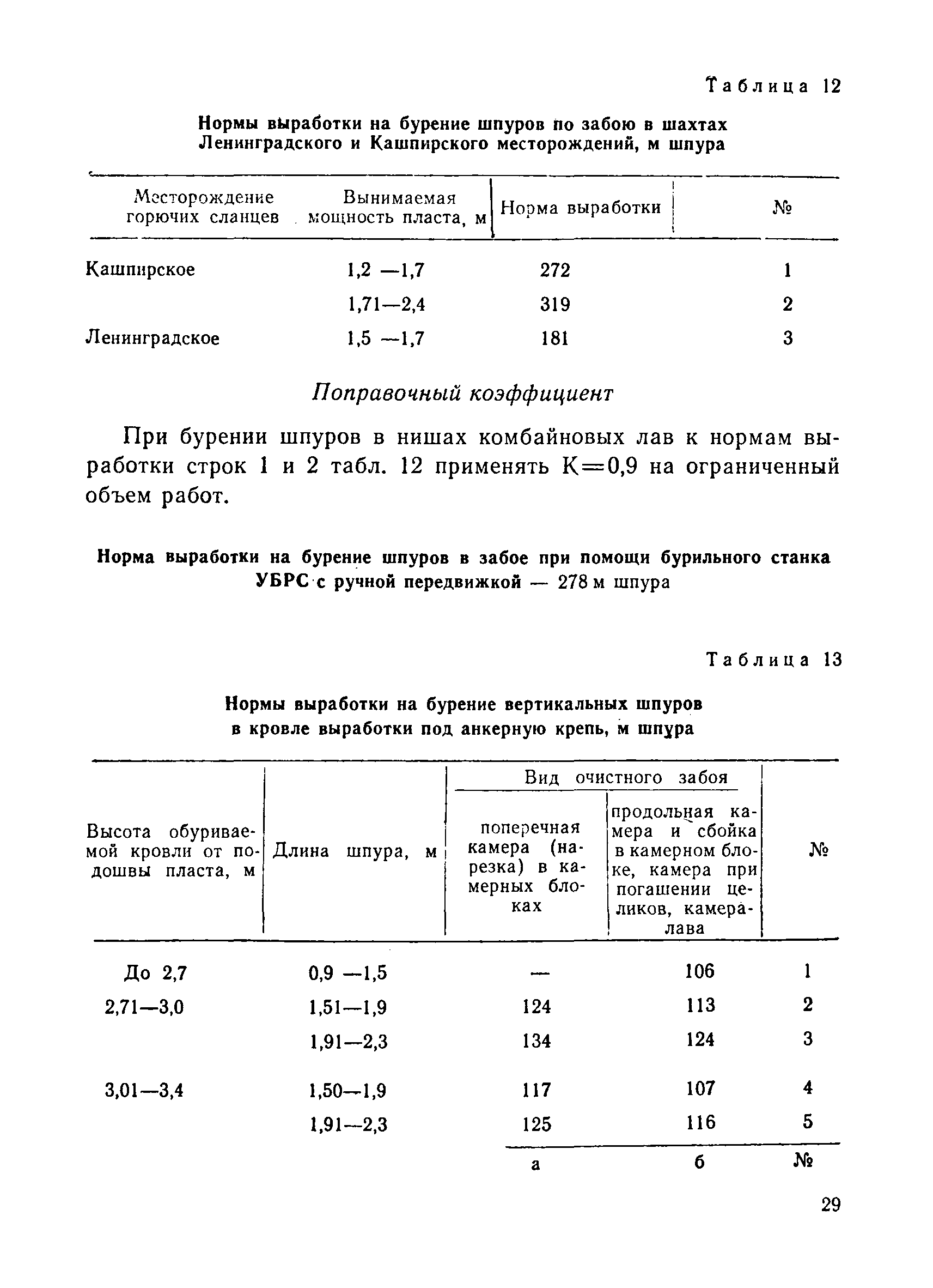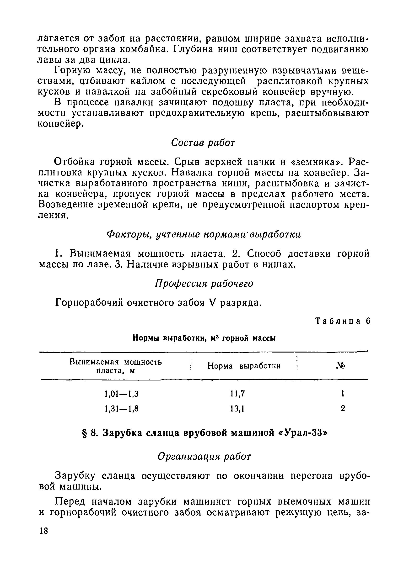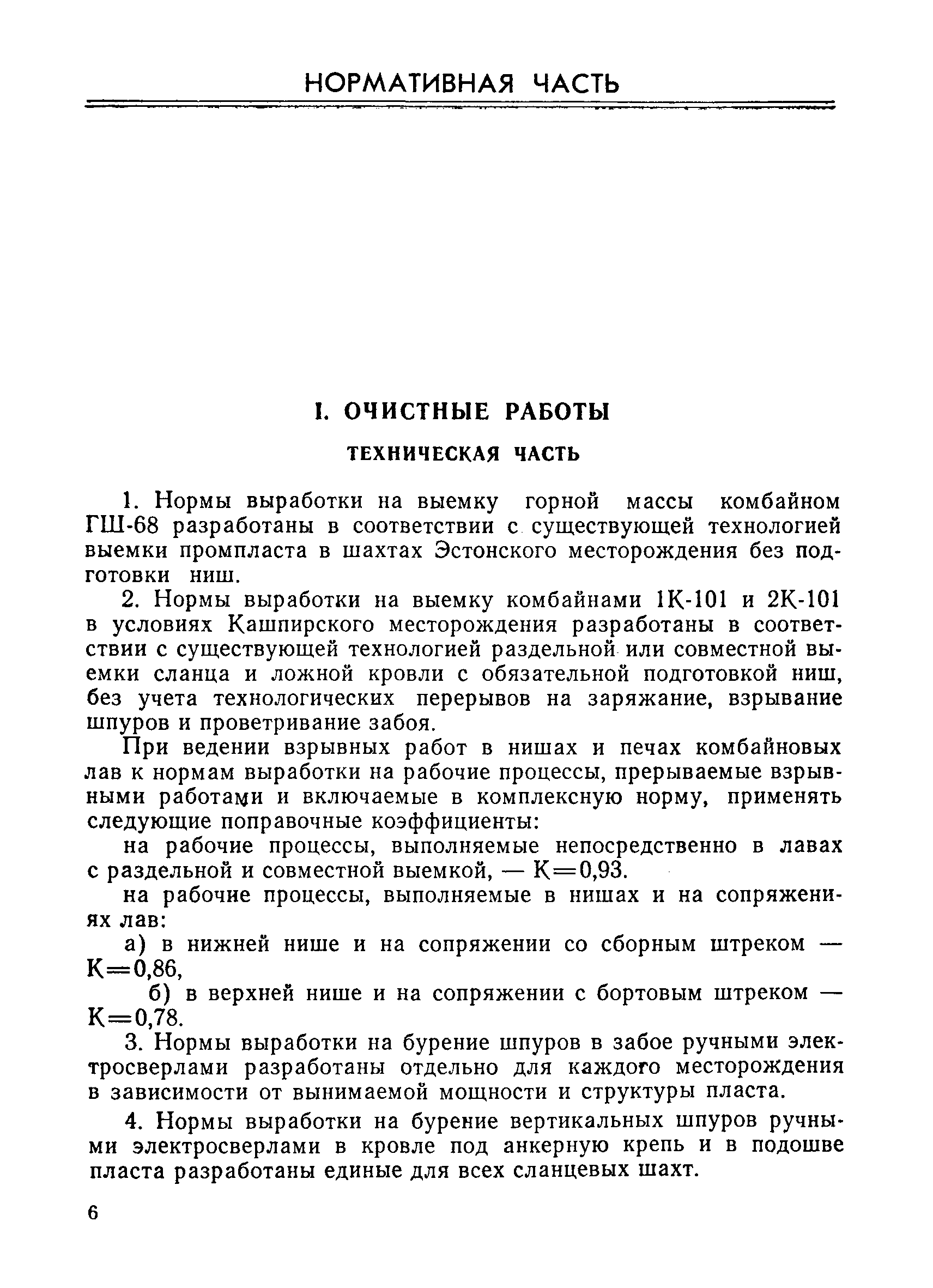 При внедрении нового оборудования, прогрессивной технологии ведения горных работ и более совершенных форм организации труда, не предусмотренных настоящим сборником, нормы должны устанавливаться с учетом технических возможностей оборудования в этих условиях. | | Оглавление: | Общая часть Нормативная часть I Очистные работы Техническая часть Нормативная часть § 1 Выемка горной массы комбайном ГШ-68 и подготовка к выемке следующей полосы § 2 Передвижка гидрофицированной посадочной крепи "Спутник" и забойного скребкового конвейера § 3 Перестановка гидравлических стоек § 4 Осевая передвижка скребкового конвейера-перегружателя на сборном штреке комбайновой лавы § 5 Выемка горной массы комбайнами 1К-101, 2К-101 и подготовка к выемке следующей полосы § 6 Оформление забоя после выемки горной массы комбайнами К-101, 2К-101 § 7 Выемка горной массы из ниш лавы, оборудованной комбайном 1К-101 или 2К-101 § 8 Зарубка сланца врубовой машиной "Урал-33" § 9 Перегон врубовой машины "Урал-33" § 10 Бурение шпуров бурильными установками БУА-3 и БУА-3с § 11 Перегон бурильных установок БУА-3 и БУА-3с § 12 Бурение шпуров ручным электросверлом § 13 Погрузка горной массы погрузочной машиной 1ПНБ-2 § 14 Навалоотбойка сланца в лавах с выкладкой бутовых полос § 15 Перестановка клиновых металлических стоек в лавах § 16 Крепление очистных забоев металлической анкерной крепью § 17 Проверка состояния и повторная затяжка гаек металлической анкерной крепи § 18 Крепление забоя деревянной крепью § 19 Возведение деревянной органной крепи § 20 Извлечение деревянной крепи из отработанных заходок камер-лав лебедкой § 21 Крепление сопряжений лав с примыкающими выработками § 22 Передвижка забойного скребкового конвейера на новую дорожку без разборки конвейерного става § 23 Передвижка забойного скребкового конвейера в новую нарезку с частичной разборкой на секции § 24 Переноска забойного скребкового конвейера из отработанного блока камеры лавы в новую разрезку § 25 Переноска забойного скребкового конвейера СП-63 с полной разборкой в лавах без машинной зарубки § 26 Разработка почвы под приводную головку забойного конвейера § 27 Уборка упавшей с кровли породы (вывалов) вручную II. Горно-подготовительные работы § 28 Проведение подготовительных горных выработок комбайнами ПК-3М, ПК-3Р § 29 Бурение шпуров ручными электросверлами в сланце и породе при буровзрывном способе прохождения выработок § 30 Погрузка горной массы погрузочной машиной 1ПНБ-2 § 31 Погрузка породы погрузочной машиной 1ПНБ-2 при проведении полевых водоотливных штреков (туннелей), кроссингов и при опускании кровли § 32 Ручная погрузка, перекидка и откатка горной массы и породы § 33 Проведение, углубка и очистка водоотливных канавок врубовой машиной "Урал-33" § 34 Уборка породы экскаватором "Беларусь" при проведении водосборников § 35 Уборка породы вручную при проведении водосборников § 36 Крепление горных выработок металлической анкерной крепью § 37 Проверка состояния и повторная затяжка гаек металлической анкерной крепи § 38 Извлечение временной металлической анкерной крепи в подготовительных горных выработках § 39 Крепление горных выработок в период эксплуатации металлическими штангами с заполнением шпура бетонной смесью § 40 Крепление горных выработок металлической трапециевидной крепью вразбежку § 41 Крепление горных выработок деревян