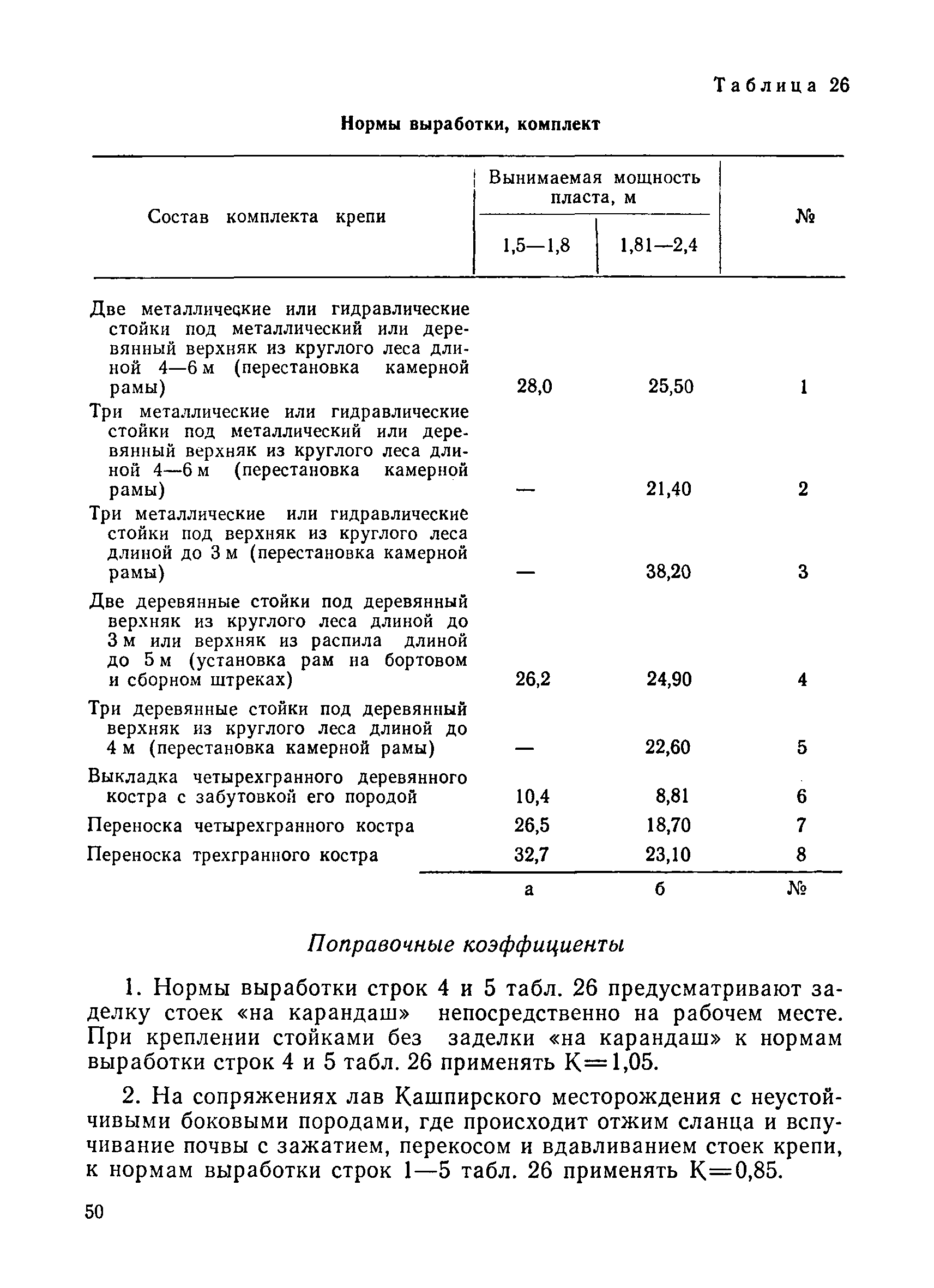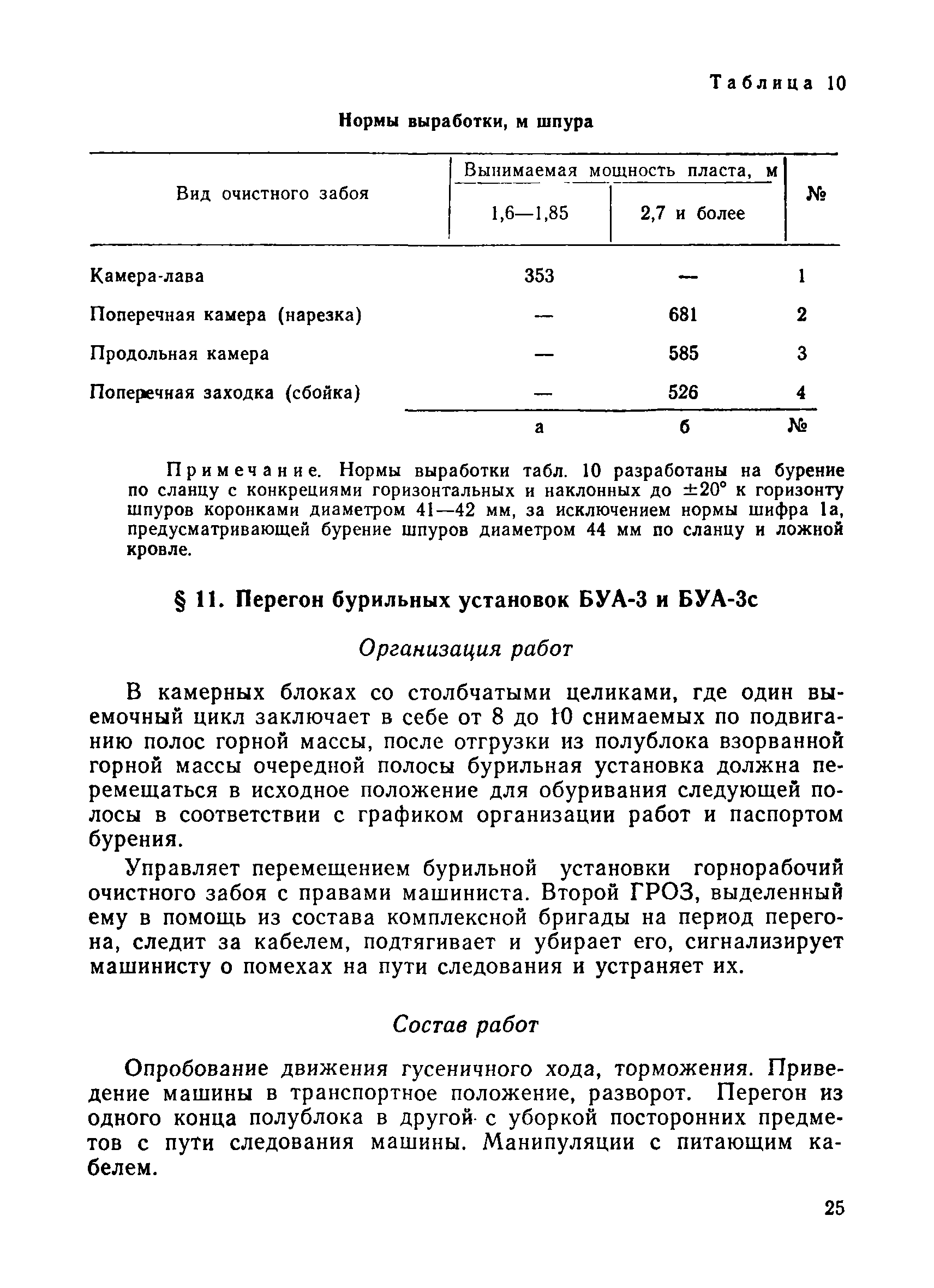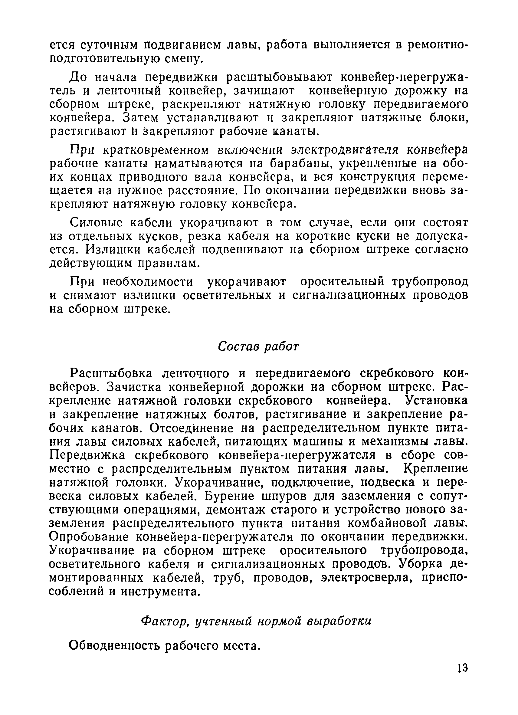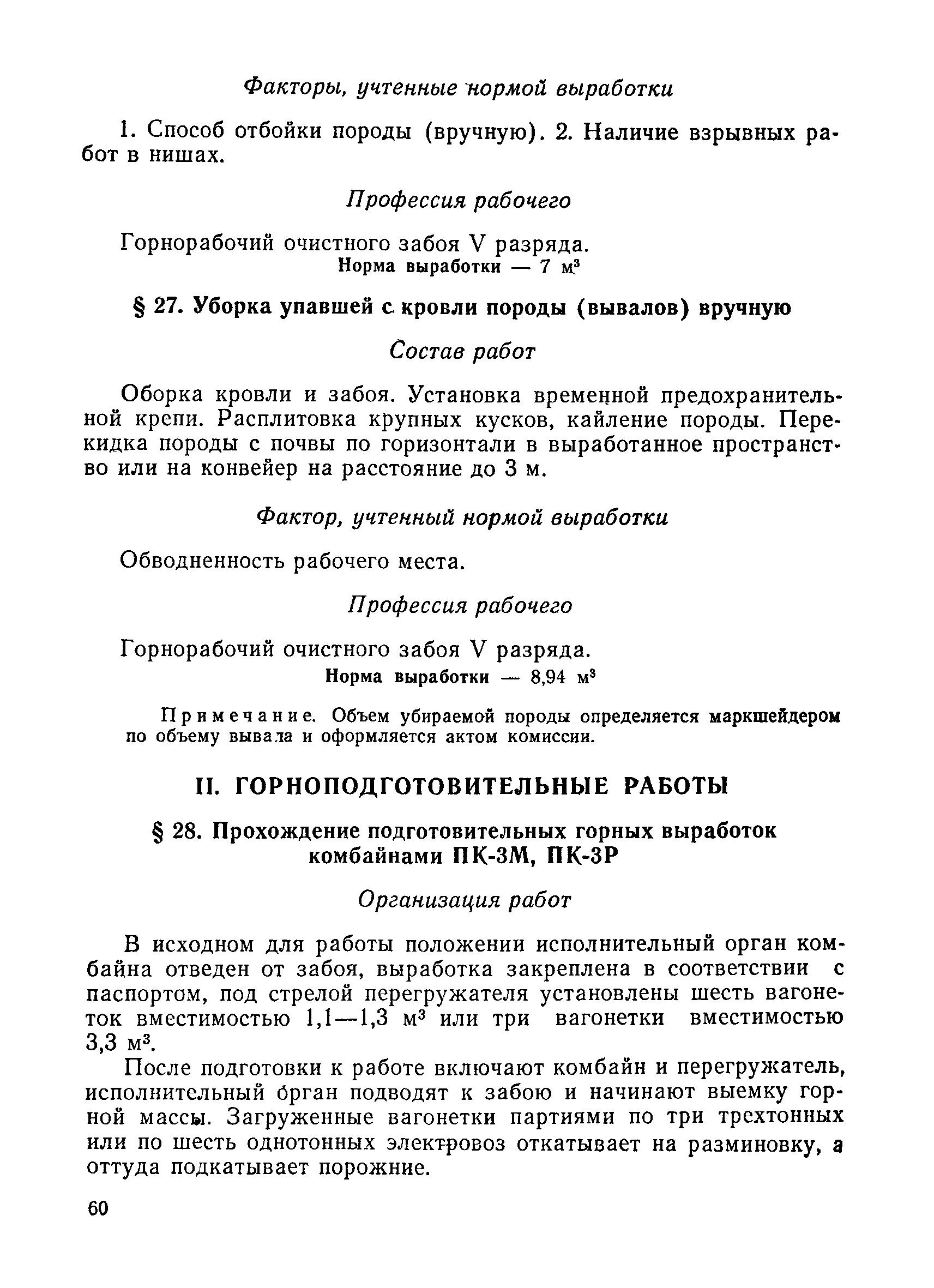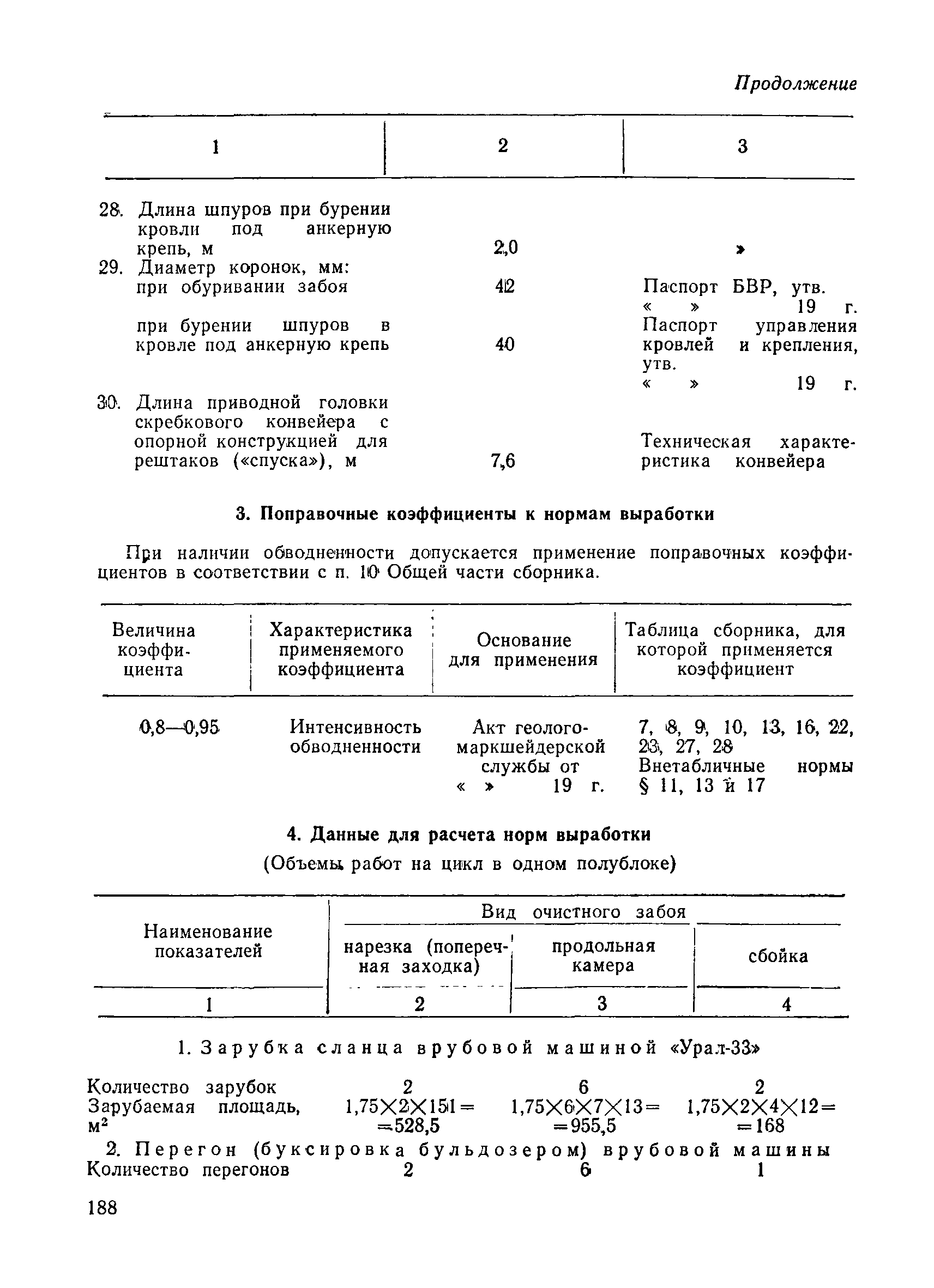 При внедрении нового оборудования, прогрессивной технологии ведения горных работ и более совершенных форм организации труда, не предусмотренных настоящим сборником, нормы должны устанавливаться с учетом технических возможностей оборудования в этих условиях. | | Оглавление: | Общая часть Нормативная часть I Очистные работы Техническая часть Нормативная часть § 1 Выемка горной массы комбайном ГШ-68 и подготовка к выемке следующей полосы § 2 Передвижка гидрофицированной посадочной крепи "Спутник" и забойного скребкового конвейера § 3 Перестановка гидравлических стоек § 4 Осевая передвижка скребкового конвейера-перегружателя на сборном штреке комбайновой лавы § 5 Выемка горной массы комбайнами 1К-101, 2К-101 и подготовка к выемке следующей полосы § 6 Оформление забоя после выемки горной массы комбайнами К-101, 2К-101 § 7 Выемка горной массы из ниш лавы, оборудованной комбайном 1К-101 или 2К-101 § 8 Зарубка сланца врубовой машиной "Урал-33" § 9 Перегон врубовой машины "Урал-33" § 10 Бурение шпуров бурильными установками БУА-3 и БУА-3с § 11 Перегон бурильных установок БУА-3 и БУА-3с § 12 Бурение шпуров ручным электросверлом § 13 Погрузка горной массы погрузочной машиной 1ПНБ-2 § 14 Навалоотбойка сланца в лавах с выкладкой бутовых полос § 15 Перестановка клиновых металлических стоек в лавах § 16 Крепление очистных забоев металлической анкерной крепью § 17 Проверка состояния и повторная затяжка гаек металлической анкерной крепи § 18 Крепление забоя деревянной крепью § 19 Возведение деревянной органной крепи § 20 Извлечение деревянной крепи из отработанных заходок камер-лав лебедкой § 21 Крепление сопряжений лав с примыкающими выработками § 22 Передвижка забойного скребкового конвейера на новую дорожку без разборки конвейерного става § 23 Передвижка забойного скребкового конвейера в новую нарезку с частичной разборкой на секции § 24 Переноска забойного скребкового конвейера из отработанного блока камеры лавы в новую разрезку § 25 Переноска забойного скребкового конвейера СП-63 с полной разборкой в лавах без машинной зарубки § 26 Разработка почвы под приводную головку забойного конвейера § 27 Уборка упавшей с кровли породы (вывалов) вручную II. Горно-подготовительные работы § 28 Проведение подготовительных горных выработок комбайнами ПК-3М, ПК-3Р § 29 Бурение шпуров ручными электросверлами в сланце и породе при буровзрывном способе прохождения выработок § 30 Погрузка горной массы погрузочной машиной 1ПНБ-2 § 31 Погрузка породы погрузочной машиной 1ПНБ-2 при проведении полевых водоотливных штреков (туннелей), кроссингов и при опускании кровли § 32 Ручная погрузка, перекидка и откатка горной массы и породы § 33 Проведение, углубка и очистка водоотливных канавок врубовой машиной "Урал-33" § 34 Уборка породы экскаватором "Беларусь" при проведении водосборников § 35 Уборка породы вручную при проведении водосборников § 36 Крепление горных выработок металлической анкерной крепью § 37 Проверка состояния и повторная затяжка гаек металлической анкерной крепи § 38 Извлечение временной металлической анкерной крепи в подготовительных горных выработках § 39 Крепление горных выработок в период эксплуатации металлическими штангами с заполнением шпура бетонной смесью § 40 Крепление горных выработок металлической трапециевидной крепью вразбежку § 41 Крепление горных выработок деревян