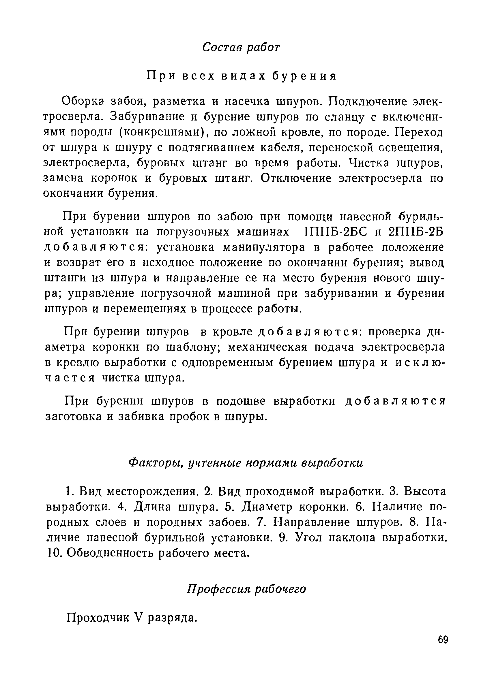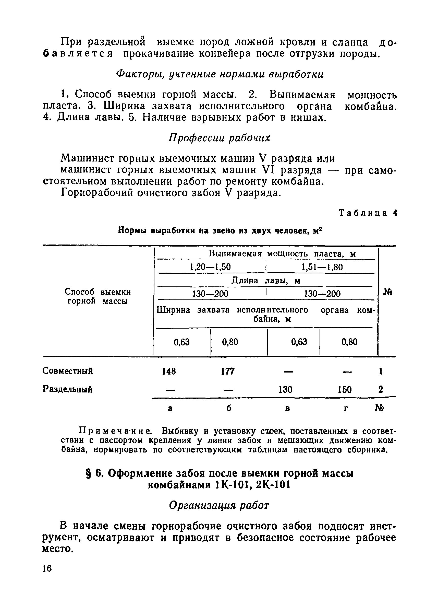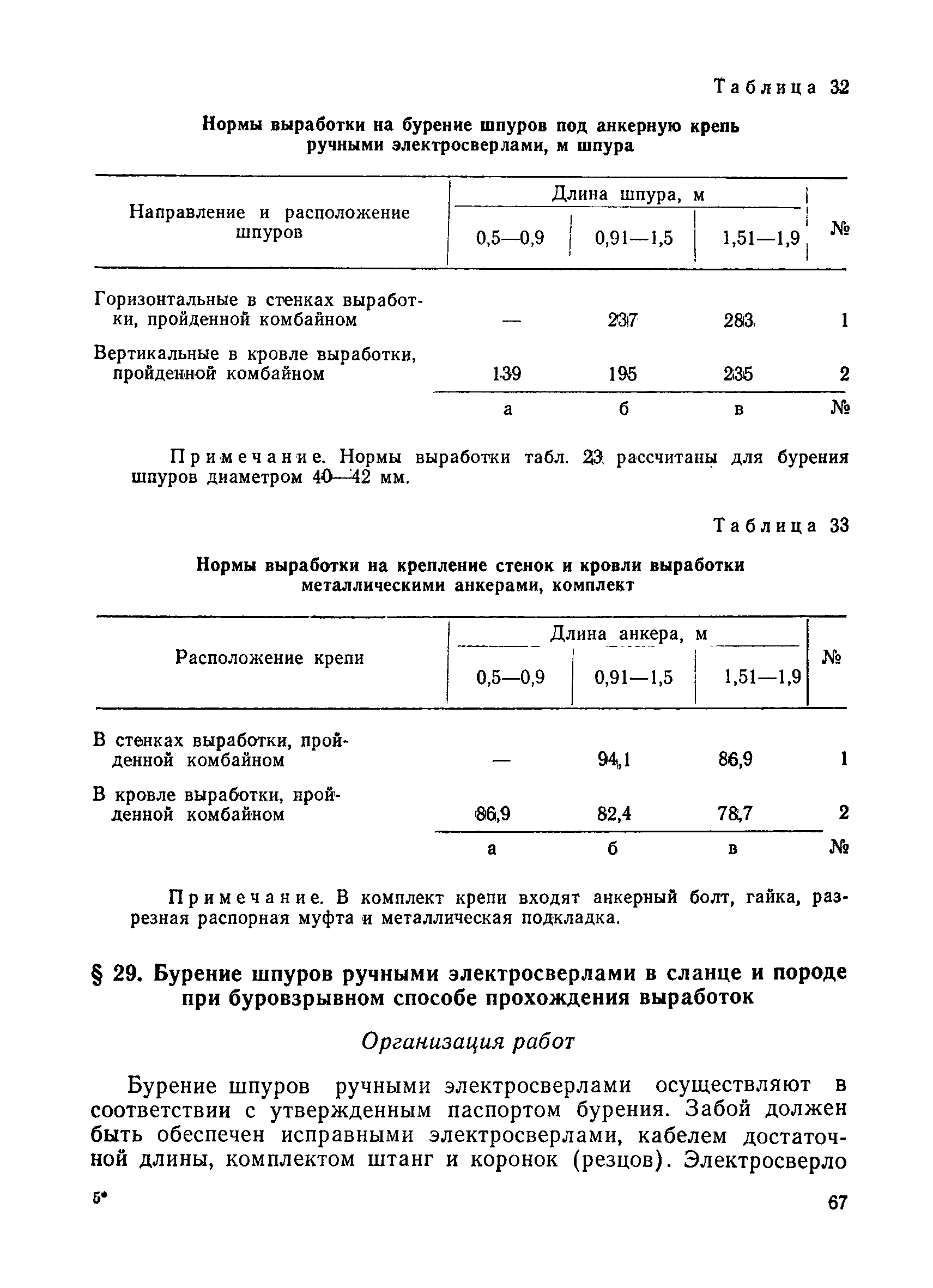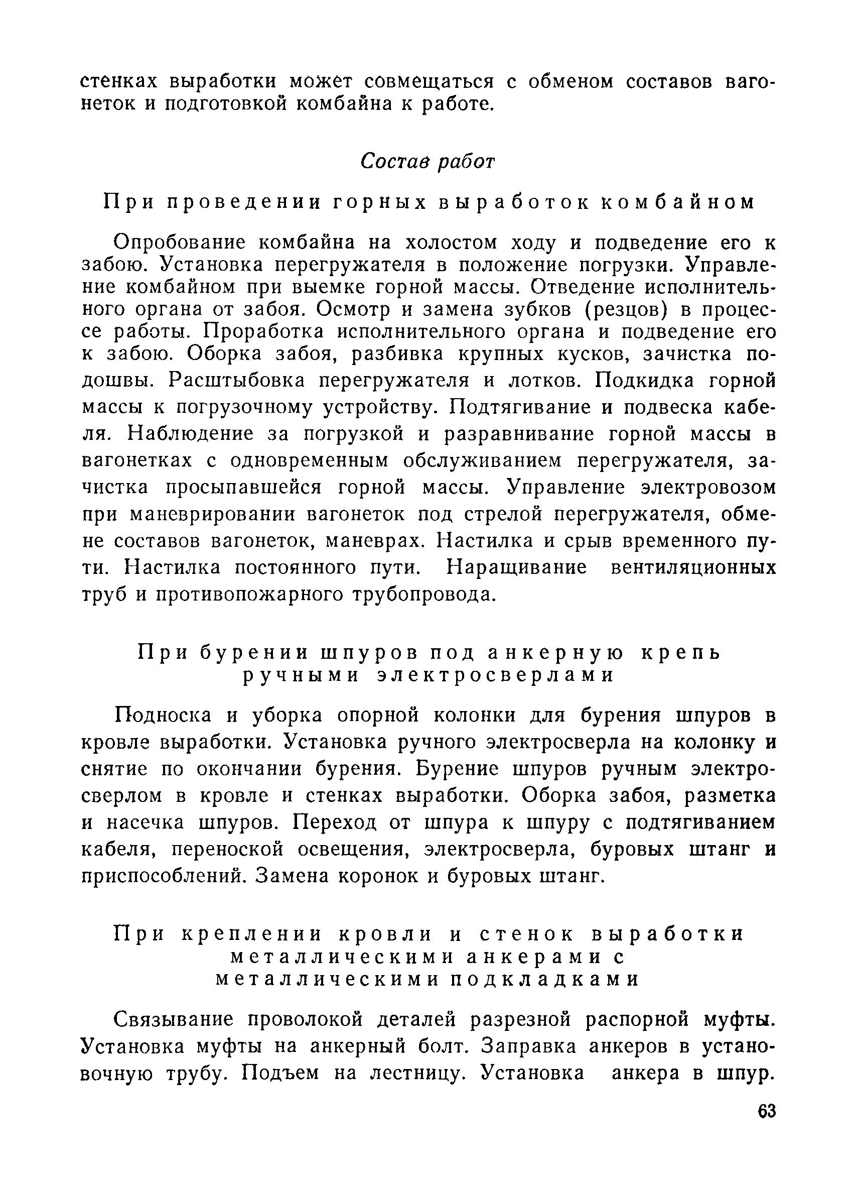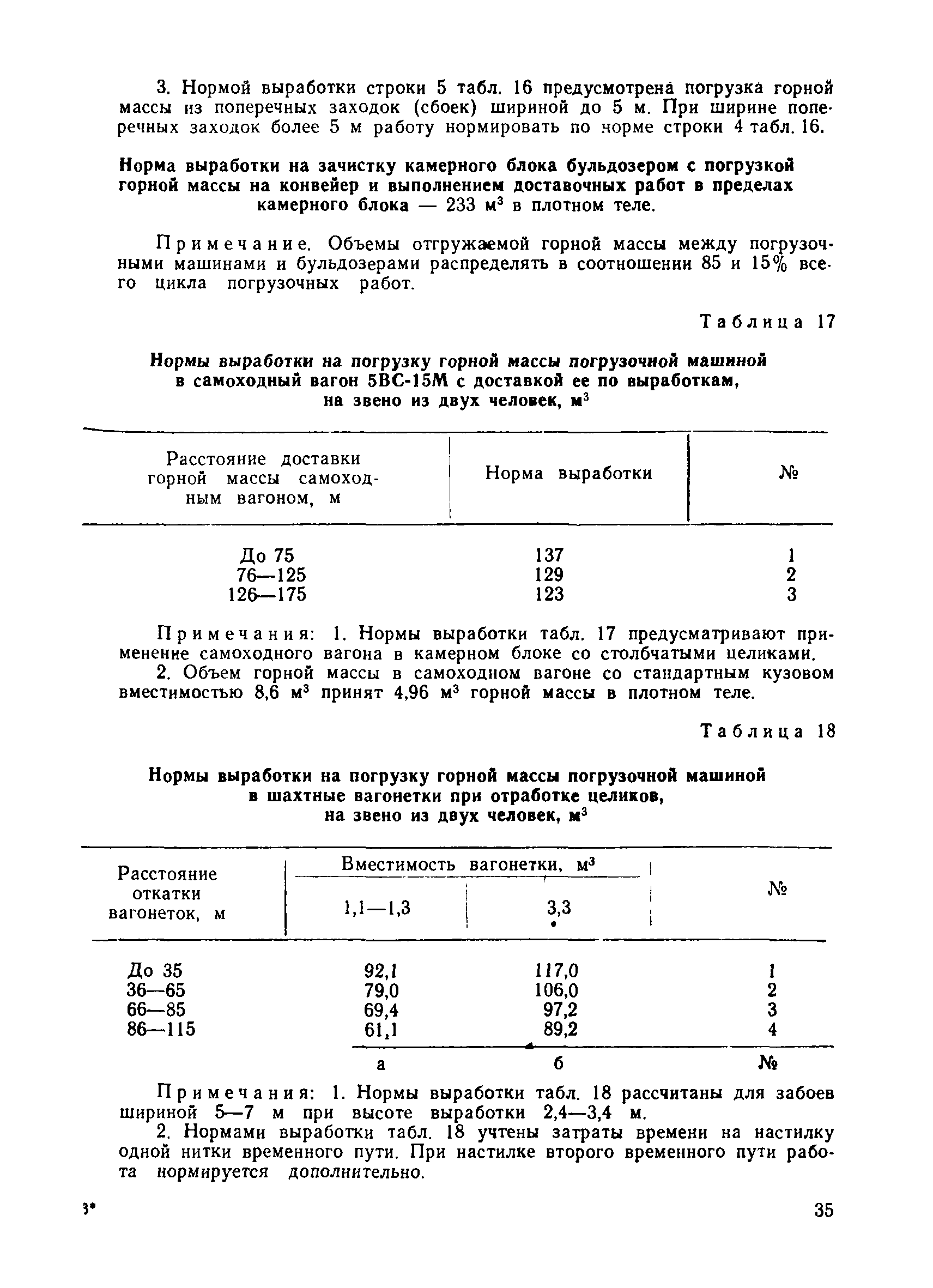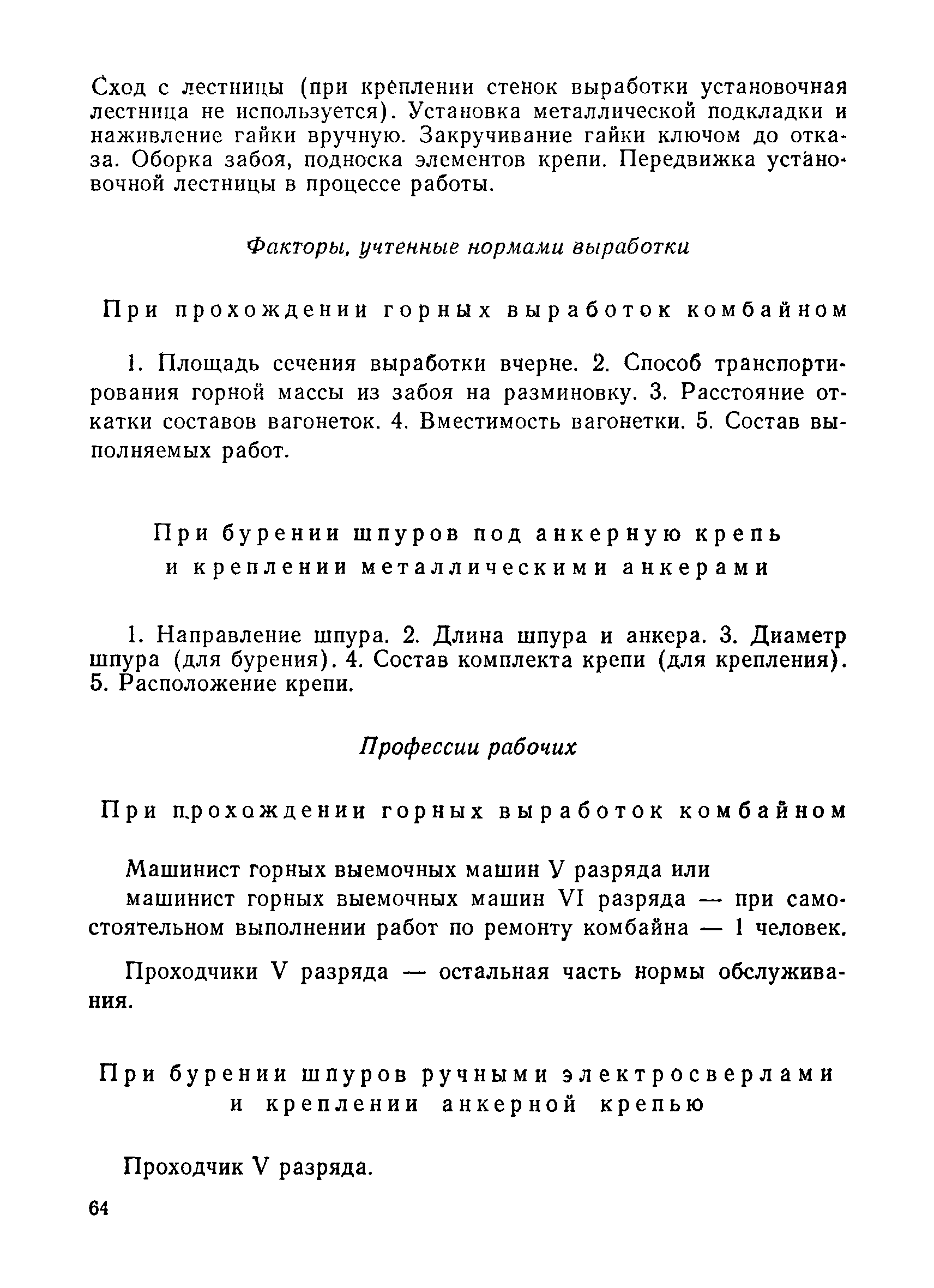 При внедрении нового оборудования, прогрессивной технологии ведения горных работ и более совершенных форм организации труда, не предусмотренных настоящим сборником, нормы должны устанавливаться с учетом технических возможностей оборудования в этих условиях. | | Оглавление: | Общая часть Нормативная часть I Очистные работы Техническая часть Нормативная часть § 1 Выемка горной массы комбайном ГШ-68 и подготовка к выемке следующей полосы § 2 Передвижка гидрофицированной посадочной крепи "Спутник" и забойного скребкового конвейера § 3 Перестановка гидравлических стоек § 4 Осевая передвижка скребкового конвейера-перегружателя на сборном штреке комбайновой лавы § 5 Выемка горной массы комбайнами 1К-101, 2К-101 и подготовка к выемке следующей полосы § 6 Оформление забоя после выемки горной массы комбайнами К-101, 2К-101 § 7 Выемка горной массы из ниш лавы, оборудованной комбайном 1К-101 или 2К-101 § 8 Зарубка сланца врубовой машиной "Урал-33" § 9 Перегон врубовой машины "Урал-33" § 10 Бурение шпуров бурильными установками БУА-3 и БУА-3с § 11 Перегон бурильных установок БУА-3 и БУА-3с § 12 Бурение шпуров ручным электросверлом § 13 Погрузка горной массы погрузочной машиной 1ПНБ-2 § 14 Навалоотбойка сланца в лавах с выкладкой бутовых полос § 15 Перестановка клиновых металлических стоек в лавах § 16 Крепление очистных забоев металлической анкерной крепью § 17 Проверка состояния и повторная затяжка гаек металлической анкерной крепи § 18 Крепление забоя деревянной крепью § 19 Возведение деревянной органной крепи § 20 Извлечение деревянной крепи из отработанных заходок камер-лав лебедкой § 21 Крепление сопряжений лав с примыкающими выработками § 22 Передвижка забойного скребкового конвейера на новую дорожку без разборки конвейерного става § 23 Передвижка забойного скребкового конвейера в новую нарезку с частичной разборкой на секции § 24 Переноска забойного скребкового конвейера из отработанного блока камеры лавы в новую разрезку § 25 Переноска забойного скребкового конвейера СП-63 с полной разборкой в лавах без машинной зарубки § 26 Разработка почвы под приводную головку забойного конвейера § 27 Уборка упавшей с кровли породы (вывалов) вручную II. Горно-подготовительные работы § 28 Проведение подготовительных горных выработок комбайнами ПК-3М, ПК-3Р § 29 Бурение шпуров ручными электросверлами в сланце и породе при буровзрывном способе прохождения выработок § 30 Погрузка горной массы погрузочной машиной 1ПНБ-2 § 31 Погрузка породы погрузочной машиной 1ПНБ-2 при проведении полевых водоотливных штреков (туннелей), кроссингов и при опускании кровли § 32 Ручная погрузка, перекидка и откатка горной массы и породы § 33 Проведение, углубка и очистка водоотливных канавок врубовой машиной "Урал-33" § 34 Уборка породы экскаватором "Беларусь" при проведении водосборников § 35 Уборка породы вручную при проведении водосборников § 36 Крепление горных выработок металлической анкерной крепью § 37 Проверка состояния и повторная затяжка гаек металлической анкерной крепи § 38 Извлечение временной металлической анкерной крепи в подготовительных горных выработках § 39 Крепление горных выработок в период эксплуатации металлическими штангами с заполнением шпура бетонной смесью § 40 Крепление горных выработок металлической трапециевидной крепью вразбежку § 41 Крепление горных выработок деревян