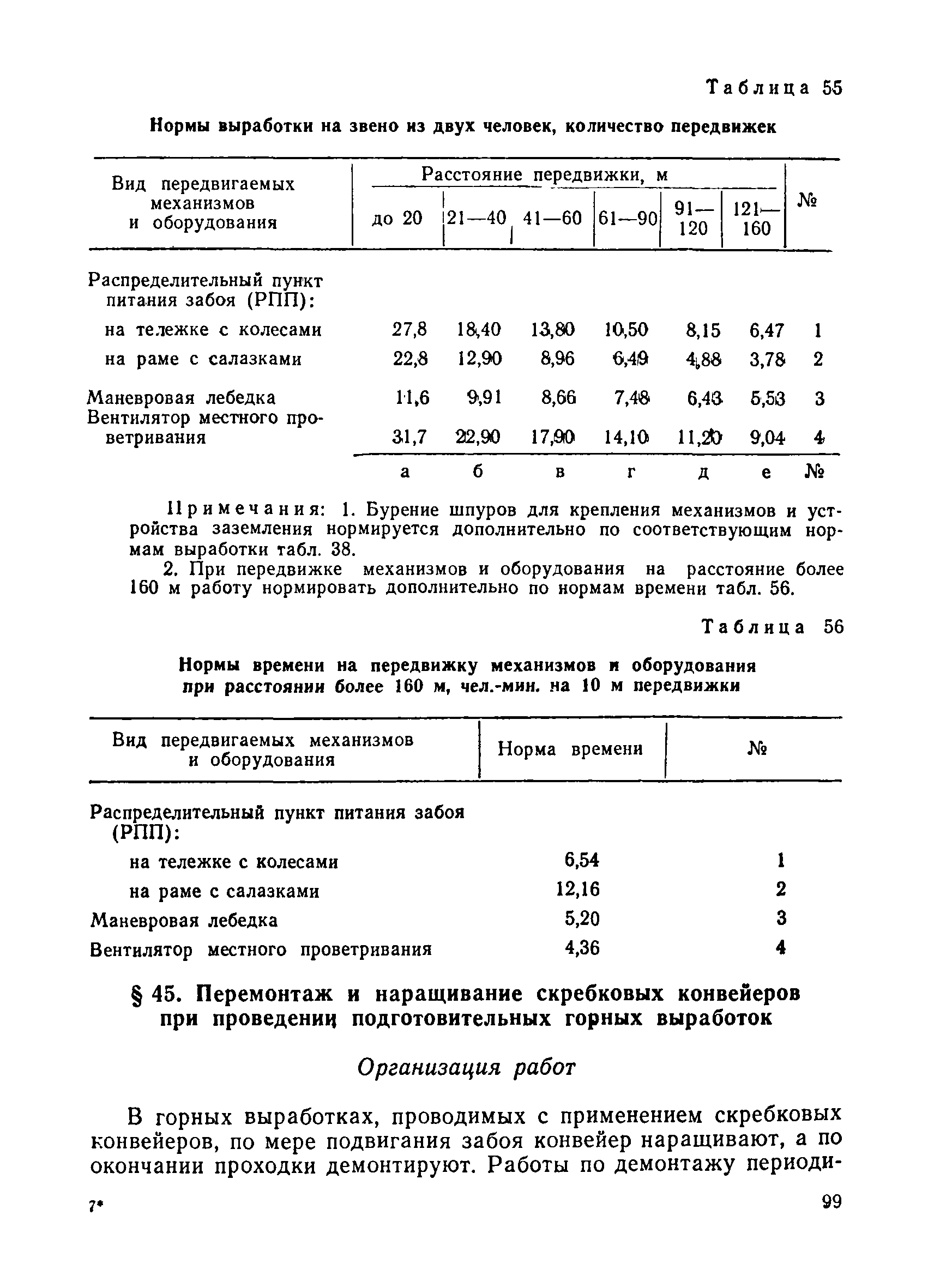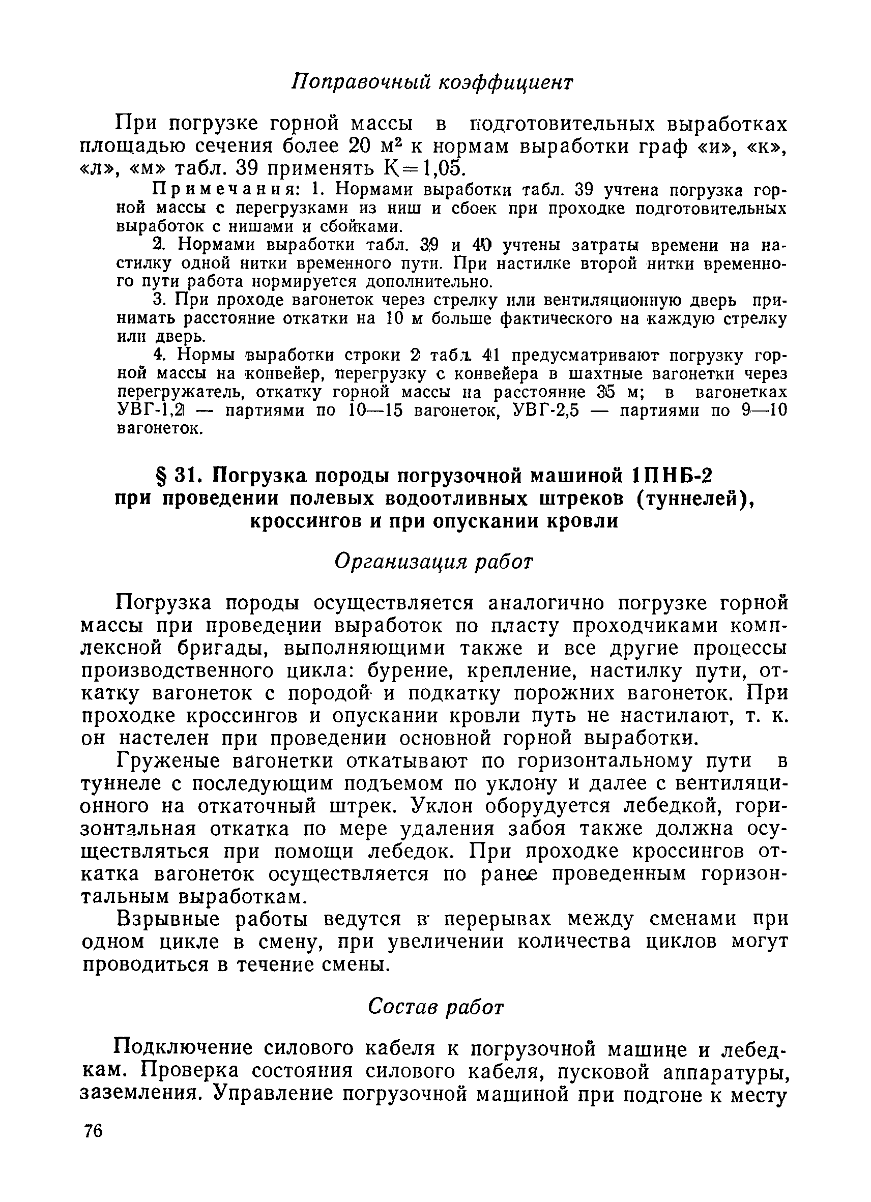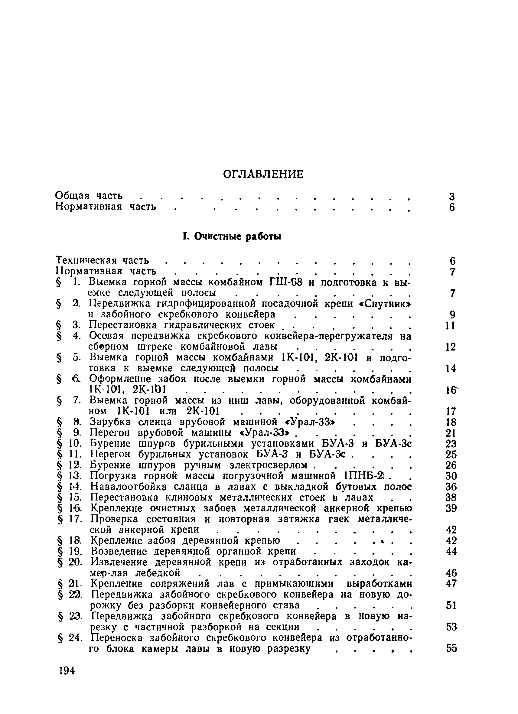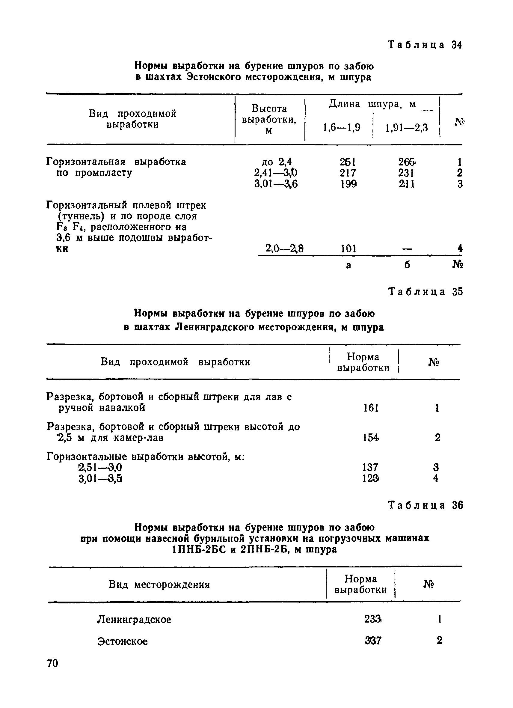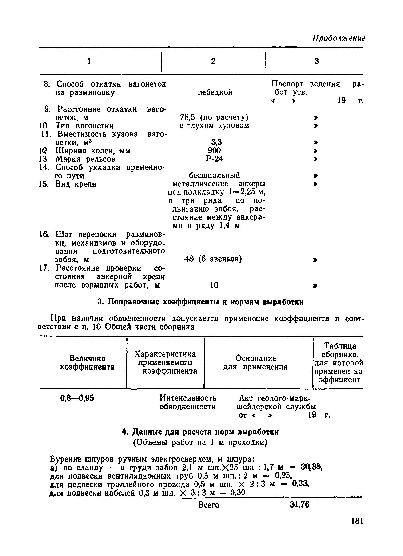 При внедрении нового оборудования, прогрессивной технологии ведения горных работ и более совершенных форм организации труда, не предусмотренных настоящим сборником, нормы должны устанавливаться с учетом технических возможностей оборудования в этих условиях. | | Оглавление: | Общая часть Нормативная часть I Очистные работы Техническая часть Нормативная часть § 1 Выемка горной массы комбайном ГШ-68 и подготовка к выемке следующей полосы § 2 Передвижка гидрофицированной посадочной крепи "Спутник" и забойного скребкового конвейера § 3 Перестановка гидравлических стоек § 4 Осевая передвижка скребкового конвейера-перегружателя на сборном штреке комбайновой лавы § 5 Выемка горной массы комбайнами 1К-101, 2К-101 и подготовка к выемке следующей полосы § 6 Оформление забоя после выемки горной массы комбайнами К-101, 2К-101 § 7 Выемка горной массы из ниш лавы, оборудованной комбайном 1К-101 или 2К-101 § 8 Зарубка сланца врубовой машиной "Урал-33" § 9 Перегон врубовой машины "Урал-33" § 10 Бурение шпуров бурильными установками БУА-3 и БУА-3с § 11 Перегон бурильных установок БУА-3 и БУА-3с § 12 Бурение шпуров ручным электросверлом § 13 Погрузка горной массы погрузочной машиной 1ПНБ-2 § 14 Навалоотбойка сланца в лавах с выкладкой бутовых полос § 15 Перестановка клиновых металлических стоек в лавах § 16 Крепление очистных забоев металлической анкерной крепью § 17 Проверка состояния и повторная затяжка гаек металлической анкерной крепи § 18 Крепление забоя деревянной крепью § 19 Возведение деревянной органной крепи § 20 Извлечение деревянной крепи из отработанных заходок камер-лав лебедкой § 21 Крепление сопряжений лав с примыкающими выработками § 22 Передвижка забойного скребкового конвейера на новую дорожку без разборки конвейерного става § 23 Передвижка забойного скребкового конвейера в новую нарезку с частичной разборкой на секции § 24 Переноска забойного скребкового конвейера из отработанного блока камеры лавы в новую разрезку § 25 Переноска забойного скребкового конвейера СП-63 с полной разборкой в лавах без машинной зарубки § 26 Разработка почвы под приводную головку забойного конвейера § 27 Уборка упавшей с кровли породы (вывалов) вручную II. Горно-подготовительные работы § 28 Проведение подготовительных горных выработок комбайнами ПК-3М, ПК-3Р § 29 Бурение шпуров ручными электросверлами в сланце и породе при буровзрывном способе прохождения выработок § 30 Погрузка горной массы погрузочной машиной 1ПНБ-2 § 31 Погрузка породы погрузочной машиной 1ПНБ-2 при проведении полевых водоотливных штреков (туннелей), кроссингов и при опускании кровли § 32 Ручная погрузка, перекидка и откатка горной массы и породы § 33 Проведение, углубка и очистка водоотливных канавок врубовой машиной "Урал-33" § 34 Уборка породы экскаватором "Беларусь" при проведении водосборников § 35 Уборка породы вручную при проведении водосборников § 36 Крепление горных выработок металлической анкерной крепью § 37 Проверка состояния и повторная затяжка гаек металлической анкерной крепи § 38 Извлечение временной металлической анкерной крепи в подготовительных горных выработках § 39 Крепление горных выработок в период эксплуатации металлическими штангами с заполнением шпура бетонной смесью § 40 Крепление горных выработок металлической трапециевидной крепью вразбежку § 41 Крепление горных выработок деревян