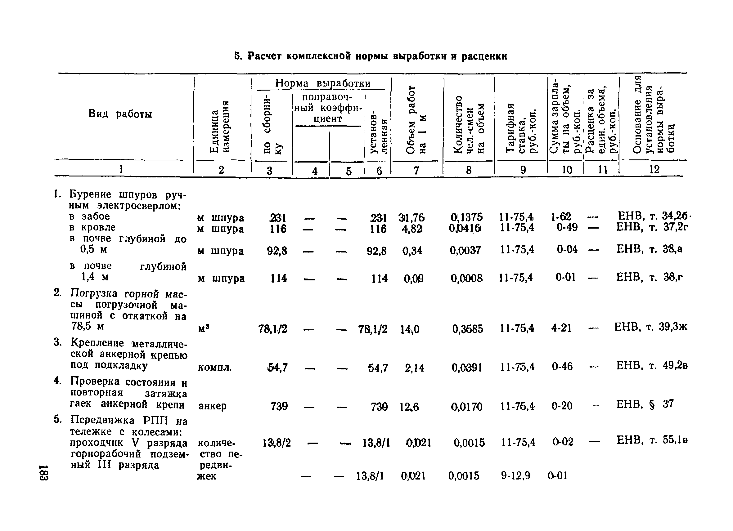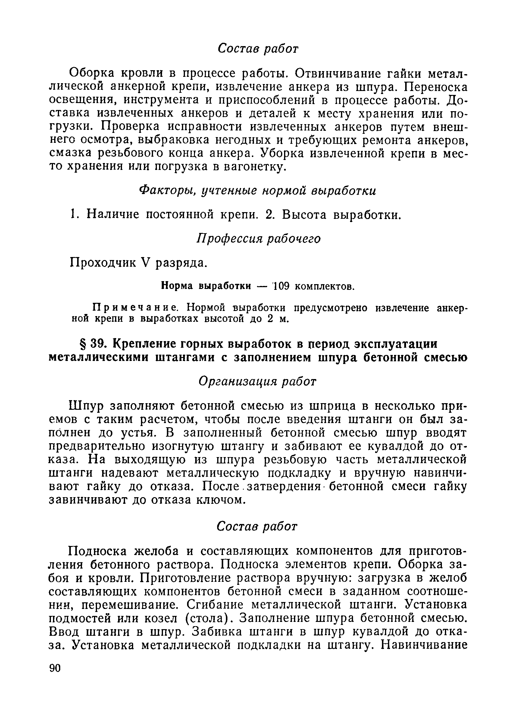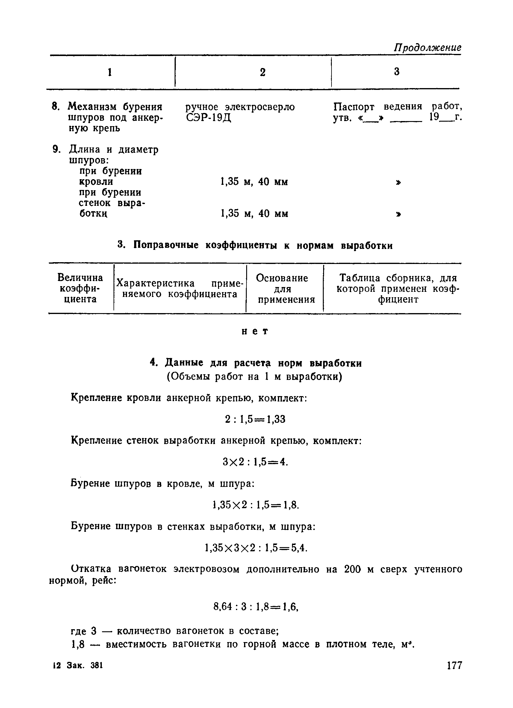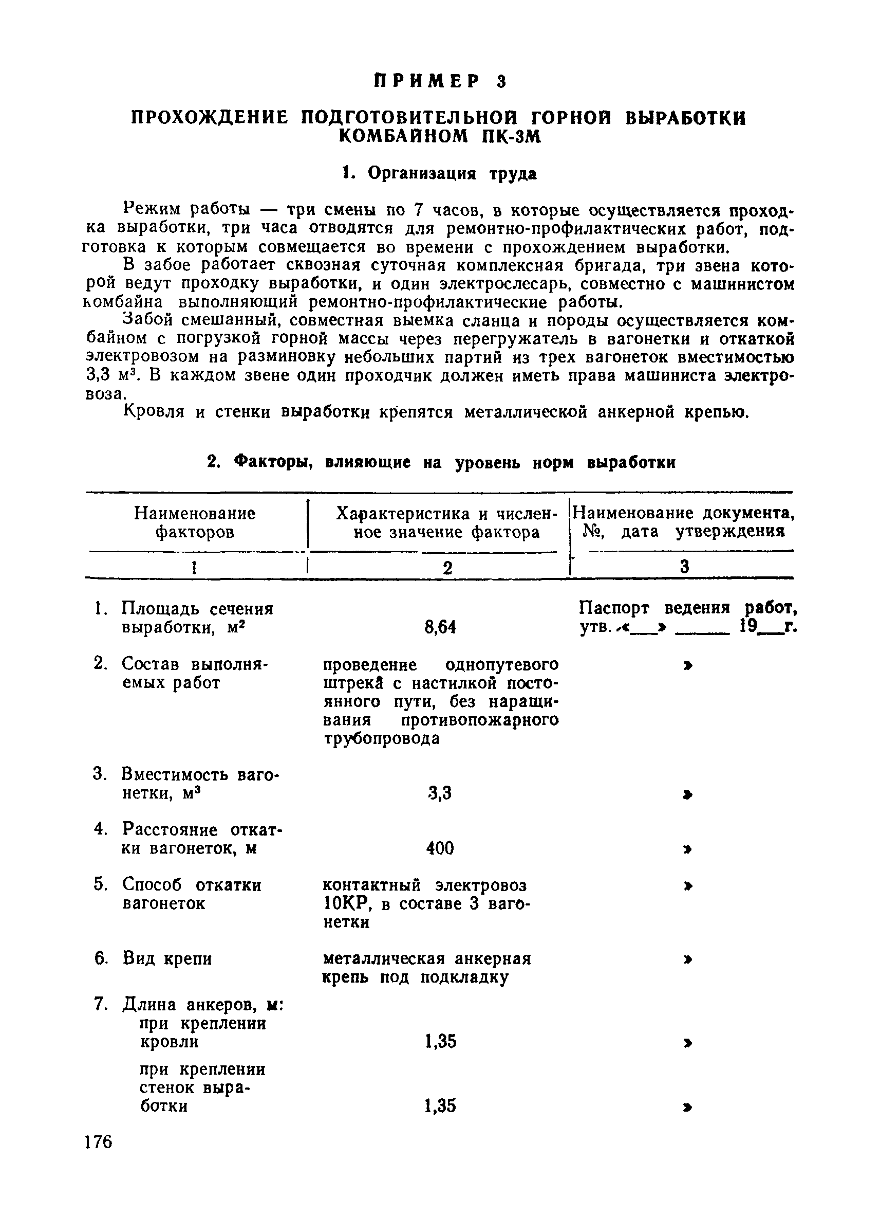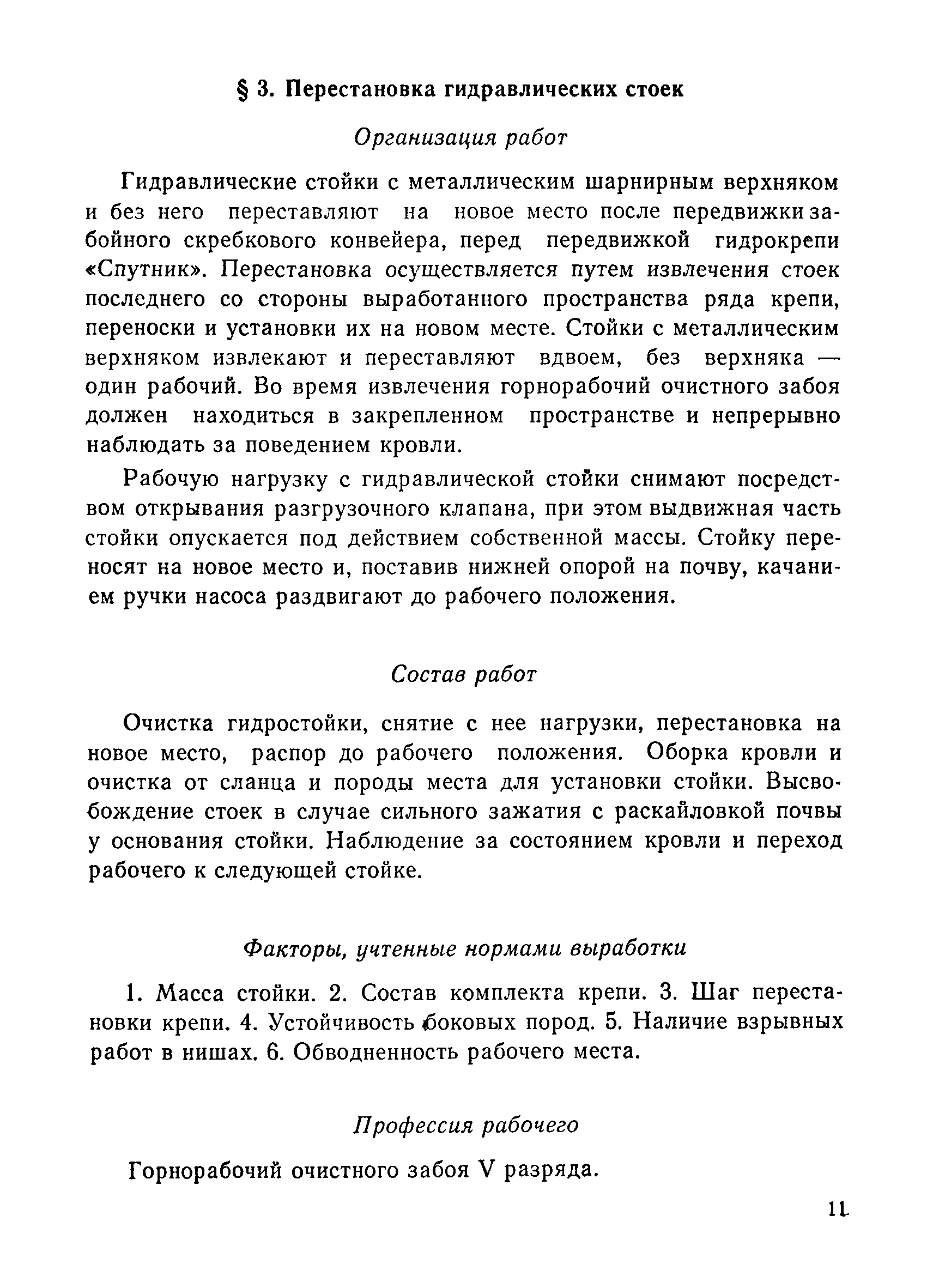 При внедрении нового оборудования, прогрессивной технологии ведения горных работ и более совершенных форм организации труда, не предусмотренных настоящим сборником, нормы должны устанавливаться с учетом технических возможностей оборудования в этих условиях. | | Оглавление: | Общая часть Нормативная часть I Очистные работы Техническая часть Нормативная часть § 1 Выемка горной массы комбайном ГШ-68 и подготовка к выемке следующей полосы § 2 Передвижка гидрофицированной посадочной крепи "Спутник" и забойного скребкового конвейера § 3 Перестановка гидравлических стоек § 4 Осевая передвижка скребкового конвейера-перегружателя на сборном штреке комбайновой лавы § 5 Выемка горной массы комбайнами 1К-101, 2К-101 и подготовка к выемке следующей полосы § 6 Оформление забоя после выемки горной массы комбайнами К-101, 2К-101 § 7 Выемка горной массы из ниш лавы, оборудованной комбайном 1К-101 или 2К-101 § 8 Зарубка сланца врубовой машиной "Урал-33" § 9 Перегон врубовой машины "Урал-33" § 10 Бурение шпуров бурильными установками БУА-3 и БУА-3с § 11 Перегон бурильных установок БУА-3 и БУА-3с § 12 Бурение шпуров ручным электросверлом § 13 Погрузка горной массы погрузочной машиной 1ПНБ-2 § 14 Навалоотбойка сланца в лавах с выкладкой бутовых полос § 15 Перестановка клиновых металлических стоек в лавах § 16 Крепление очистных забоев металлической анкерной крепью § 17 Проверка состояния и повторная затяжка гаек металлической анкерной крепи § 18 Крепление забоя деревянной крепью § 19 Возведение деревянной органной крепи § 20 Извлечение деревянной крепи из отработанных заходок камер-лав лебедкой § 21 Крепление сопряжений лав с примыкающими выработками § 22 Передвижка забойного скребкового конвейера на новую дорожку без разборки конвейерного става § 23 Передвижка забойного скребкового конвейера в новую нарезку с частичной разборкой на секции § 24 Переноска забойного скребкового конвейера из отработанного блока камеры лавы в новую разрезку § 25 Переноска забойного скребкового конвейера СП-63 с полной разборкой в лавах без машинной зарубки § 26 Разработка почвы под приводную головку забойного конвейера § 27 Уборка упавшей с кровли породы (вывалов) вручную II. Горно-подготовительные работы § 28 Проведение подготовительных горных выработок комбайнами ПК-3М, ПК-3Р § 29 Бурение шпуров ручными электросверлами в сланце и породе при буровзрывном способе прохождения выработок § 30 Погрузка горной массы погрузочной машиной 1ПНБ-2 § 31 Погрузка породы погрузочной машиной 1ПНБ-2 при проведении полевых водоотливных штреков (туннелей), кроссингов и при опускании кровли § 32 Ручная погрузка, перекидка и откатка горной массы и породы § 33 Проведение, углубка и очистка водоотливных канавок врубовой машиной "Урал-33" § 34 Уборка породы экскаватором "Беларусь" при проведении водосборников § 35 Уборка породы вручную при проведении водосборников § 36 Крепление горных выработок металлической анкерной крепью § 37 Проверка состояния и повторная затяжка гаек металлической анкерной крепи § 38 Извлечение временной металлической анкерной крепи в подготовительных горных выработках § 39 Крепление горных выработок в период эксплуатации металлическими штангами с заполнением шпура бетонной смесью § 40 Крепление горных выработок металлической трапециевидной крепью вразбежку § 41 Крепление горных выработок деревян