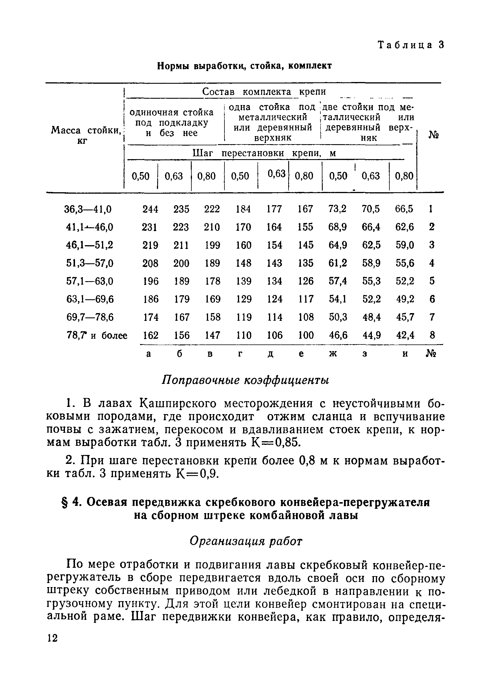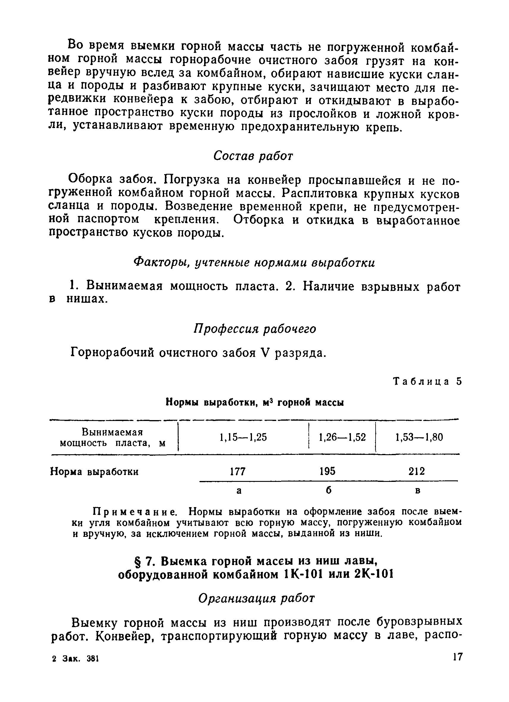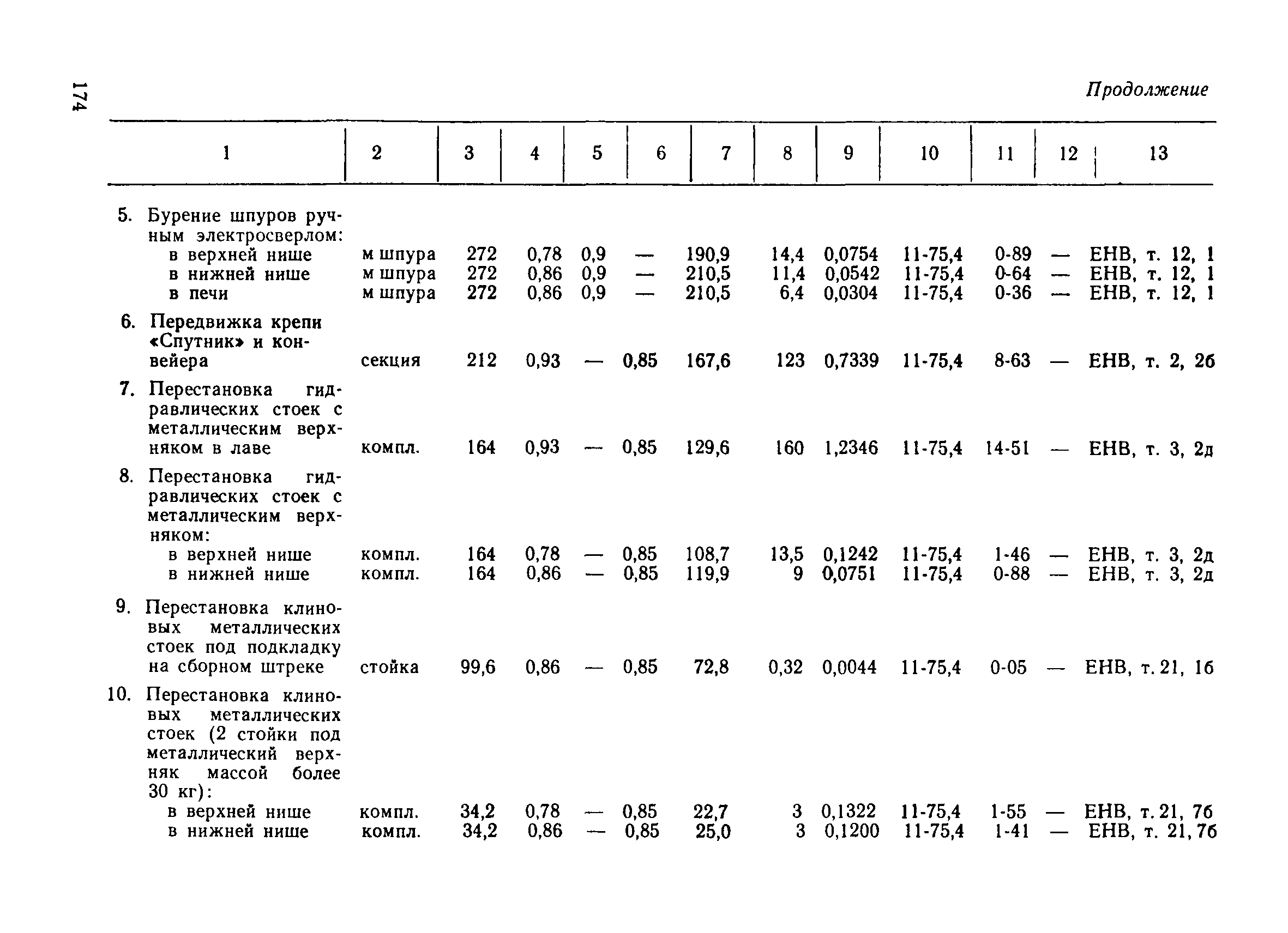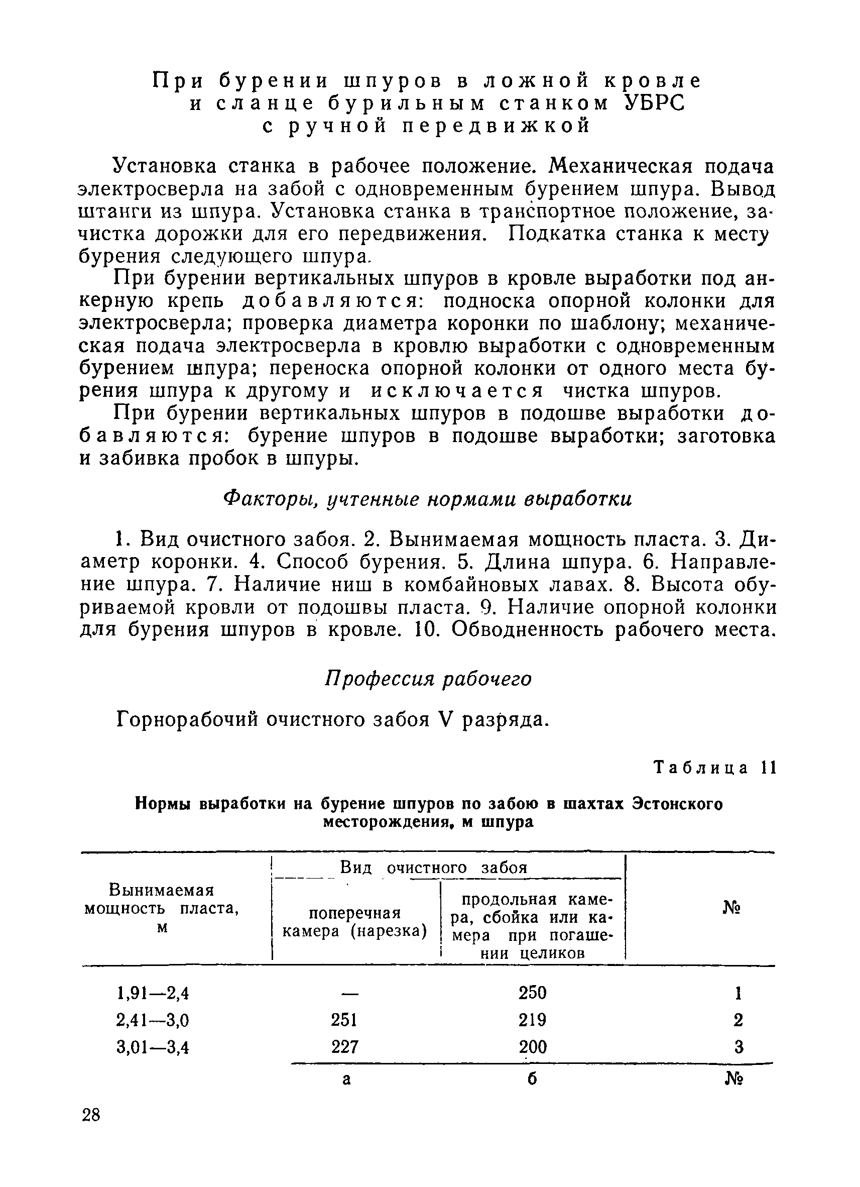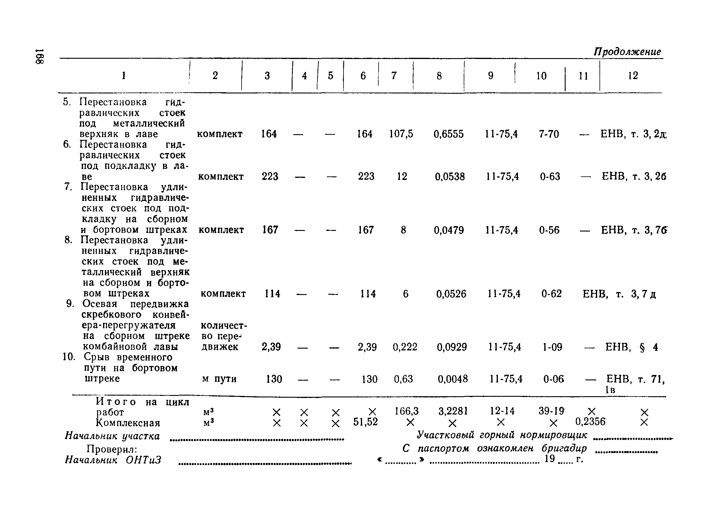 При внедрении нового оборудования, прогрессивной технологии ведения горных работ и более совершенных форм организации труда, не предусмотренных настоящим сборником, нормы должны устанавливаться с учетом технических возможностей оборудования в этих условиях. | | Оглавление: | Общая часть Нормативная часть I Очистные работы Техническая часть Нормативная часть § 1 Выемка горной массы комбайном ГШ-68 и подготовка к выемке следующей полосы § 2 Передвижка гидрофицированной посадочной крепи "Спутник" и забойного скребкового конвейера § 3 Перестановка гидравлических стоек § 4 Осевая передвижка скребкового конвейера-перегружателя на сборном штреке комбайновой лавы § 5 Выемка горной массы комбайнами 1К-101, 2К-101 и подготовка к выемке следующей полосы § 6 Оформление забоя после выемки горной массы комбайнами К-101, 2К-101 § 7 Выемка горной массы из ниш лавы, оборудованной комбайном 1К-101 или 2К-101 § 8 Зарубка сланца врубовой машиной "Урал-33" § 9 Перегон врубовой машины "Урал-33" § 10 Бурение шпуров бурильными установками БУА-3 и БУА-3с § 11 Перегон бурильных установок БУА-3 и БУА-3с § 12 Бурение шпуров ручным электросверлом § 13 Погрузка горной массы погрузочной машиной 1ПНБ-2 § 14 Навалоотбойка сланца в лавах с выкладкой бутовых полос § 15 Перестановка клиновых металлических стоек в лавах § 16 Крепление очистных забоев металлической анкерной крепью § 17 Проверка состояния и повторная затяжка гаек металлической анкерной крепи § 18 Крепление забоя деревянной крепью § 19 Возведение деревянной органной крепи § 20 Извлечение деревянной крепи из отработанных заходок камер-лав лебедкой § 21 Крепление сопряжений лав с примыкающими выработками § 22 Передвижка забойного скребкового конвейера на новую дорожку без разборки конвейерного става § 23 Передвижка забойного скребкового конвейера в новую нарезку с частичной разборкой на секции § 24 Переноска забойного скребкового конвейера из отработанного блока камеры лавы в новую разрезку § 25 Переноска забойного скребкового конвейера СП-63 с полной разборкой в лавах без машинной зарубки § 26 Разработка почвы под приводную головку забойного конвейера § 27 Уборка упавшей с кровли породы (вывалов) вручную II. Горно-подготовительные работы § 28 Проведение подготовительных горных выработок комбайнами ПК-3М, ПК-3Р § 29 Бурение шпуров ручными электросверлами в сланце и породе при буровзрывном способе прохождения выработок § 30 Погрузка горной массы погрузочной машиной 1ПНБ-2 § 31 Погрузка породы погрузочной машиной 1ПНБ-2 при проведении полевых водоотливных штреков (туннелей), кроссингов и при опускании кровли § 32 Ручная погрузка, перекидка и откатка горной массы и породы § 33 Проведение, углубка и очистка водоотливных канавок врубовой машиной "Урал-33" § 34 Уборка породы экскаватором "Беларусь" при проведении водосборников § 35 Уборка породы вручную при проведении водосборников § 36 Крепление горных выработок металлической анкерной крепью § 37 Проверка состояния и повторная затяжка гаек металлической анкерной крепи § 38 Извлечение временной металлической анкерной крепи в подготовительных горных выработках § 39 Крепление горных выработок в период эксплуатации металлическими штангами с заполнением шпура бетонной смесью § 40 Крепление горных выработок металлической трапециевидной крепью вразбежку § 41 Крепление горных выработок деревян
