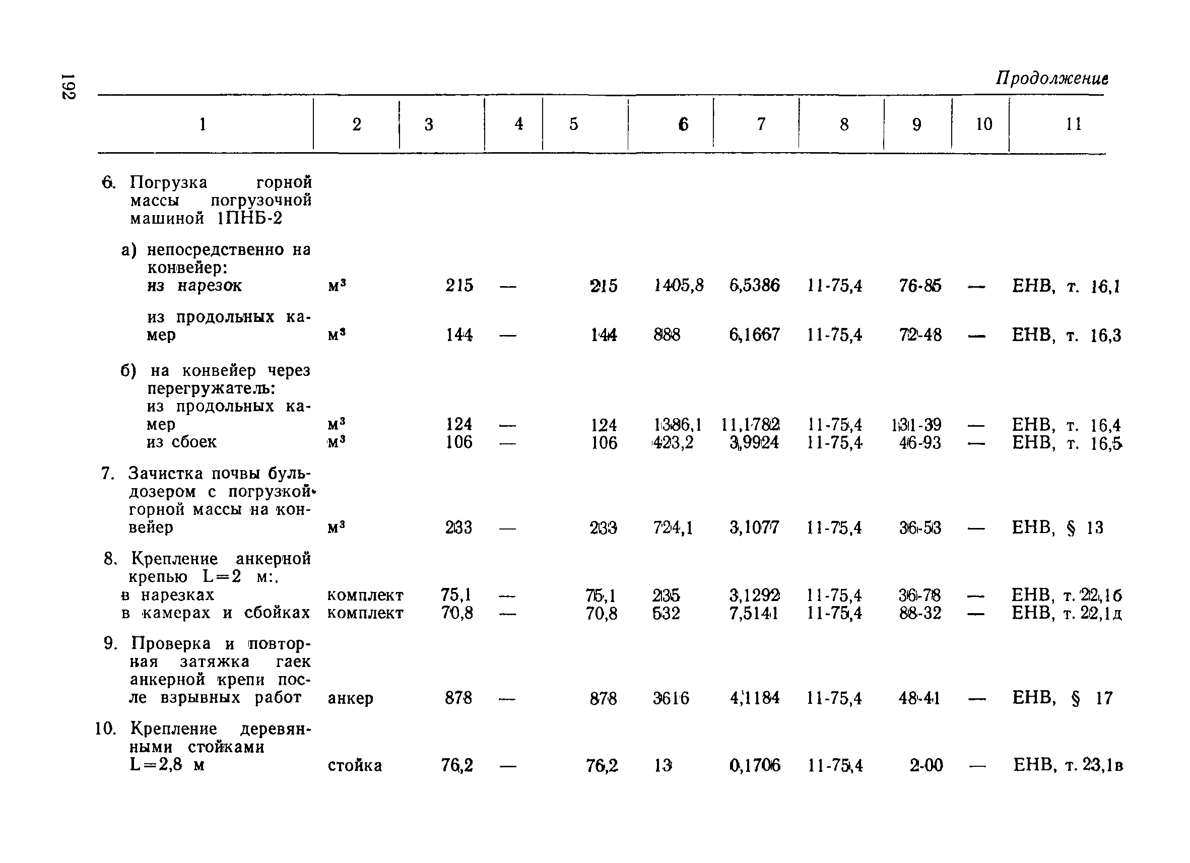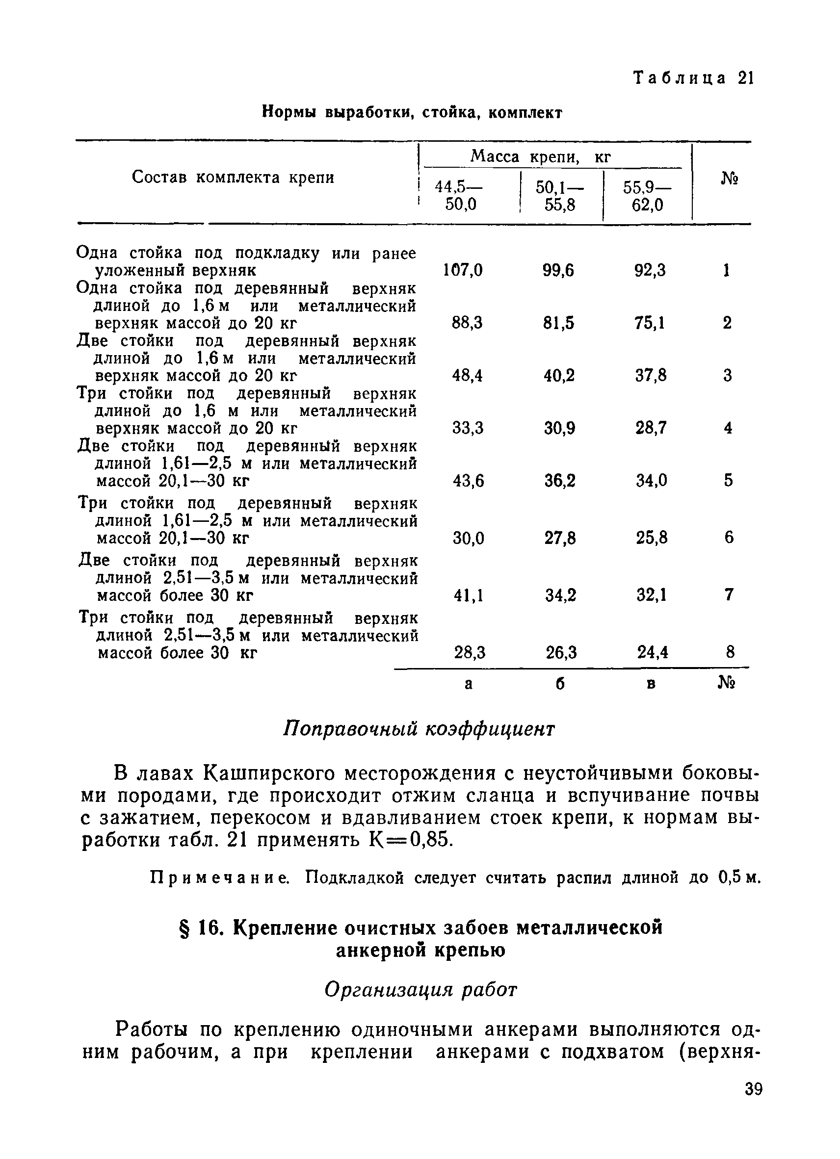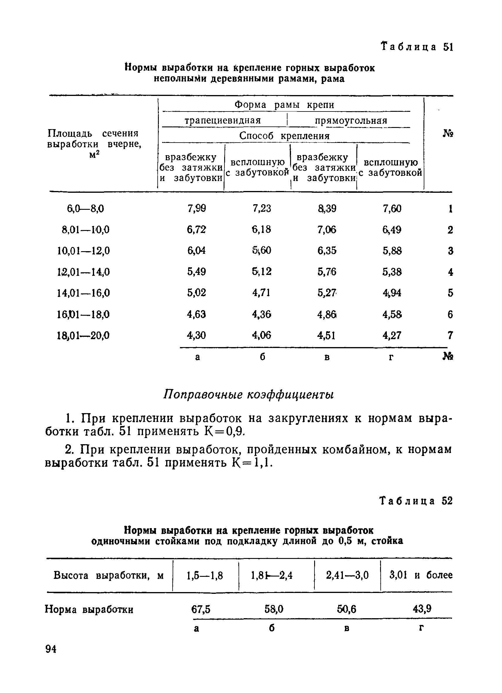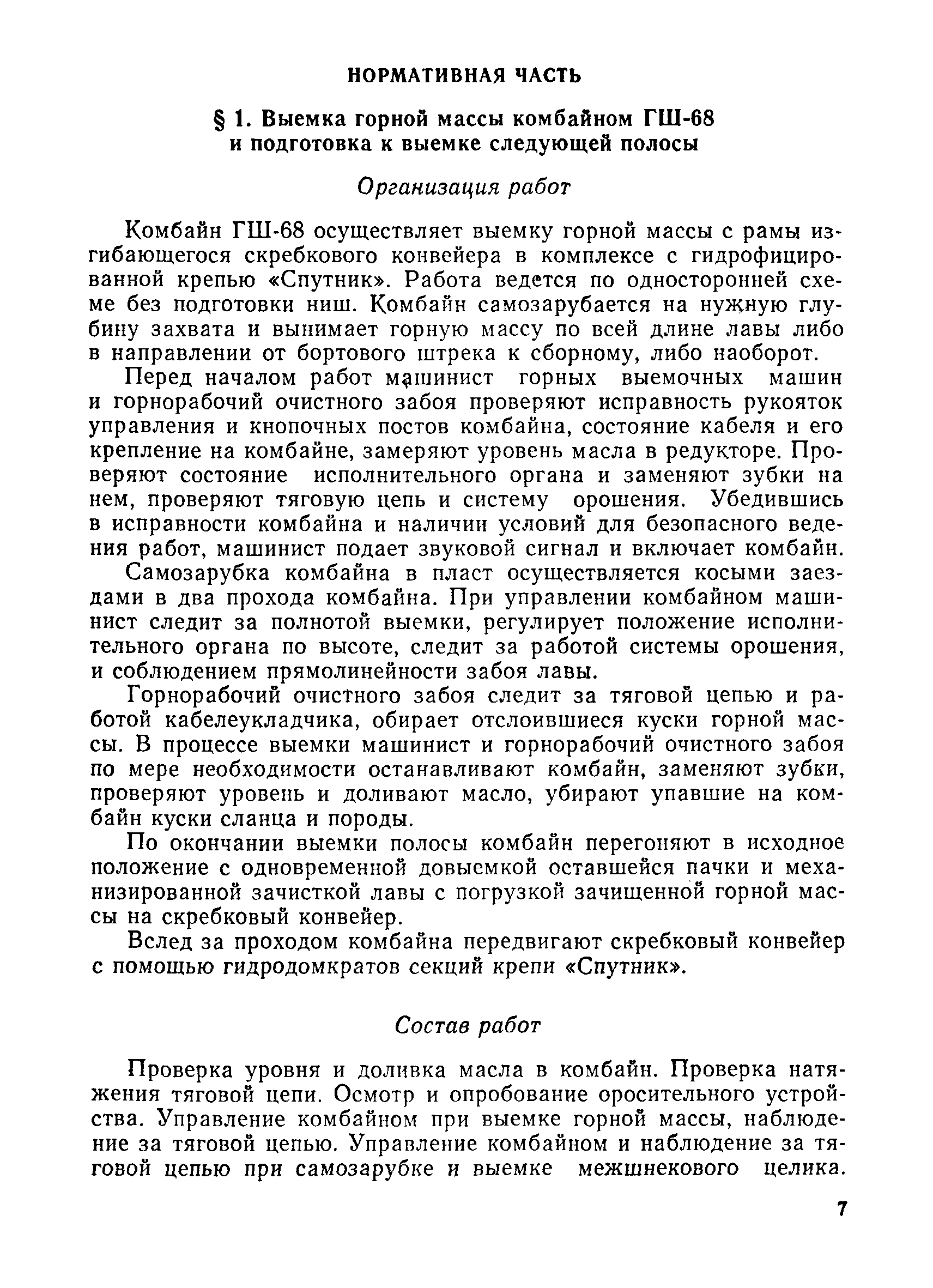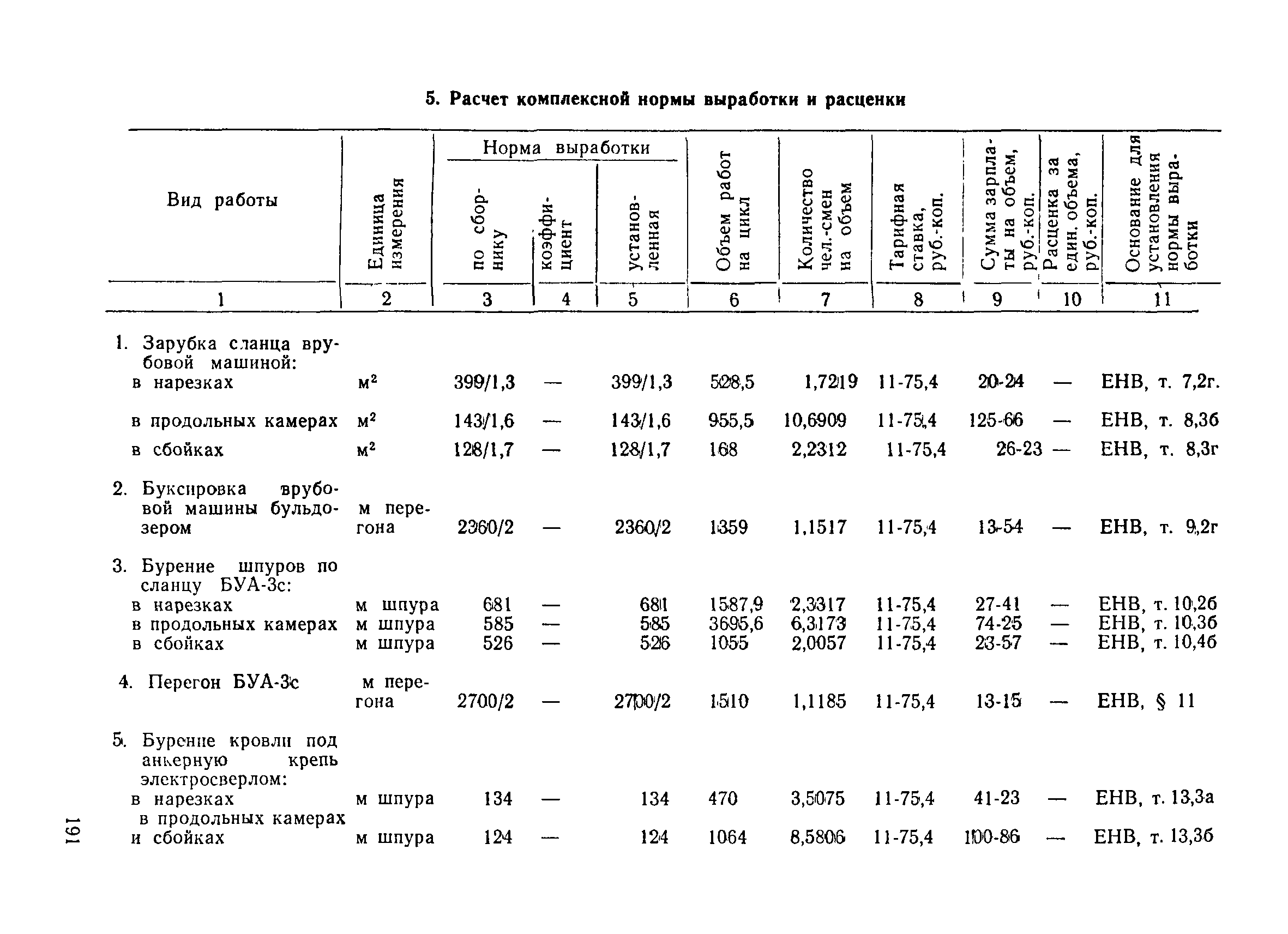 При внедрении нового оборудования, прогрессивной технологии ведения горных работ и более совершенных форм организации труда, не предусмотренных настоящим сборником, нормы должны устанавливаться с учетом технических возможностей оборудования в этих условиях. | | Оглавление: | Общая часть Нормативная часть I Очистные работы Техническая часть Нормативная часть § 1 Выемка горной массы комбайном ГШ-68 и подготовка к выемке следующей полосы § 2 Передвижка гидрофицированной посадочной крепи "Спутник" и забойного скребкового конвейера § 3 Перестановка гидравлических стоек § 4 Осевая передвижка скребкового конвейера-перегружателя на сборном штреке комбайновой лавы § 5 Выемка горной массы комбайнами 1К-101, 2К-101 и подготовка к выемке следующей полосы § 6 Оформление забоя после выемки горной массы комбайнами К-101, 2К-101 § 7 Выемка горной массы из ниш лавы, оборудованной комбайном 1К-101 или 2К-101 § 8 Зарубка сланца врубовой машиной "Урал-33" § 9 Перегон врубовой машины "Урал-33" § 10 Бурение шпуров бурильными установками БУА-3 и БУА-3с § 11 Перегон бурильных установок БУА-3 и БУА-3с § 12 Бурение шпуров ручным электросверлом § 13 Погрузка горной массы погрузочной машиной 1ПНБ-2 § 14 Навалоотбойка сланца в лавах с выкладкой бутовых полос § 15 Перестановка клиновых металлических стоек в лавах § 16 Крепление очистных забоев металлической анкерной крепью § 17 Проверка состояния и повторная затяжка гаек металлической анкерной крепи § 18 Крепление забоя деревянной крепью § 19 Возведение деревянной органной крепи § 20 Извлечение деревянной крепи из отработанных заходок камер-лав лебедкой § 21 Крепление сопряжений лав с примыкающими выработками § 22 Передвижка забойного скребкового конвейера на новую дорожку без разборки конвейерного става § 23 Передвижка забойного скребкового конвейера в новую нарезку с частичной разборкой на секции § 24 Переноска забойного скребкового конвейера из отработанного блока камеры лавы в новую разрезку § 25 Переноска забойного скребкового конвейера СП-63 с полной разборкой в лавах без машинной зарубки § 26 Разработка почвы под приводную головку забойного конвейера § 27 Уборка упавшей с кровли породы (вывалов) вручную II. Горно-подготовительные работы § 28 Проведение подготовительных горных выработок комбайнами ПК-3М, ПК-3Р § 29 Бурение шпуров ручными электросверлами в сланце и породе при буровзрывном способе прохождения выработок § 30 Погрузка горной массы погрузочной машиной 1ПНБ-2 § 31 Погрузка породы погрузочной машиной 1ПНБ-2 при проведении полевых водоотливных штреков (туннелей), кроссингов и при опускании кровли § 32 Ручная погрузка, перекидка и откатка горной массы и породы § 33 Проведение, углубка и очистка водоотливных канавок врубовой машиной "Урал-33" § 34 Уборка породы экскаватором "Беларусь" при проведении водосборников § 35 Уборка породы вручную при проведении водосборников § 36 Крепление горных выработок металлической анкерной крепью § 37 Проверка состояния и повторная затяжка гаек металлической анкерной крепи § 38 Извлечение временной металлической анкерной крепи в подготовительных горных выработках § 39 Крепление горных выработок в период эксплуатации металлическими штангами с заполнением шпура бетонной смесью § 40 Крепление горных выработок металлической трапециевидной крепью вразбежку § 41 Крепление горных выработок деревян