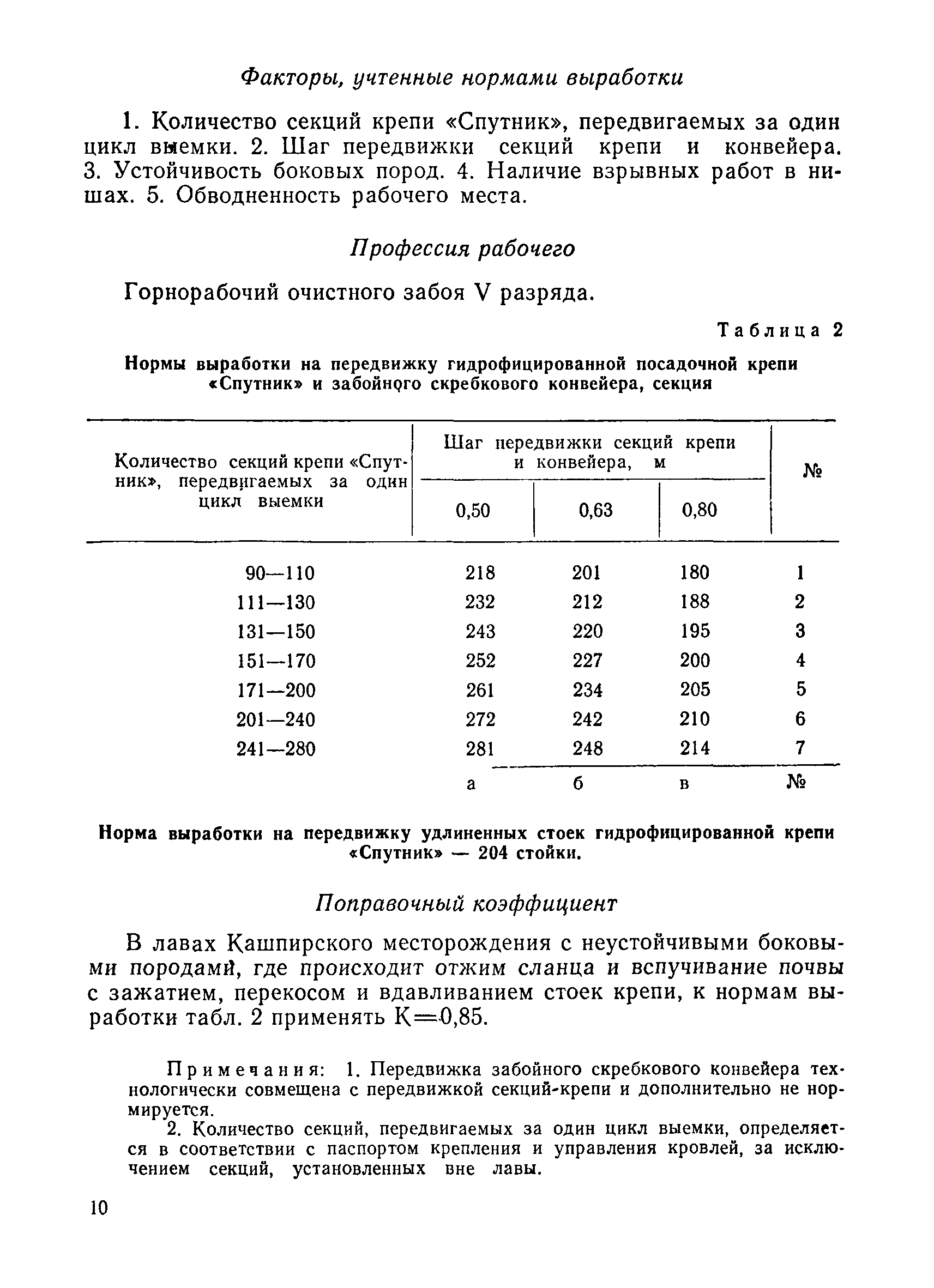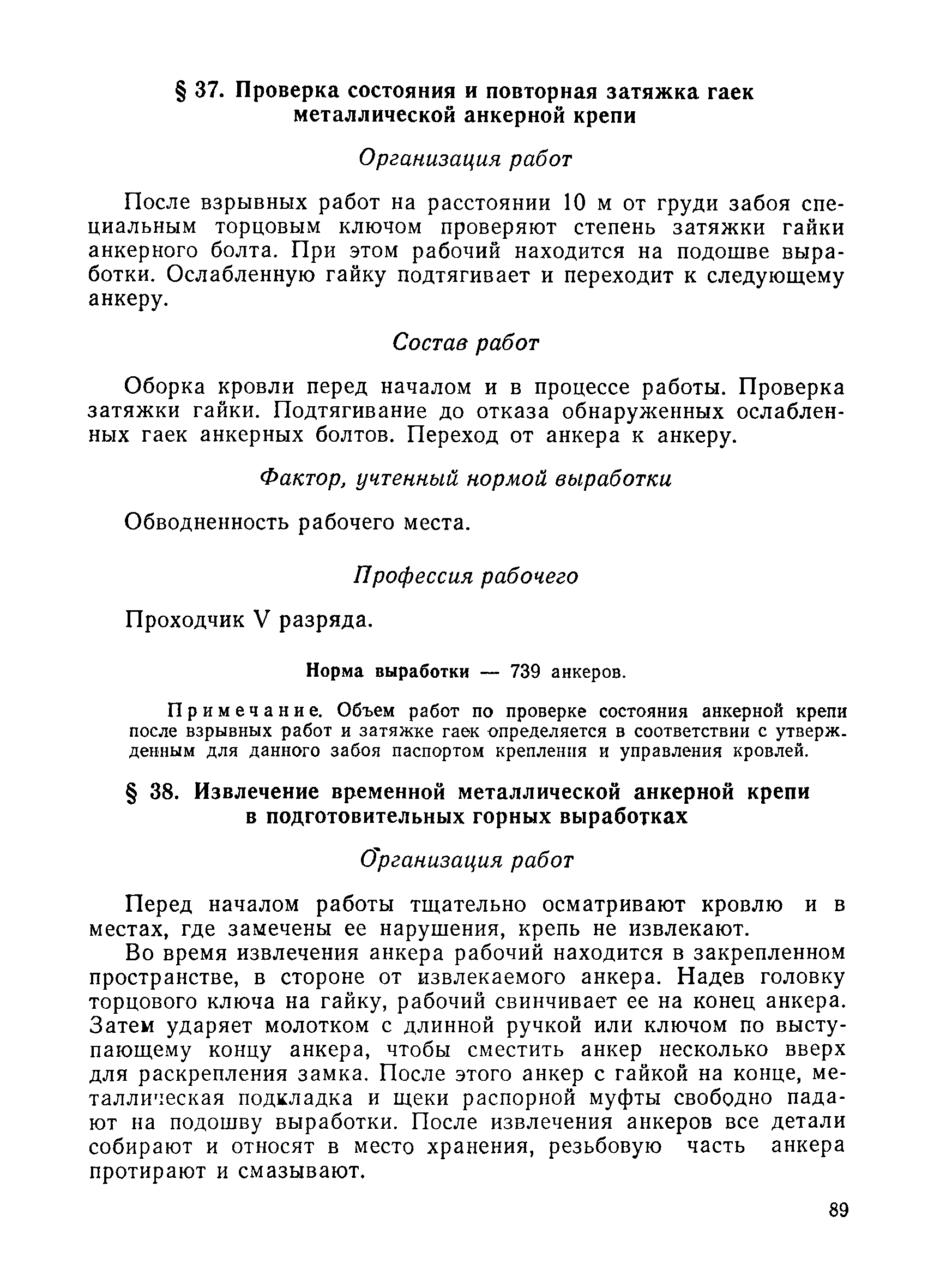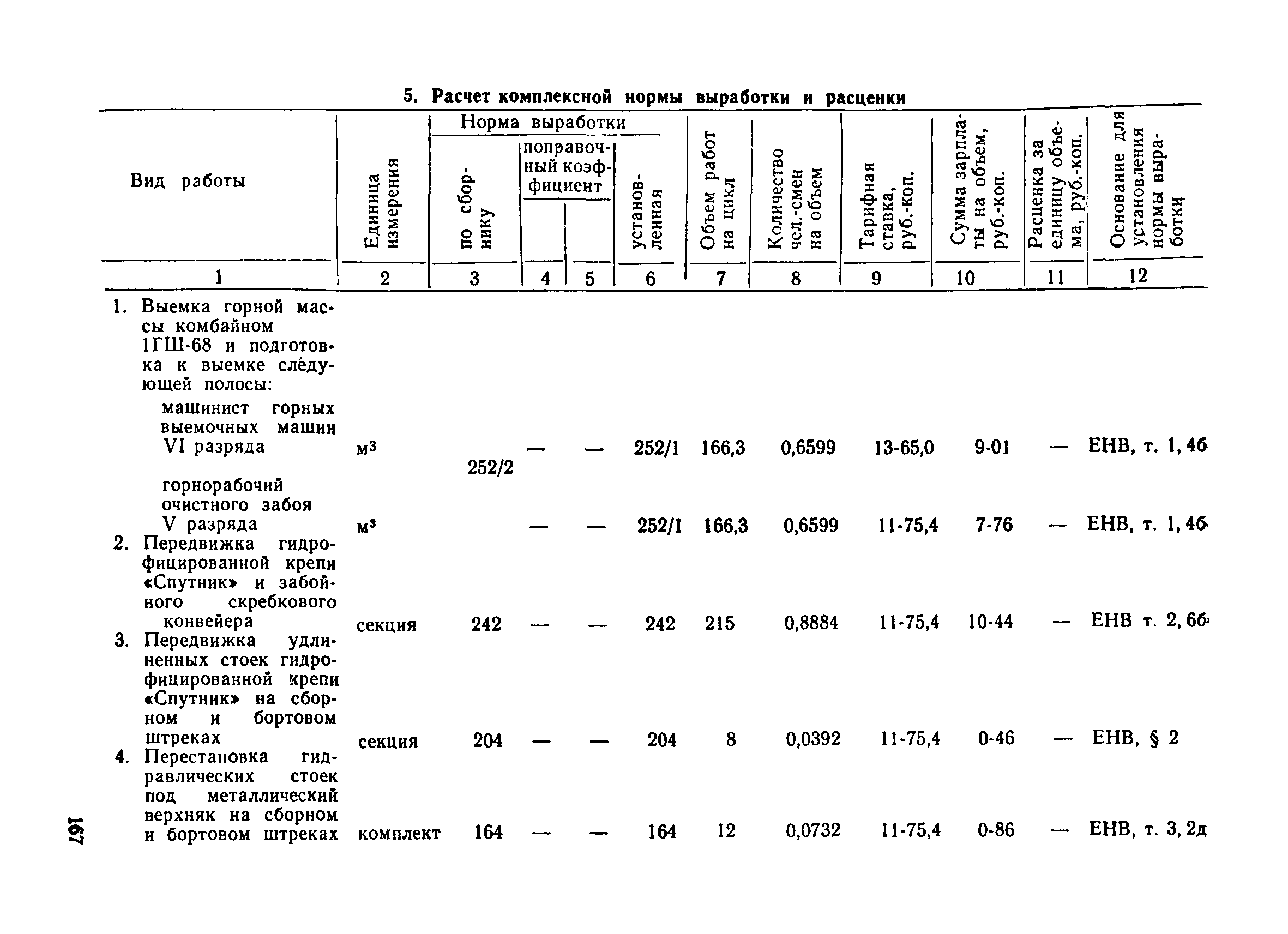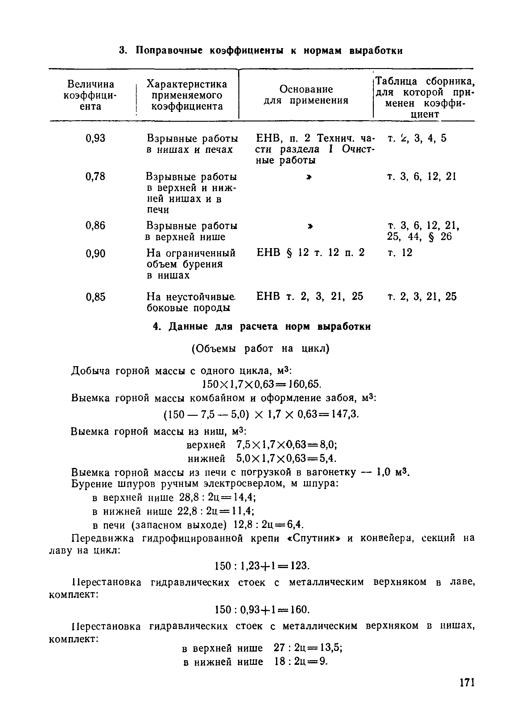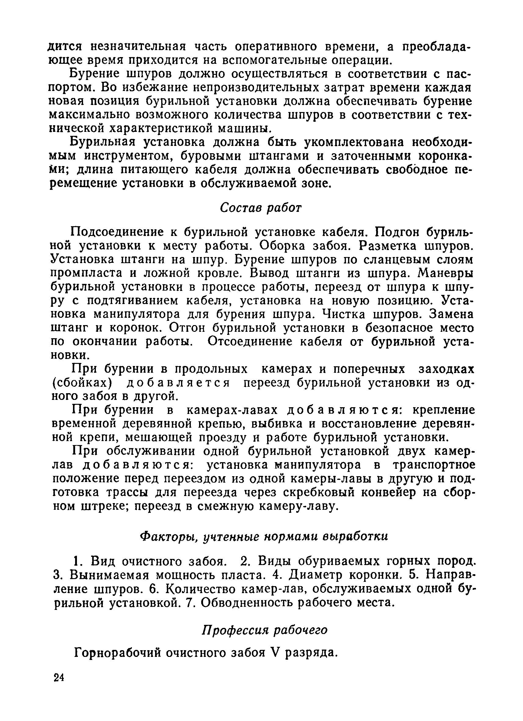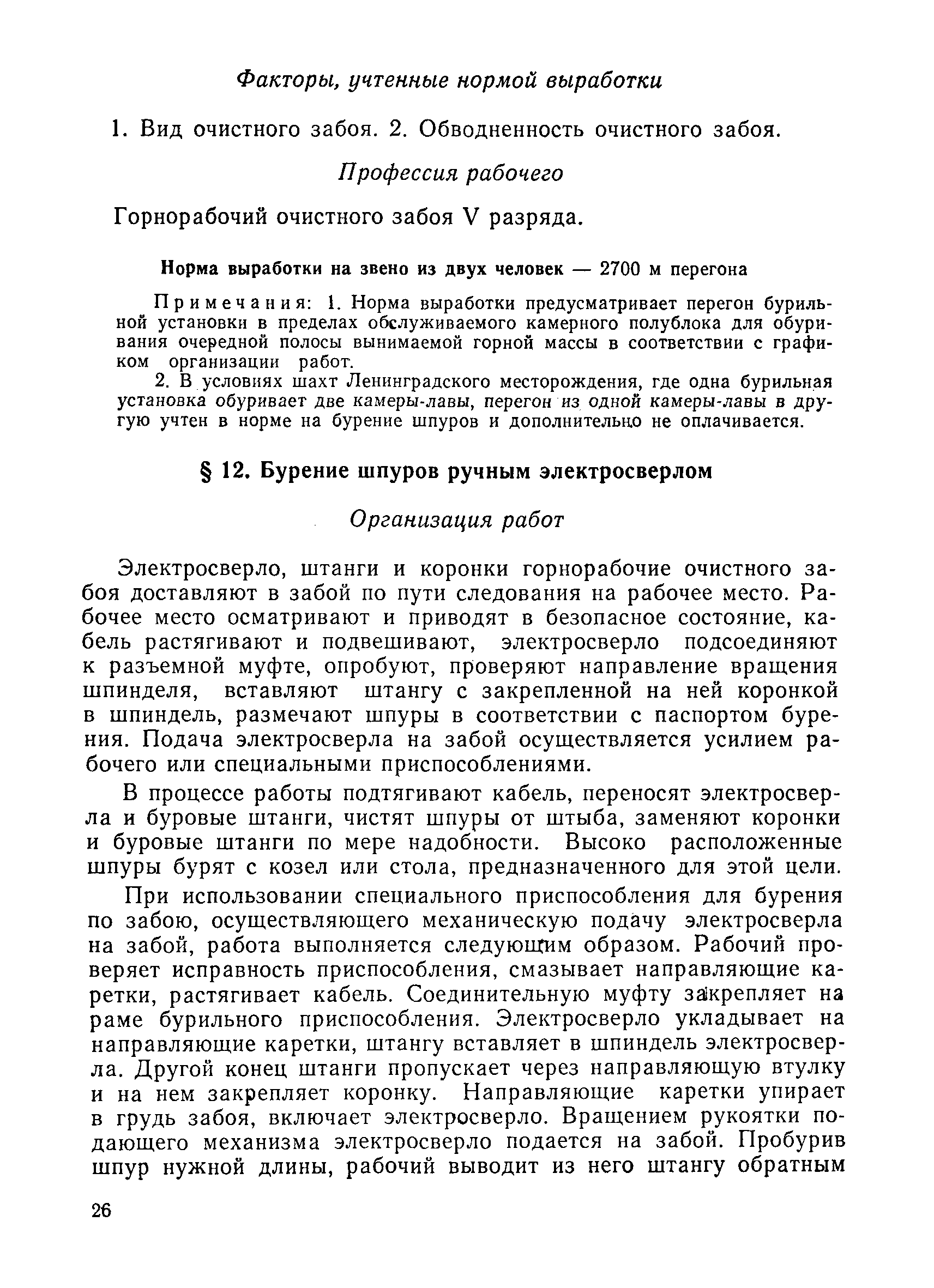 При внедрении нового оборудования, прогрессивной технологии ведения горных работ и более совершенных форм организации труда, не предусмотренных настоящим сборником, нормы должны устанавливаться с учетом технических возможностей оборудования в этих условиях. | | Оглавление: | Общая часть Нормативная часть I Очистные работы Техническая часть Нормативная часть § 1 Выемка горной массы комбайном ГШ-68 и подготовка к выемке следующей полосы § 2 Передвижка гидрофицированной посадочной крепи "Спутник" и забойного скребкового конвейера § 3 Перестановка гидравлических стоек § 4 Осевая передвижка скребкового конвейера-перегружателя на сборном штреке комбайновой лавы § 5 Выемка горной массы комбайнами 1К-101, 2К-101 и подготовка к выемке следующей полосы § 6 Оформление забоя после выемки горной массы комбайнами К-101, 2К-101 § 7 Выемка горной массы из ниш лавы, оборудованной комбайном 1К-101 или 2К-101 § 8 Зарубка сланца врубовой машиной "Урал-33" § 9 Перегон врубовой машины "Урал-33" § 10 Бурение шпуров бурильными установками БУА-3 и БУА-3с § 11 Перегон бурильных установок БУА-3 и БУА-3с § 12 Бурение шпуров ручным электросверлом § 13 Погрузка горной массы погрузочной машиной 1ПНБ-2 § 14 Навалоотбойка сланца в лавах с выкладкой бутовых полос § 15 Перестановка клиновых металлических стоек в лавах § 16 Крепление очистных забоев металлической анкерной крепью § 17 Проверка состояния и повторная затяжка гаек металлической анкерной крепи § 18 Крепление забоя деревянной крепью § 19 Возведение деревянной органной крепи § 20 Извлечение деревянной крепи из отработанных заходок камер-лав лебедкой § 21 Крепление сопряжений лав с примыкающими выработками § 22 Передвижка забойного скребкового конвейера на новую дорожку без разборки конвейерного става § 23 Передвижка забойного скребкового конвейера в новую нарезку с частичной разборкой на секции § 24 Переноска забойного скребкового конвейера из отработанного блока камеры лавы в новую разрезку § 25 Переноска забойного скребкового конвейера СП-63 с полной разборкой в лавах без машинной зарубки § 26 Разработка почвы под приводную головку забойного конвейера § 27 Уборка упавшей с кровли породы (вывалов) вручную II. Горно-подготовительные работы § 28 Проведение подготовительных горных выработок комбайнами ПК-3М, ПК-3Р § 29 Бурение шпуров ручными электросверлами в сланце и породе при буровзрывном способе прохождения выработок § 30 Погрузка горной массы погрузочной машиной 1ПНБ-2 § 31 Погрузка породы погрузочной машиной 1ПНБ-2 при проведении полевых водоотливных штреков (туннелей), кроссингов и при опускании кровли § 32 Ручная погрузка, перекидка и откатка горной массы и породы § 33 Проведение, углубка и очистка водоотливных канавок врубовой машиной "Урал-33" § 34 Уборка породы экскаватором "Беларусь" при проведении водосборников § 35 Уборка породы вручную при проведении водосборников § 36 Крепление горных выработок металлической анкерной крепью § 37 Проверка состояния и повторная затяжка гаек металлической анкерной крепи § 38 Извлечение временной металлической анкерной крепи в подготовительных горных выработках § 39 Крепление горных выработок в период эксплуатации металлическими штангами с заполнением шпура бетонной смесью § 40 Крепление горных выработок металлической трапециевидной крепью вразбежку § 41 Крепление горных выработок деревян
