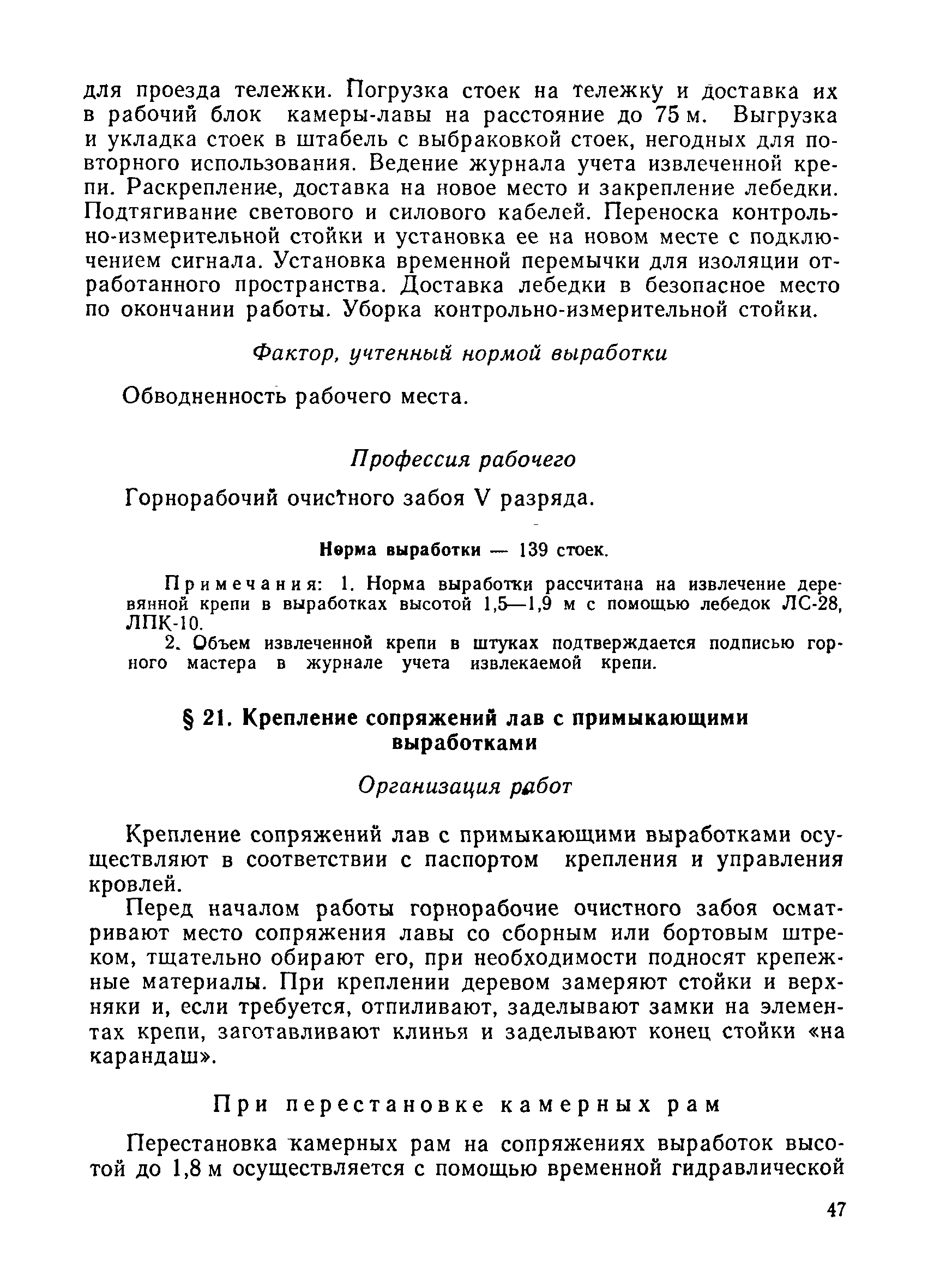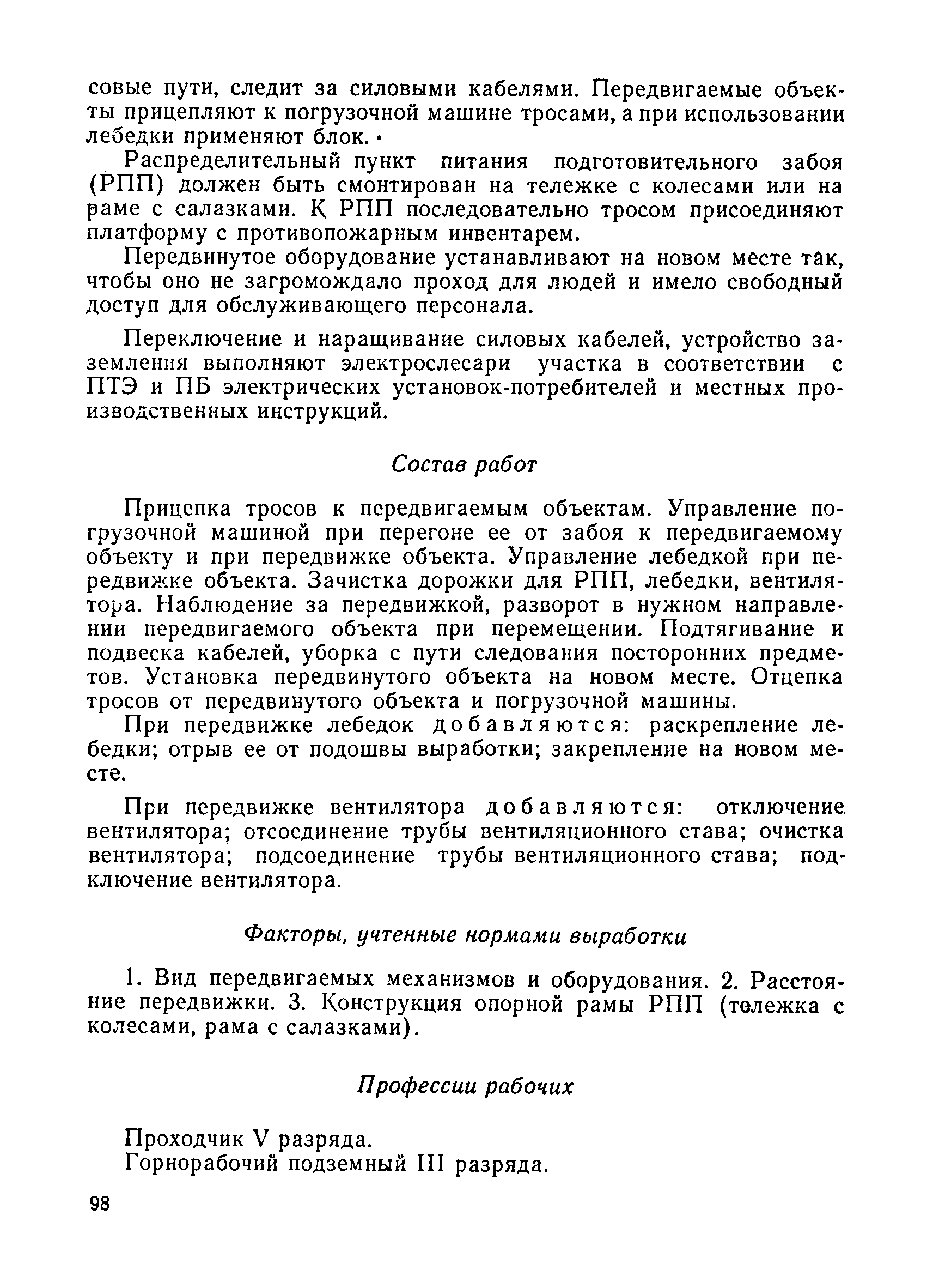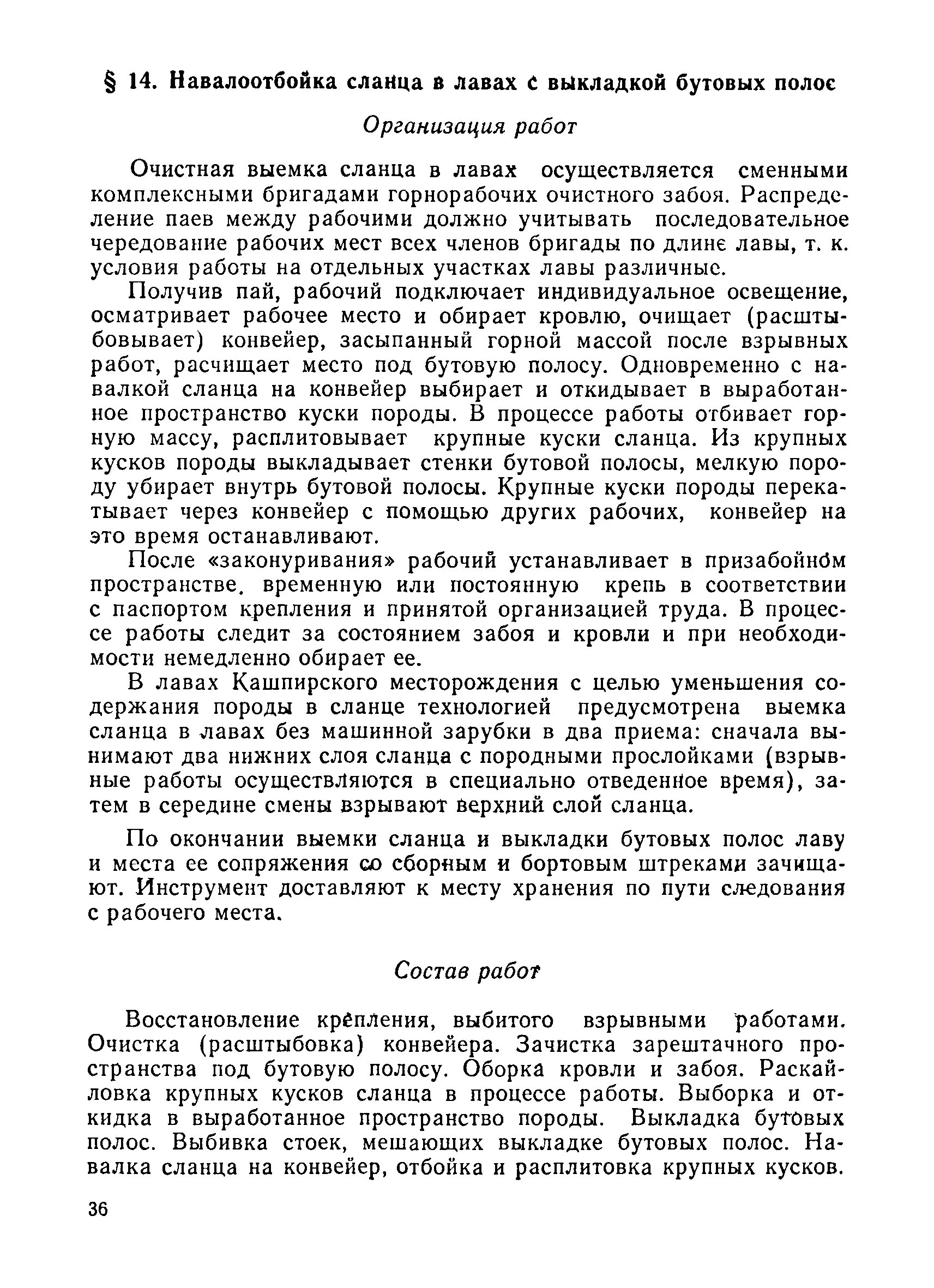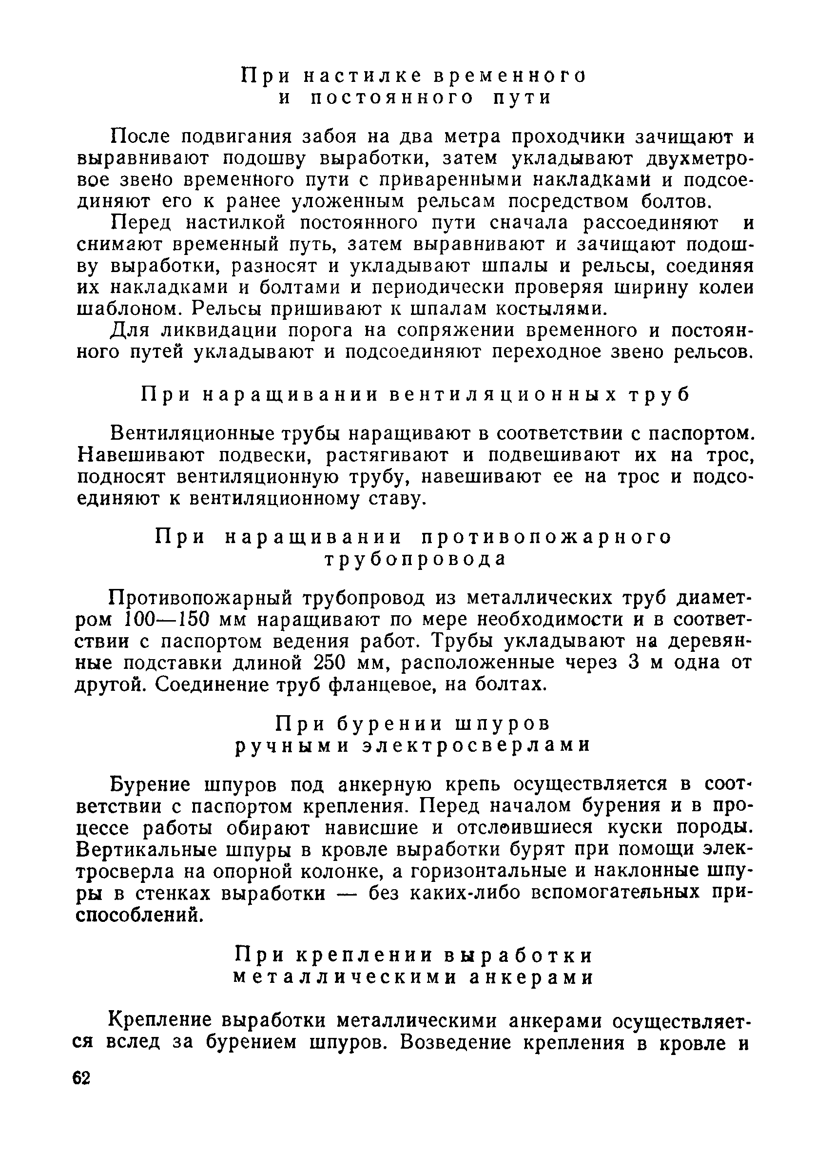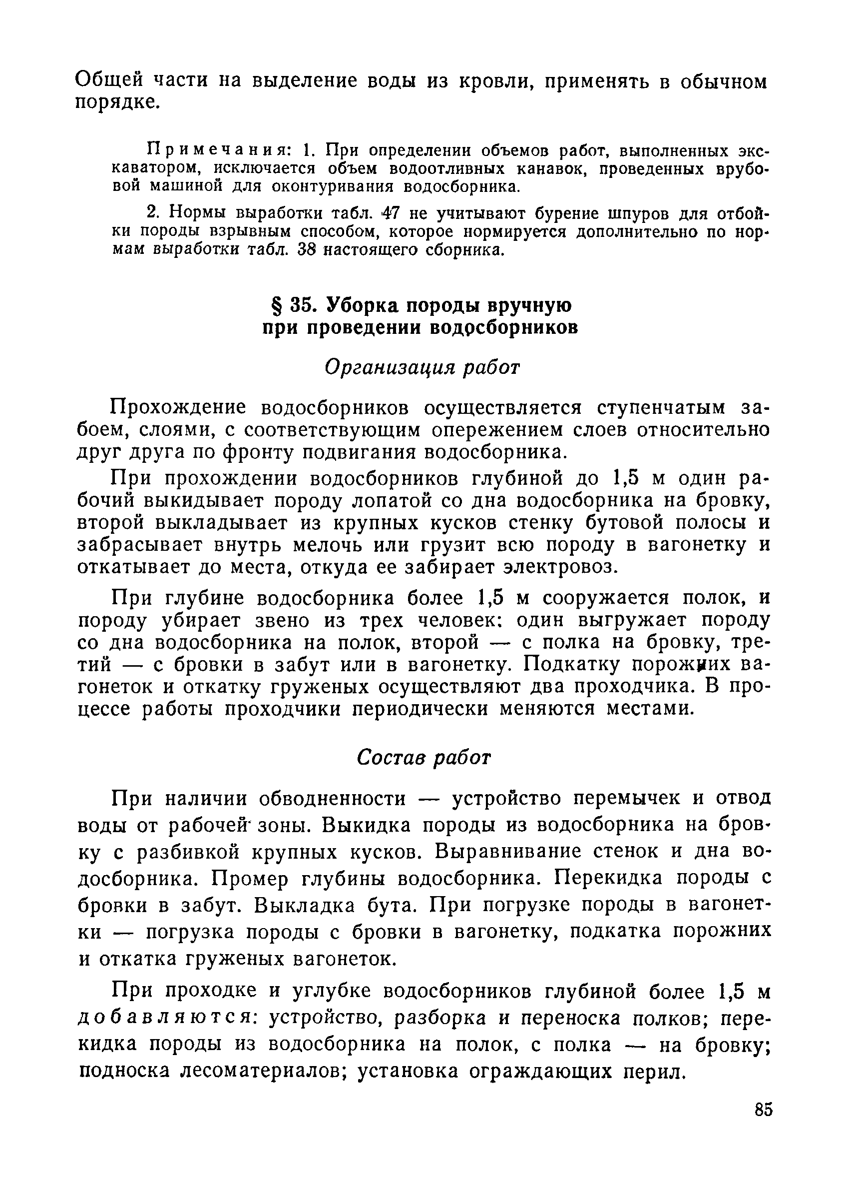 При внедрении нового оборудования, прогрессивной технологии ведения горных работ и более совершенных форм организации труда, не предусмотренных настоящим сборником, нормы должны устанавливаться с учетом технических возможностей оборудования в этих условиях. | | Оглавление: | Общая часть Нормативная часть I Очистные работы Техническая часть Нормативная часть § 1 Выемка горной массы комбайном ГШ-68 и подготовка к выемке следующей полосы § 2 Передвижка гидрофицированной посадочной крепи "Спутник" и забойного скребкового конвейера § 3 Перестановка гидравлических стоек § 4 Осевая передвижка скребкового конвейера-перегружателя на сборном штреке комбайновой лавы § 5 Выемка горной массы комбайнами 1К-101, 2К-101 и подготовка к выемке следующей полосы § 6 Оформление забоя после выемки горной массы комбайнами К-101, 2К-101 § 7 Выемка горной массы из ниш лавы, оборудованной комбайном 1К-101 или 2К-101 § 8 Зарубка сланца врубовой машиной "Урал-33" § 9 Перегон врубовой машины "Урал-33" § 10 Бурение шпуров бурильными установками БУА-3 и БУА-3с § 11 Перегон бурильных установок БУА-3 и БУА-3с § 12 Бурение шпуров ручным электросверлом § 13 Погрузка горной массы погрузочной машиной 1ПНБ-2 § 14 Навалоотбойка сланца в лавах с выкладкой бутовых полос § 15 Перестановка клиновых металлических стоек в лавах § 16 Крепление очистных забоев металлической анкерной крепью § 17 Проверка состояния и повторная затяжка гаек металлической анкерной крепи § 18 Крепление забоя деревянной крепью § 19 Возведение деревянной органной крепи § 20 Извлечение деревянной крепи из отработанных заходок камер-лав лебедкой § 21 Крепление сопряжений лав с примыкающими выработками § 22 Передвижка забойного скребкового конвейера на новую дорожку без разборки конвейерного става § 23 Передвижка забойного скребкового конвейера в новую нарезку с частичной разборкой на секции § 24 Переноска забойного скребкового конвейера из отработанного блока камеры лавы в новую разрезку § 25 Переноска забойного скребкового конвейера СП-63 с полной разборкой в лавах без машинной зарубки § 26 Разработка почвы под приводную головку забойного конвейера § 27 Уборка упавшей с кровли породы (вывалов) вручную II. Горно-подготовительные работы § 28 Проведение подготовительных горных выработок комбайнами ПК-3М, ПК-3Р § 29 Бурение шпуров ручными электросверлами в сланце и породе при буровзрывном способе прохождения выработок § 30 Погрузка горной массы погрузочной машиной 1ПНБ-2 § 31 Погрузка породы погрузочной машиной 1ПНБ-2 при проведении полевых водоотливных штреков (туннелей), кроссингов и при опускании кровли § 32 Ручная погрузка, перекидка и откатка горной массы и породы § 33 Проведение, углубка и очистка водоотливных канавок врубовой машиной "Урал-33" § 34 Уборка породы экскаватором "Беларусь" при проведении водосборников § 35 Уборка породы вручную при проведении водосборников § 36 Крепление горных выработок металлической анкерной крепью § 37 Проверка состояния и повторная затяжка гаек металлической анкерной крепи § 38 Извлечение временной металлической анкерной крепи в подготовительных горных выработках § 39 Крепление горных выработок в период эксплуатации металлическими штангами с заполнением шпура бетонной смесью § 40 Крепление горных выработок металлической трапециевидной крепью вразбежку § 41 Крепление горных выработок деревян