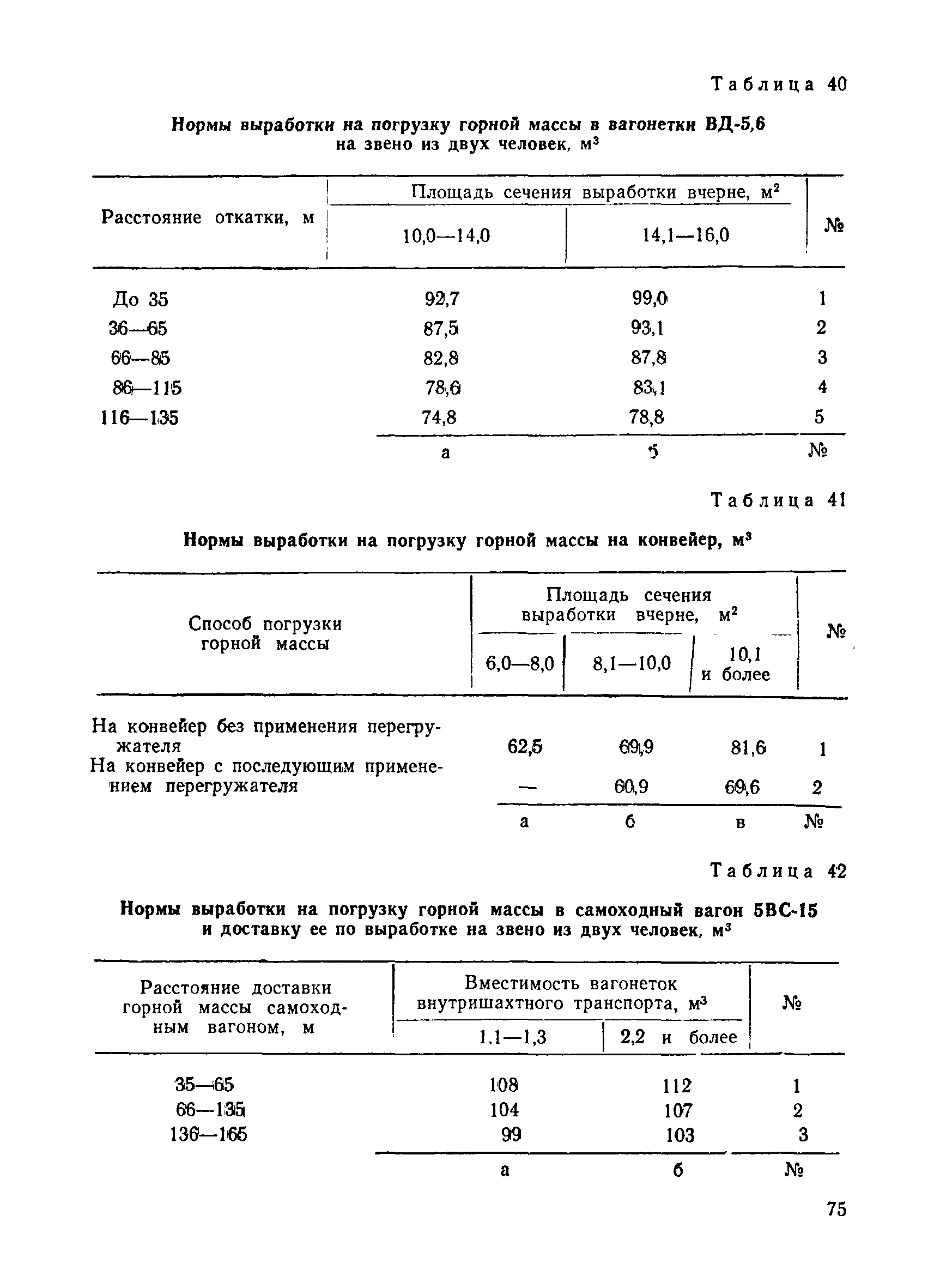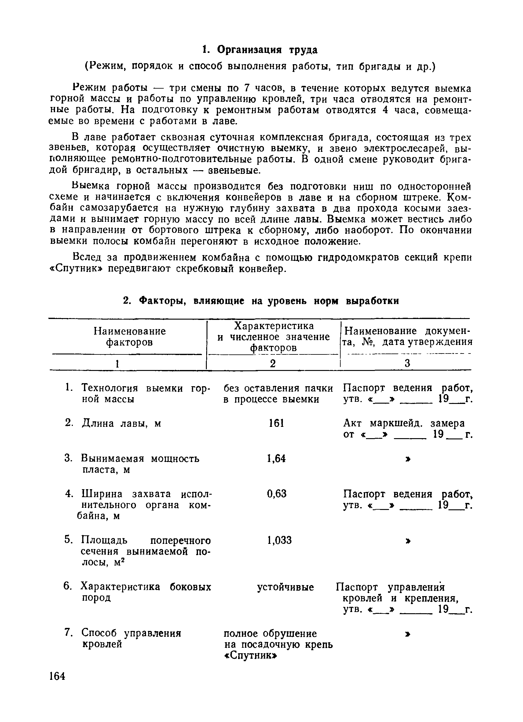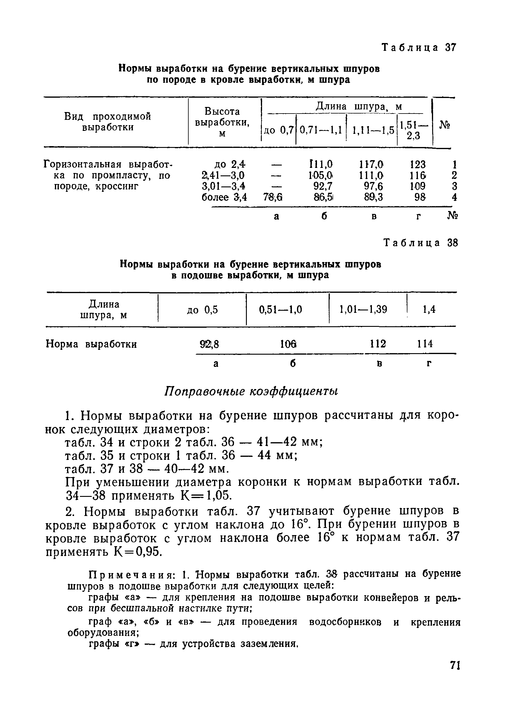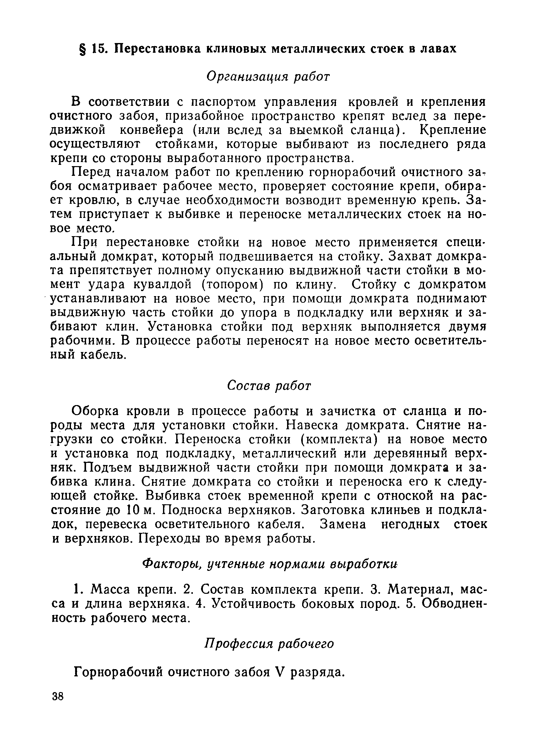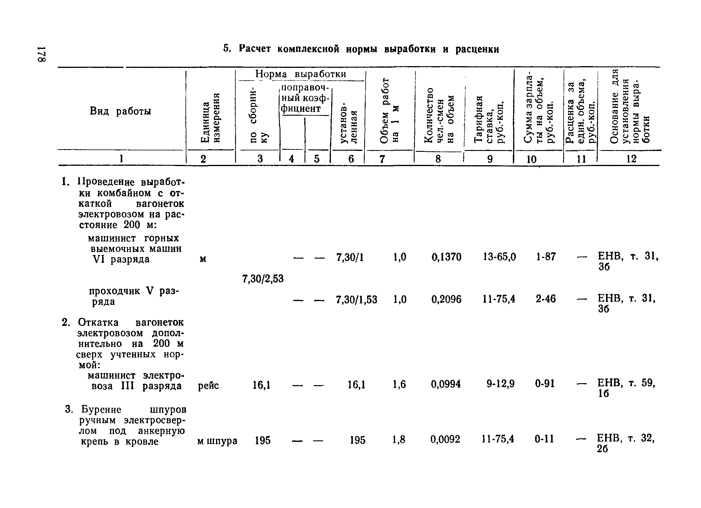 При внедрении нового оборудования, прогрессивной технологии ведения горных работ и более совершенных форм организации труда, не предусмотренных настоящим сборником, нормы должны устанавливаться с учетом технических возможностей оборудования в этих условиях. | | Оглавление: | Общая часть Нормативная часть I Очистные работы Техническая часть Нормативная часть § 1 Выемка горной массы комбайном ГШ-68 и подготовка к выемке следующей полосы § 2 Передвижка гидрофицированной посадочной крепи "Спутник" и забойного скребкового конвейера § 3 Перестановка гидравлических стоек § 4 Осевая передвижка скребкового конвейера-перегружателя на сборном штреке комбайновой лавы § 5 Выемка горной массы комбайнами 1К-101, 2К-101 и подготовка к выемке следующей полосы § 6 Оформление забоя после выемки горной массы комбайнами К-101, 2К-101 § 7 Выемка горной массы из ниш лавы, оборудованной комбайном 1К-101 или 2К-101 § 8 Зарубка сланца врубовой машиной "Урал-33" § 9 Перегон врубовой машины "Урал-33" § 10 Бурение шпуров бурильными установками БУА-3 и БУА-3с § 11 Перегон бурильных установок БУА-3 и БУА-3с § 12 Бурение шпуров ручным электросверлом § 13 Погрузка горной массы погрузочной машиной 1ПНБ-2 § 14 Навалоотбойка сланца в лавах с выкладкой бутовых полос § 15 Перестановка клиновых металлических стоек в лавах § 16 Крепление очистных забоев металлической анкерной крепью § 17 Проверка состояния и повторная затяжка гаек металлической анкерной крепи § 18 Крепление забоя деревянной крепью § 19 Возведение деревянной органной крепи § 20 Извлечение деревянной крепи из отработанных заходок камер-лав лебедкой § 21 Крепление сопряжений лав с примыкающими выработками § 22 Передвижка забойного скребкового конвейера на новую дорожку без разборки конвейерного става § 23 Передвижка забойного скребкового конвейера в новую нарезку с частичной разборкой на секции § 24 Переноска забойного скребкового конвейера из отработанного блока камеры лавы в новую разрезку § 25 Переноска забойного скребкового конвейера СП-63 с полной разборкой в лавах без машинной зарубки § 26 Разработка почвы под приводную головку забойного конвейера § 27 Уборка упавшей с кровли породы (вывалов) вручную II. Горно-подготовительные работы § 28 Проведение подготовительных горных выработок комбайнами ПК-3М, ПК-3Р § 29 Бурение шпуров ручными электросверлами в сланце и породе при буровзрывном способе прохождения выработок § 30 Погрузка горной массы погрузочной машиной 1ПНБ-2 § 31 Погрузка породы погрузочной машиной 1ПНБ-2 при проведении полевых водоотливных штреков (туннелей), кроссингов и при опускании кровли § 32 Ручная погрузка, перекидка и откатка горной массы и породы § 33 Проведение, углубка и очистка водоотливных канавок врубовой машиной "Урал-33" § 34 Уборка породы экскаватором "Беларусь" при проведении водосборников § 35 Уборка породы вручную при проведении водосборников § 36 Крепление горных выработок металлической анкерной крепью § 37 Проверка состояния и повторная затяжка гаек металлической анкерной крепи § 38 Извлечение временной металлической анкерной крепи в подготовительных горных выработках § 39 Крепление горных выработок в период эксплуатации металлическими штангами с заполнением шпура бетонной смесью § 40 Крепление горных выработок металлической трапециевидной крепью вразбежку § 41 Крепление горных выработок деревян