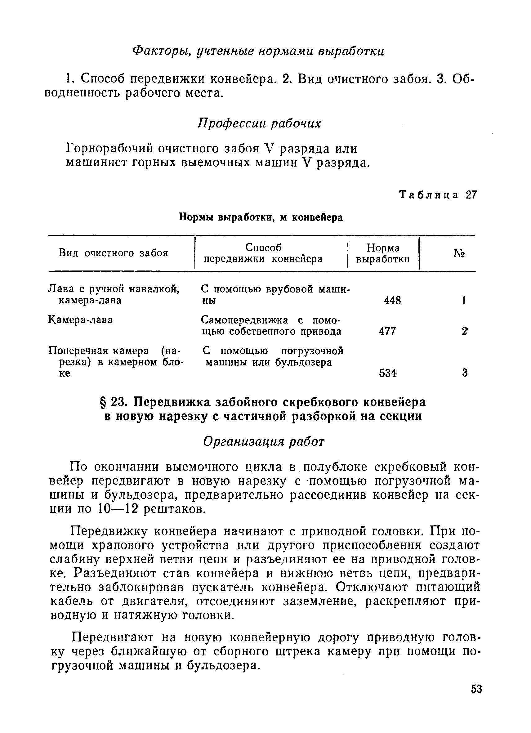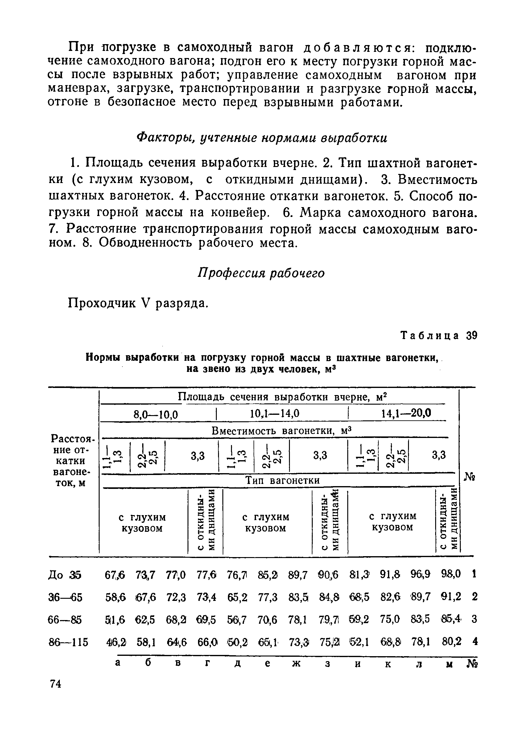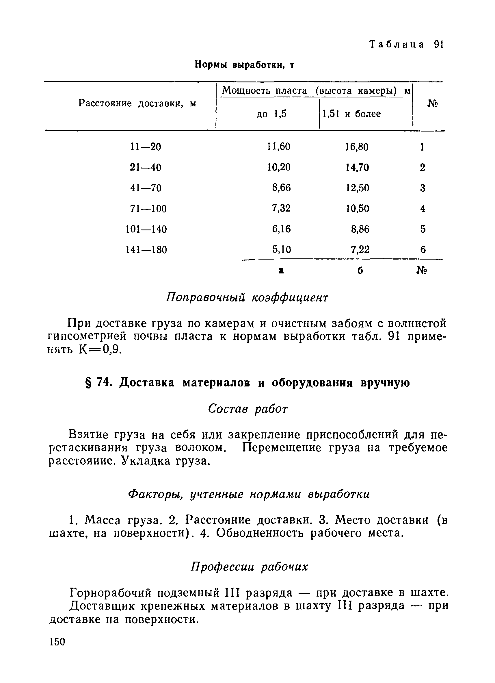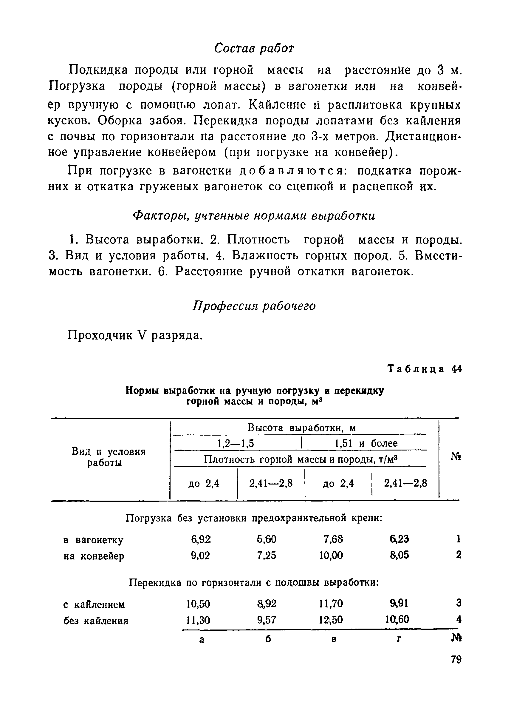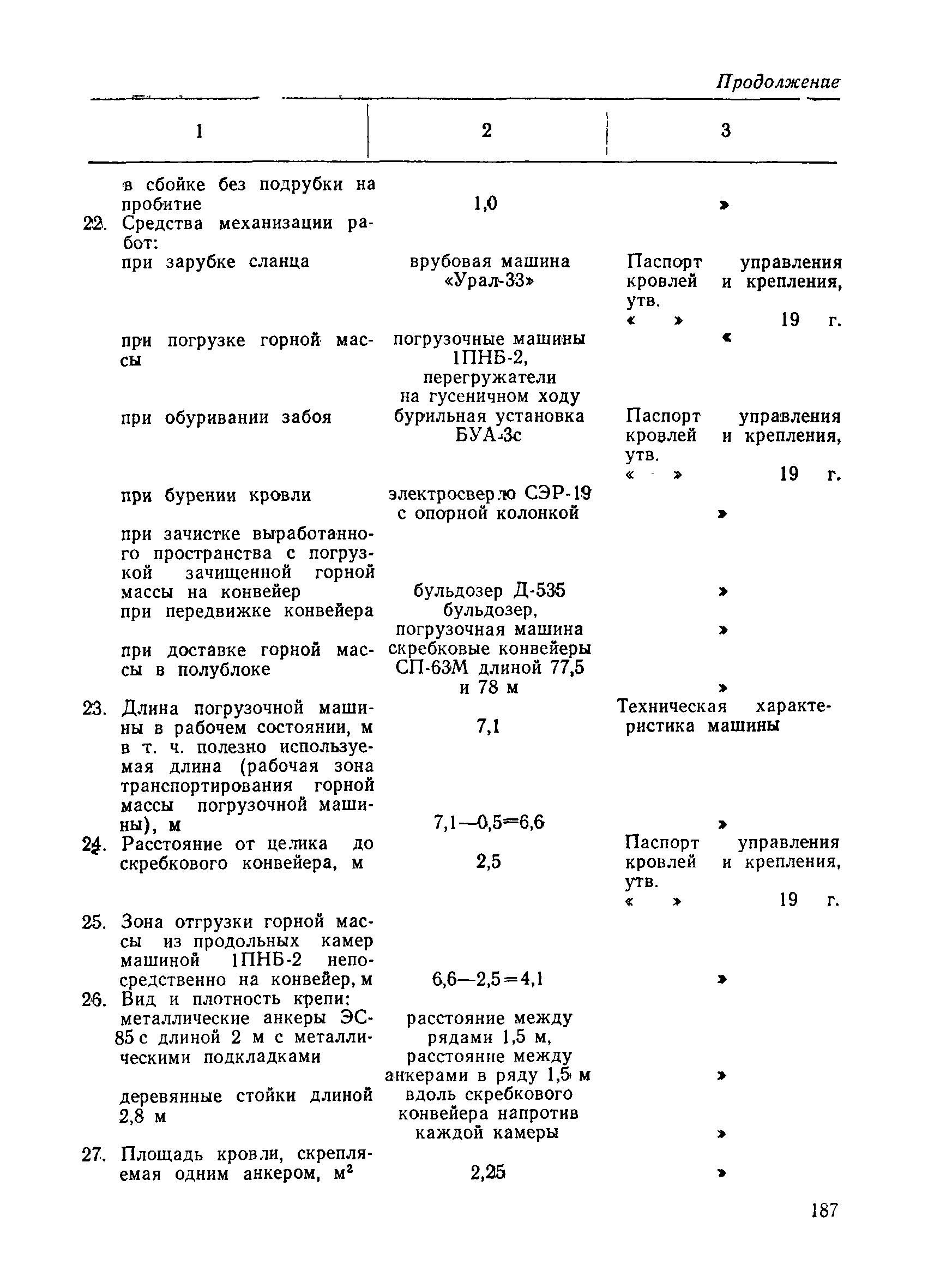 При внедрении нового оборудования, прогрессивной технологии ведения горных работ и более совершенных форм организации труда, не предусмотренных настоящим сборником, нормы должны устанавливаться с учетом технических возможностей оборудования в этих условиях. | | Оглавление: | Общая часть Нормативная часть I Очистные работы Техническая часть Нормативная часть § 1 Выемка горной массы комбайном ГШ-68 и подготовка к выемке следующей полосы § 2 Передвижка гидрофицированной посадочной крепи "Спутник" и забойного скребкового конвейера § 3 Перестановка гидравлических стоек § 4 Осевая передвижка скребкового конвейера-перегружателя на сборном штреке комбайновой лавы § 5 Выемка горной массы комбайнами 1К-101, 2К-101 и подготовка к выемке следующей полосы § 6 Оформление забоя после выемки горной массы комбайнами К-101, 2К-101 § 7 Выемка горной массы из ниш лавы, оборудованной комбайном 1К-101 или 2К-101 § 8 Зарубка сланца врубовой машиной "Урал-33" § 9 Перегон врубовой машины "Урал-33" § 10 Бурение шпуров бурильными установками БУА-3 и БУА-3с § 11 Перегон бурильных установок БУА-3 и БУА-3с § 12 Бурение шпуров ручным электросверлом § 13 Погрузка горной массы погрузочной машиной 1ПНБ-2 § 14 Навалоотбойка сланца в лавах с выкладкой бутовых полос § 15 Перестановка клиновых металлических стоек в лавах § 16 Крепление очистных забоев металлической анкерной крепью § 17 Проверка состояния и повторная затяжка гаек металлической анкерной крепи § 18 Крепление забоя деревянной крепью § 19 Возведение деревянной органной крепи § 20 Извлечение деревянной крепи из отработанных заходок камер-лав лебедкой § 21 Крепление сопряжений лав с примыкающими выработками § 22 Передвижка забойного скребкового конвейера на новую дорожку без разборки конвейерного става § 23 Передвижка забойного скребкового конвейера в новую нарезку с частичной разборкой на секции § 24 Переноска забойного скребкового конвейера из отработанного блока камеры лавы в новую разрезку § 25 Переноска забойного скребкового конвейера СП-63 с полной разборкой в лавах без машинной зарубки § 26 Разработка почвы под приводную головку забойного конвейера § 27 Уборка упавшей с кровли породы (вывалов) вручную II. Горно-подготовительные работы § 28 Проведение подготовительных горных выработок комбайнами ПК-3М, ПК-3Р § 29 Бурение шпуров ручными электросверлами в сланце и породе при буровзрывном способе прохождения выработок § 30 Погрузка горной массы погрузочной машиной 1ПНБ-2 § 31 Погрузка породы погрузочной машиной 1ПНБ-2 при проведении полевых водоотливных штреков (туннелей), кроссингов и при опускании кровли § 32 Ручная погрузка, перекидка и откатка горной массы и породы § 33 Проведение, углубка и очистка водоотливных канавок врубовой машиной "Урал-33" § 34 Уборка породы экскаватором "Беларусь" при проведении водосборников § 35 Уборка породы вручную при проведении водосборников § 36 Крепление горных выработок металлической анкерной крепью § 37 Проверка состояния и повторная затяжка гаек металлической анкерной крепи § 38 Извлечение временной металлической анкерной крепи в подготовительных горных выработках § 39 Крепление горных выработок в период эксплуатации металлическими штангами с заполнением шпура бетонной смесью § 40 Крепление горных выработок металлической трапециевидной крепью вразбежку § 41 Крепление горных выработок деревян